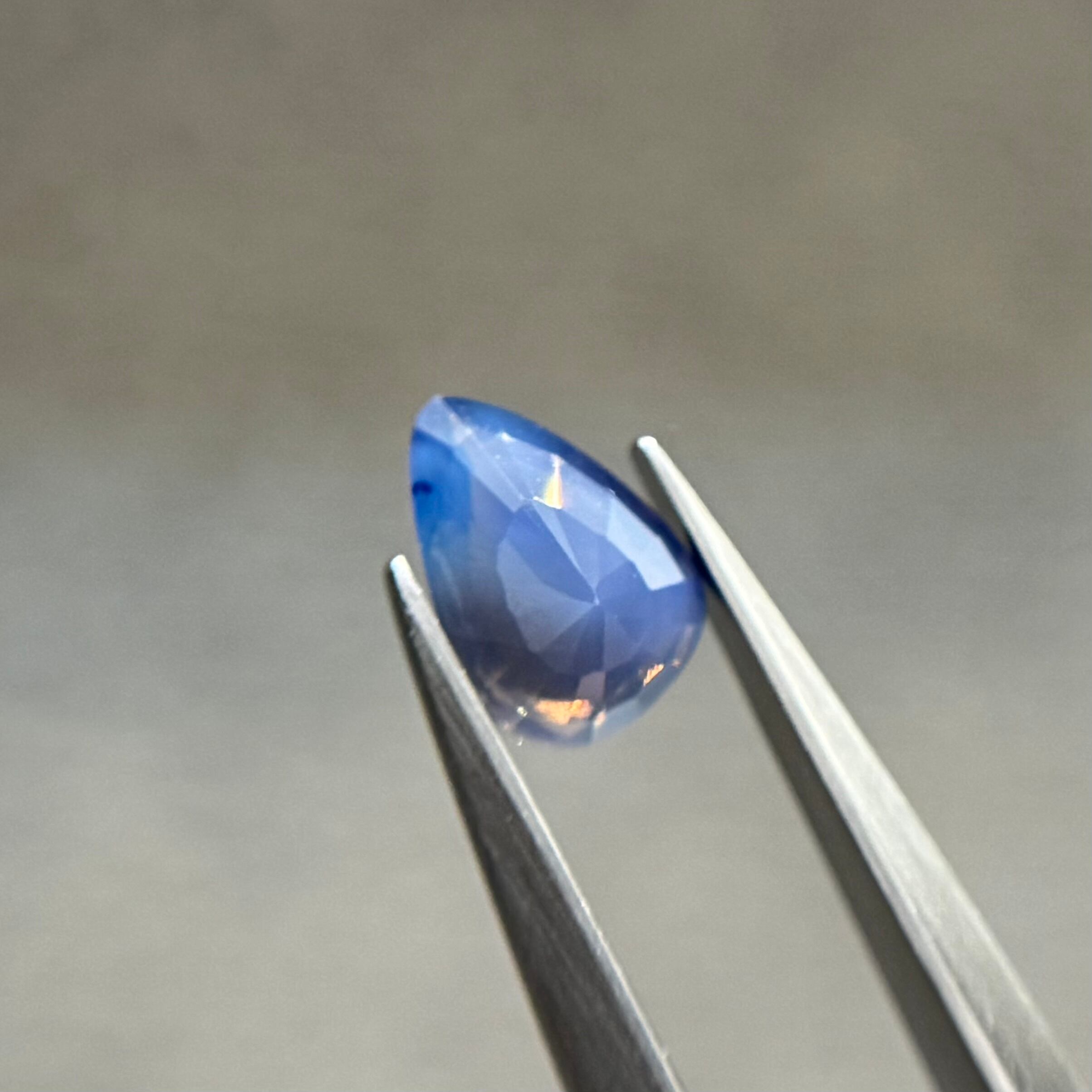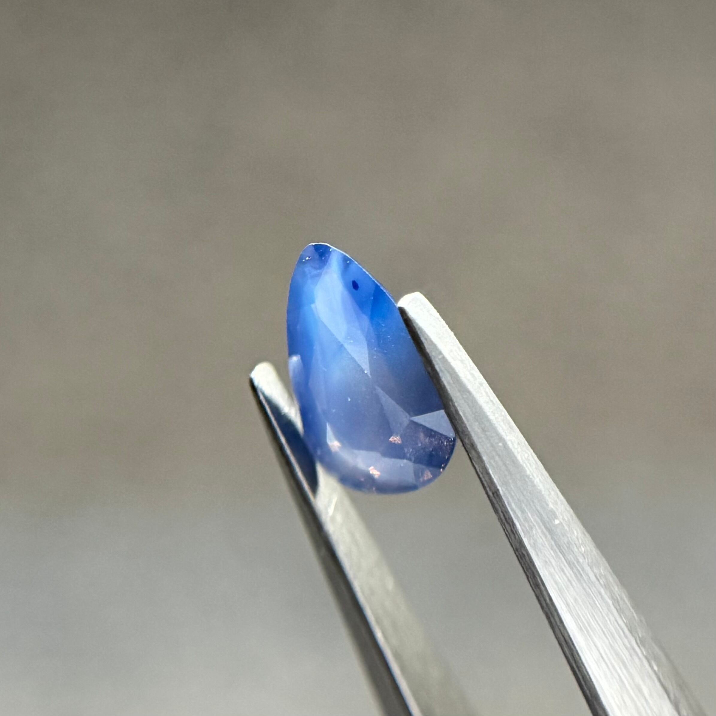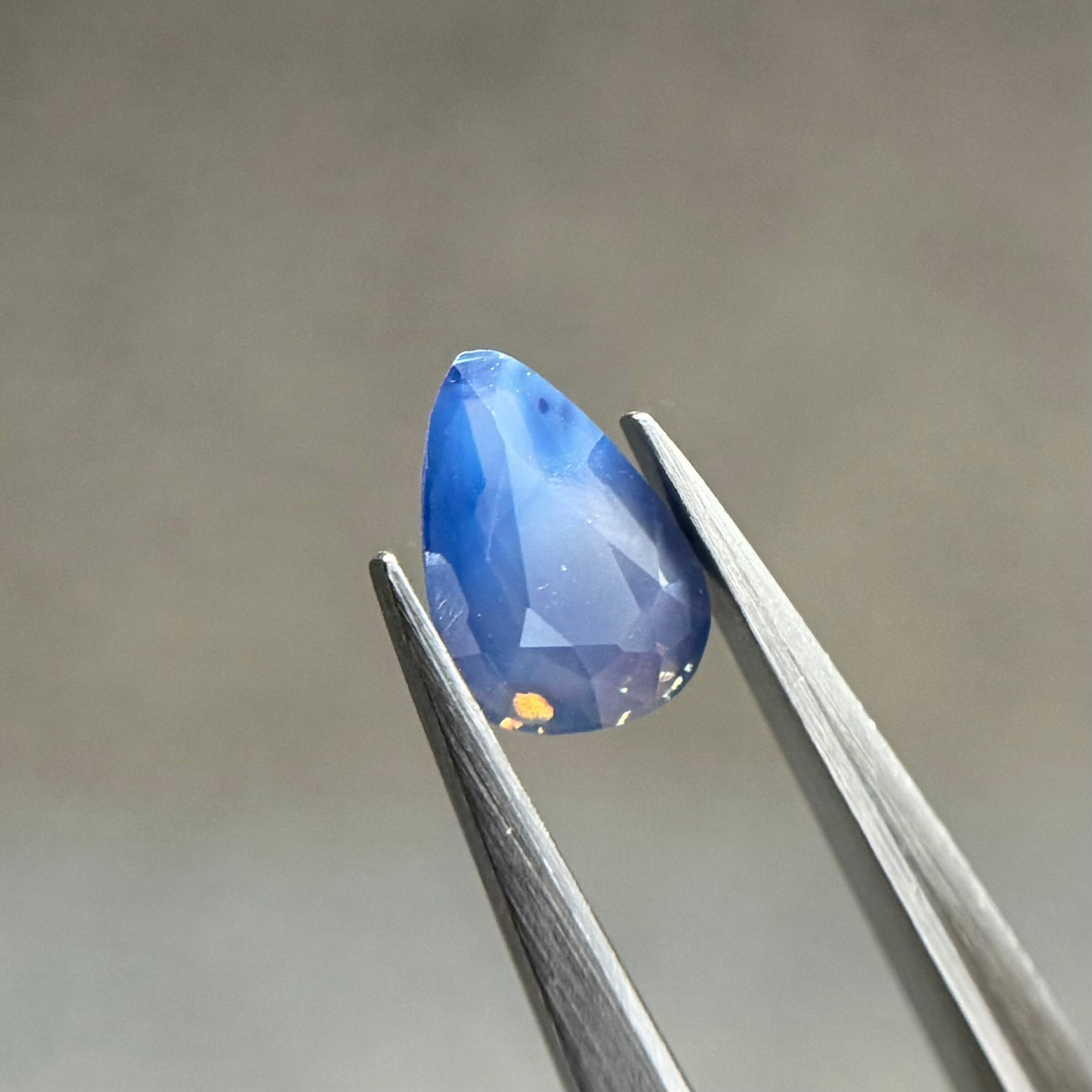 ミルキーブルーが美しいシルキーサファイアです。正面から見るとミルキーが前面に出ており、あまりテリを感じられないのですが、傾けると内側から黄色とオレンジのテリがブワッと出てくるギャップのすごいツンデレちゃんです。たまにピンクみが出てくるのがおもしろいです