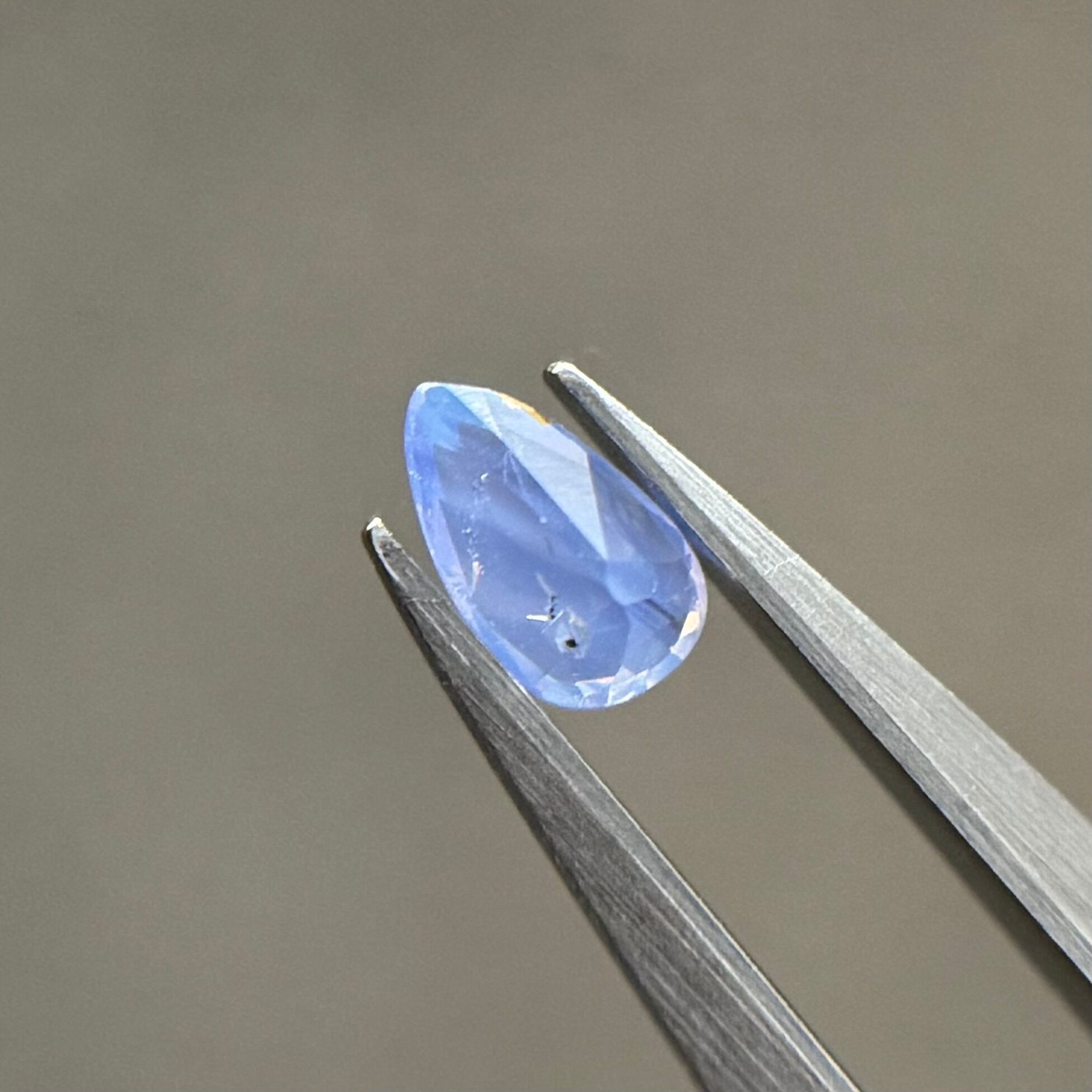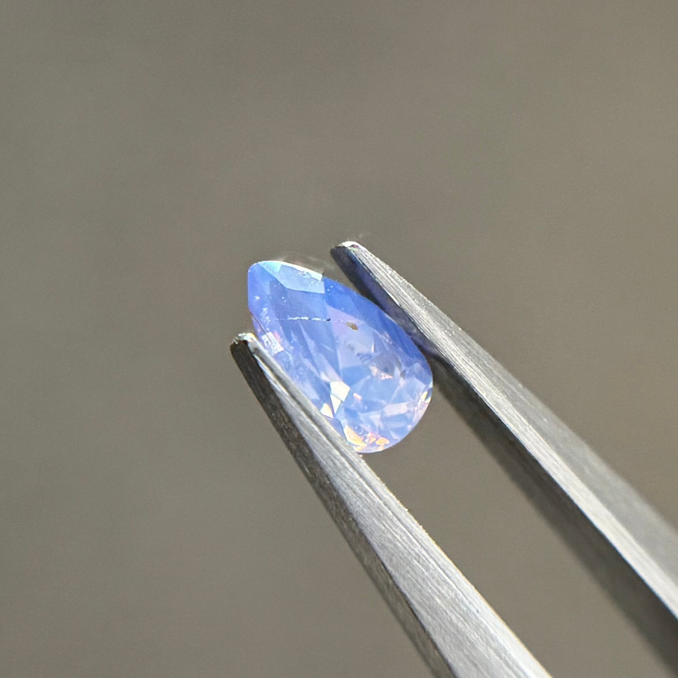 まるで雨から一雫をギュッと閉じ込めたようなシルキーサファイアです。白色の色帯バンドがまるで光がさしているかのようにも見えます。パビリオン側の生地たらずはテーブル側には響きません