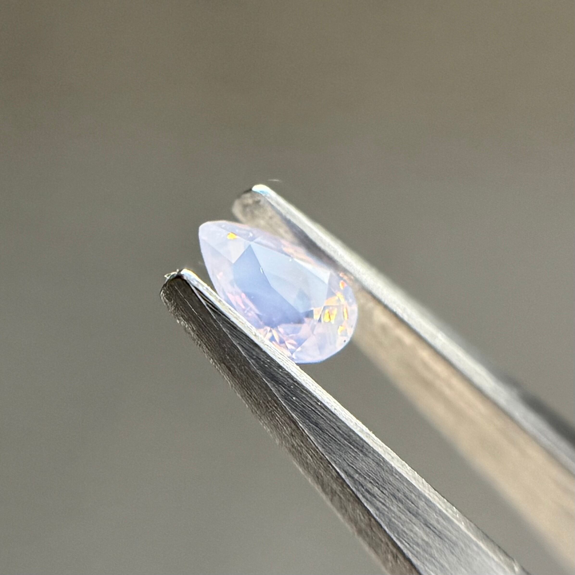 青みのあるミルキーホワイトに暖色のテリが可愛らしいシルキーサファイアです。下の方にオレンジと黄色のテリが光の絨毯のように溜まり、上の方でピンクのテリがキラキラとお星様のように煌めきます