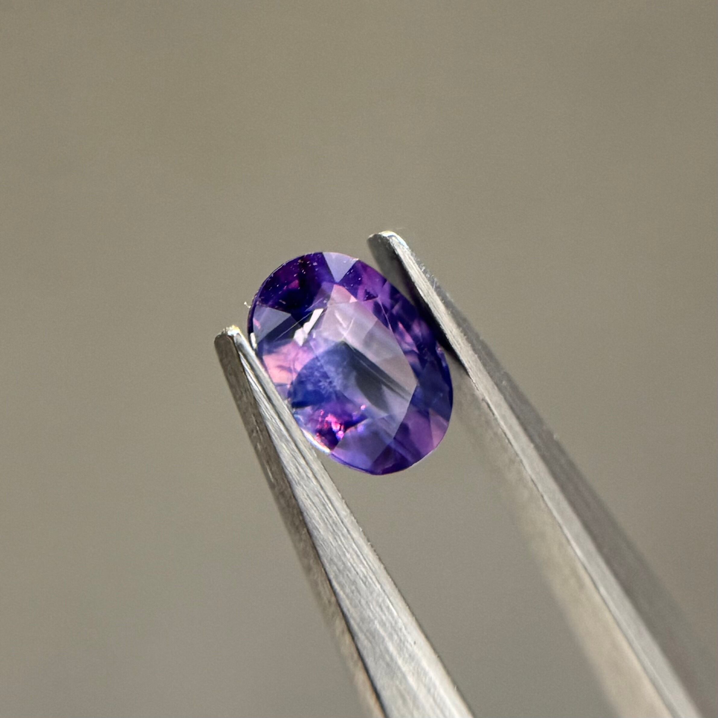 独特な色だまりが複雑な色合いを生み出すシルキーサファイアです。テリの色が紫と青紫に分かれ見えるところがあり、まるで銀河を覗いているような、夜更けの街並みを散歩しているかのような不思議な情景が楽しめます