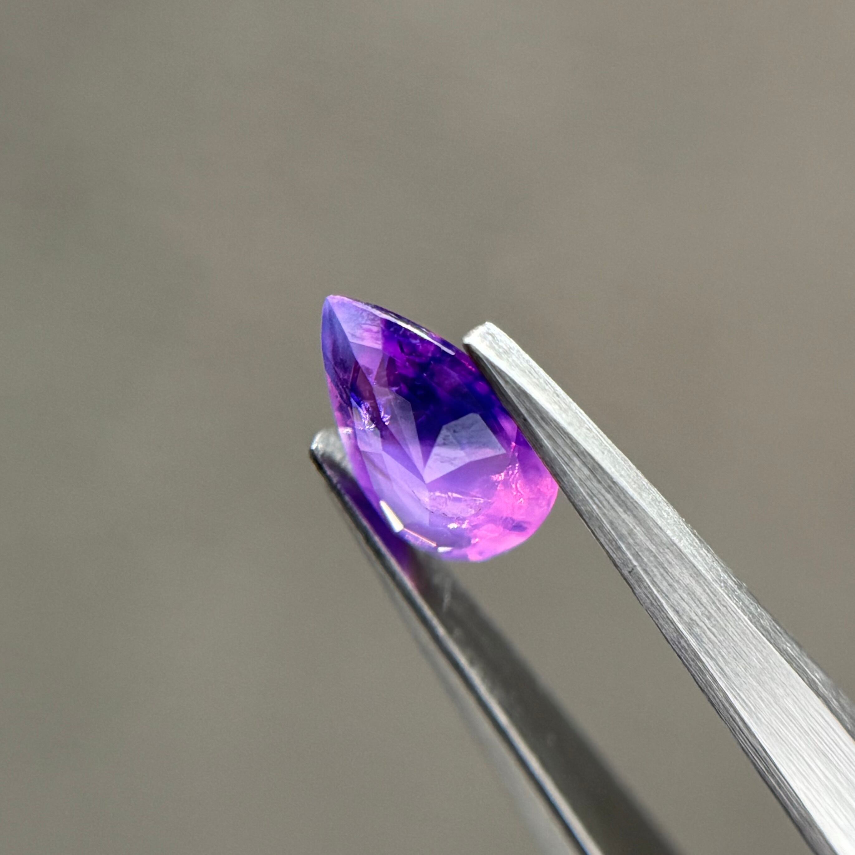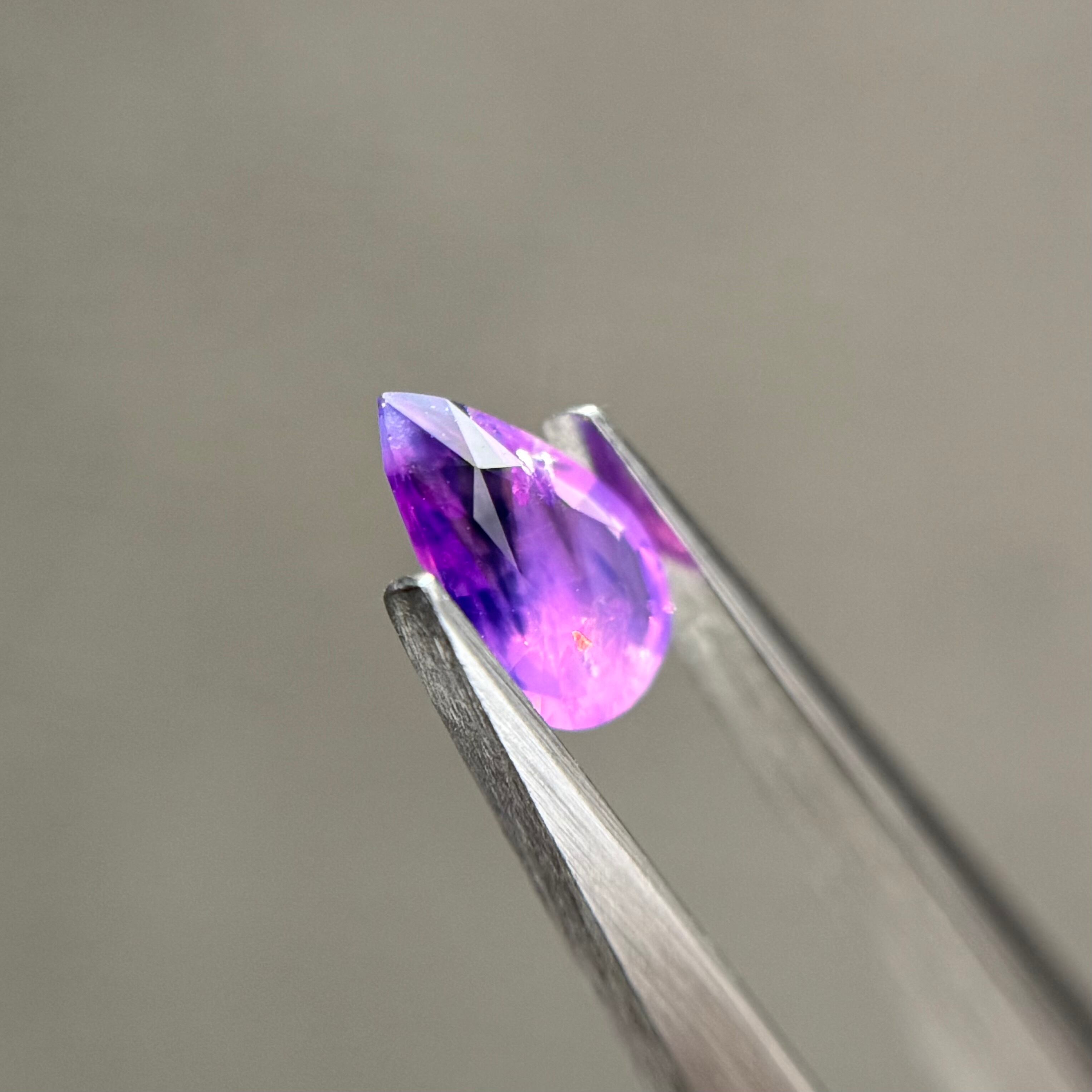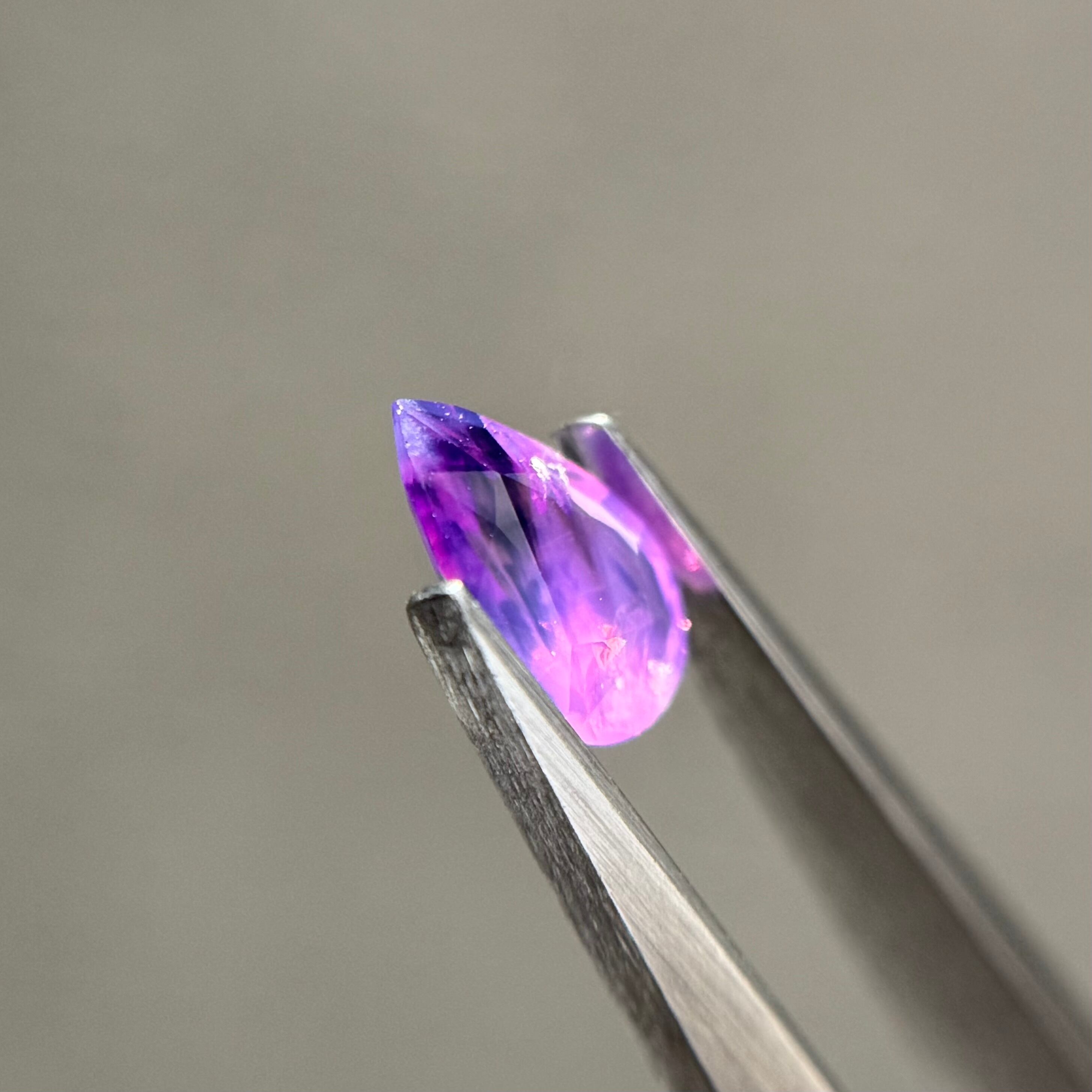 まるで小宇宙を閉じ込めたかのような幻想的な色合いのシルキーサファイアです。傾けた時に青だまり部分に濃いピンクのテリがチラッと見えるのがたまらないです。テーブルとパビリオンにそれぞれ虹が確認できます(18-20枚目)