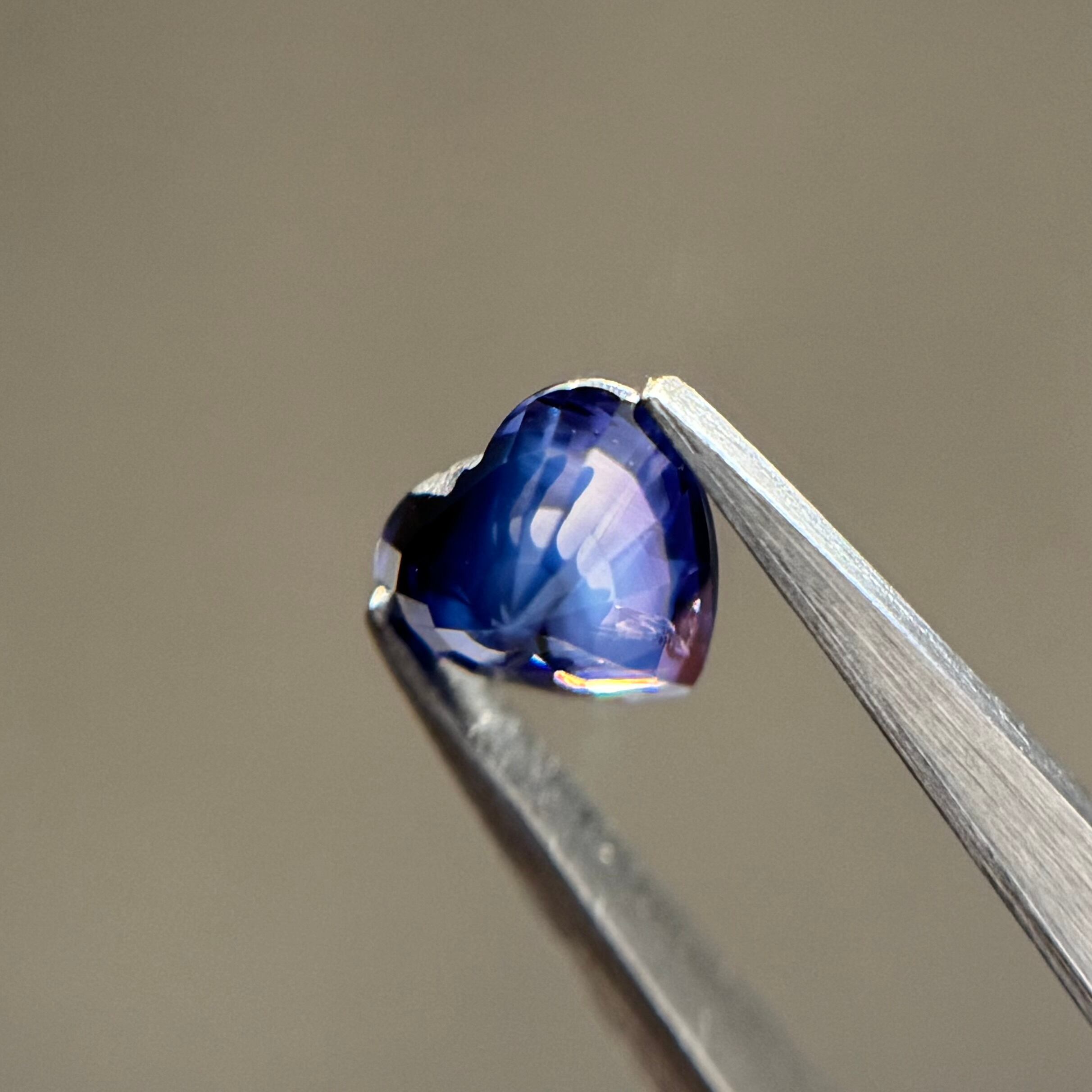 まるで宇宙空間を閉じ込めたようなシルキーサファイアです。色だまりの関係でぱっと見は少し暗く見えますが、光の下では非常に複雑で美しい色合いが広がります