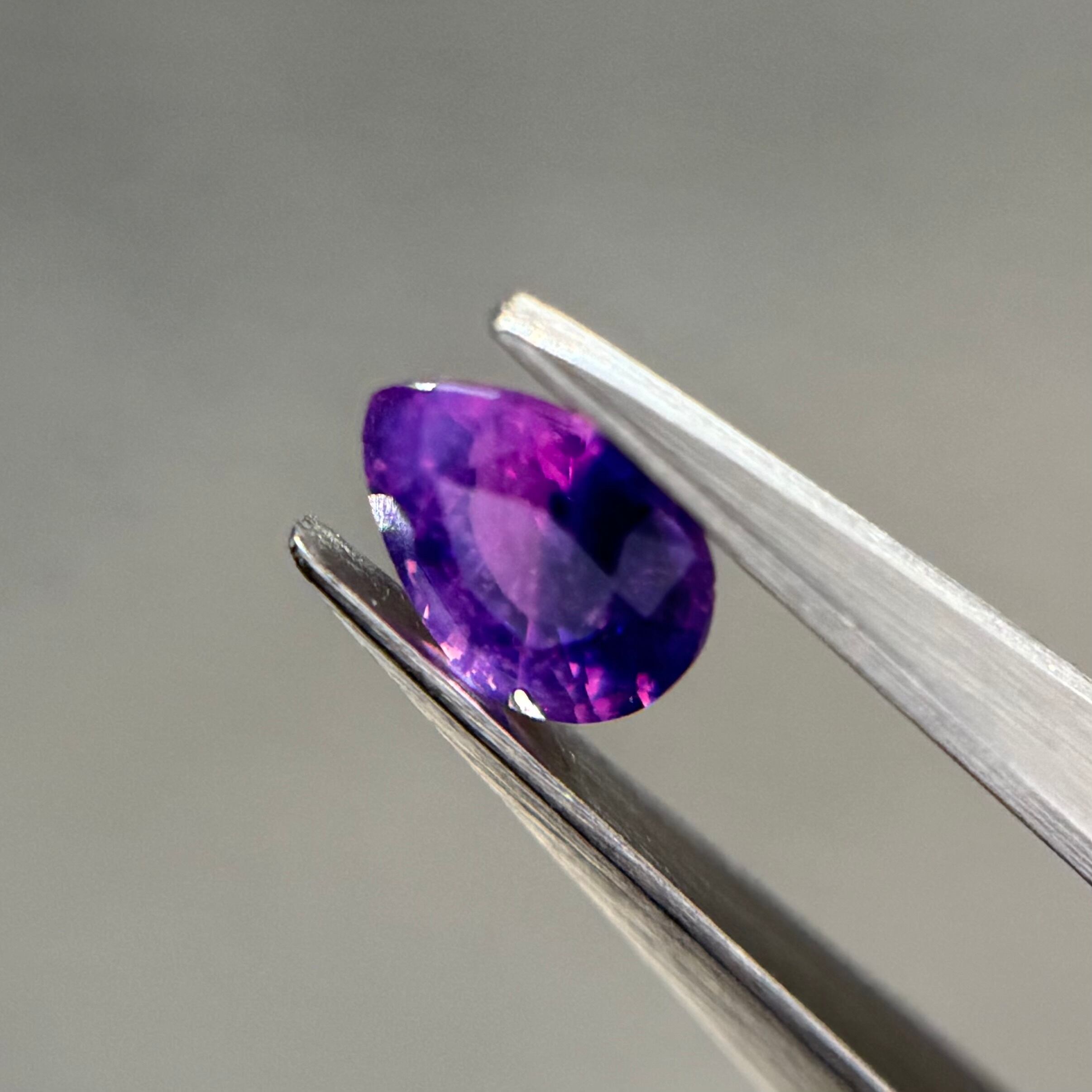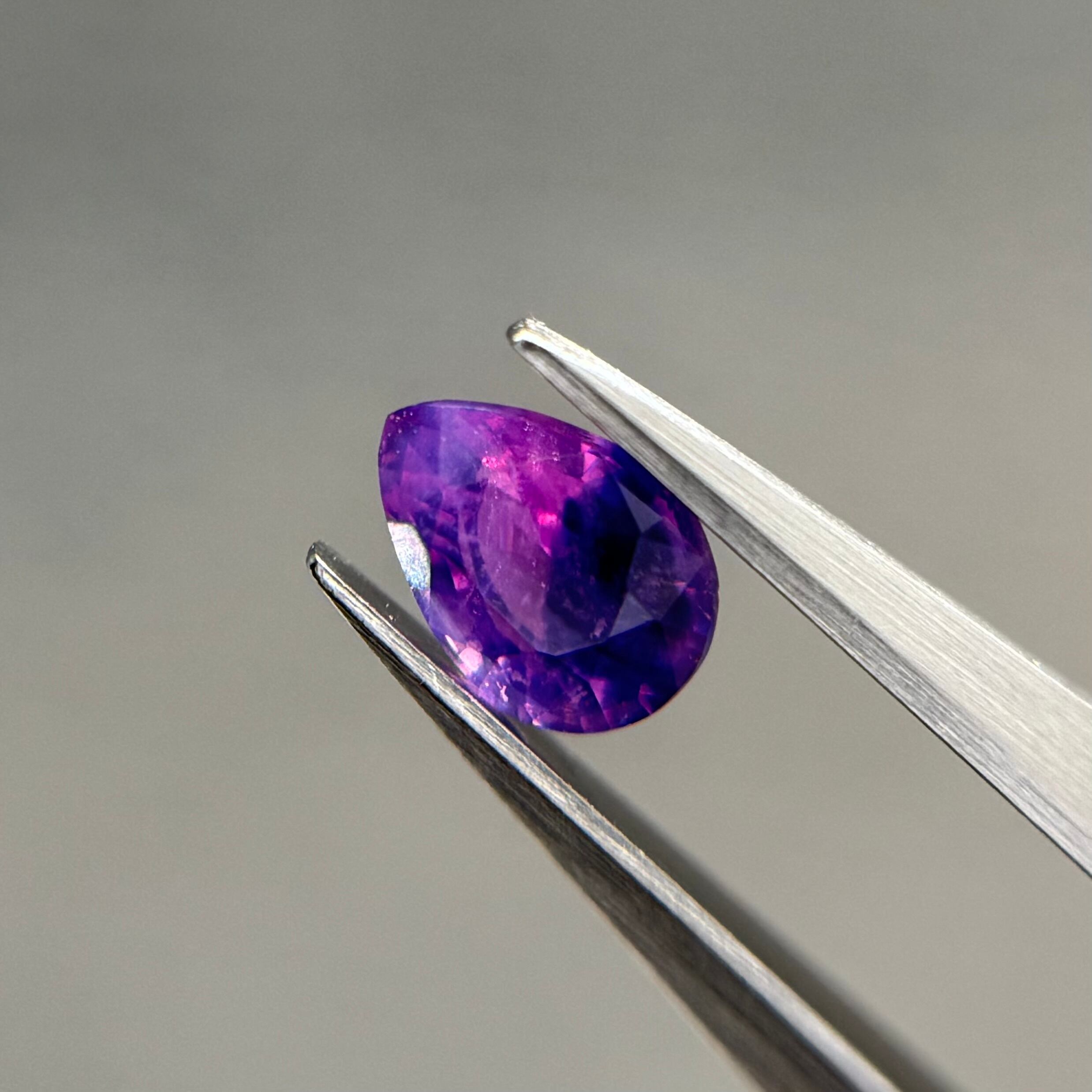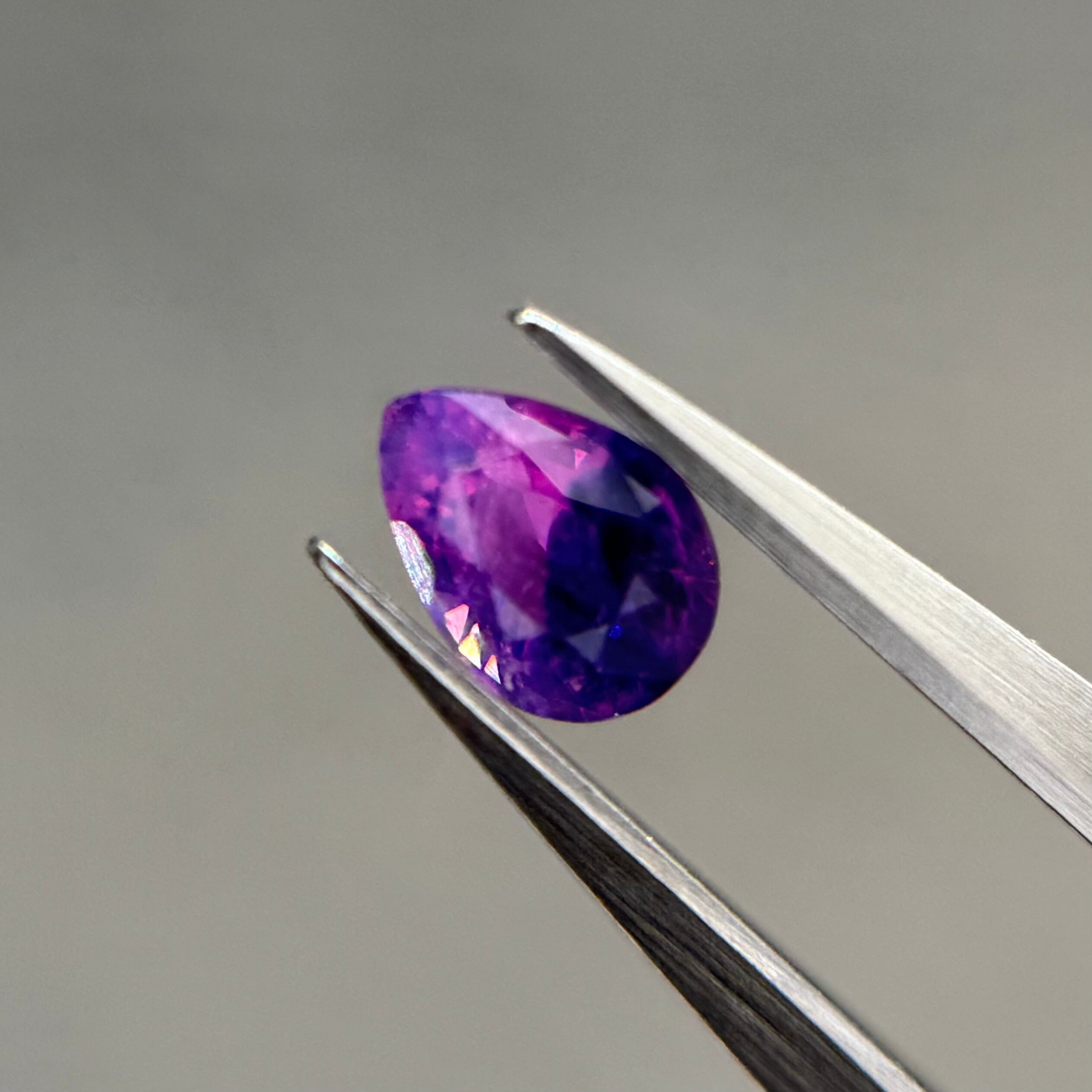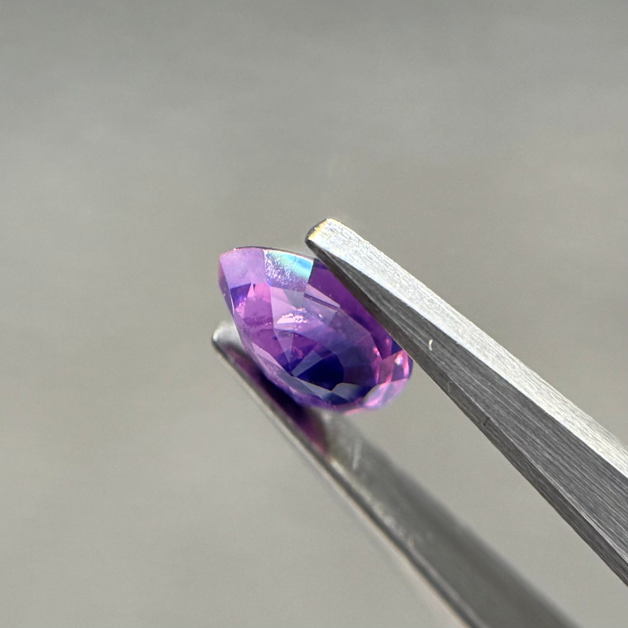 濃いめのベースに液体インクルージョンが全体的に入っており、光を反射してキラキラと煌めくサファイアです。まるで宇宙のような配色に、クラックが流れ星のように見えてとても美しいです