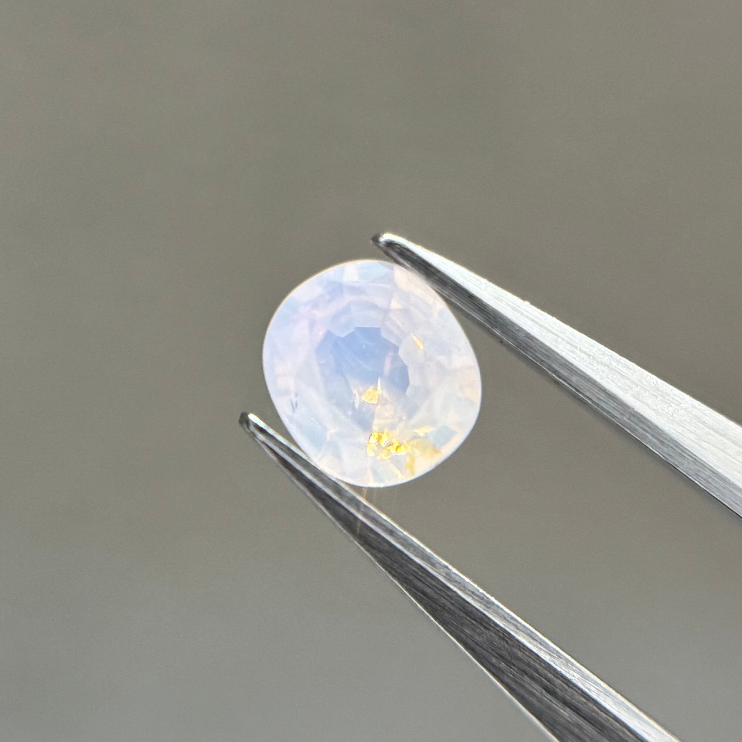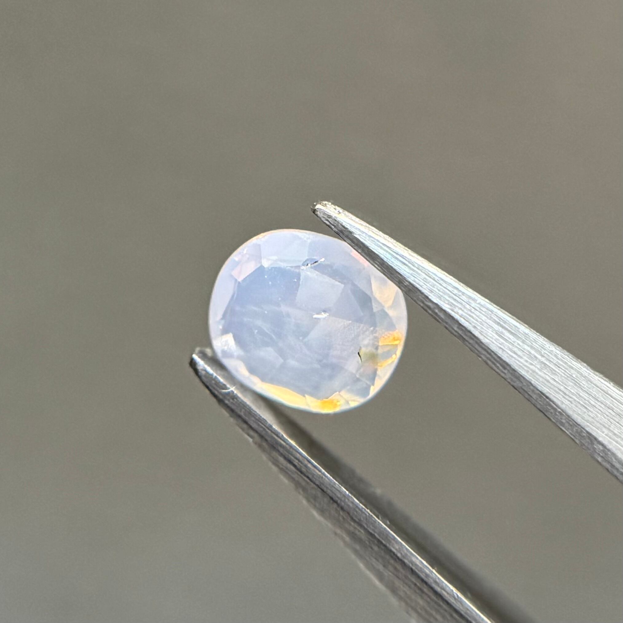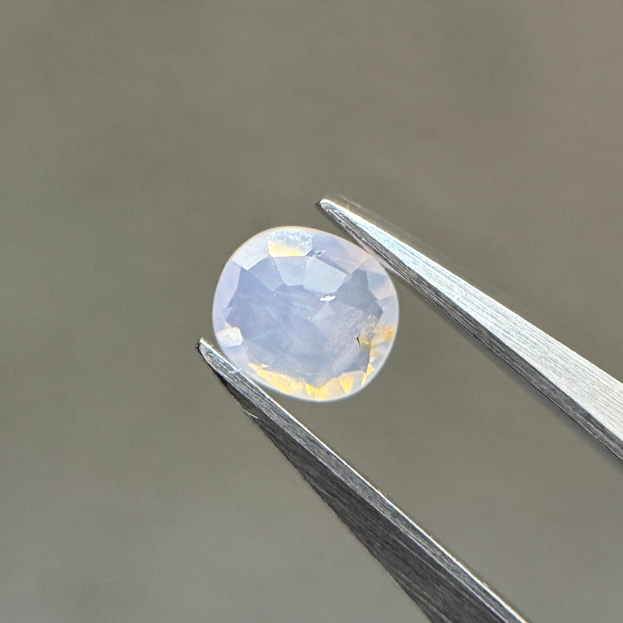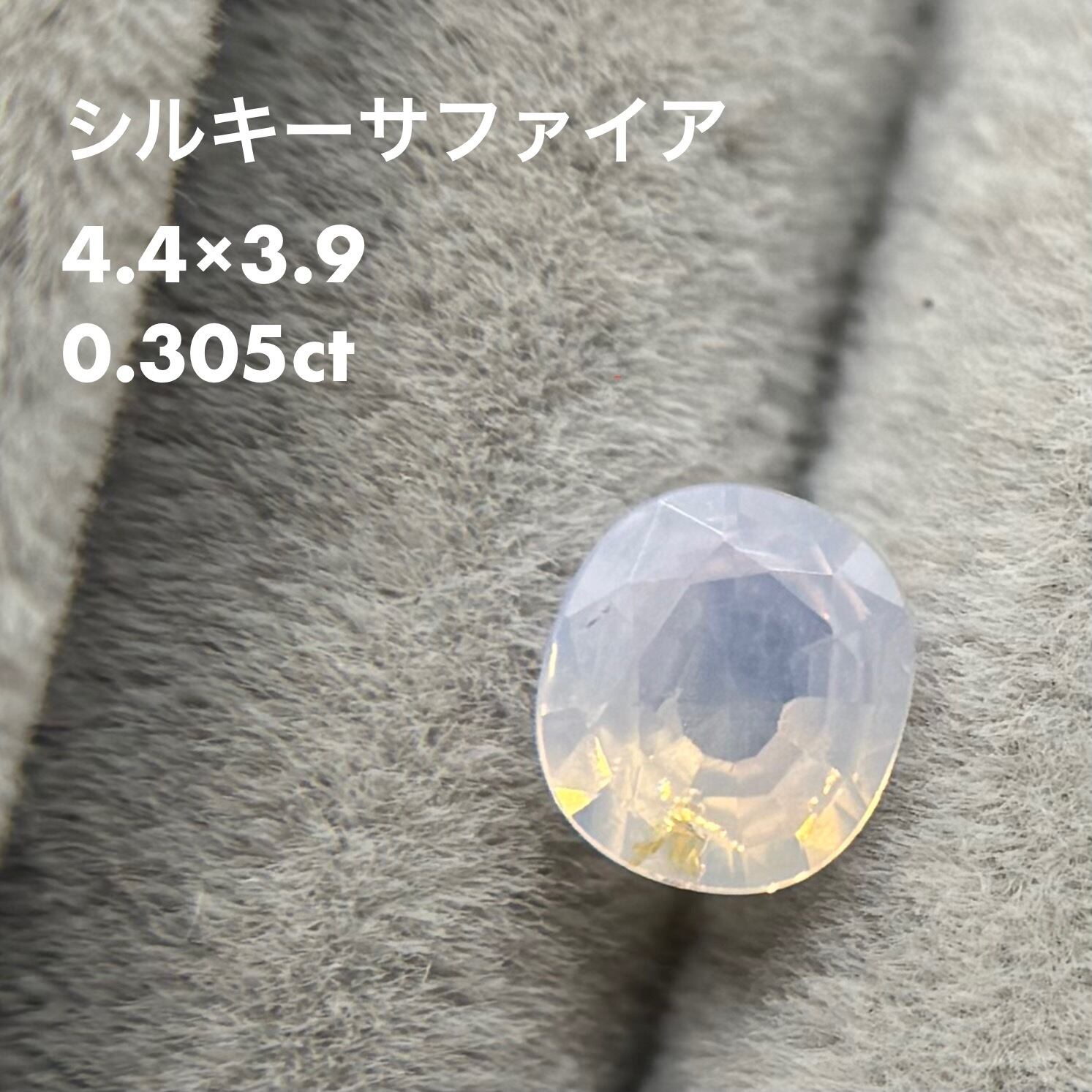 青みがかったミルキーホワイトにオレンジのテリが光の粒のようにばちばちに感じられるシルキーサファイアです。テーブルにあるインクルージョンは、テリに隠れてそこまで気にならないです