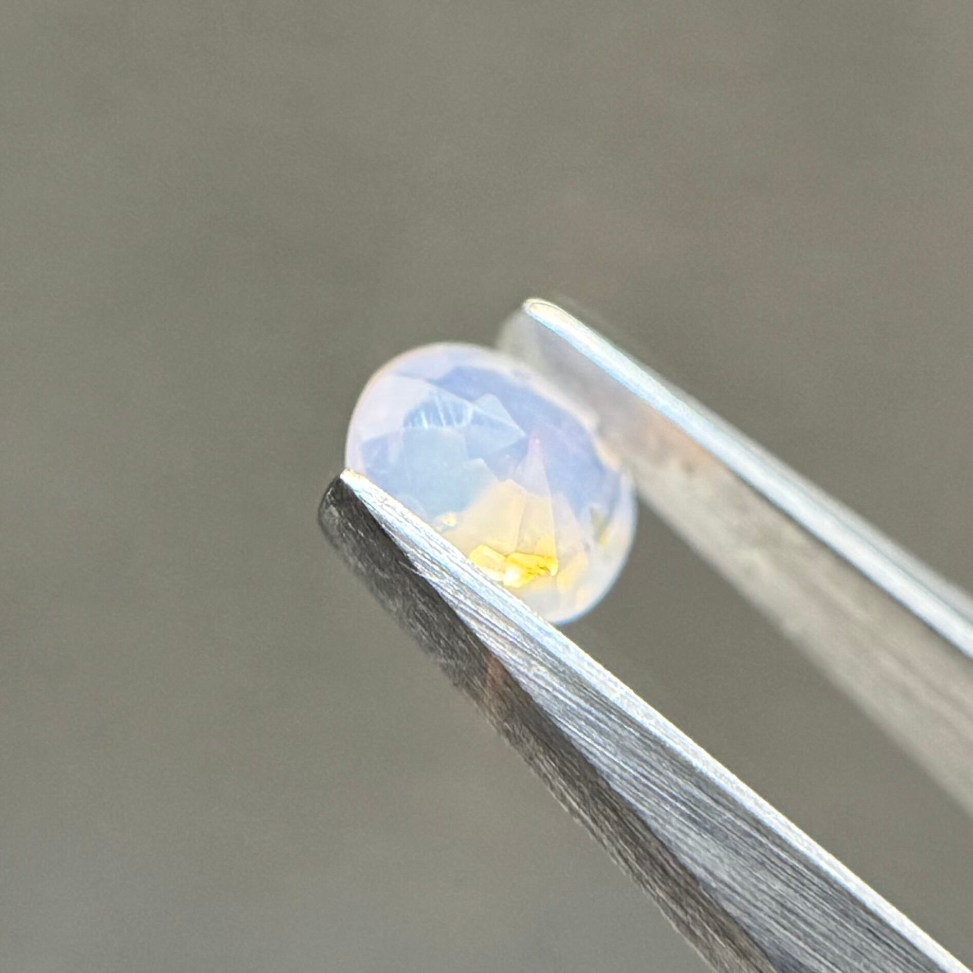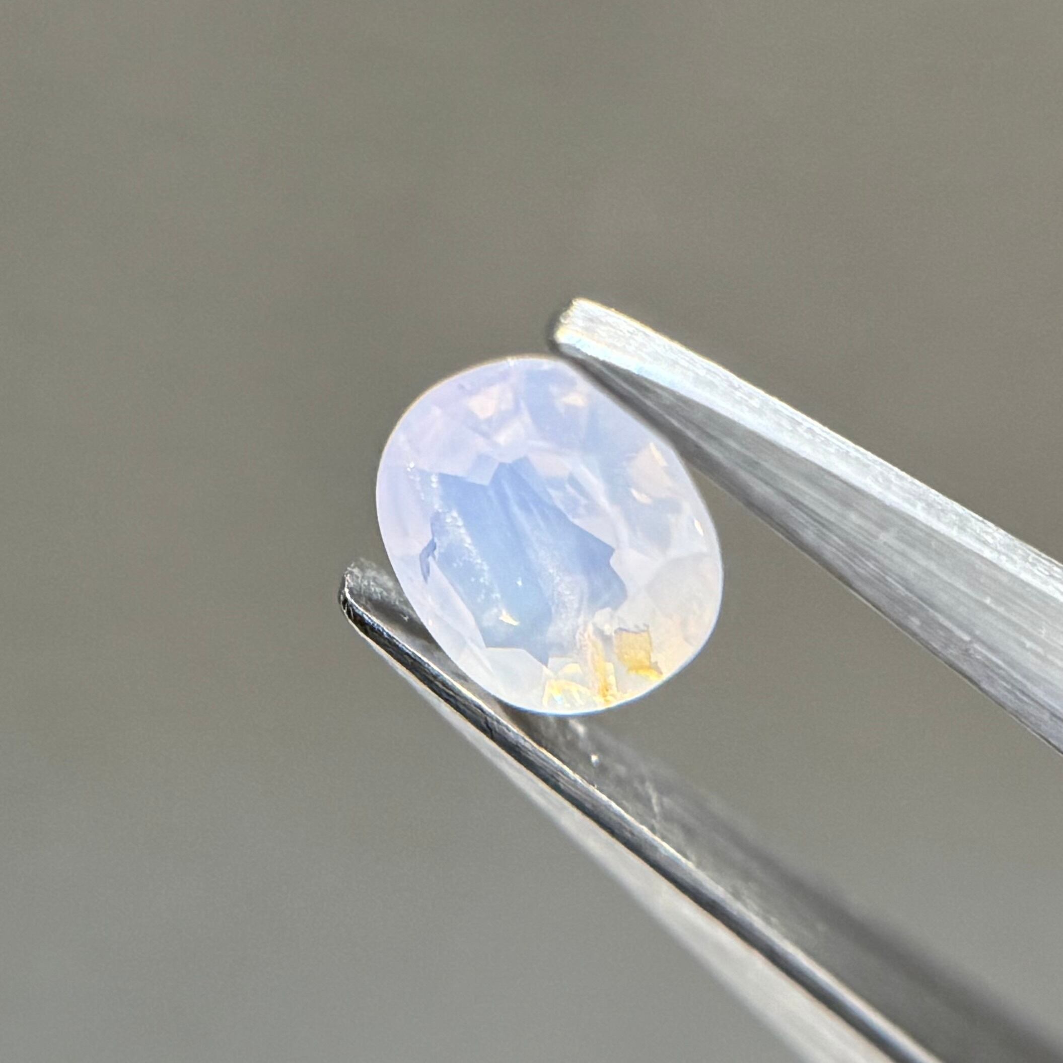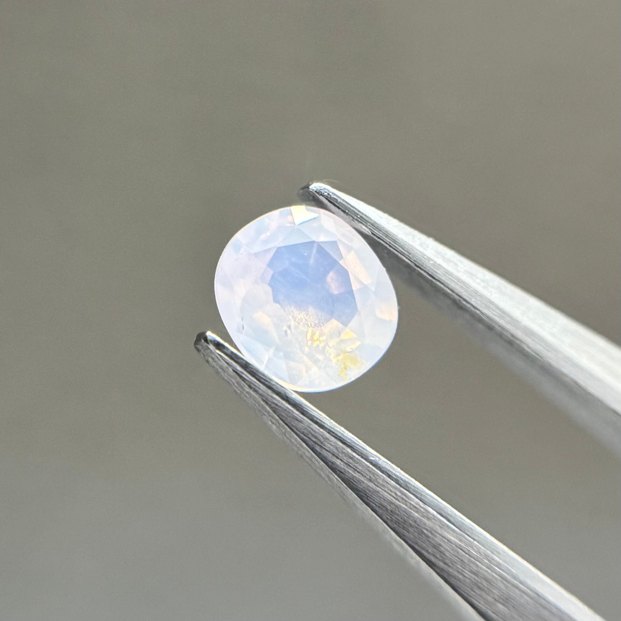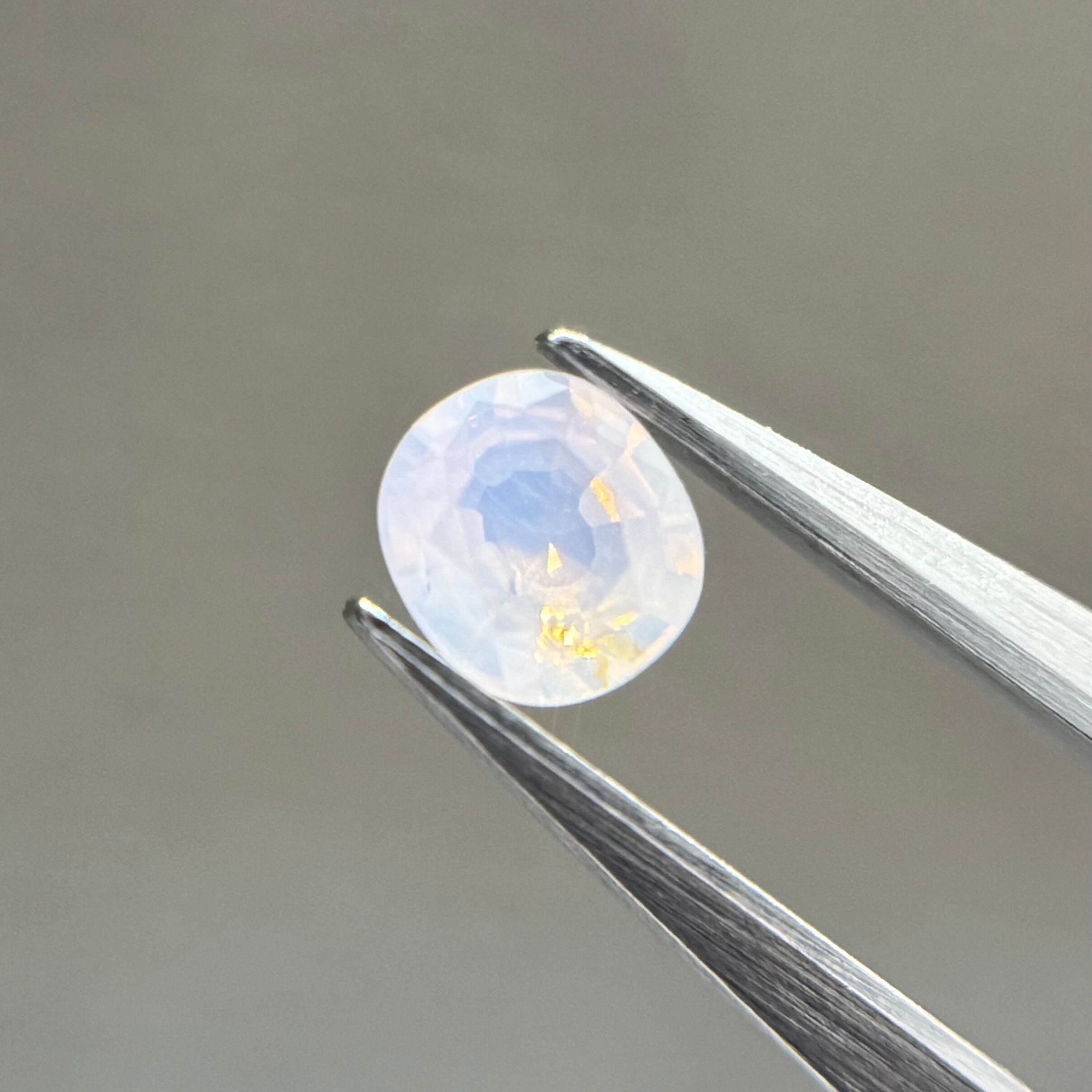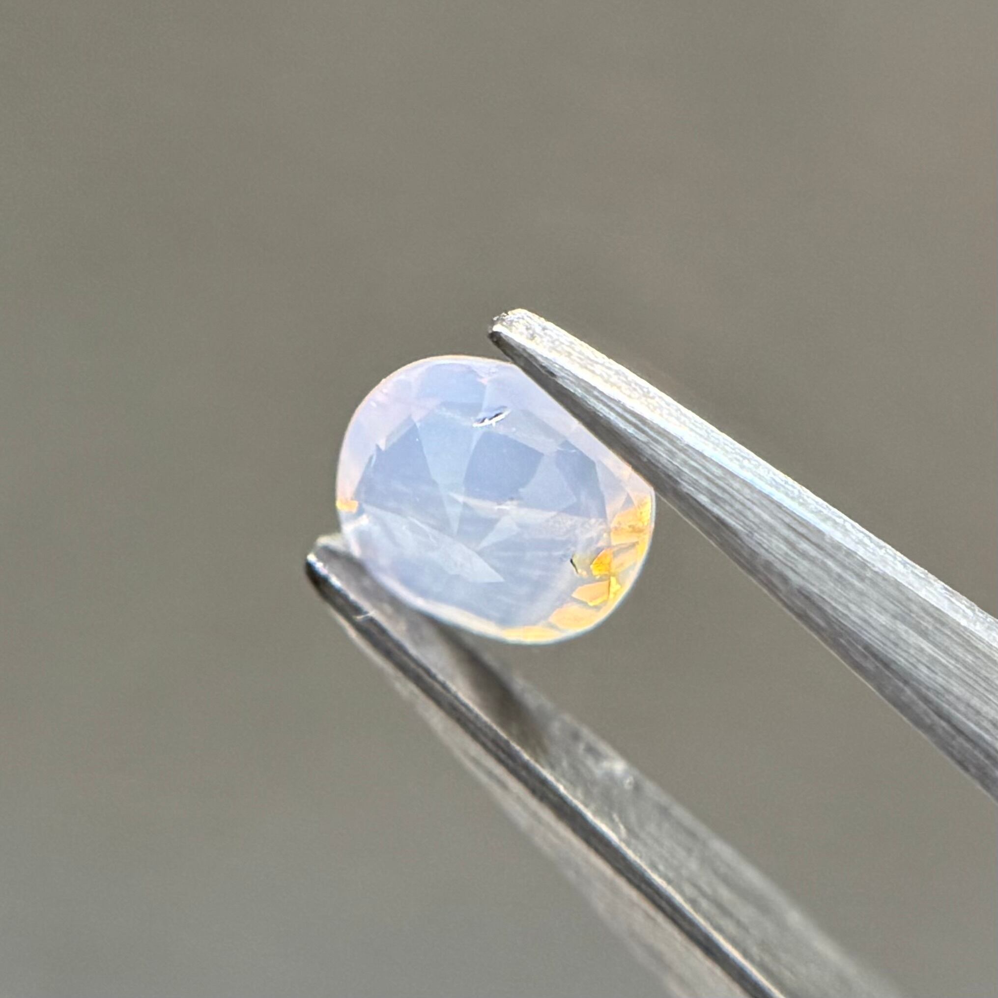 青みがかったミルキーホワイトにオレンジのテリが光の粒のようにばちばちに感じられるシルキーサファイアです。テーブルにあるインクルージョンは、テリに隠れてそこまで気にならないです
