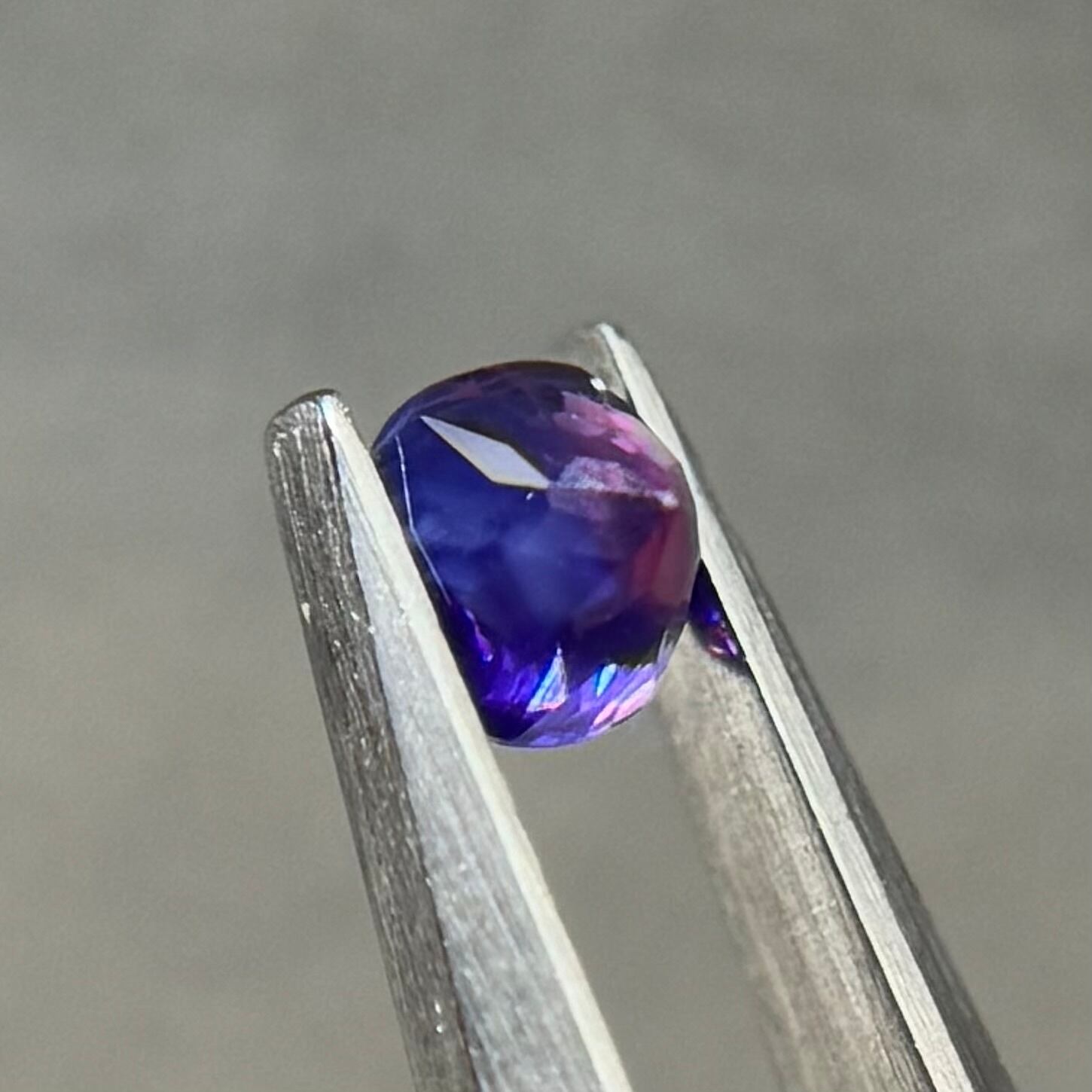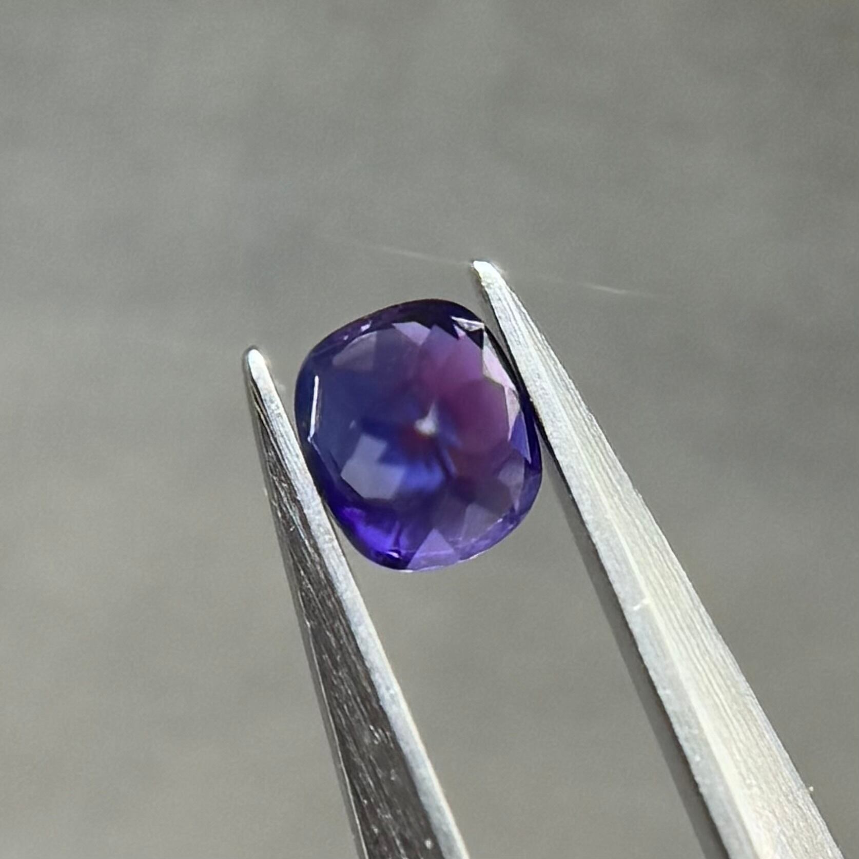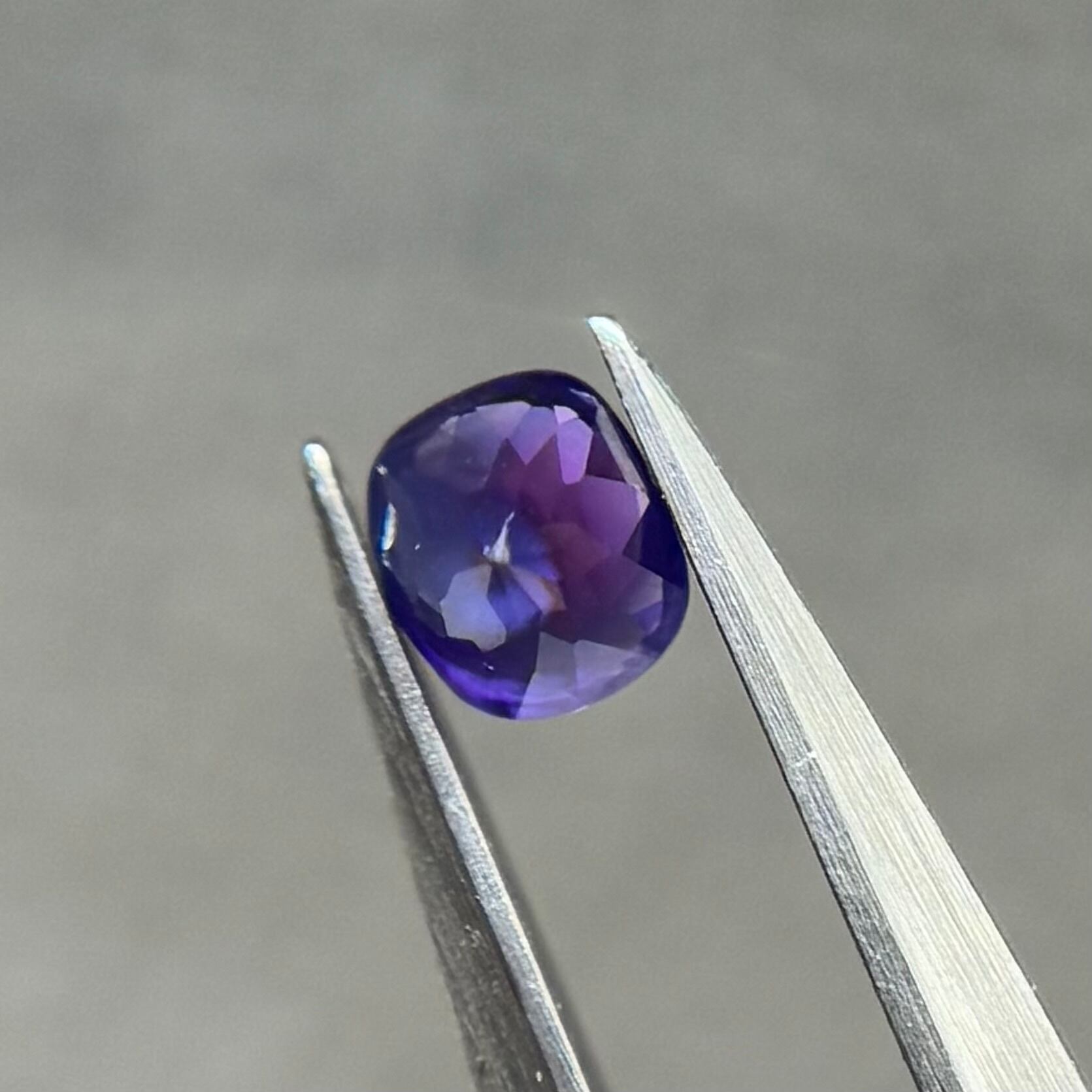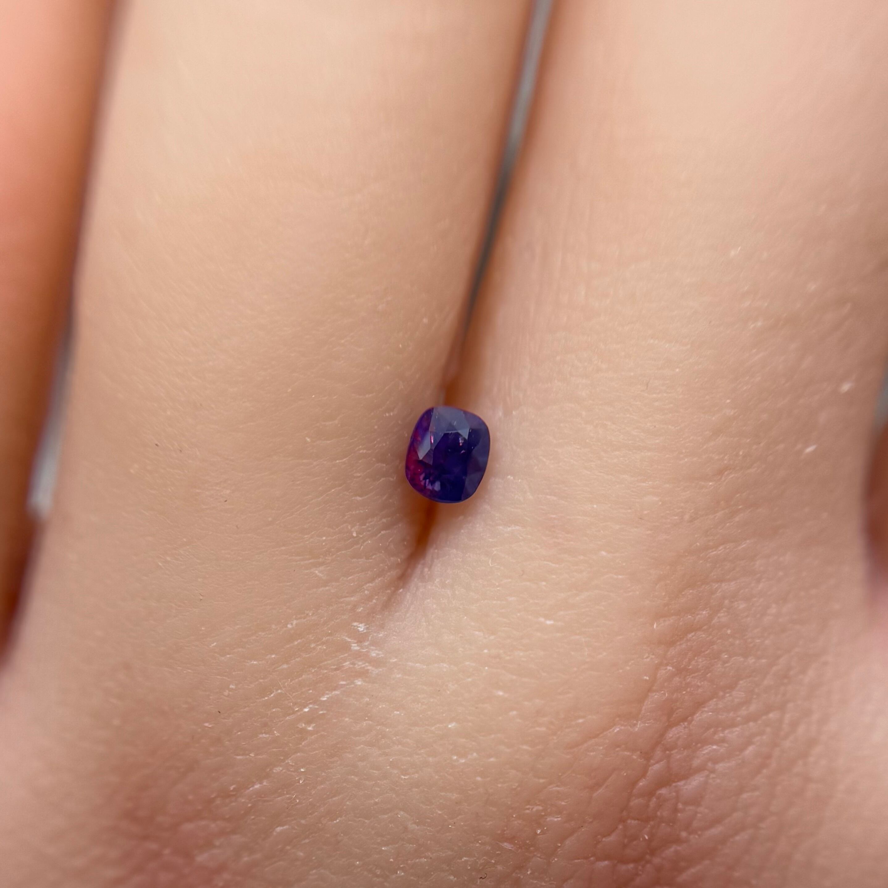 青紫と紫でまるでバイカラーのようにも見える不思議な色合いのシルキーサファイアです。お尻が深めでパビリオン側からも色々な表情が楽しめます。光に透かすとグッとビビッドピンクが出てきて、まるで夜桜のようです。
