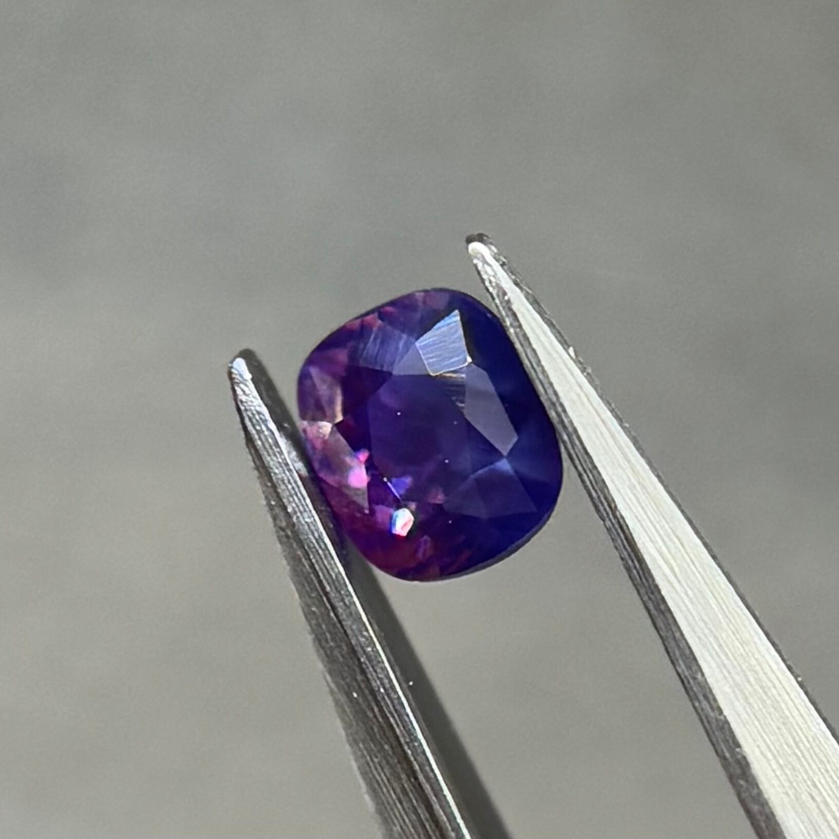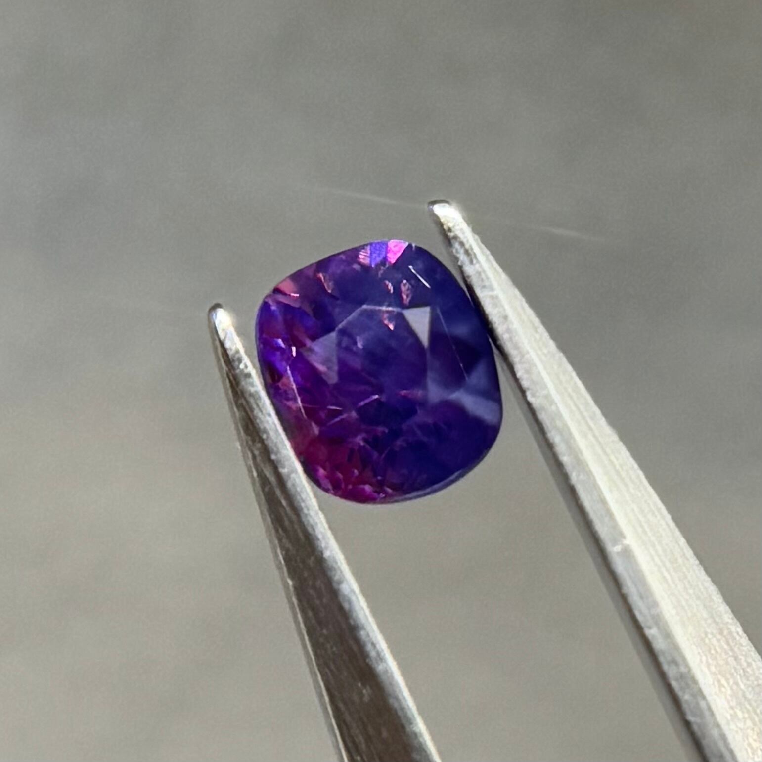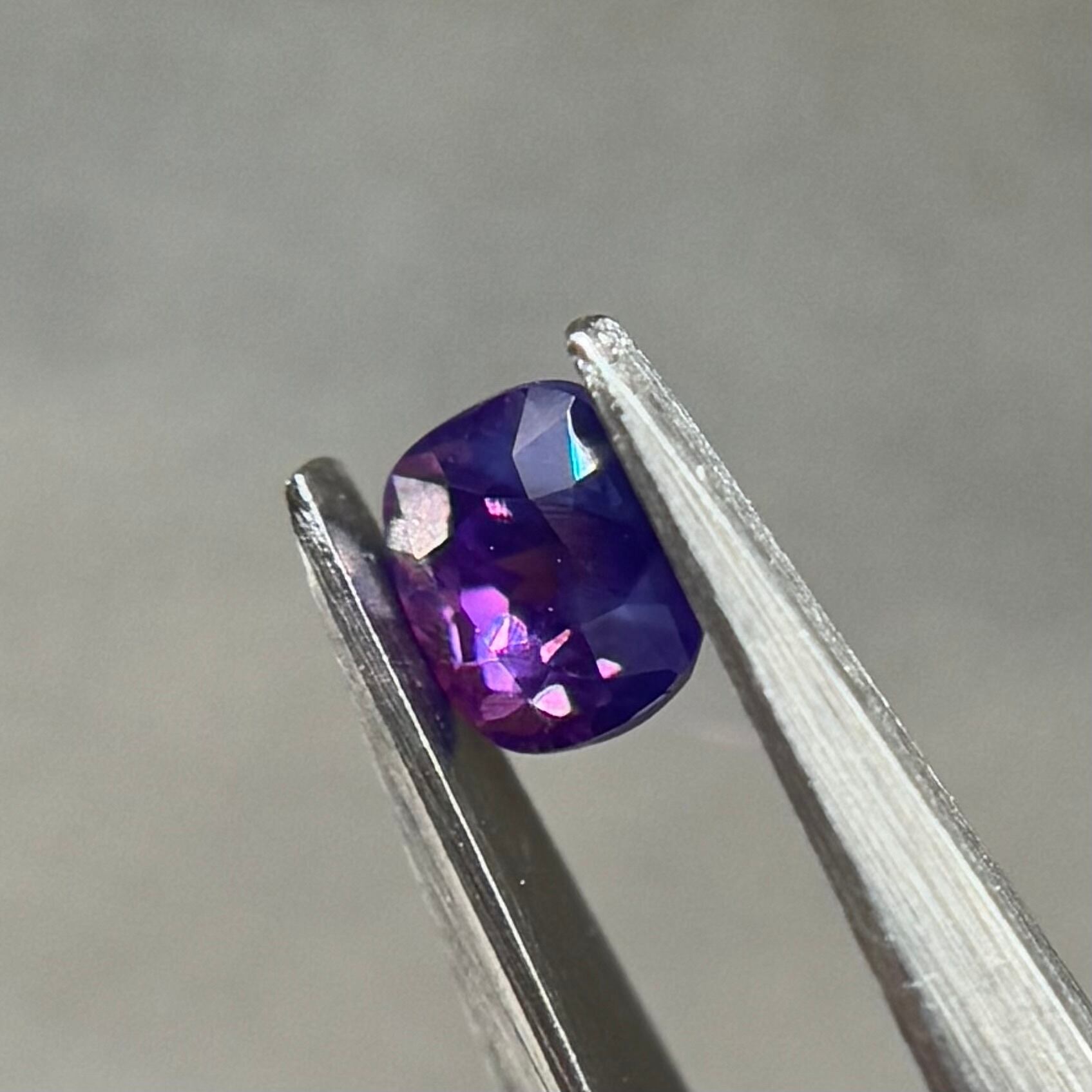青紫と紫でまるでバイカラーのようにも見える不思議な色合いのシルキーサファイアです。お尻が深めでパビリオン側からも色々な表情が楽しめます。光に透かすとグッとビビッドピンクが出てきて、まるで夜桜のようです。