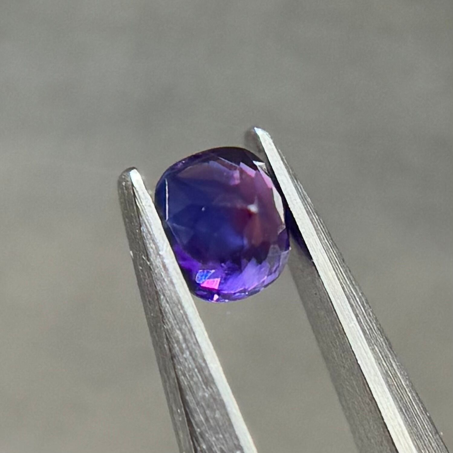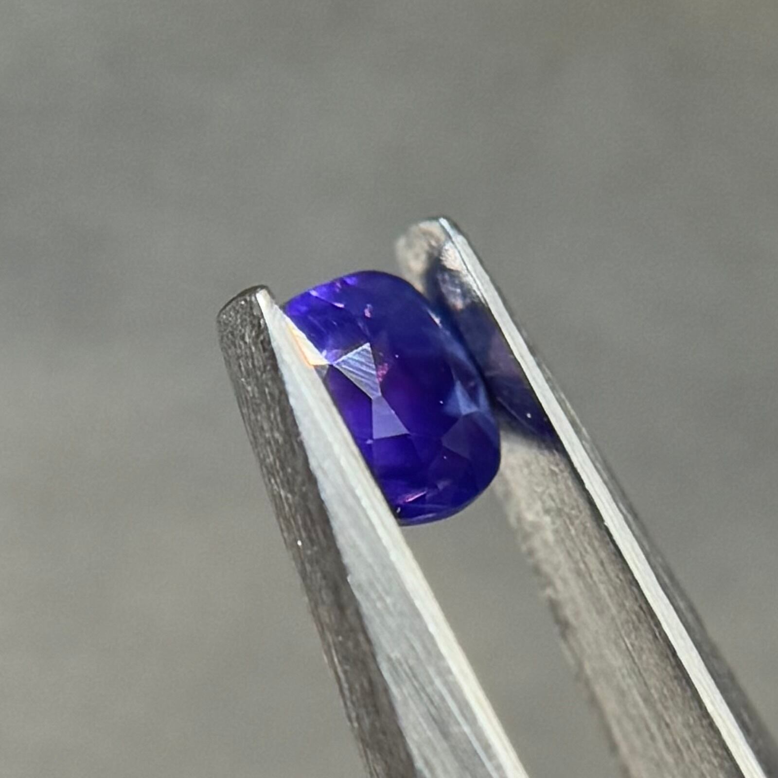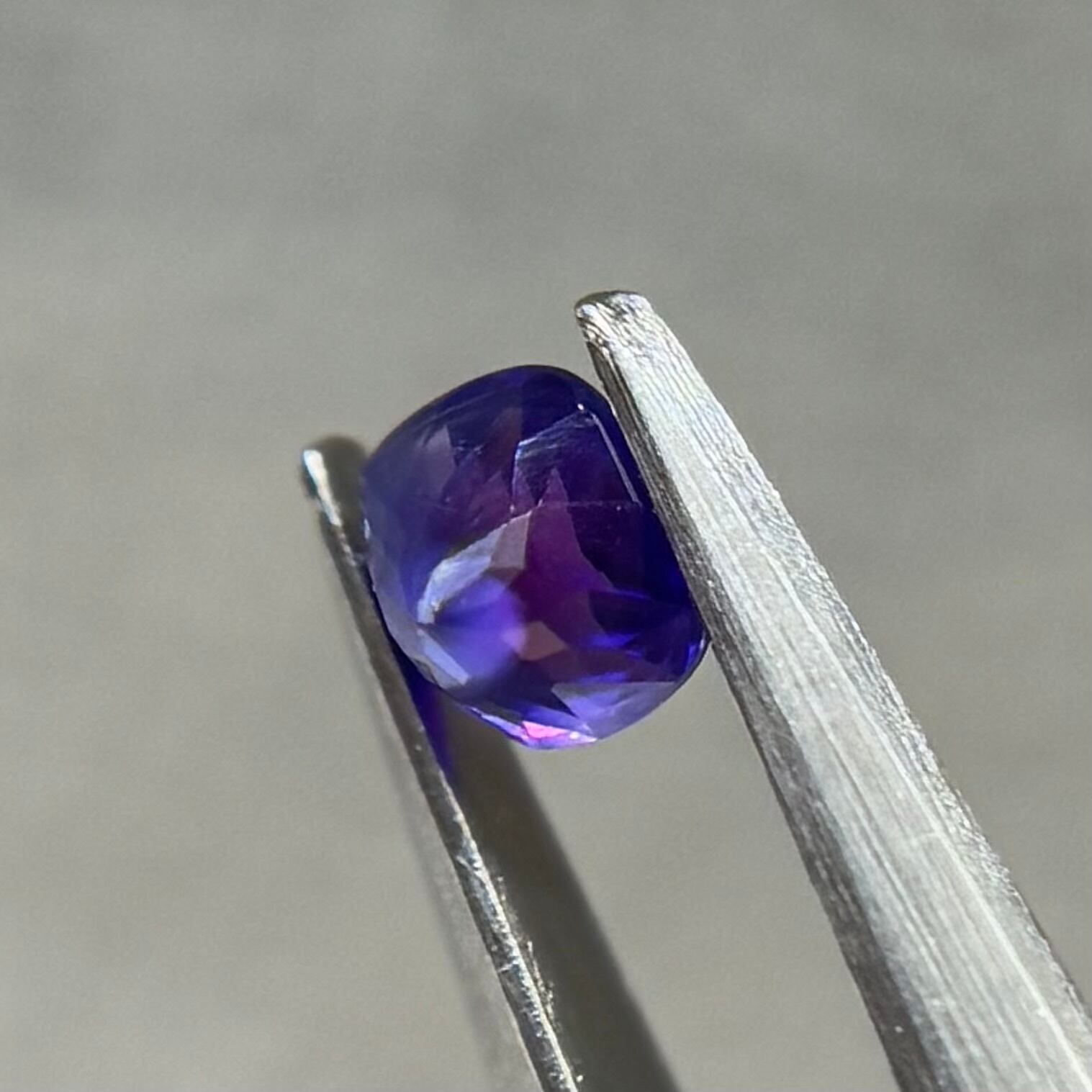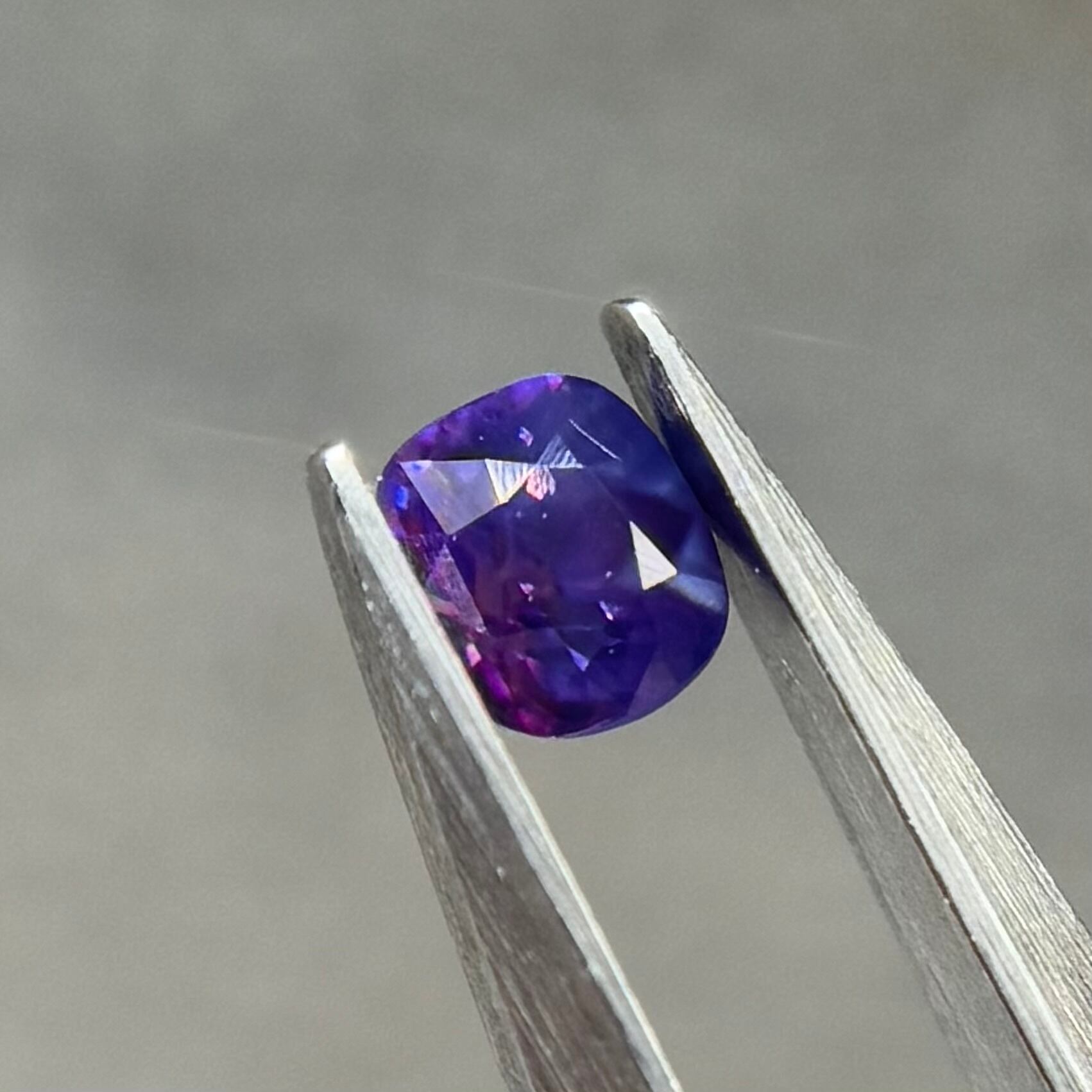 青紫と紫でまるでバイカラーのようにも見える不思議な色合いのシルキーサファイアです。お尻が深めでパビリオン側からも色々な表情が楽しめます。光に透かすとグッとビビッドピンクが出てきて、まるで夜桜のようです。
