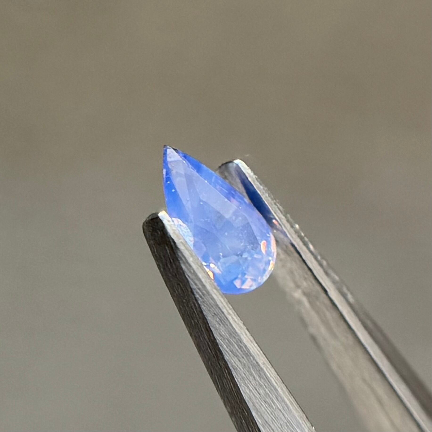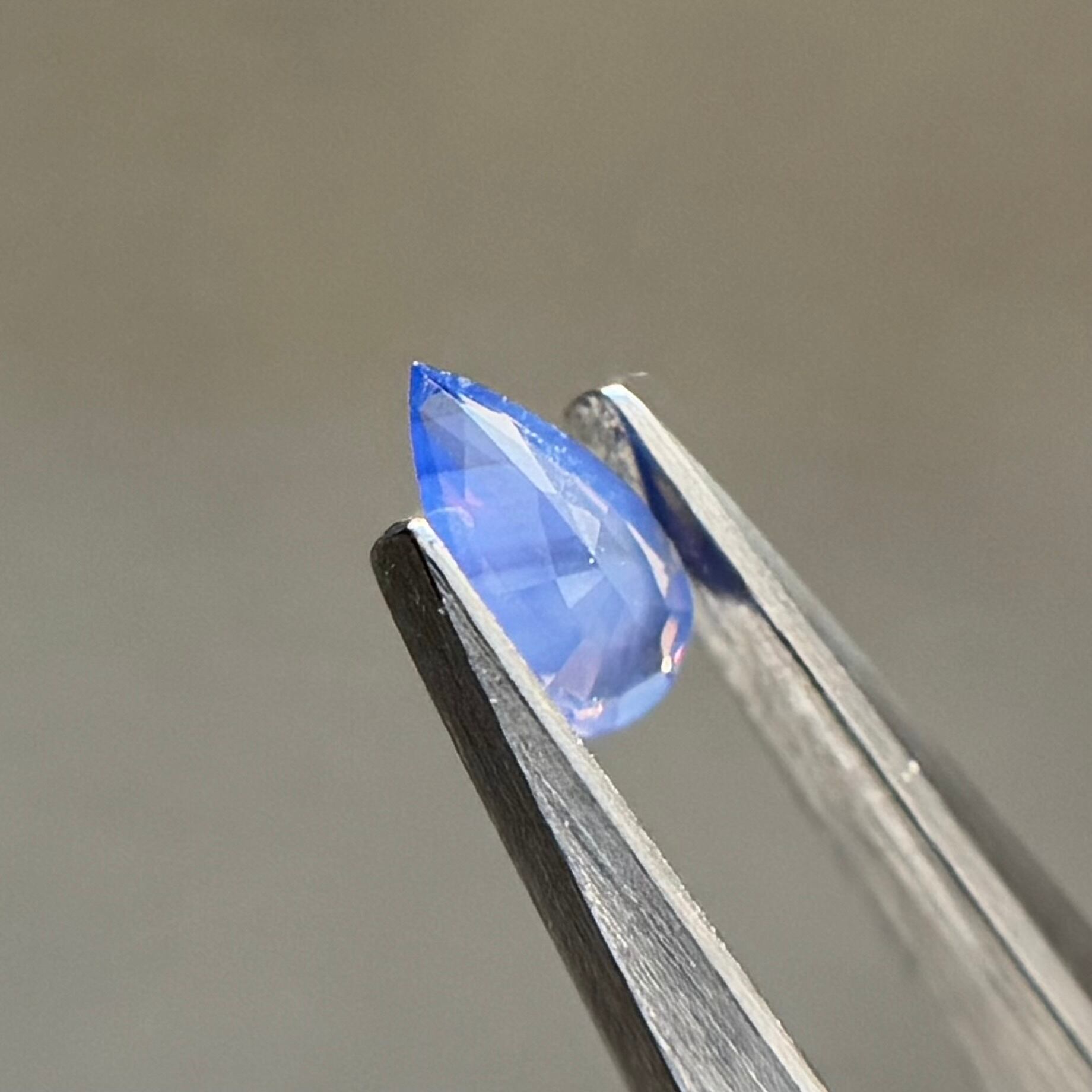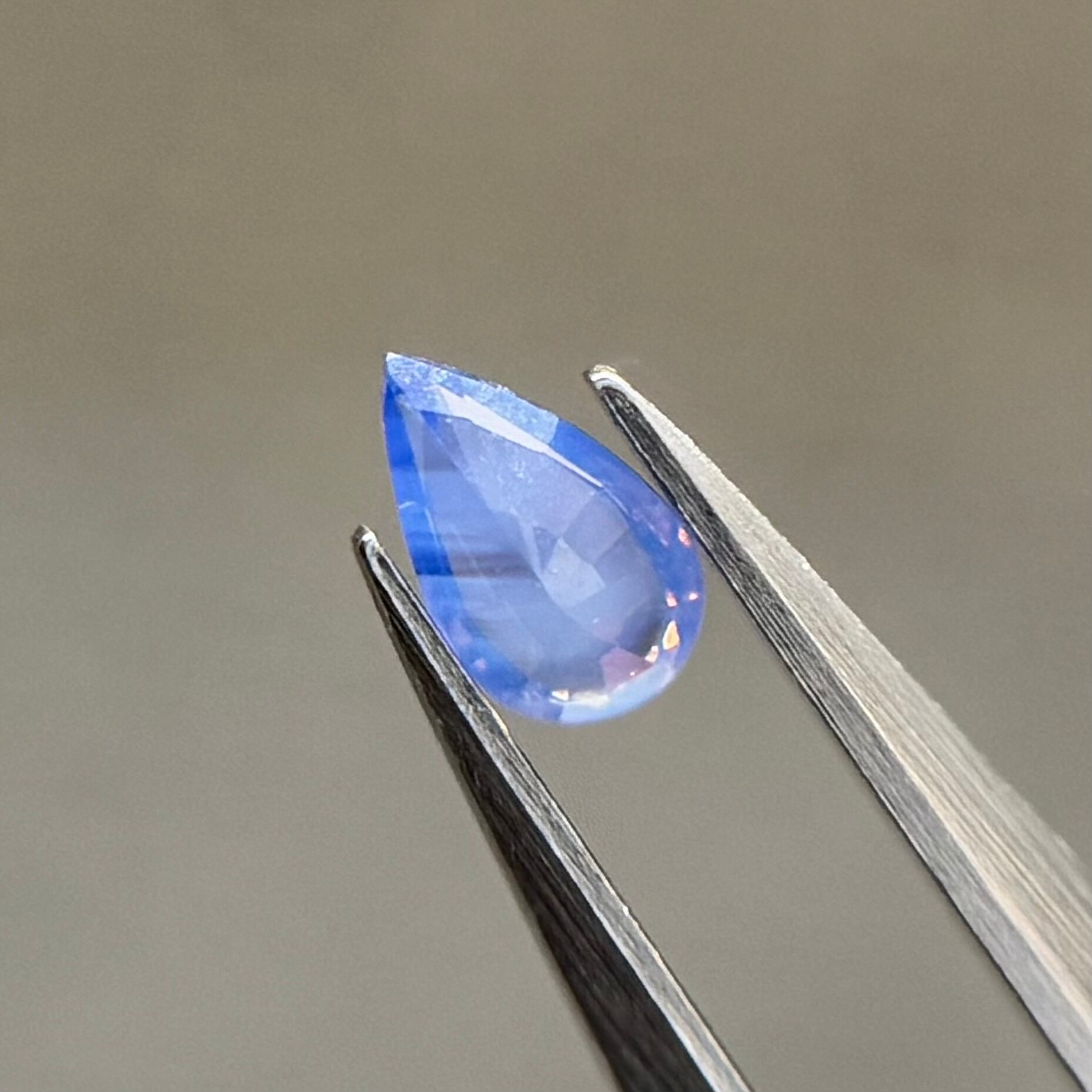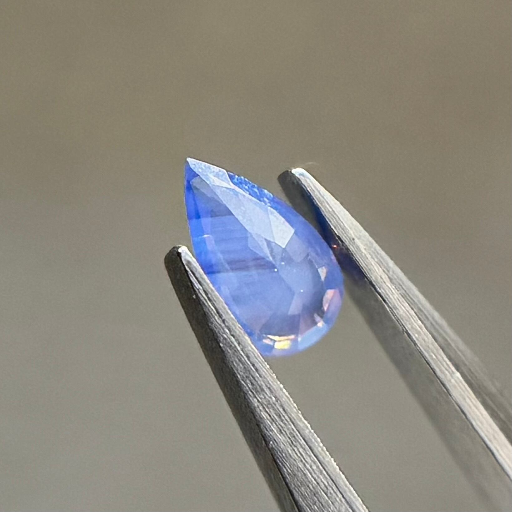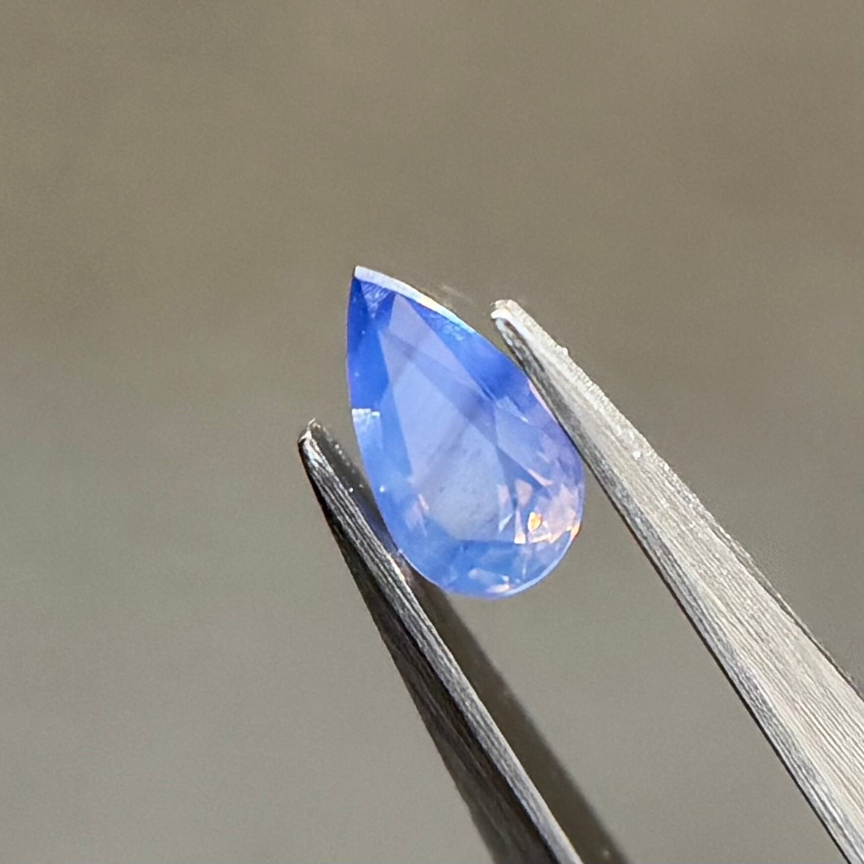 明るいミルキーブルーにクラウドインクルージョンと色帯バンドがまるで雲のように爽やかなシルキーサファイアです。たまに見えるピンクが茜雲のようでまるで夕方に差し掛かる空のようにも見えます