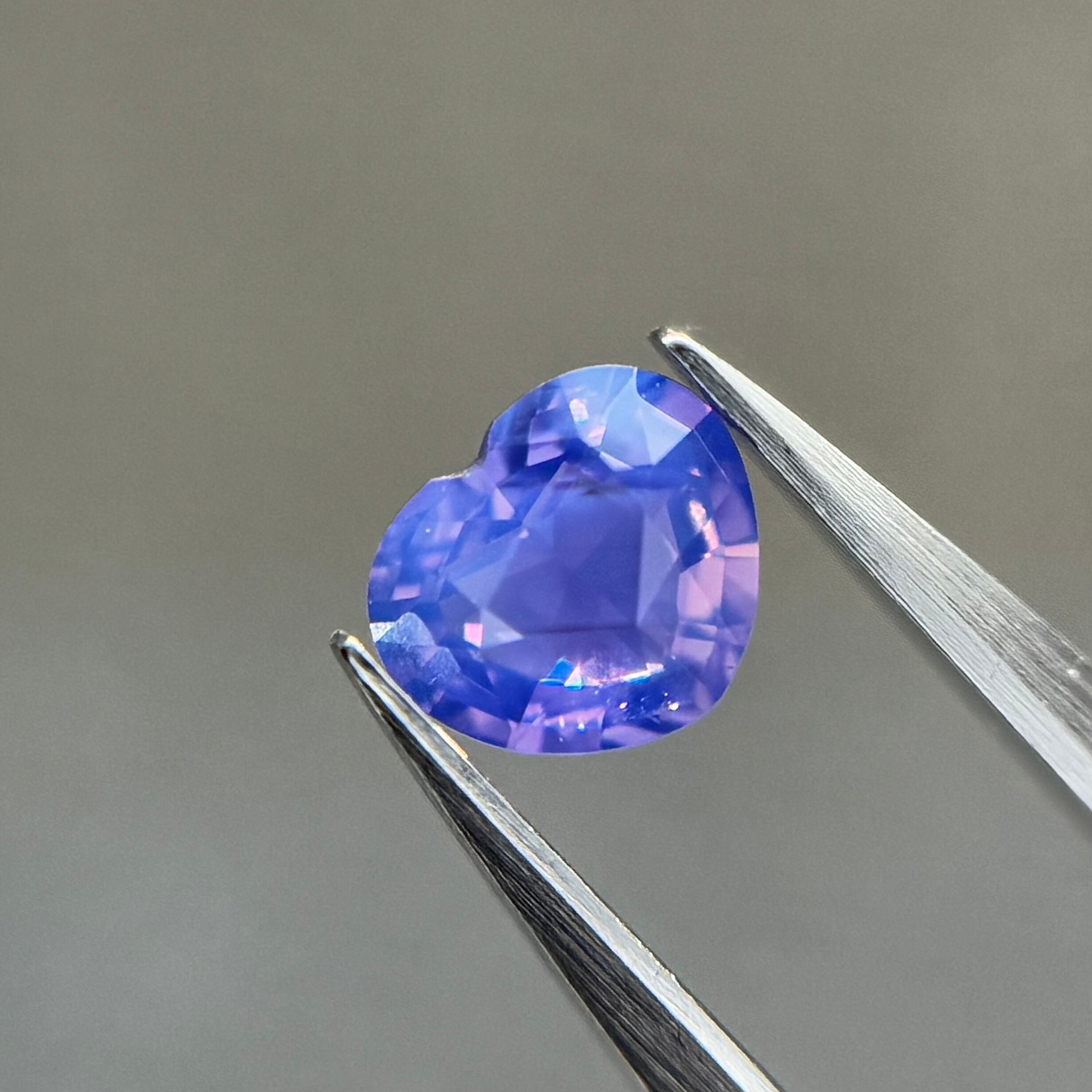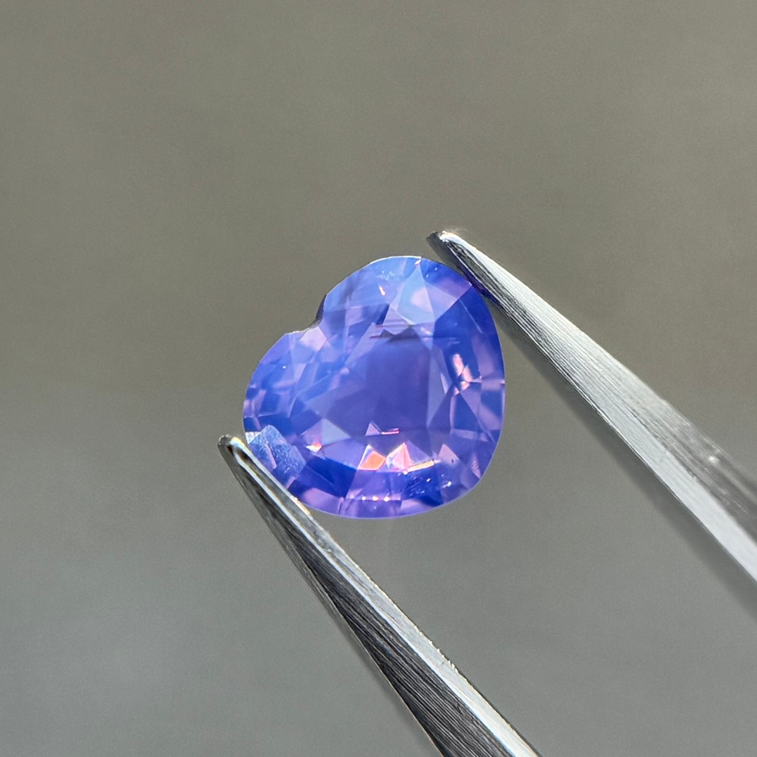 青紫色の中に暖色系のテリがばちばちと美しいシルキーサファイアです。向かって右側が少し青みが強いため、角度によって青色と紫色の割合が変わります