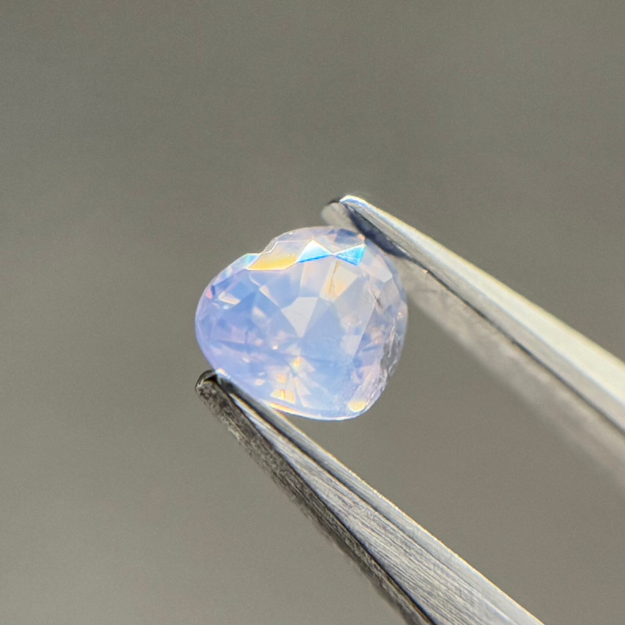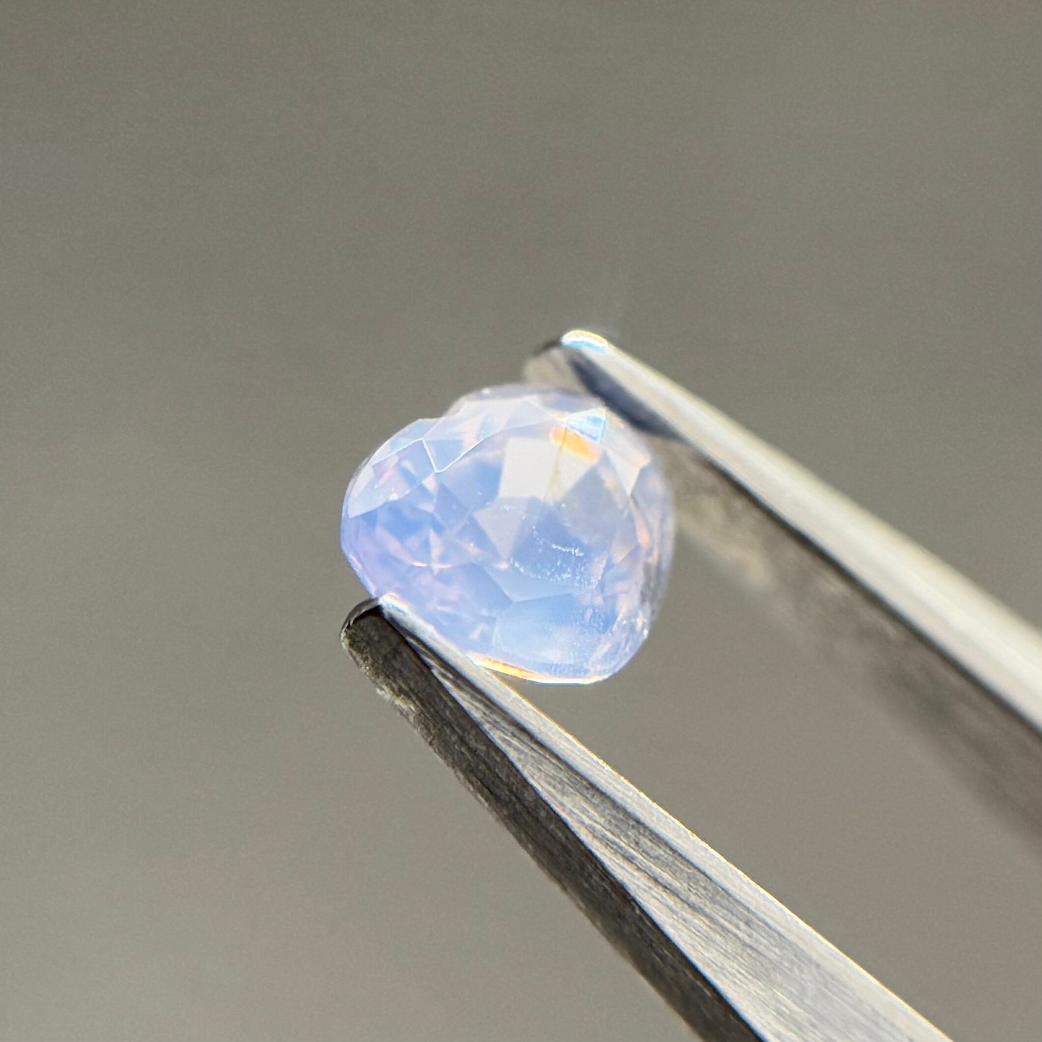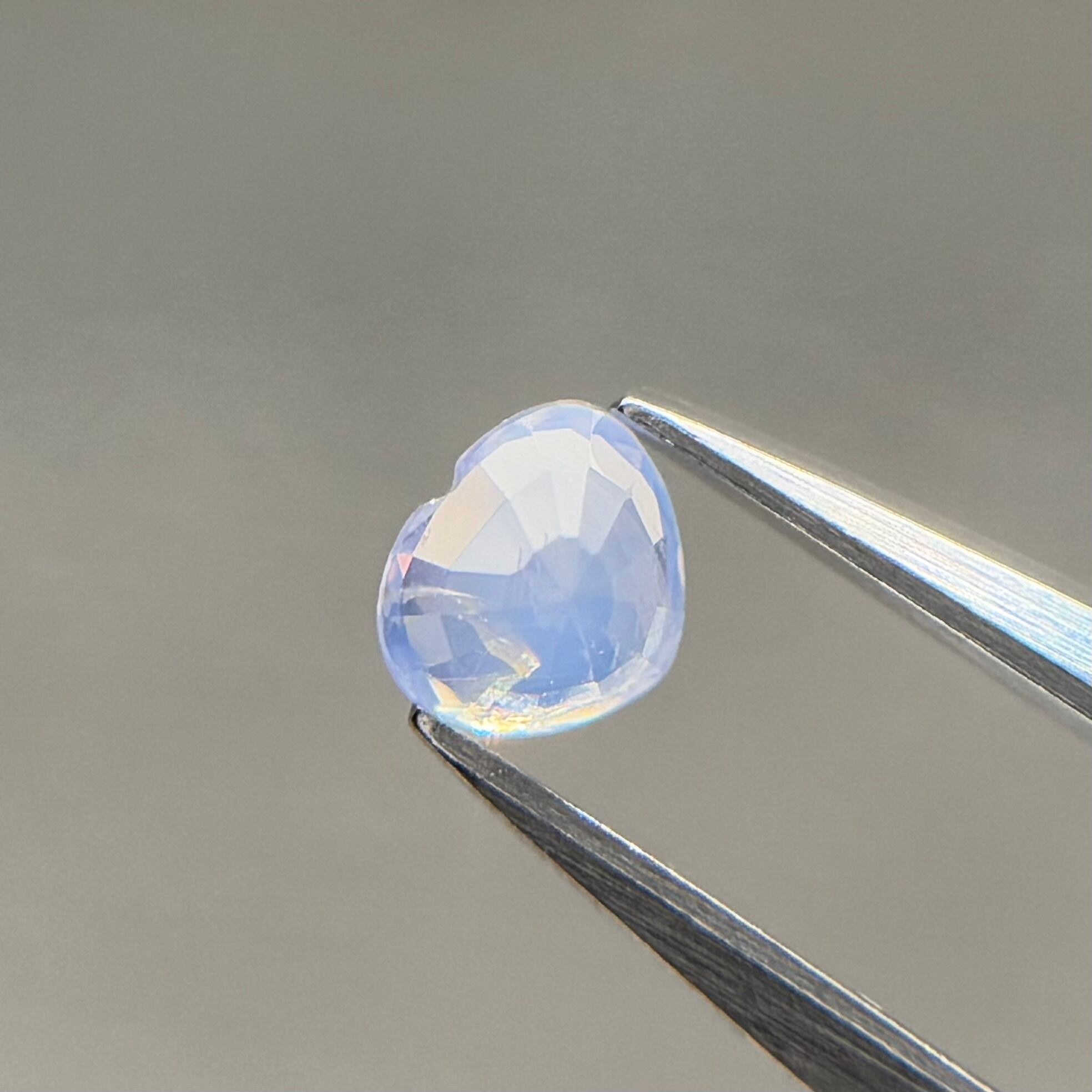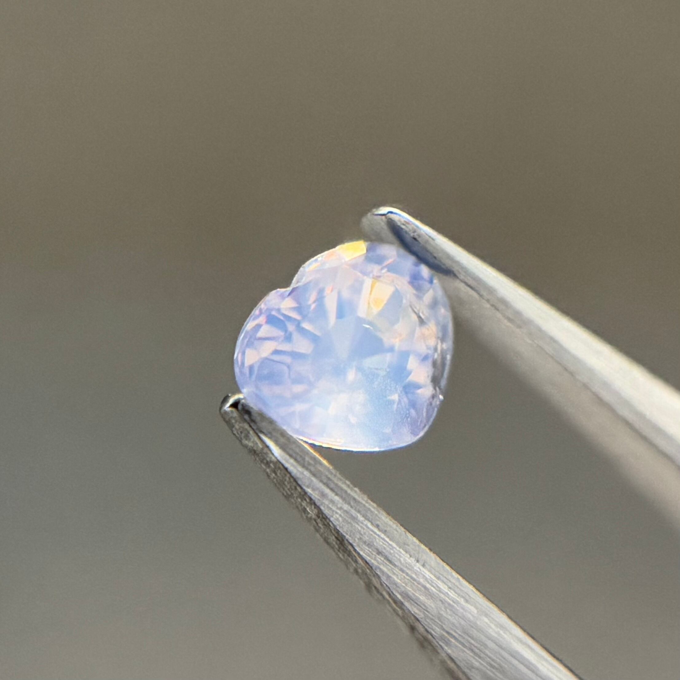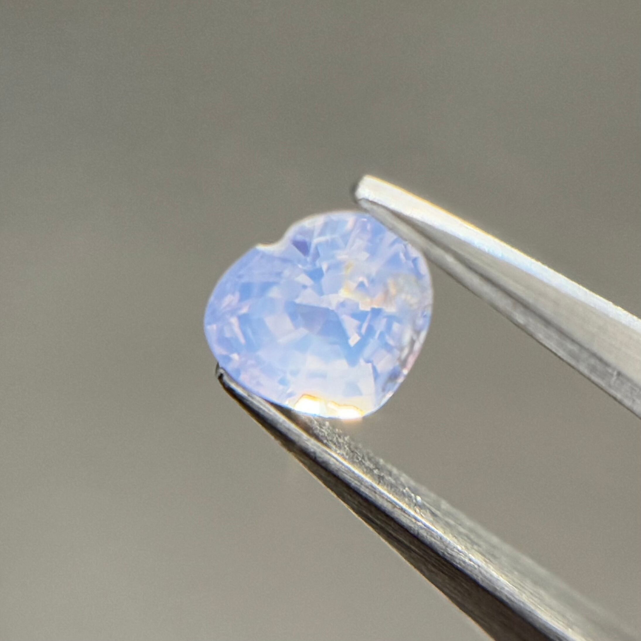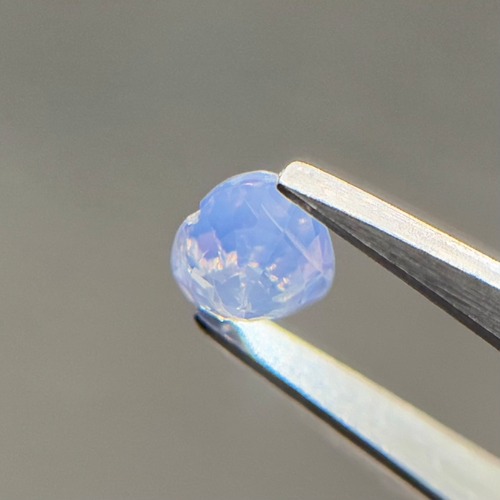 アイスブルーに黄色のテリが爽やかなシルキーサファイアです。大きめの結晶体インクルージョンがありますが、テリにうまく隠れて肉眼だとそこまで気にはならないです。パビリオン側からガードルをルーペで見ると小さな虹があります