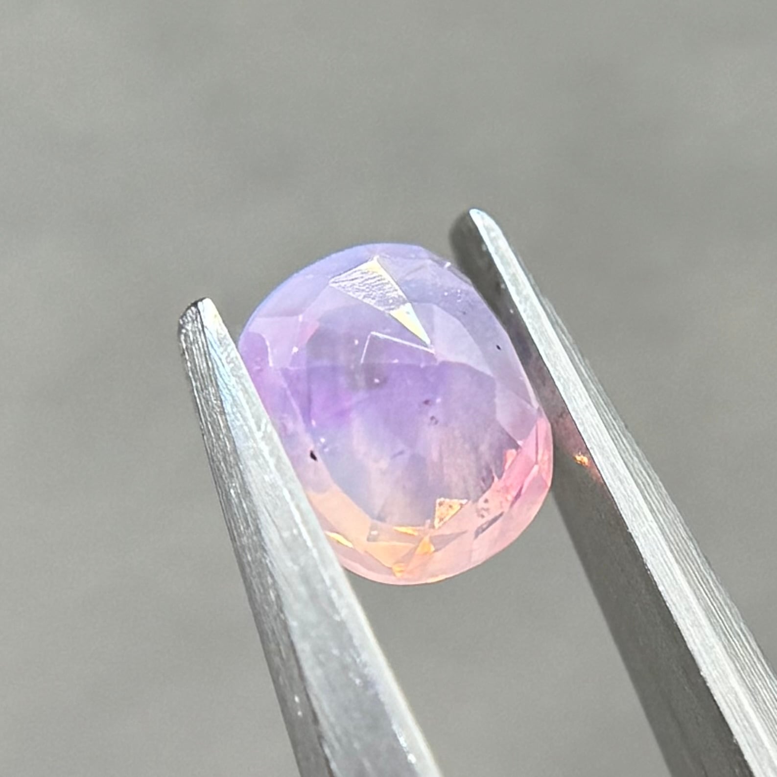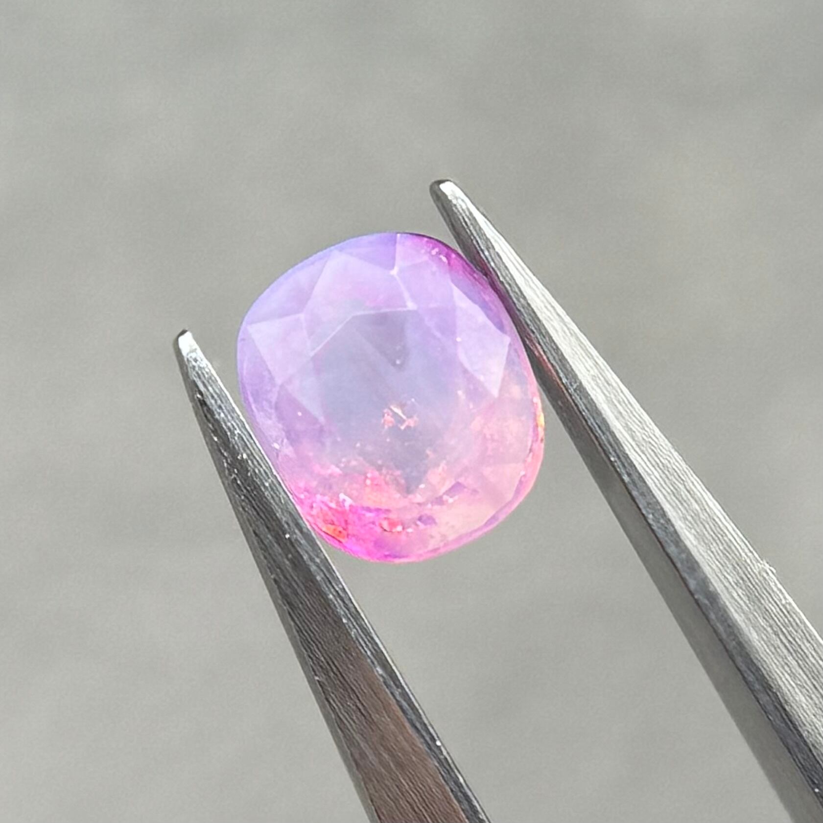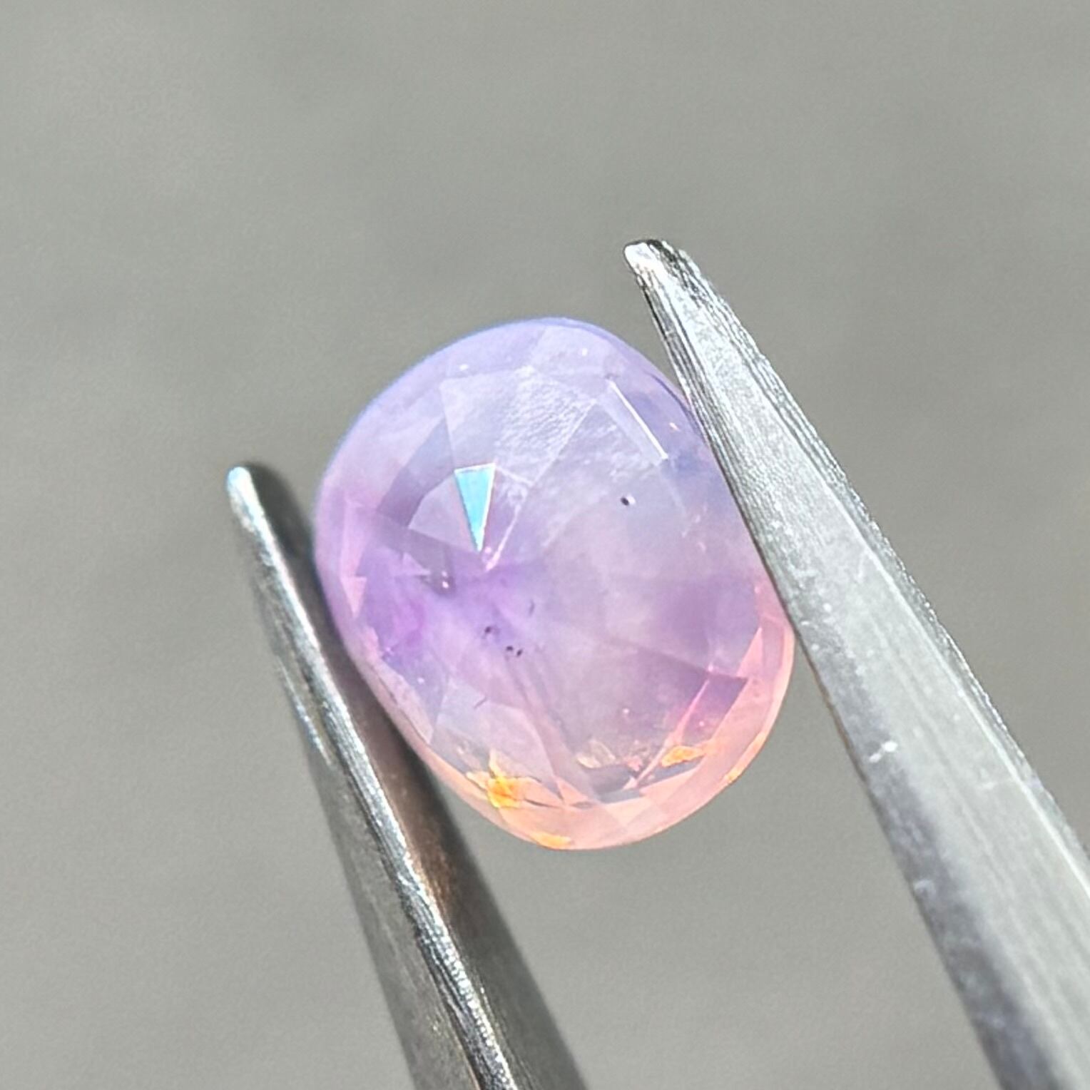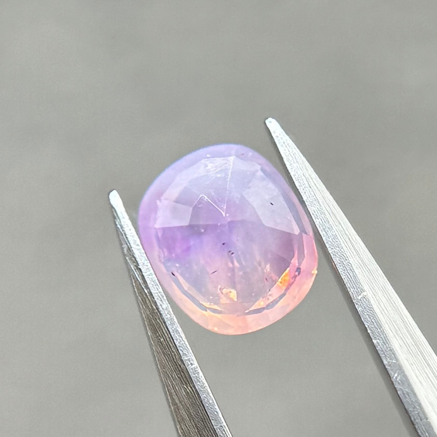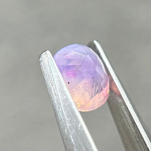 両端にある異なる色合いの色だまりがとても可愛らしいシルキーサファイアです。パビリオン側に黒インクルージョンがありますが、テーブル側には響きません。結晶体インクルージョンと液体インクルージョンがしゅわしゅわの炭酸のようでまるでサイダーのような子です