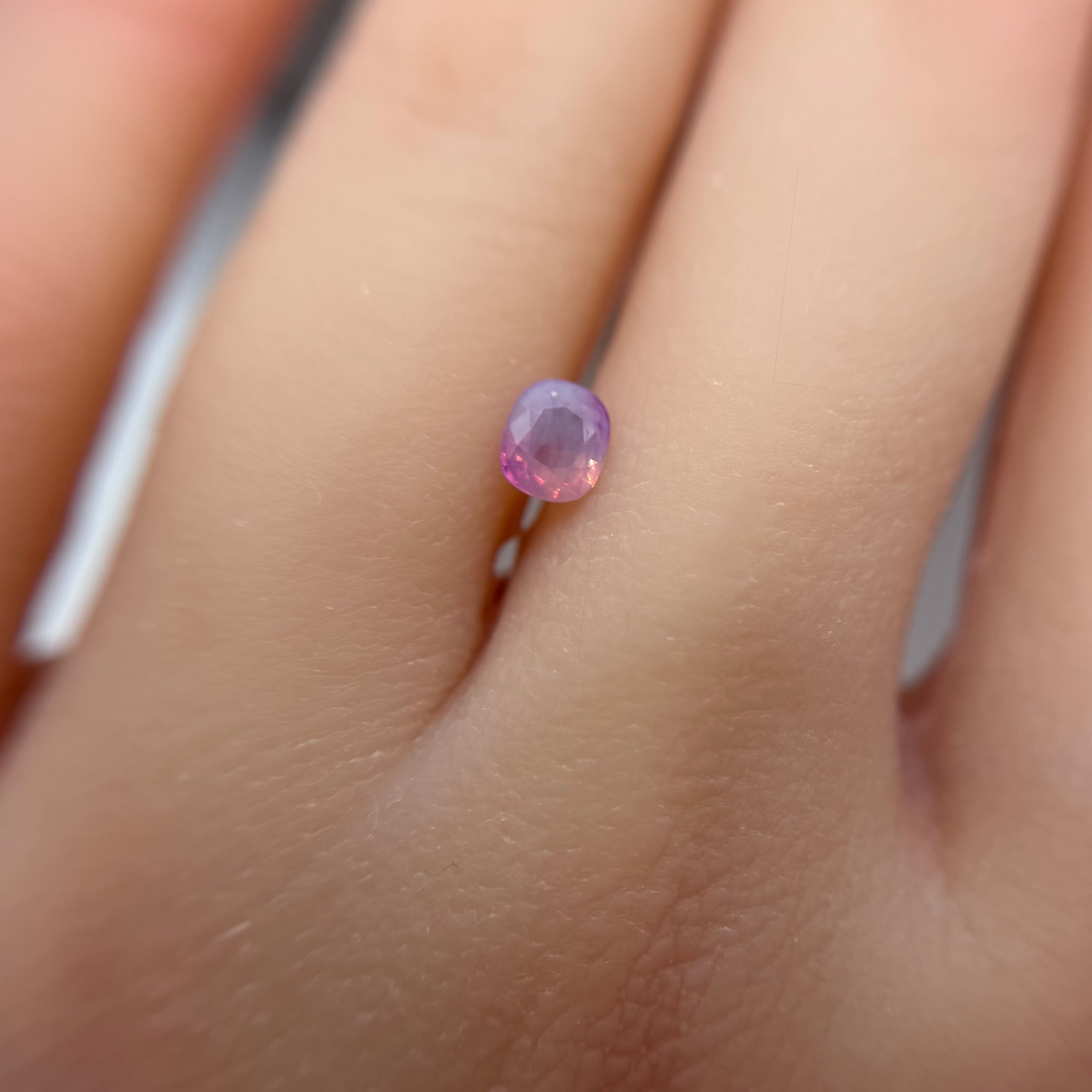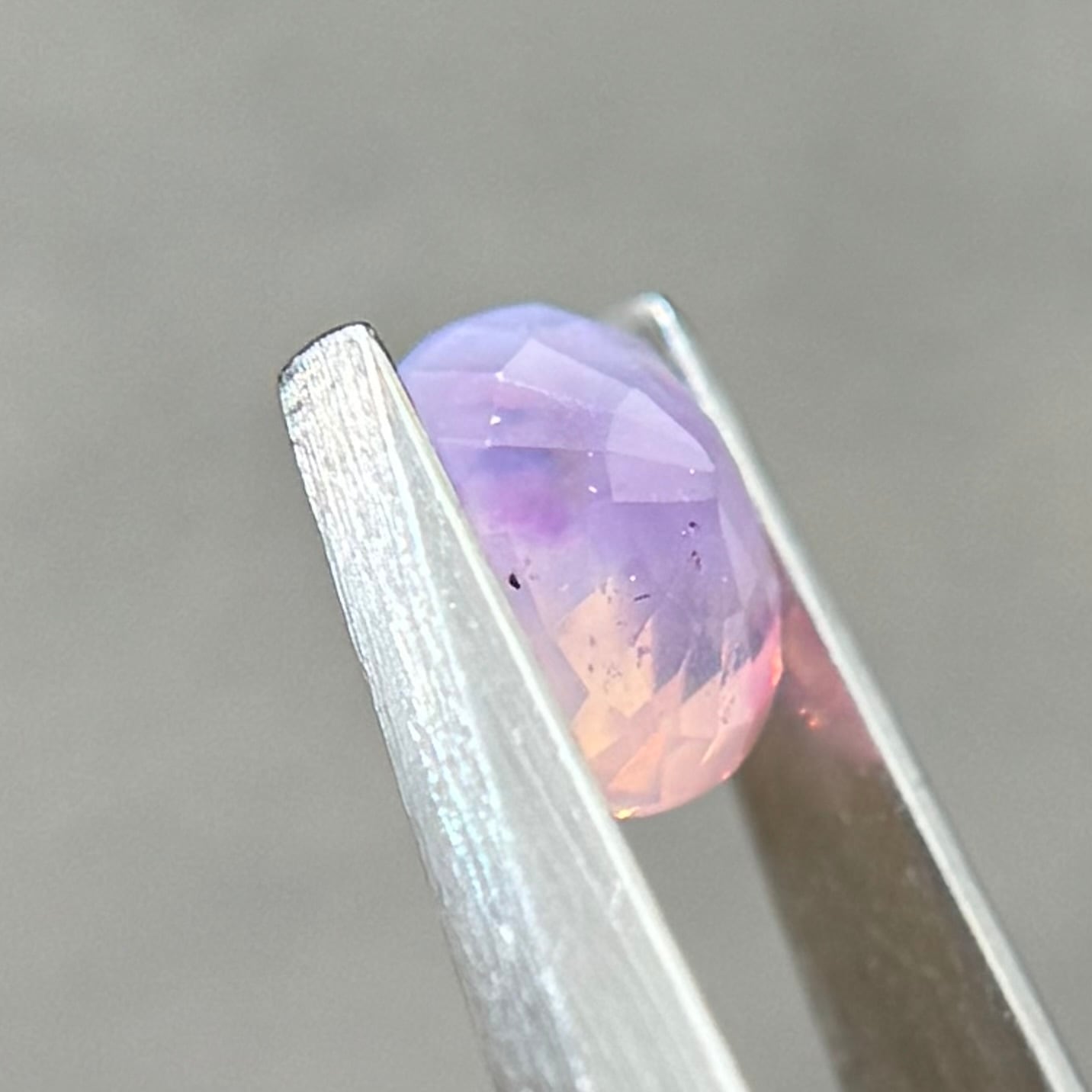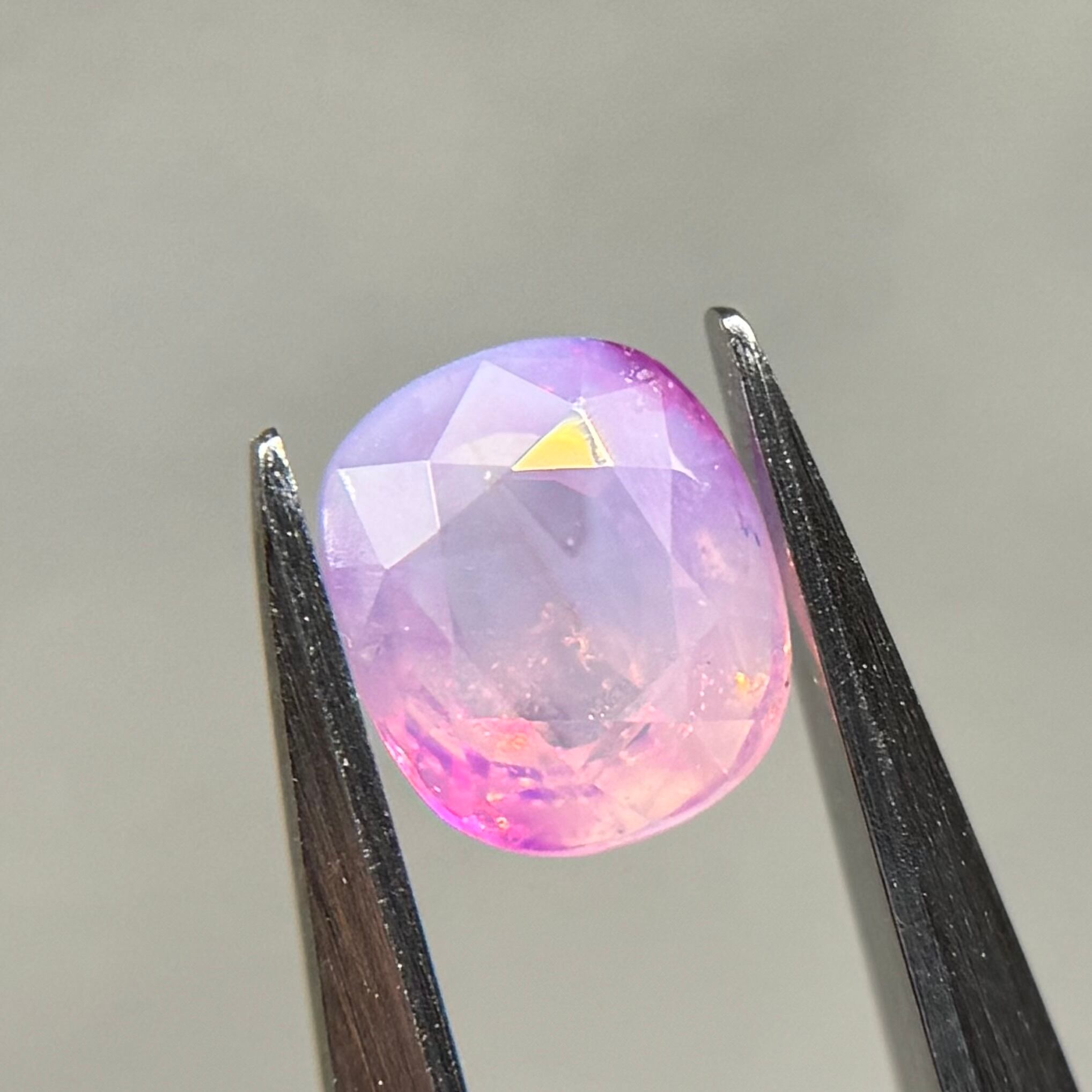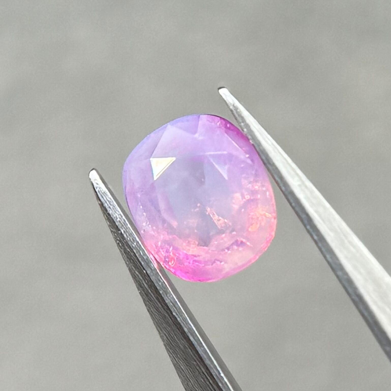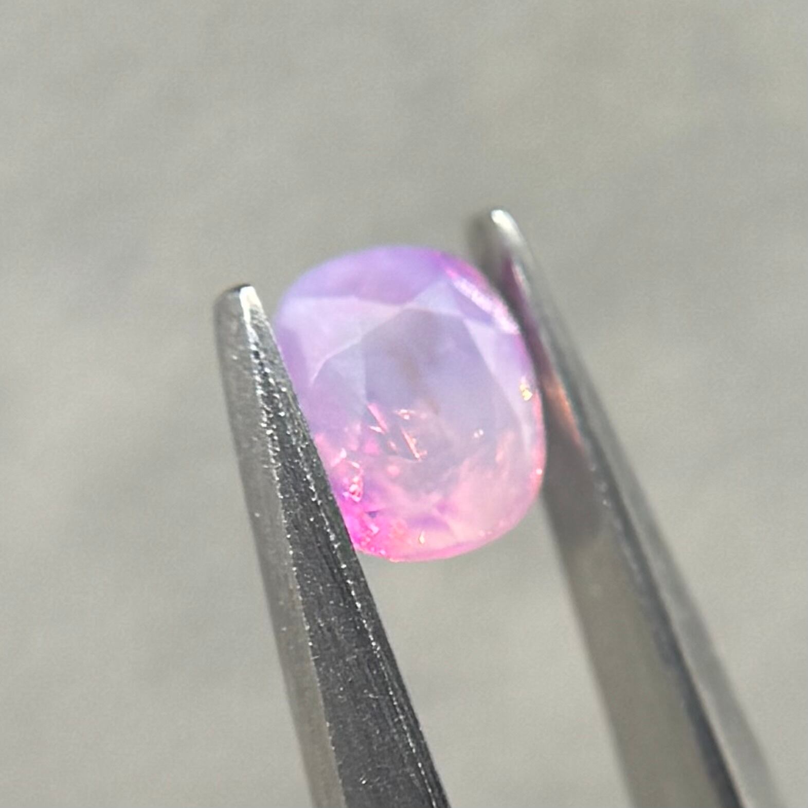 両端にある異なる色合いの色だまりがとても可愛らしいシルキーサファイアです。パビリオン側に黒インクルージョンがありますが、テーブル側には響きません。結晶体インクルージョンと液体インクルージョンがしゅわしゅわの炭酸のようでまるでサイダーのような子です