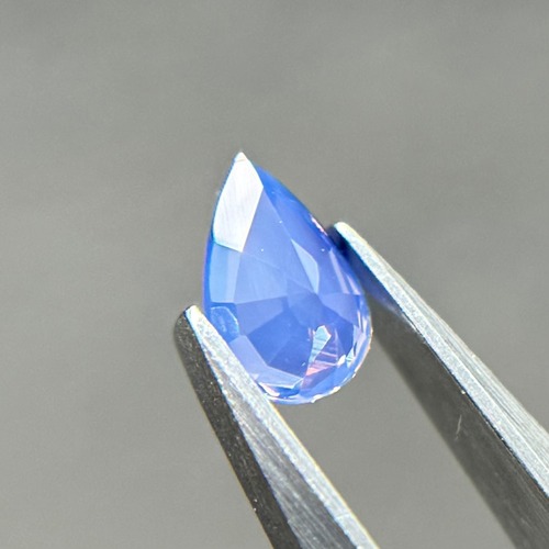 明るいミルキーブルーにテリがキラキラと雫のように煌めくシルキーサファイアです。どちらを上にするかでテリの出方がガラッと変わるのでギャップをお楽しみください