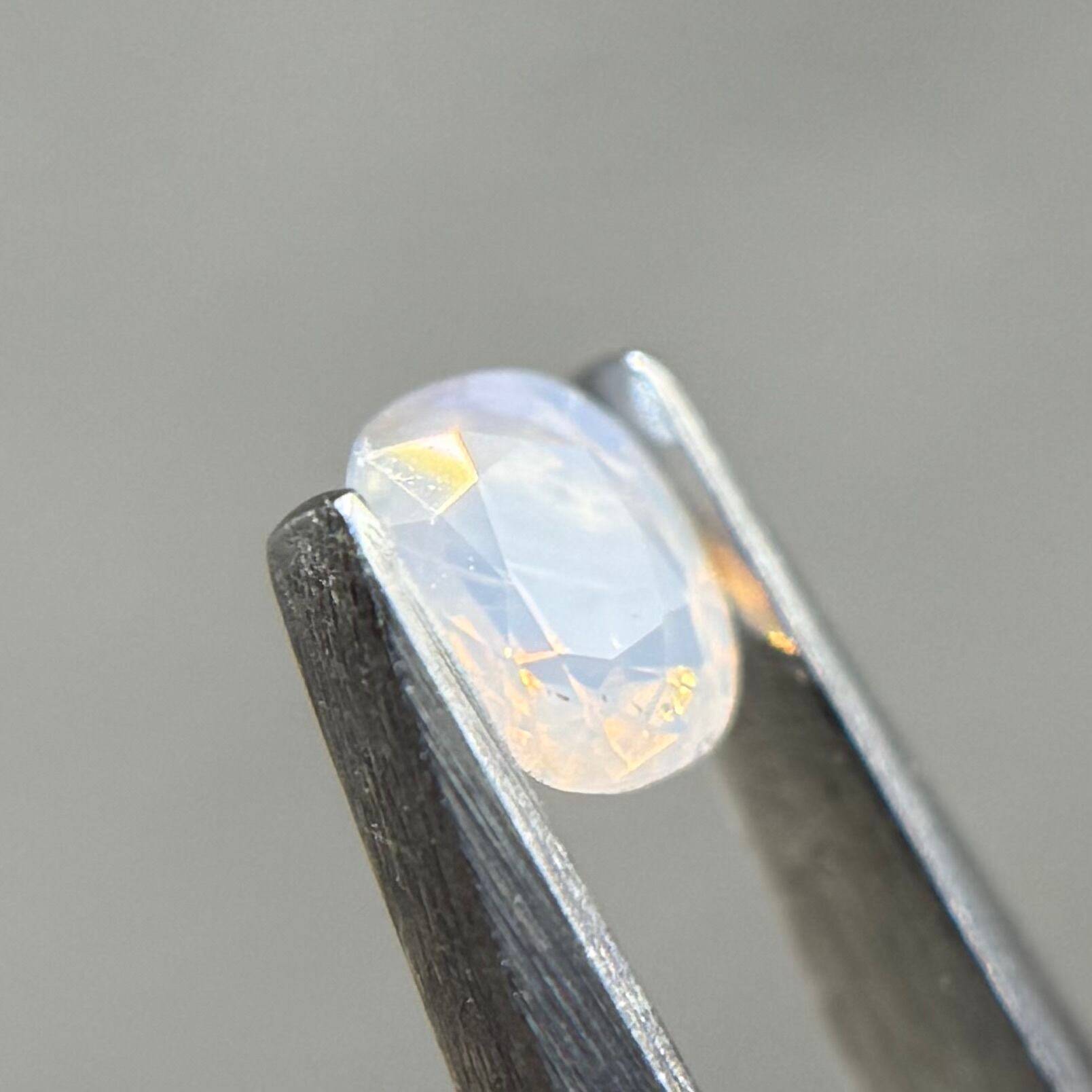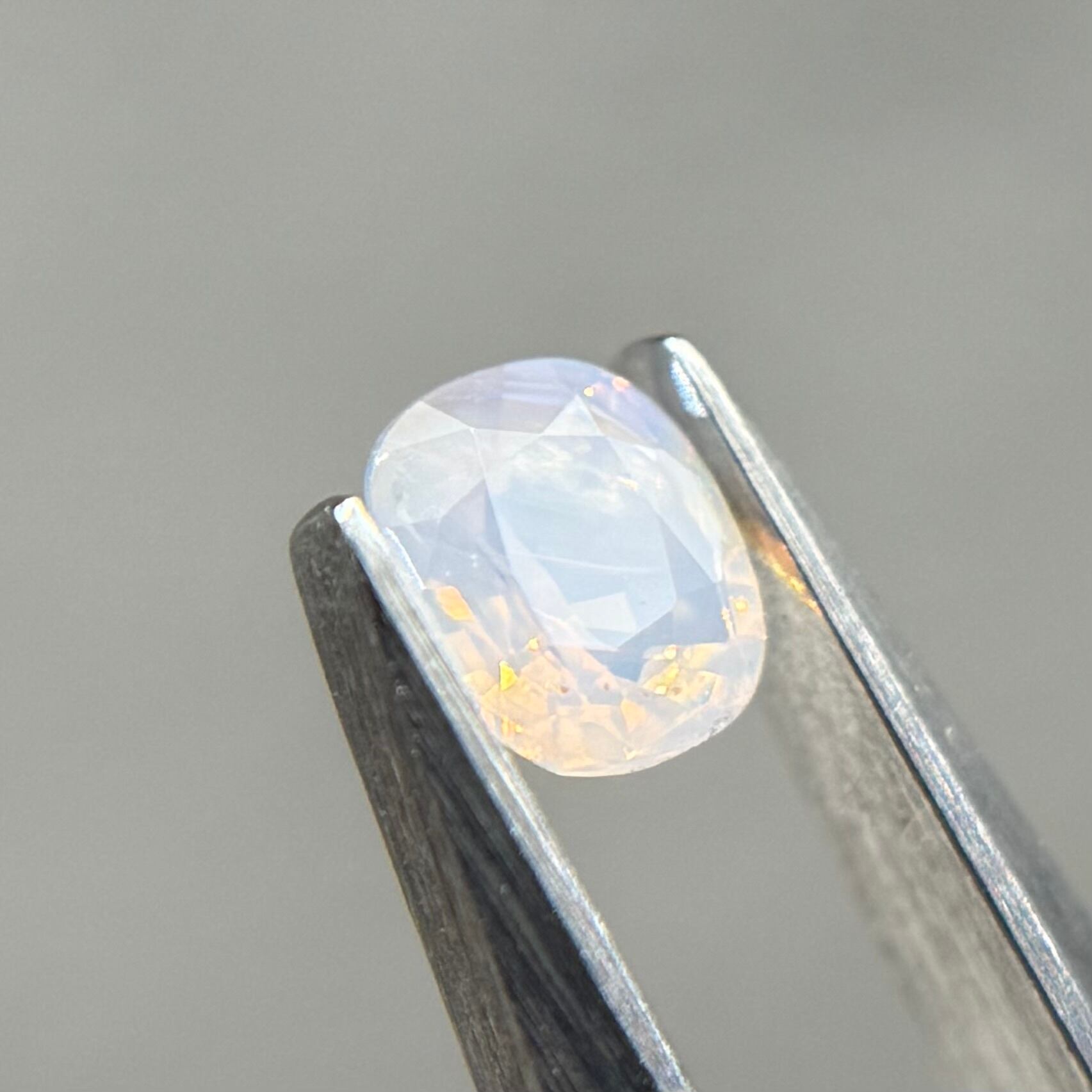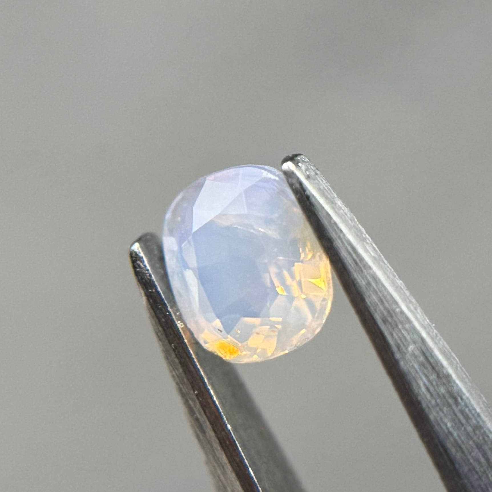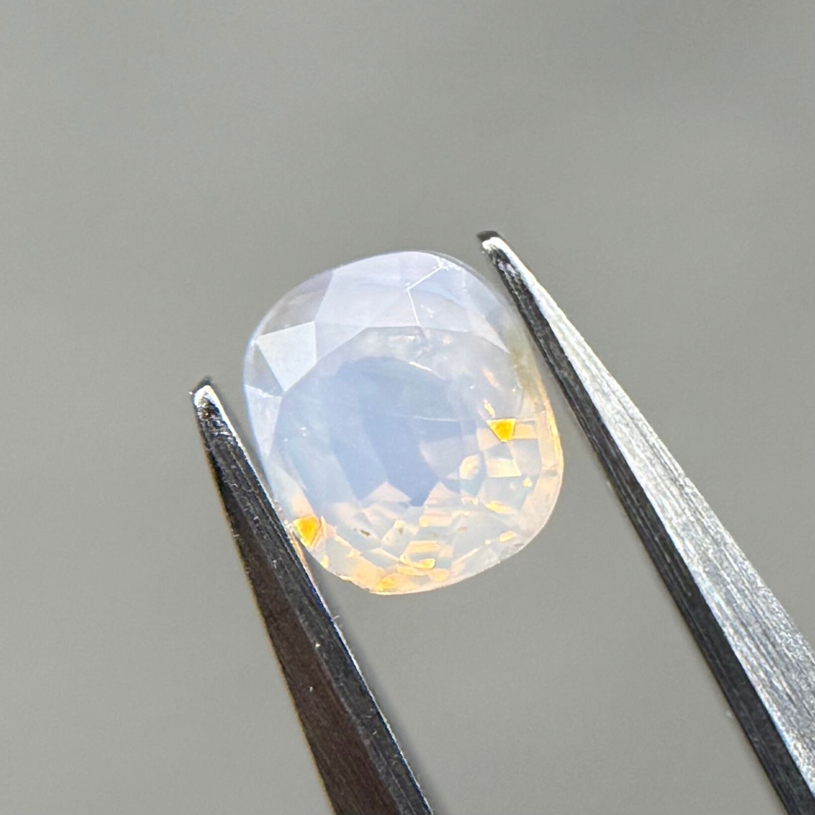 薄ぼんやりした水色にオレンジと黄色のテリがまるで曇り空の日の夕焼けのように美しいシルキーサファイアです。黄色を伴う結晶体インクルージョンは、大きめではありますが肉眼ではテリに隠れて気にならないです