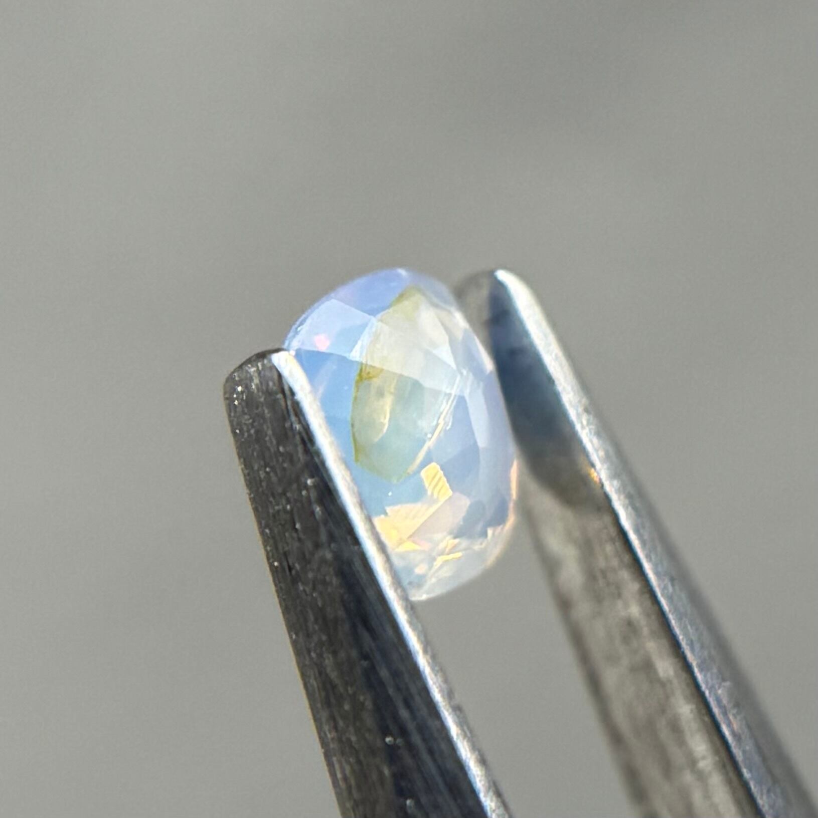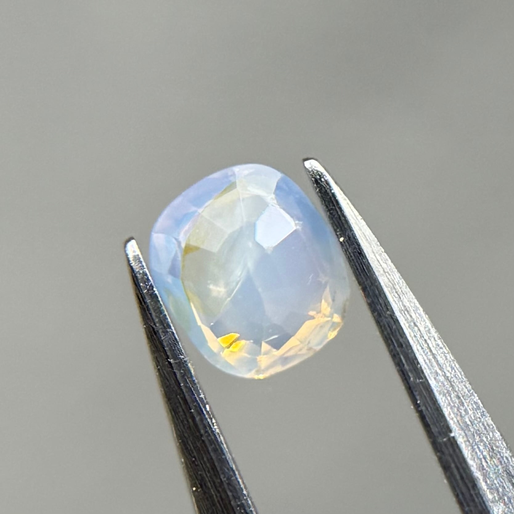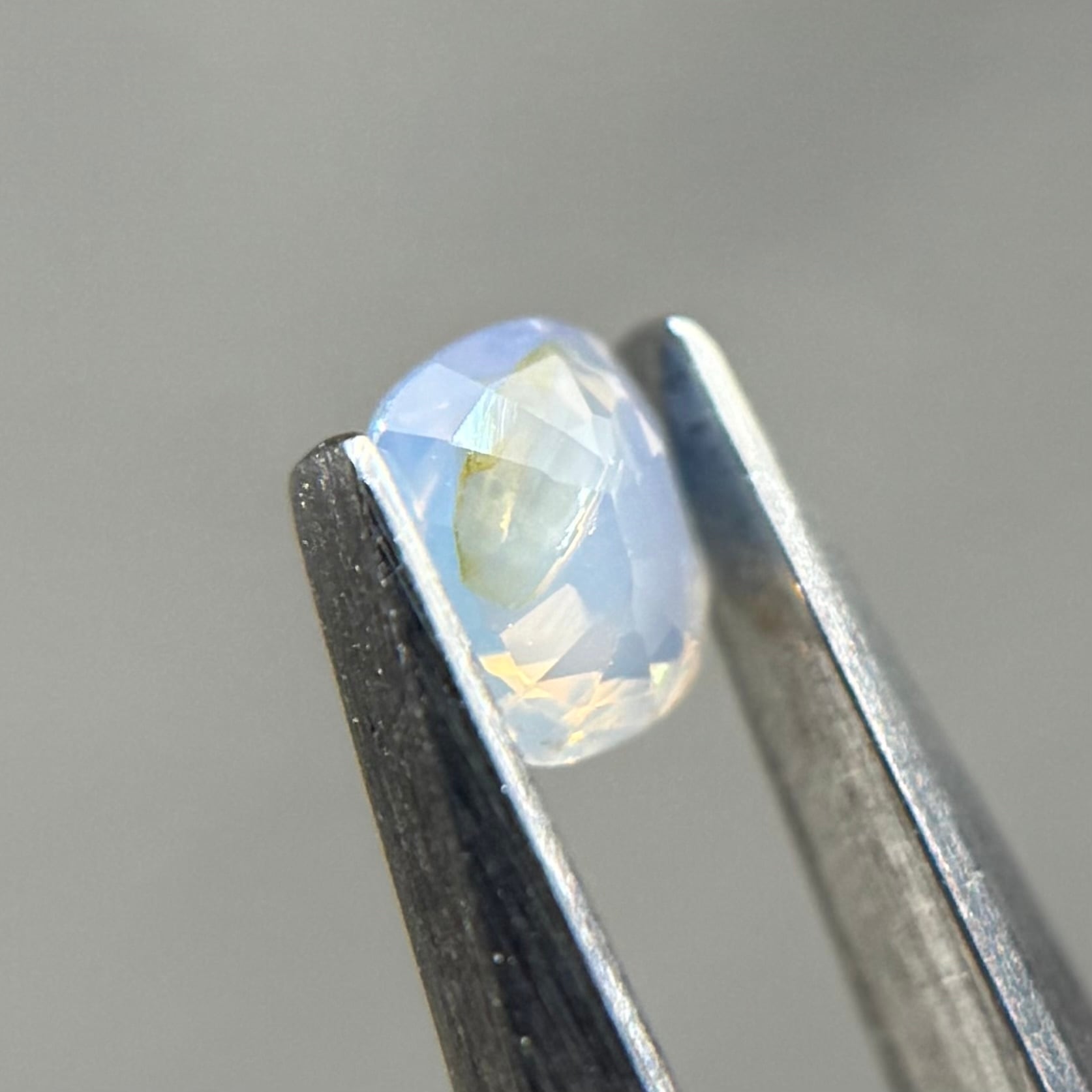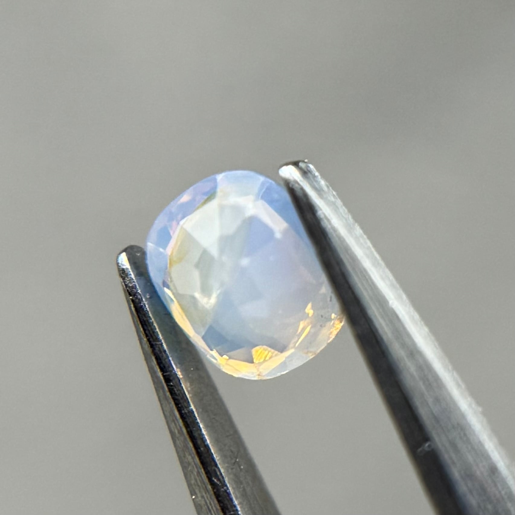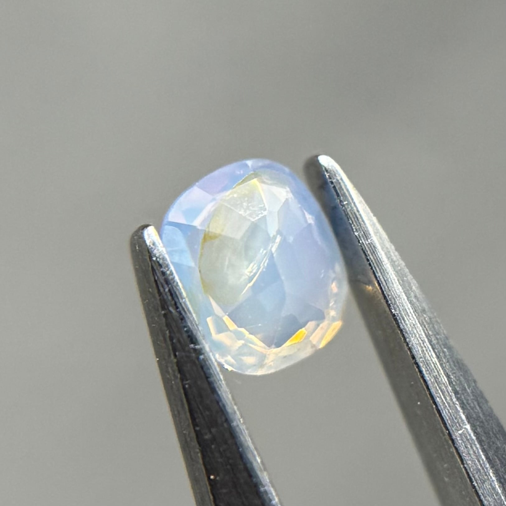 薄ぼんやりした水色にオレンジと黄色のテリがまるで曇り空の日の夕焼けのように美しいシルキーサファイアです。黄色を伴う結晶体インクルージョンは、大きめではありますが肉眼ではテリに隠れて気にならないです