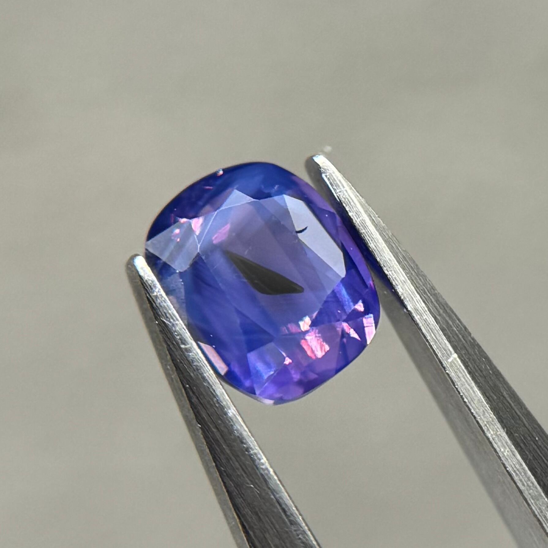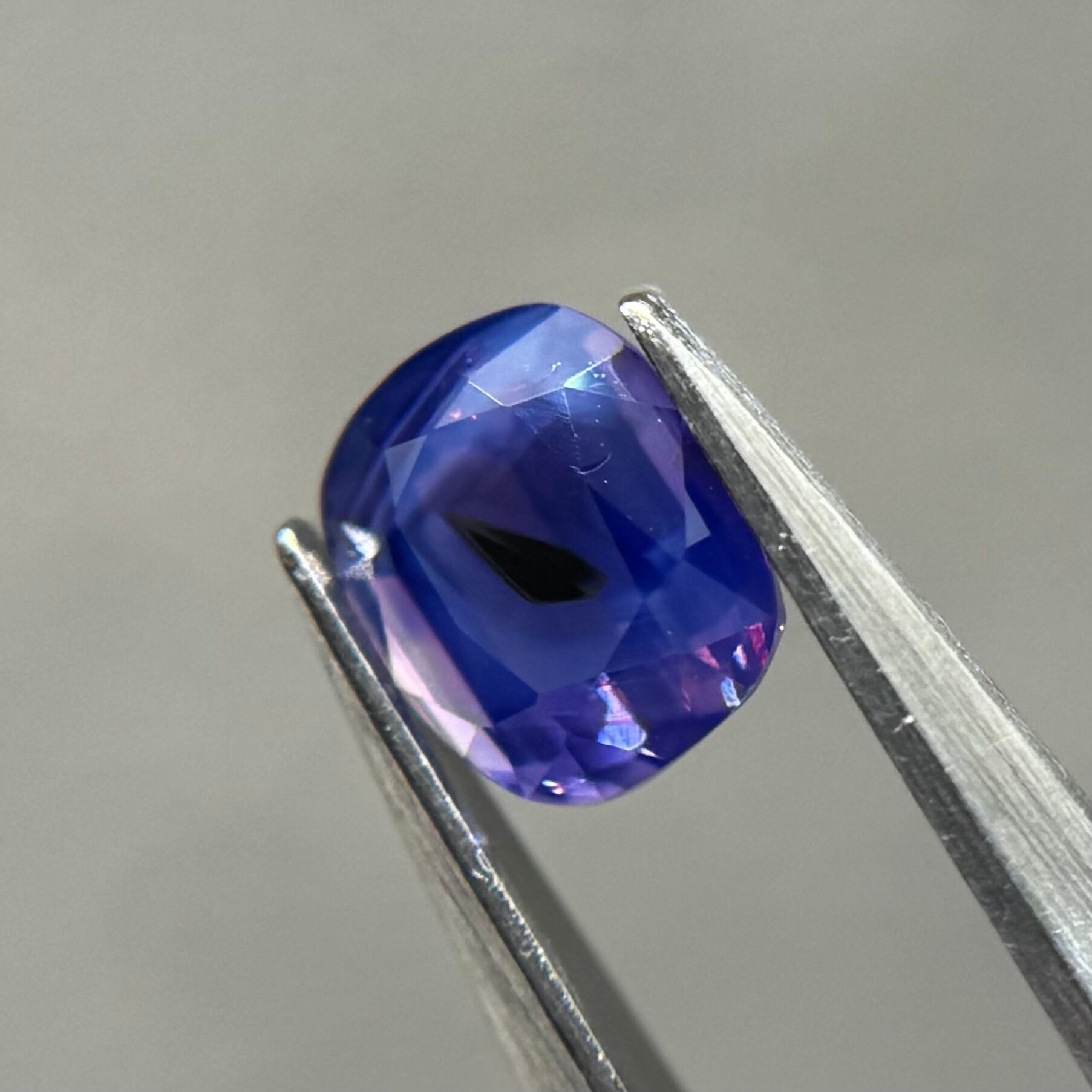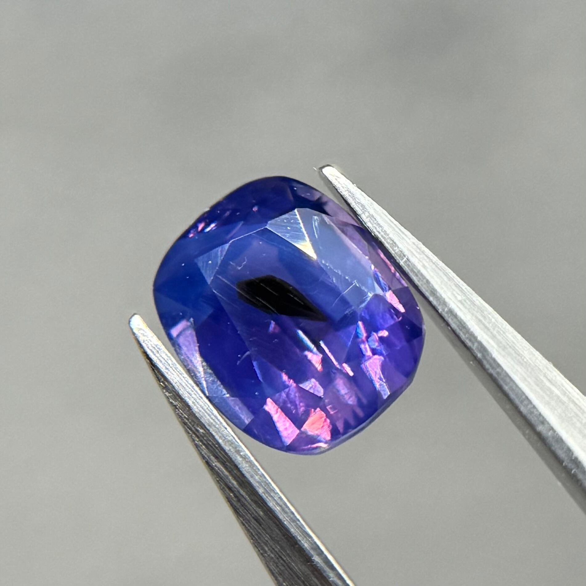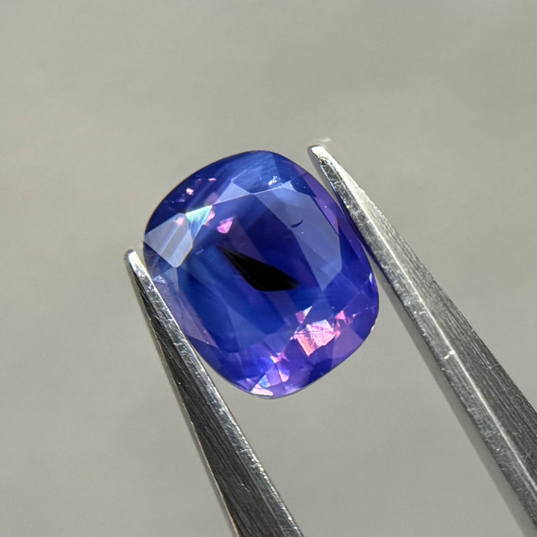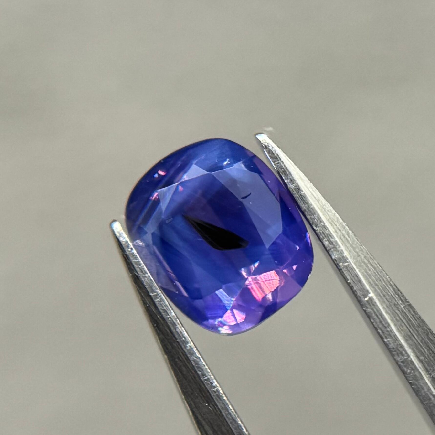 少し傾けるだけで全面にブワッとピンクと紫の極彩色なテリが浮かび上がるシルキーサファイアです。真ん中にある色だまりがまるでブラックムーンのようで可愛いです