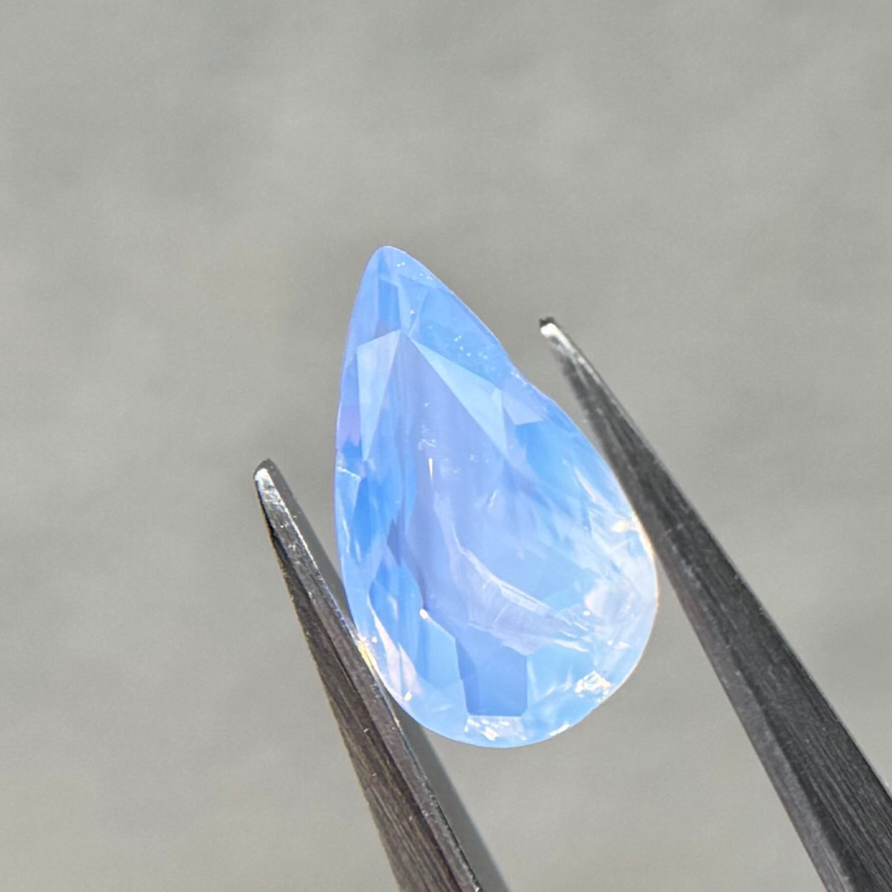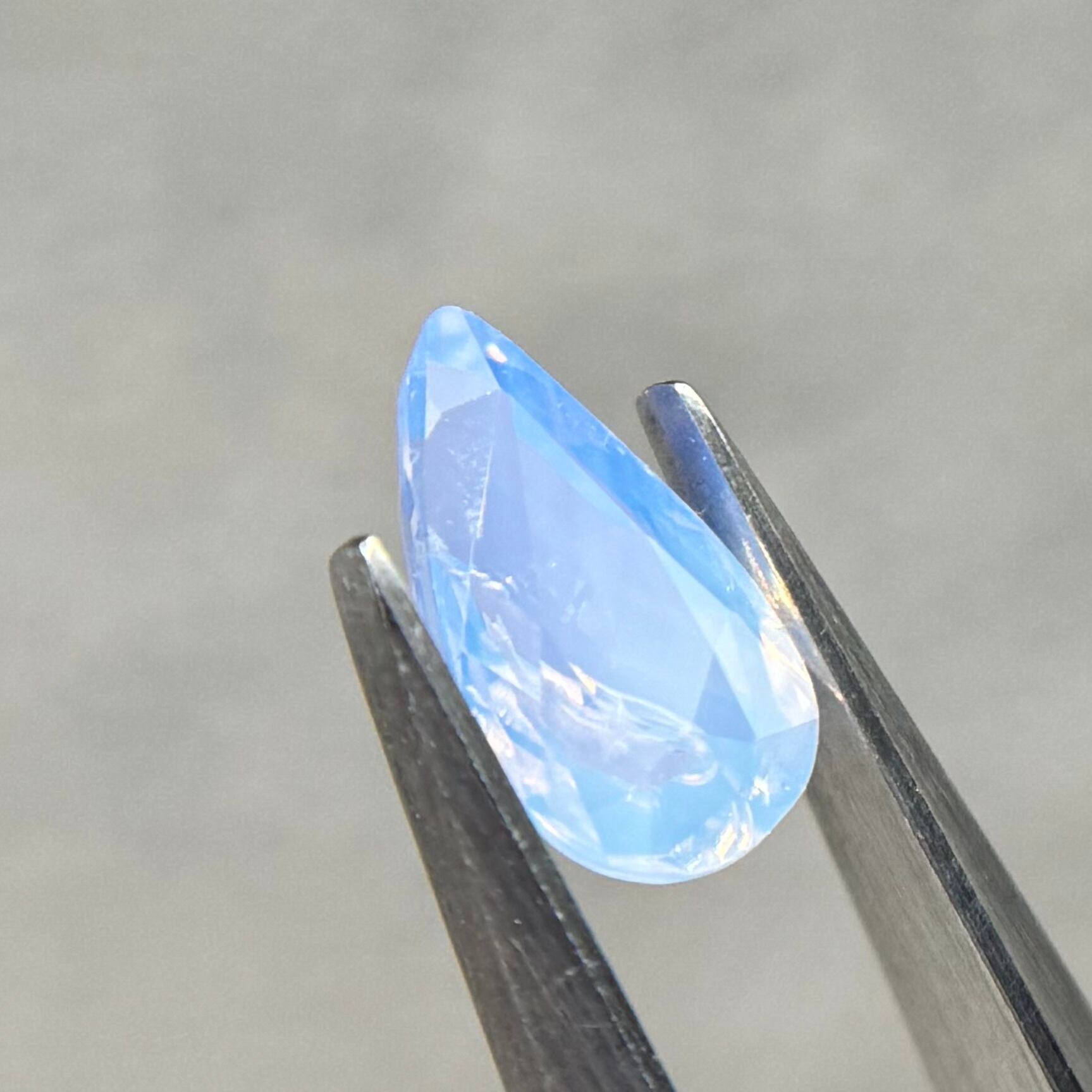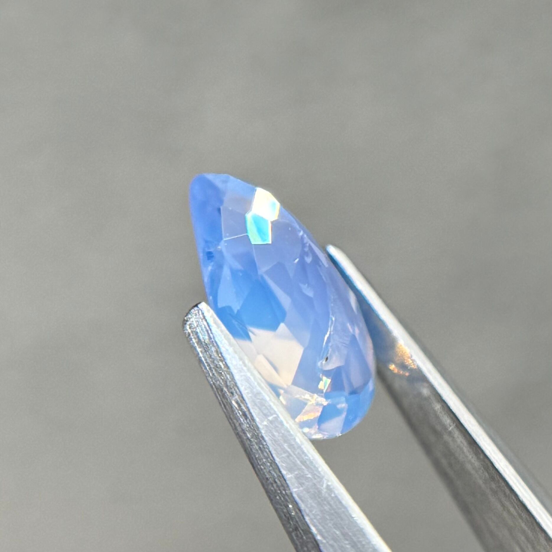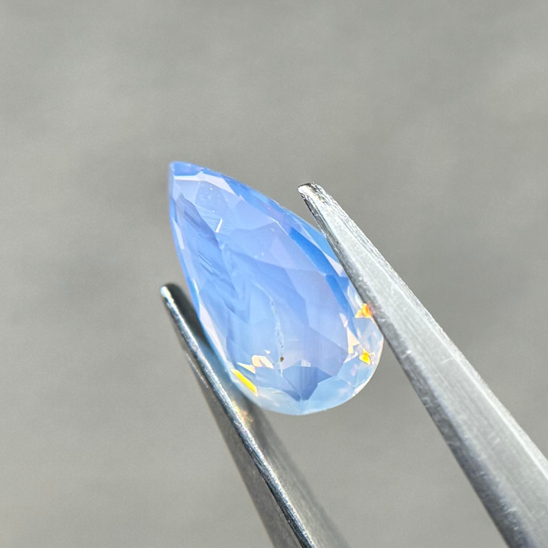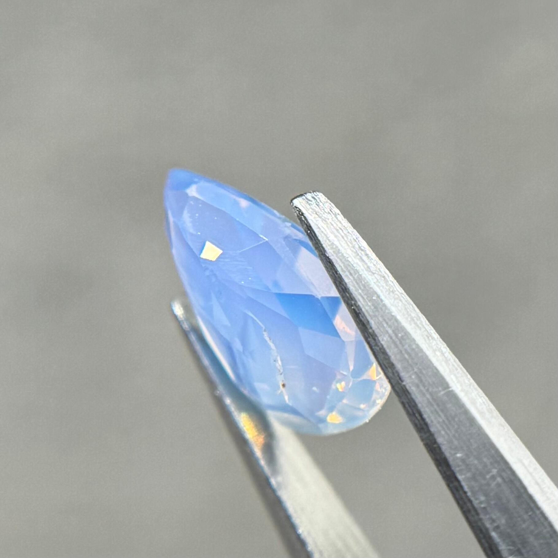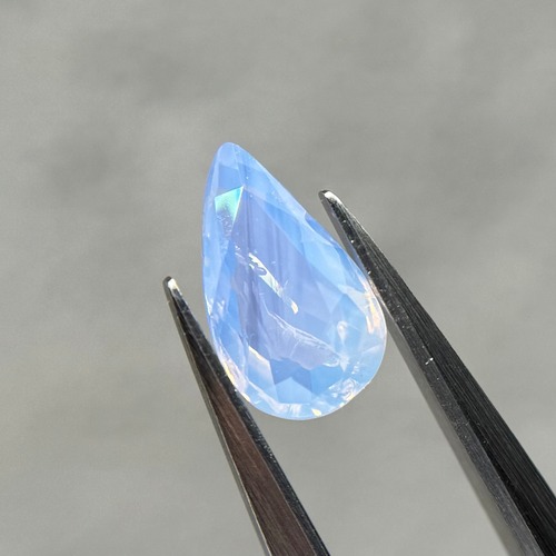 1ctUPの水色シルキーです。カットが甘く、ペアシェイプというよりはまるでハートを半分にしたような形です。ただそのカットのおかげか、テリの出方が面白く、水中で揺らめく炎のような独特なテリを楽しめます。