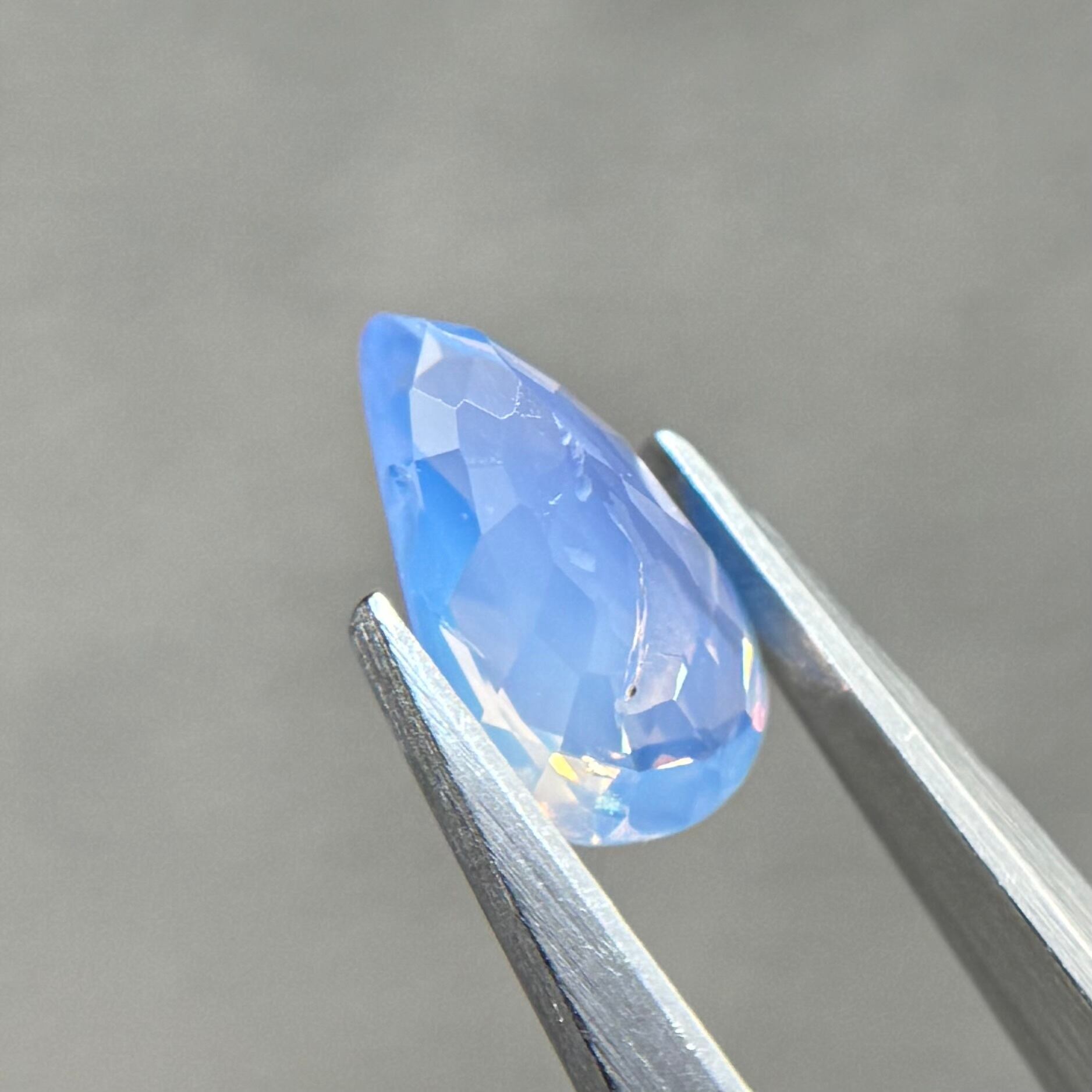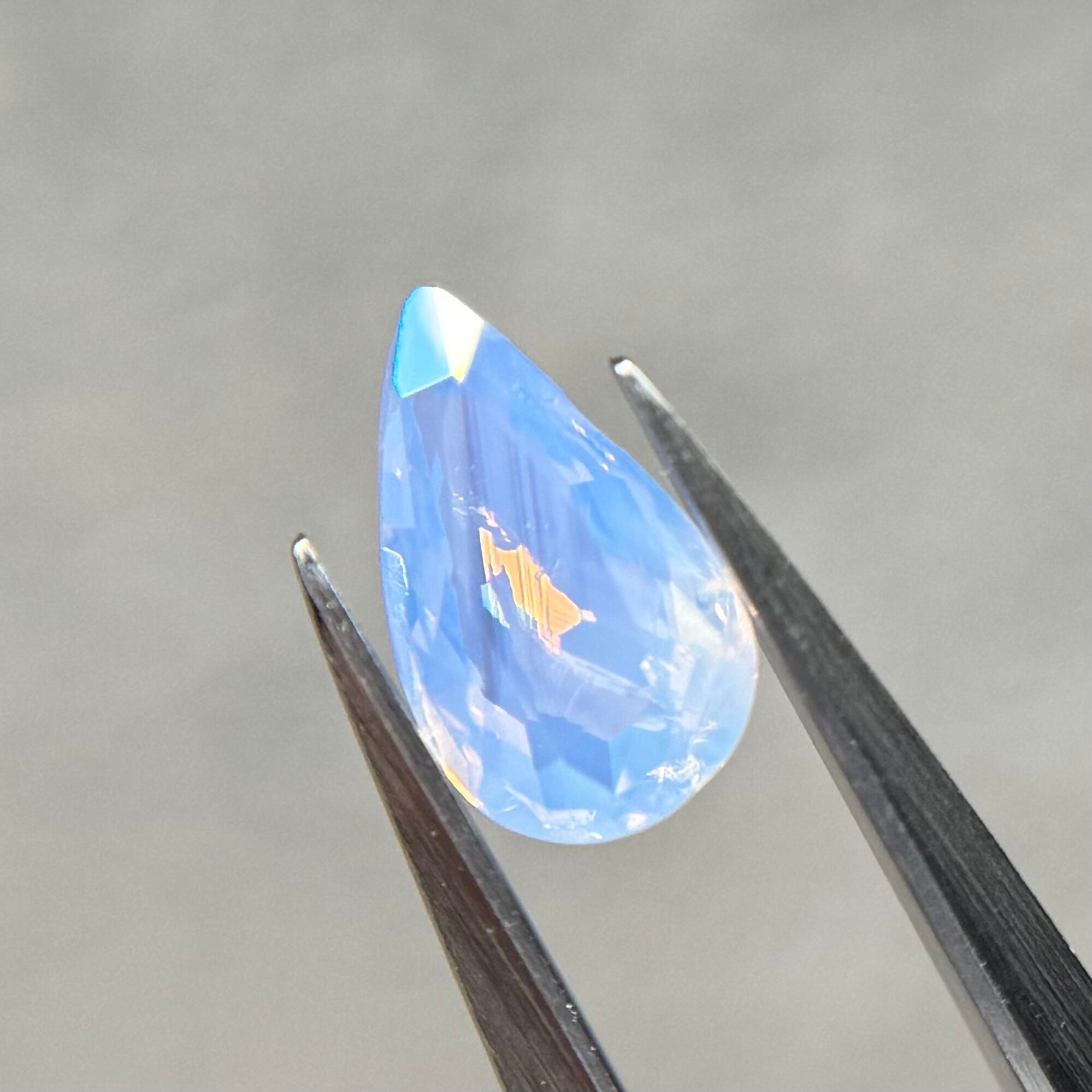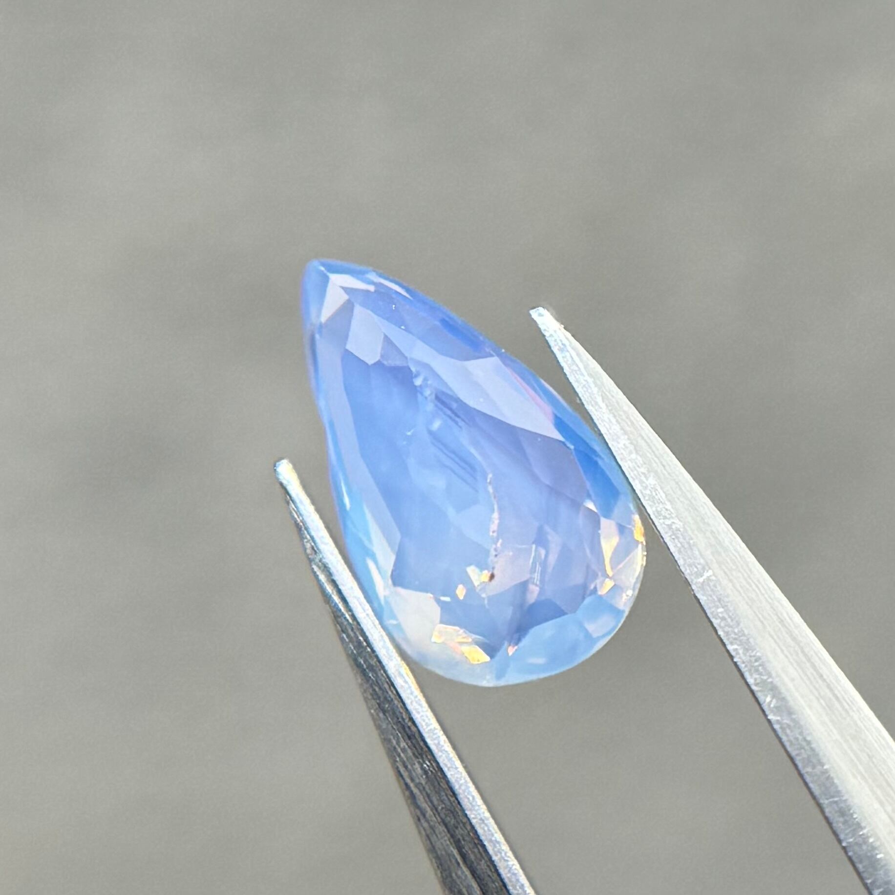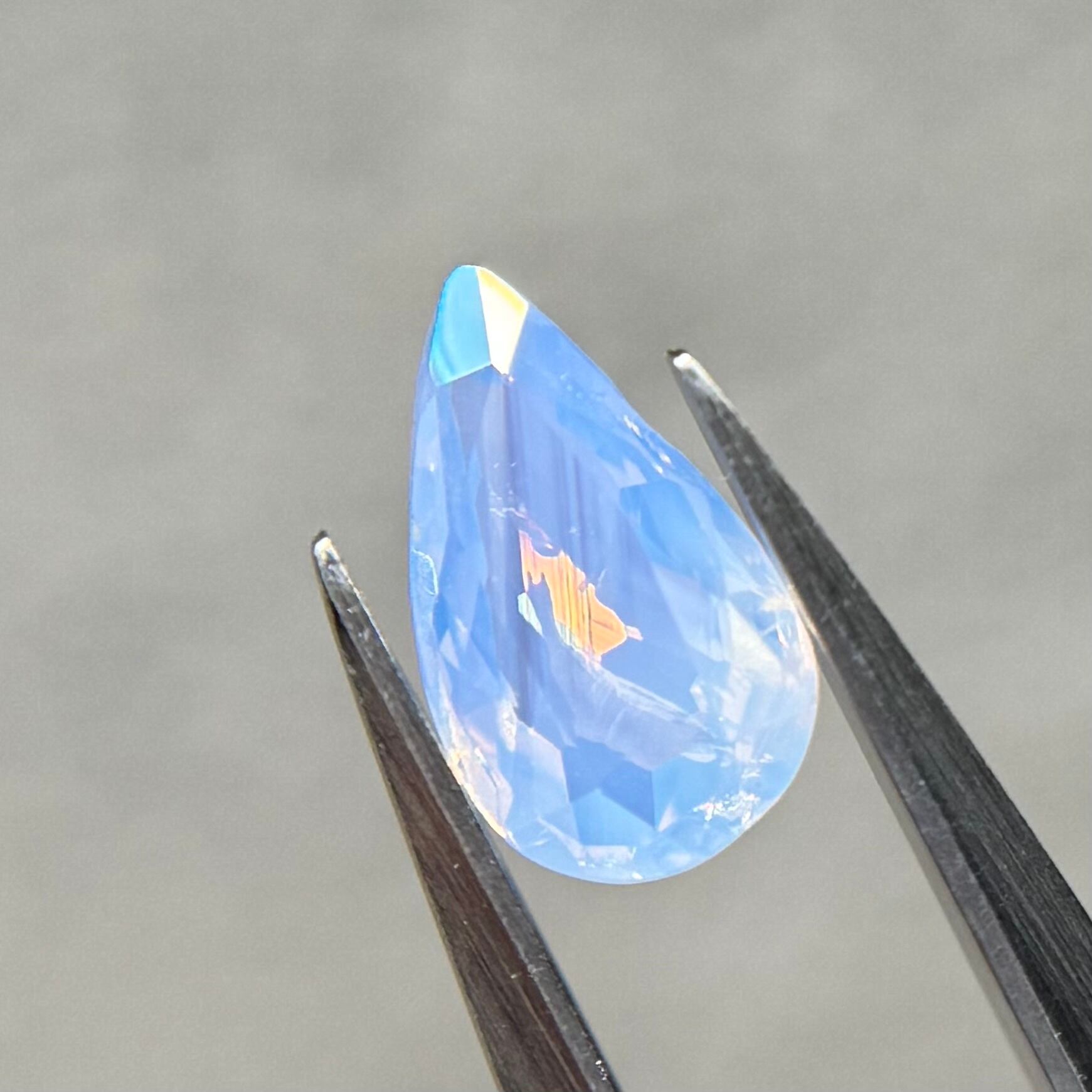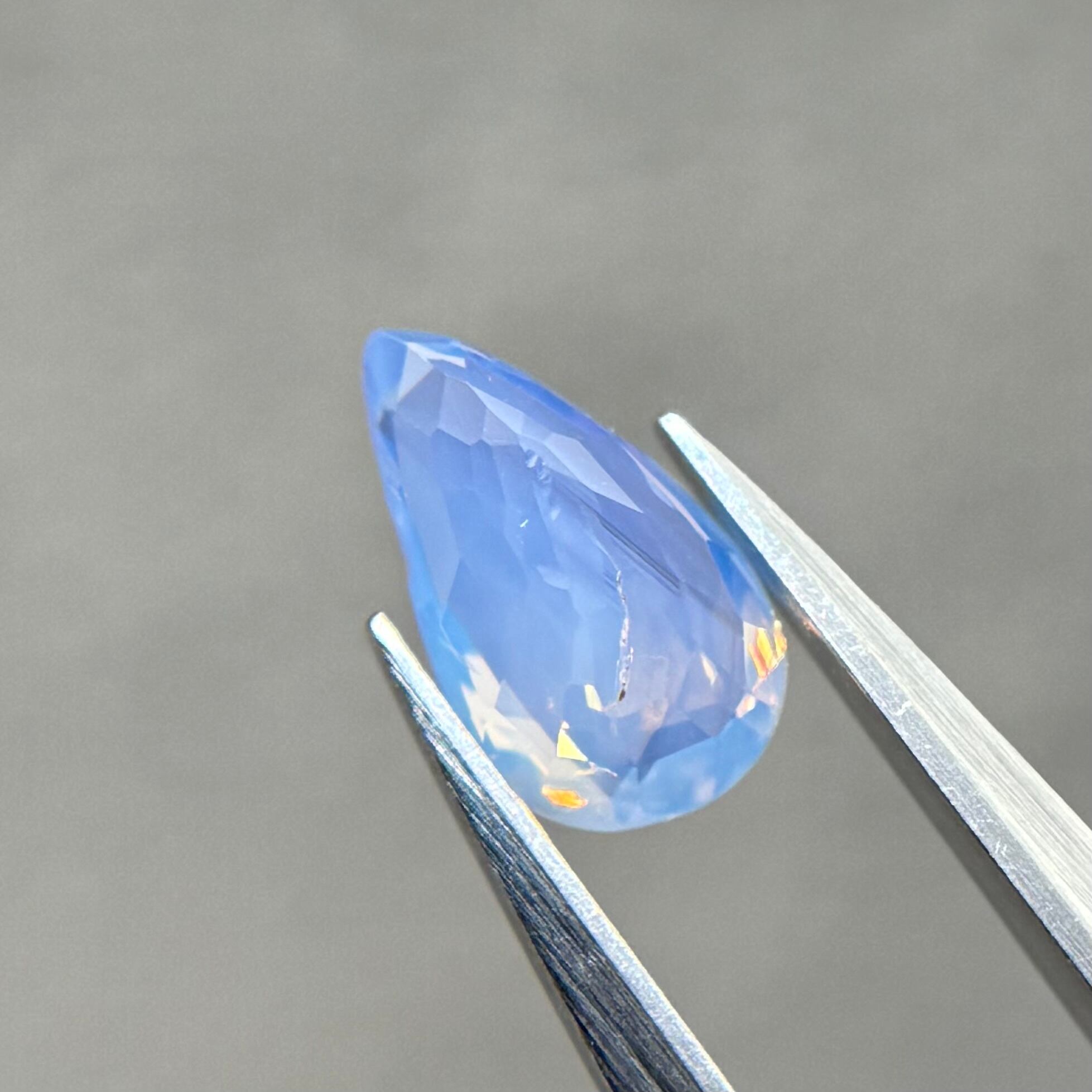 1ctUPの水色シルキーです。カットが甘く、ペアシェイプというよりはまるでハートを半分にしたような形です。ただそのカットのおかげか、テリの出方が面白く、水中で揺らめく炎のような独特なテリを楽しめます。