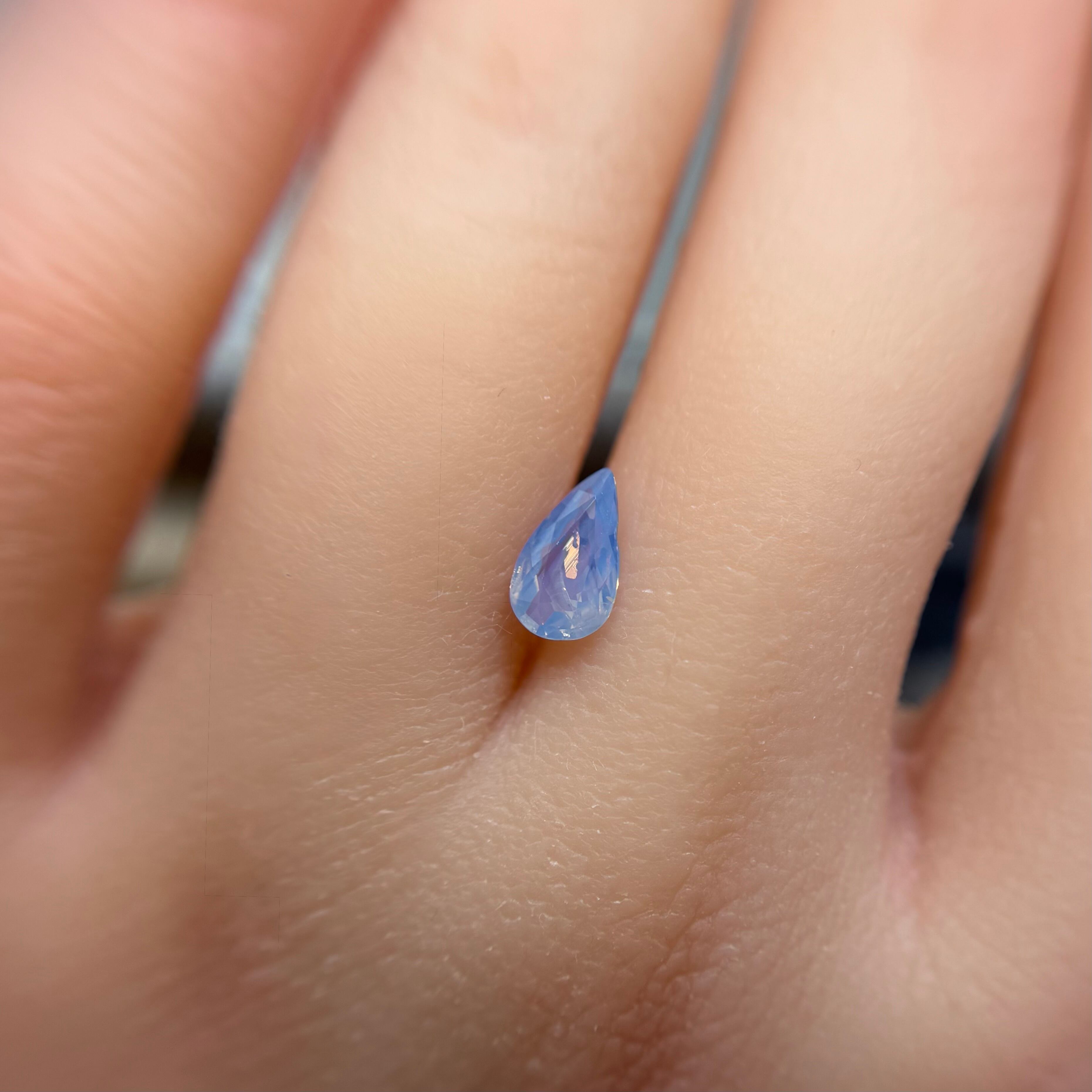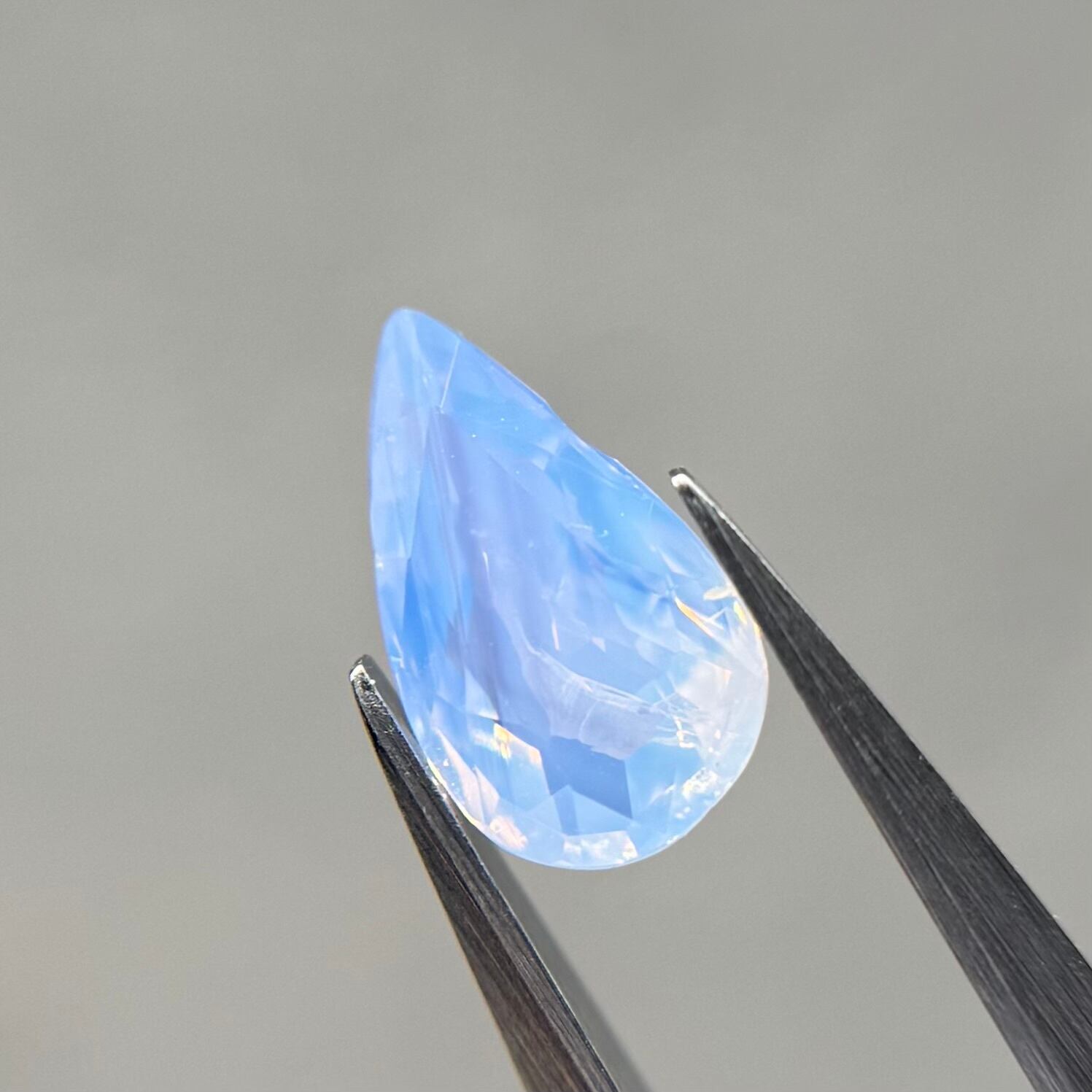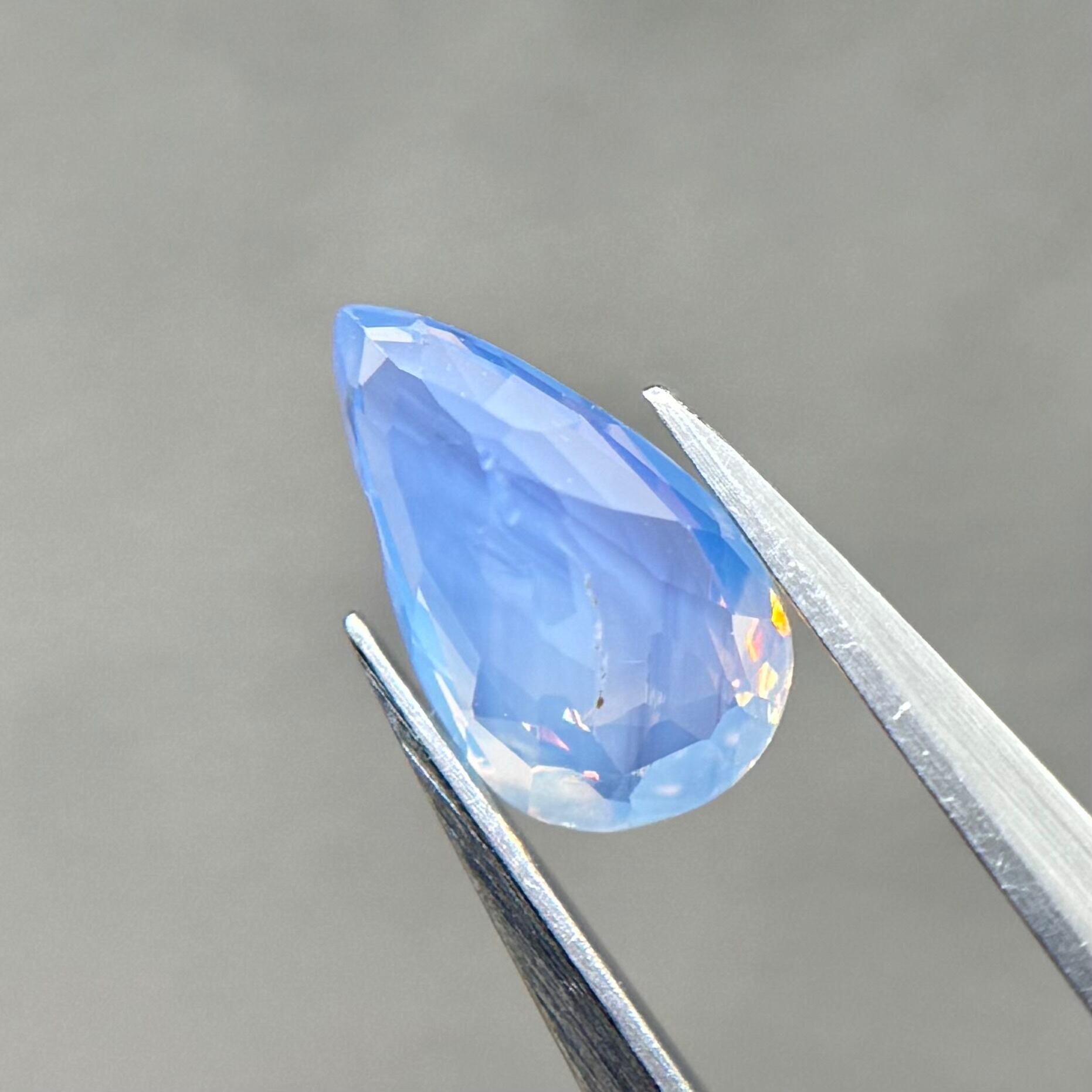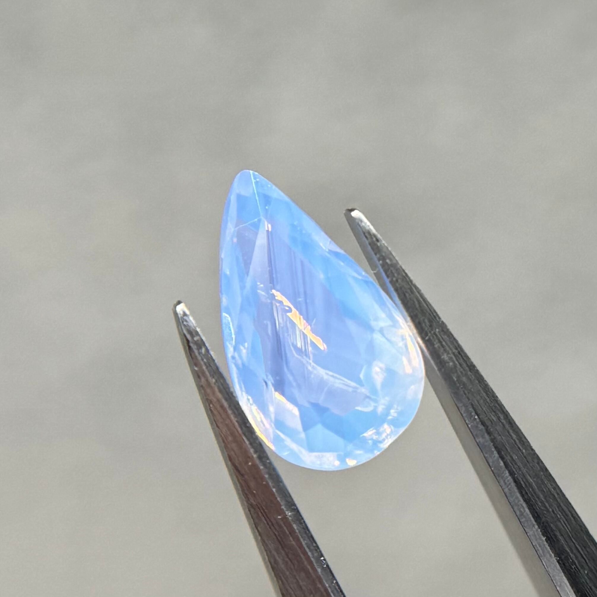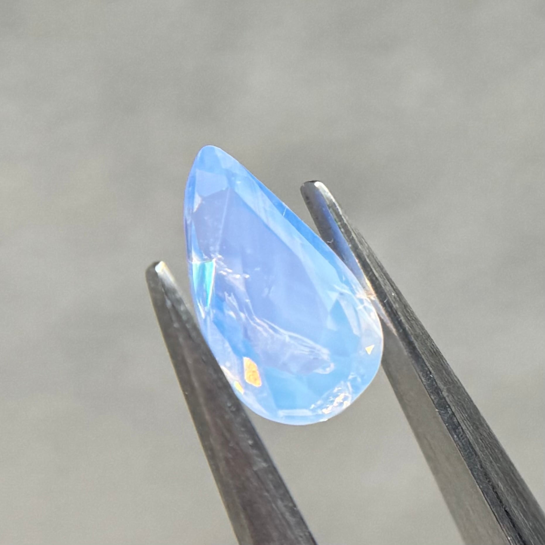 1ctUPの水色シルキーです。カットが甘く、ペアシェイプというよりはまるでハートを半分にしたような形です。ただそのカットのおかげか、テリの出方が面白く、水中で揺らめく炎のような独特なテリを楽しめます。