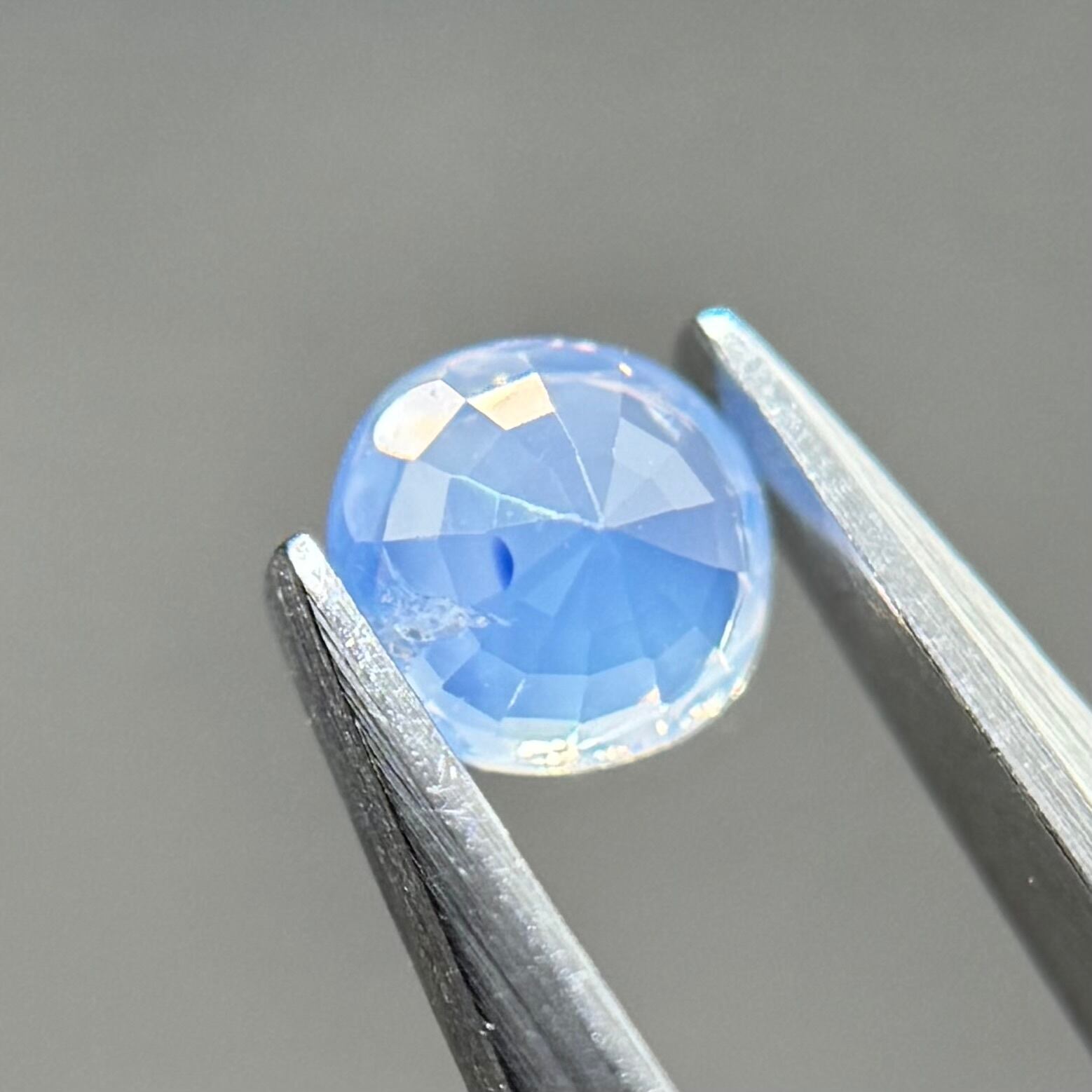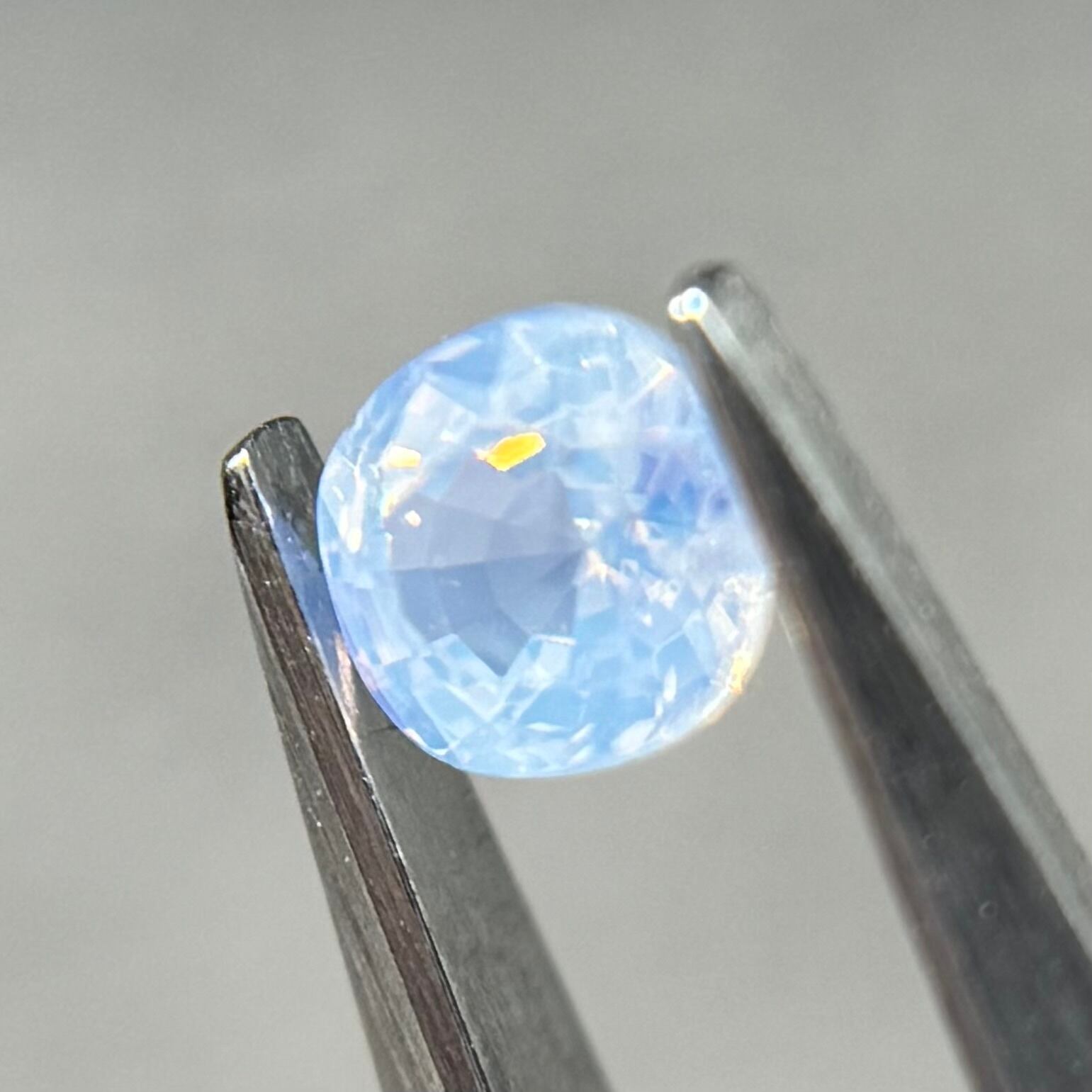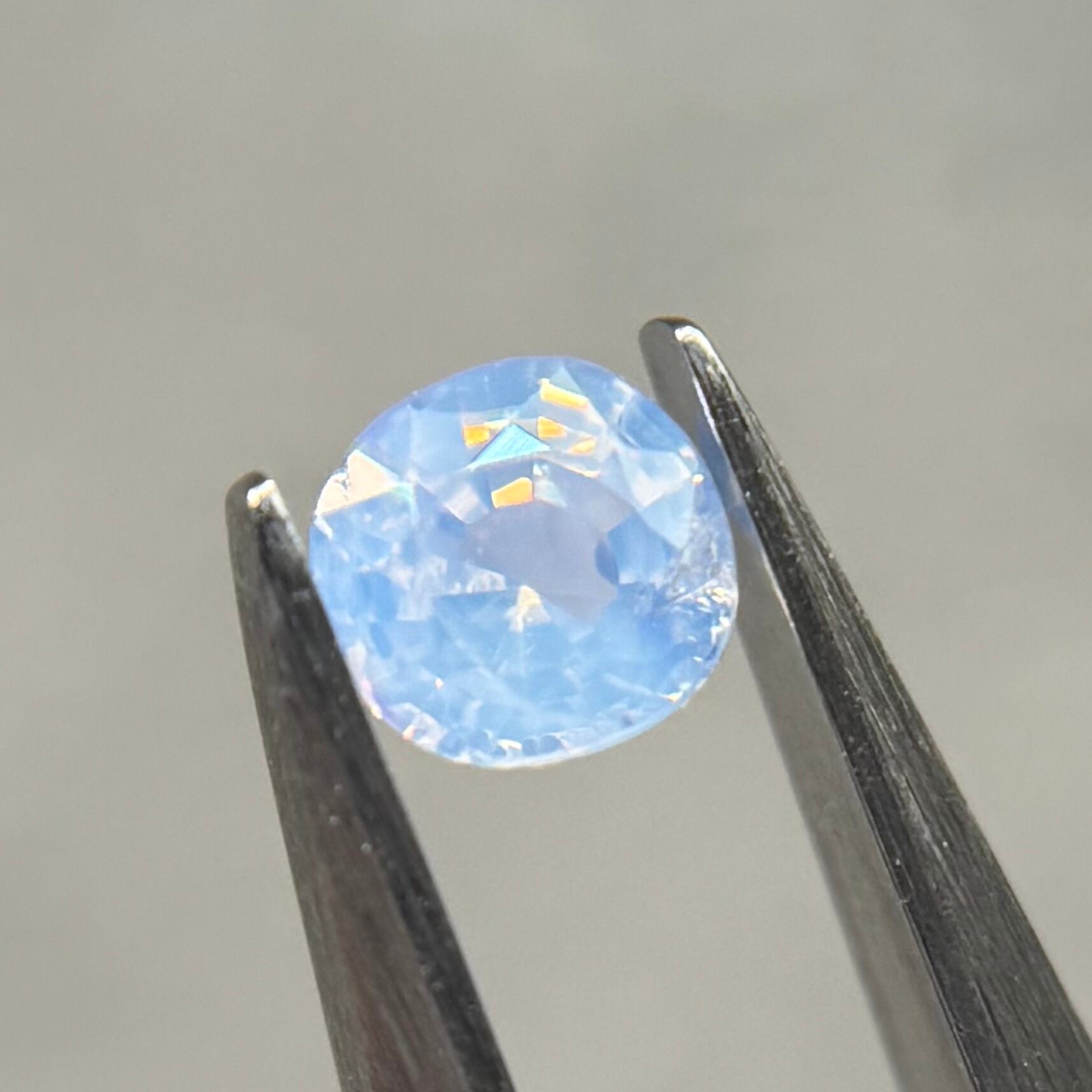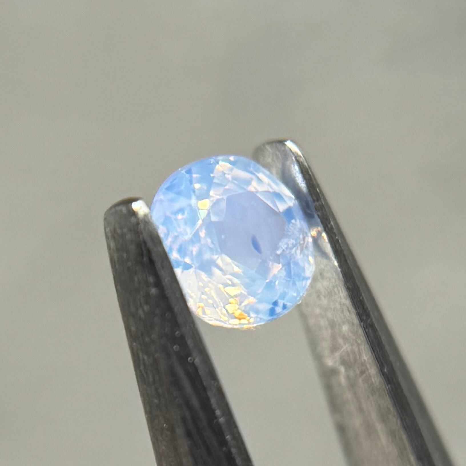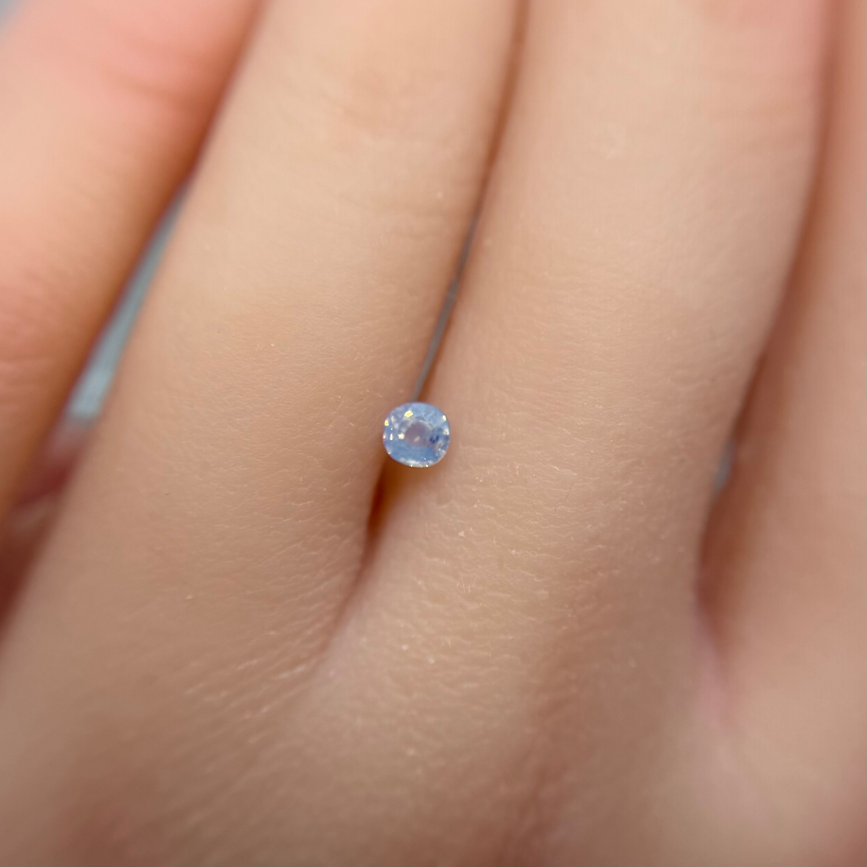 淡い水色がとても美しいシルキーサファイアです。青い3つの色だまりがほっぺのようで可愛いです。インクルージョンが反射してまるで水面のようなゆらゆらキラキラが楽しめます