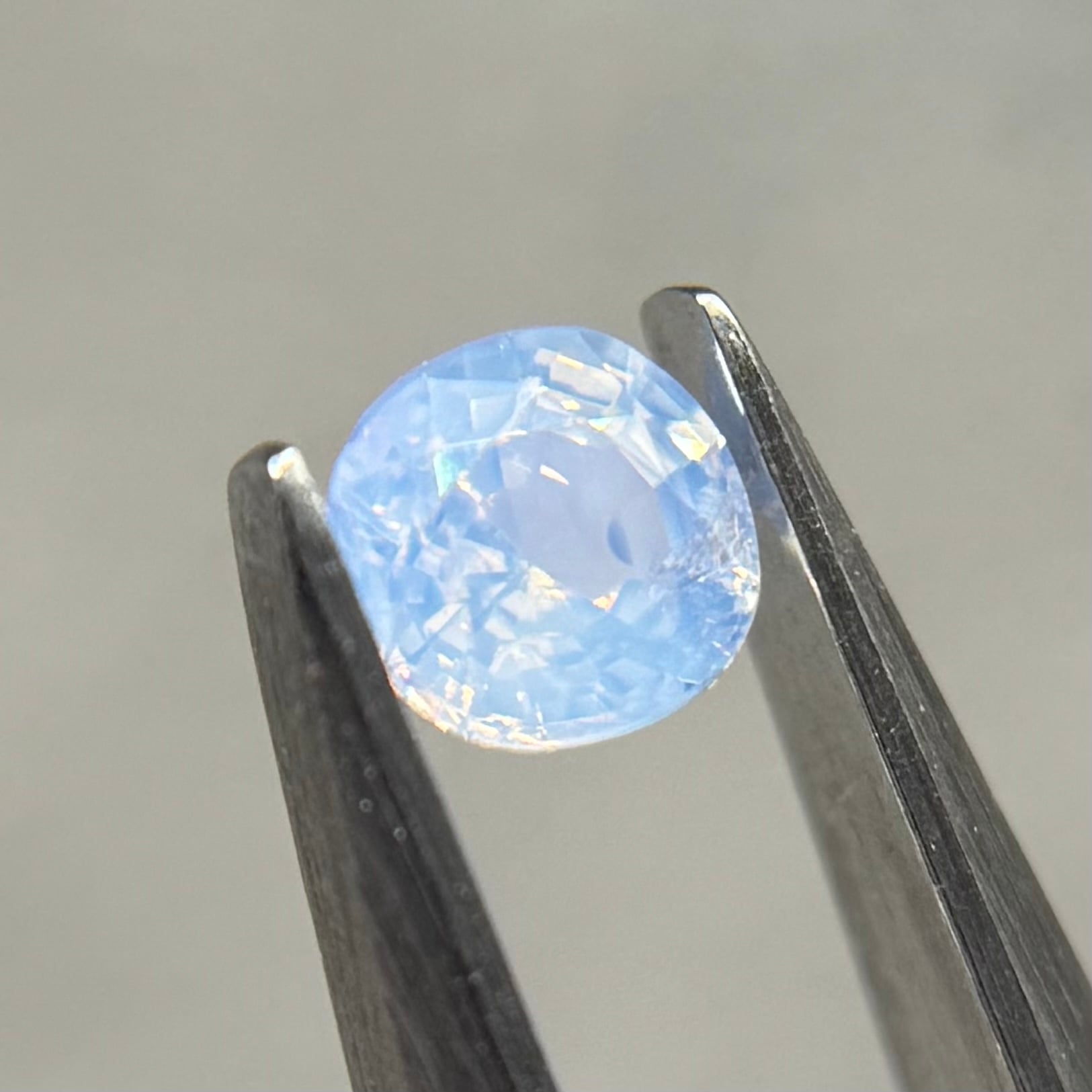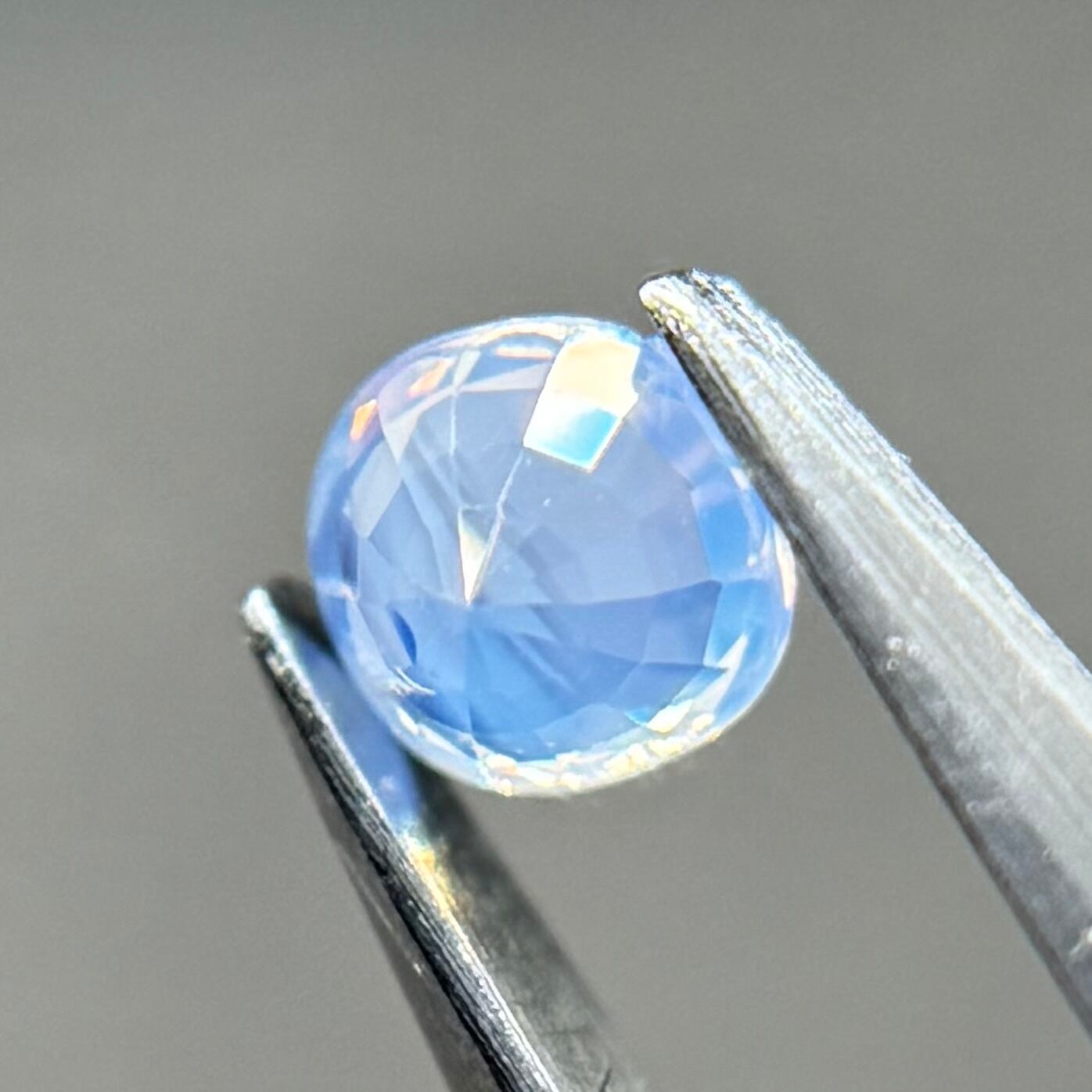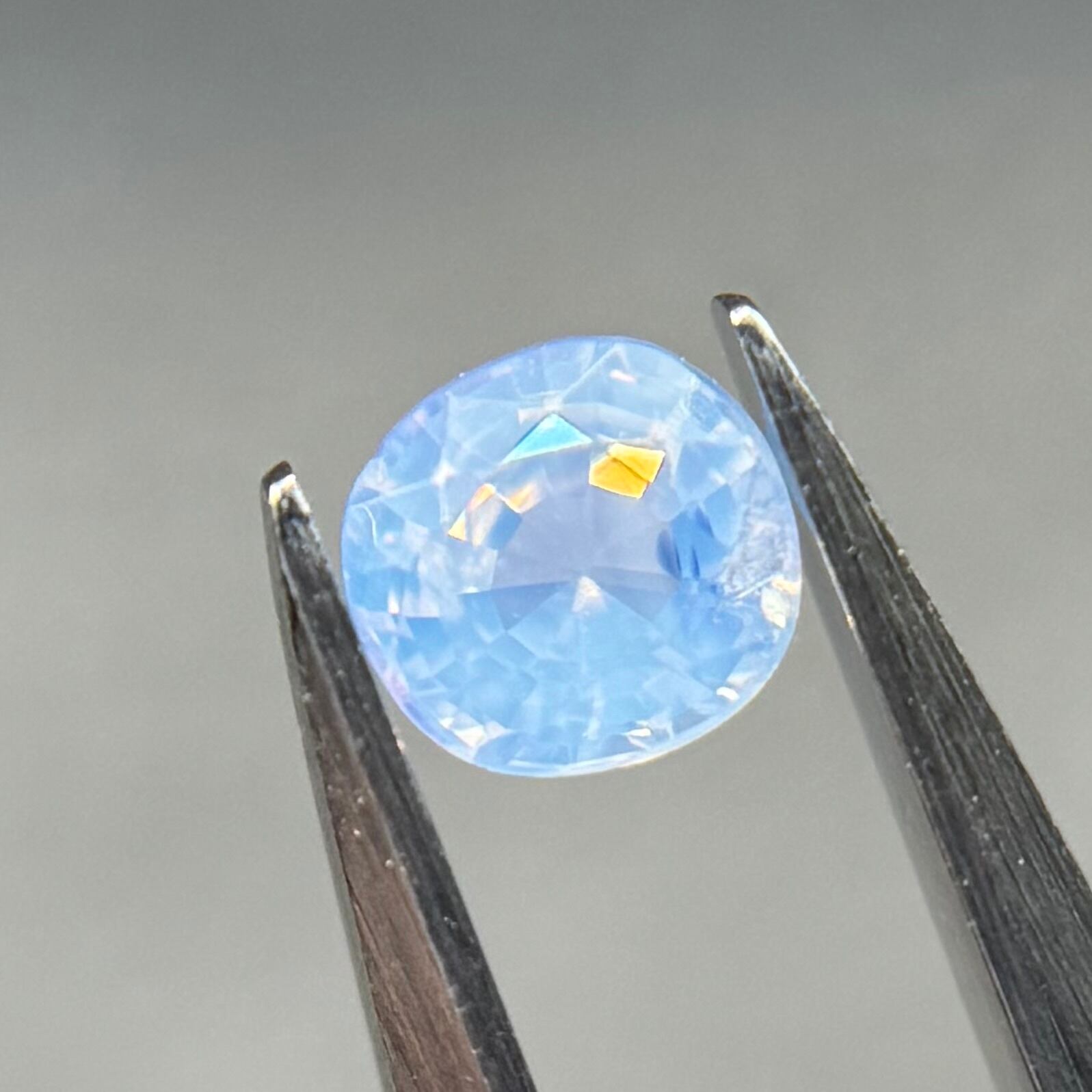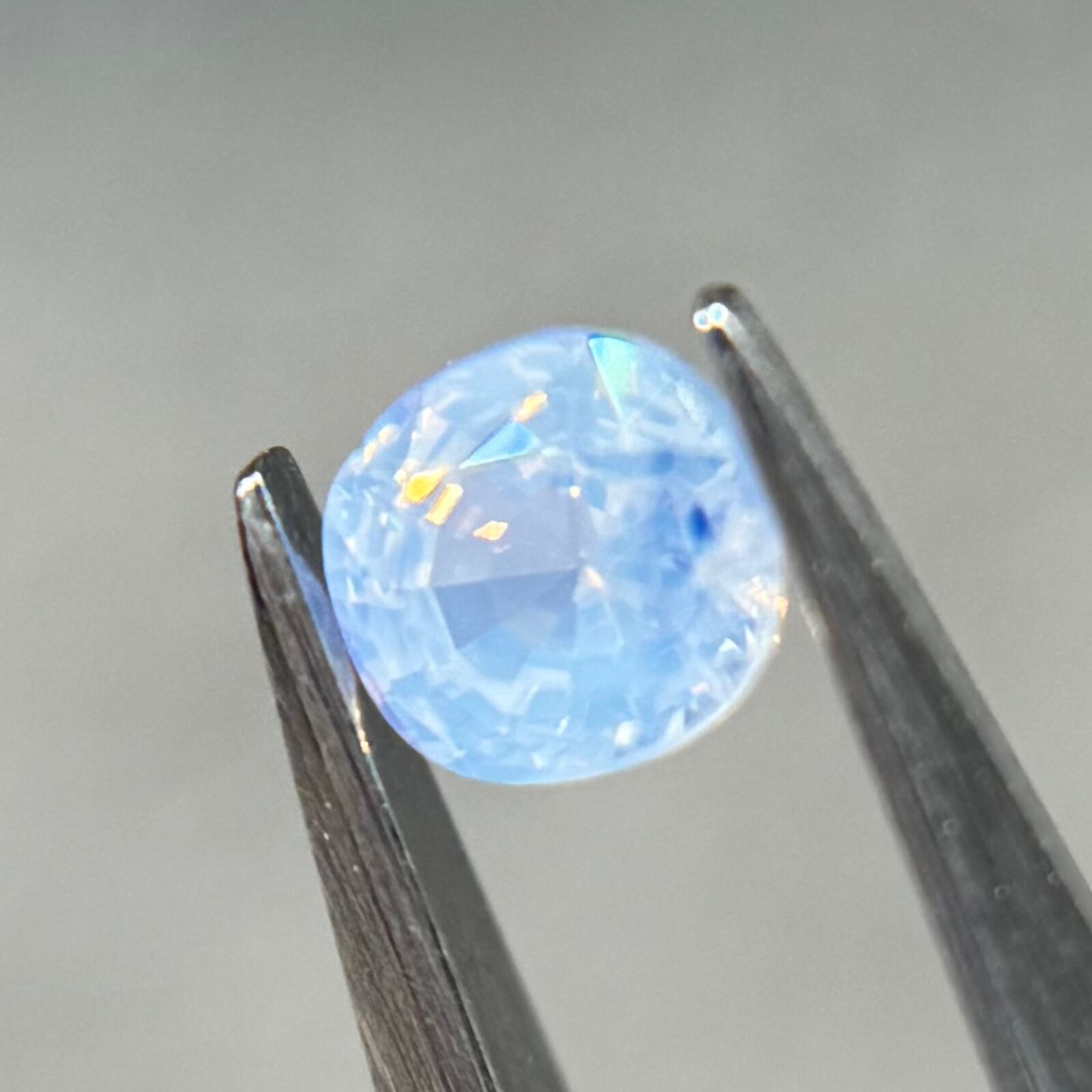 淡い水色がとても美しいシルキーサファイアです。青い3つの色だまりがほっぺのようで可愛いです。インクルージョンが反射してまるで水面のようなゆらゆらキラキラが楽しめます