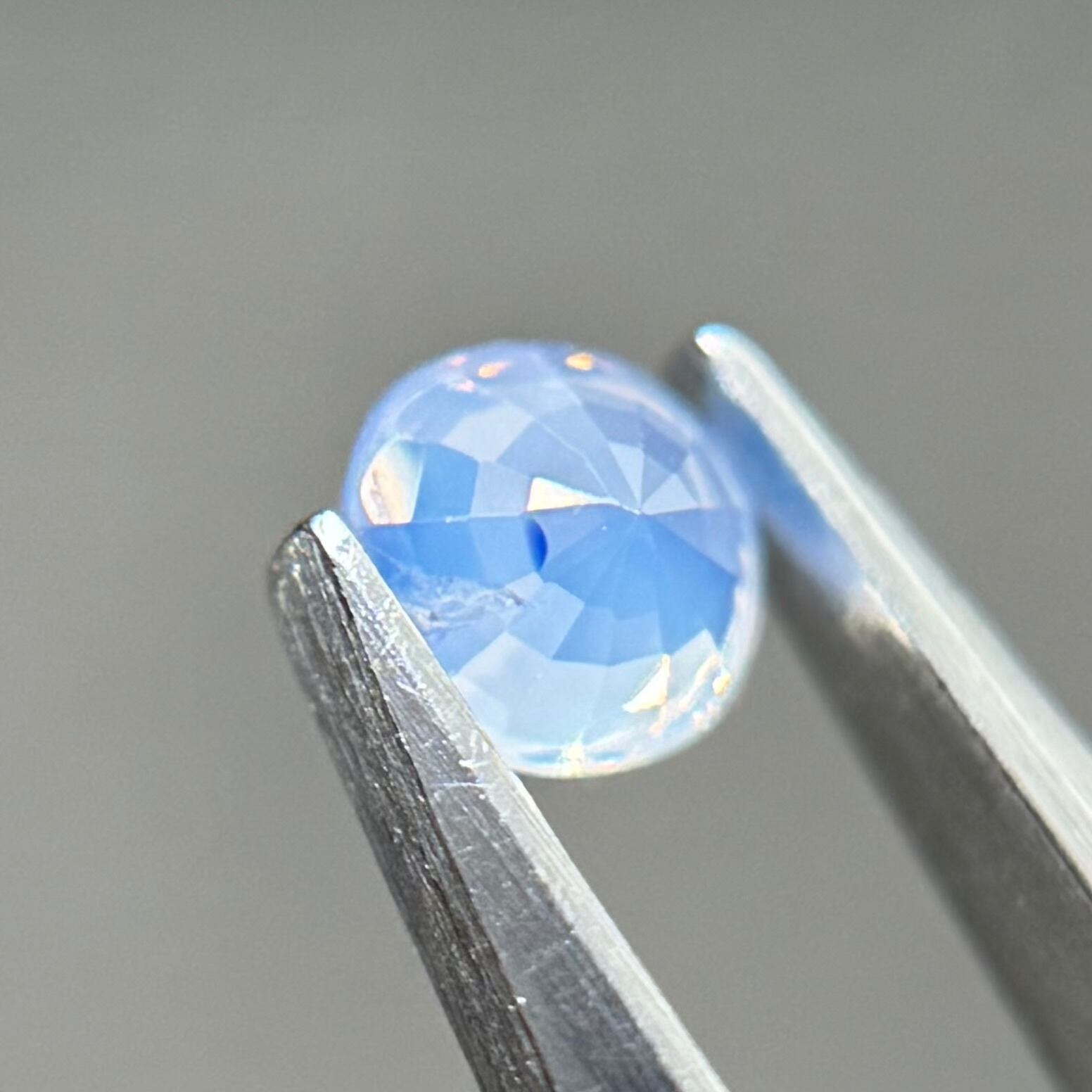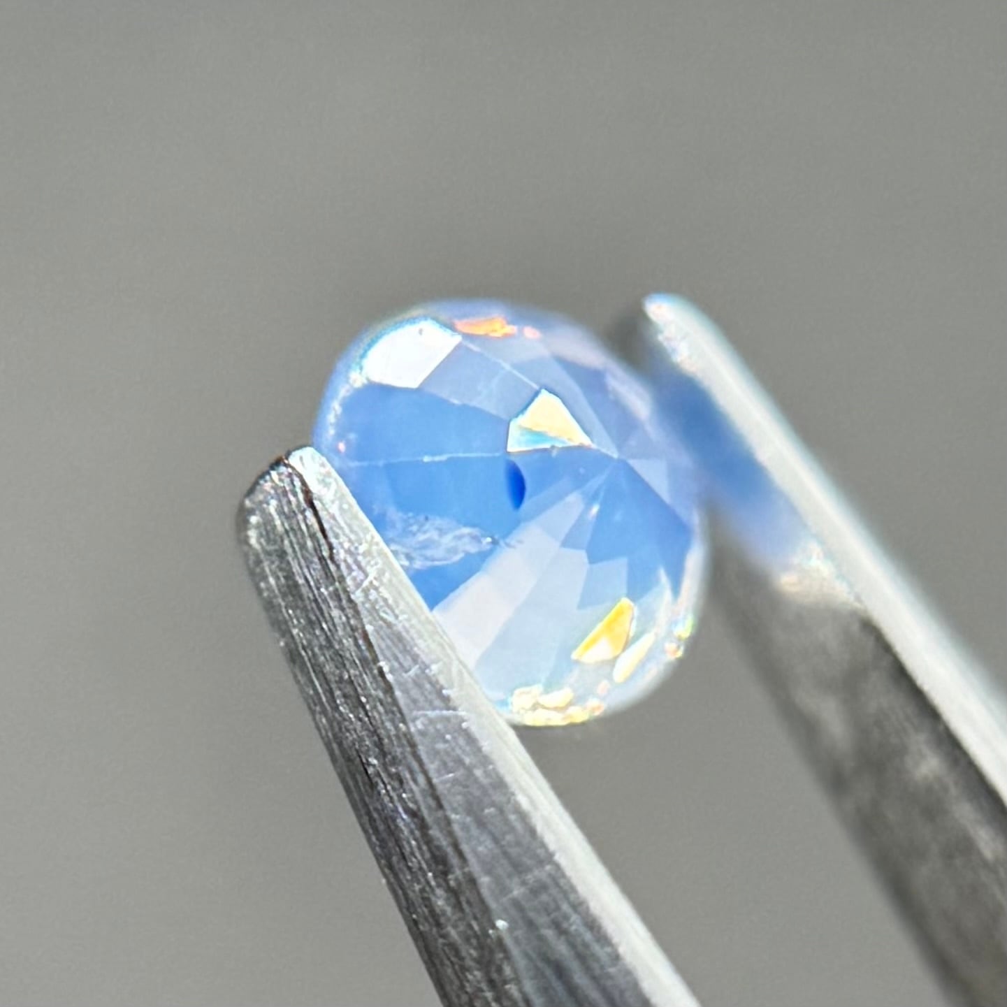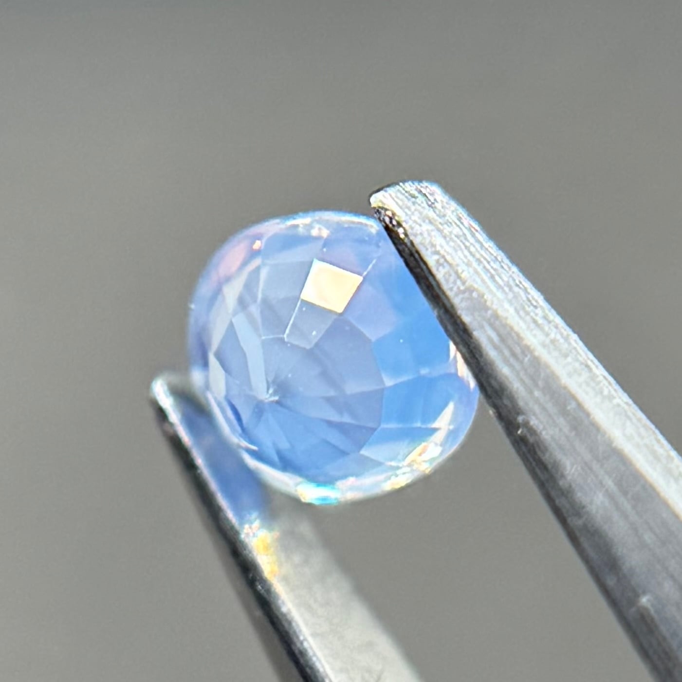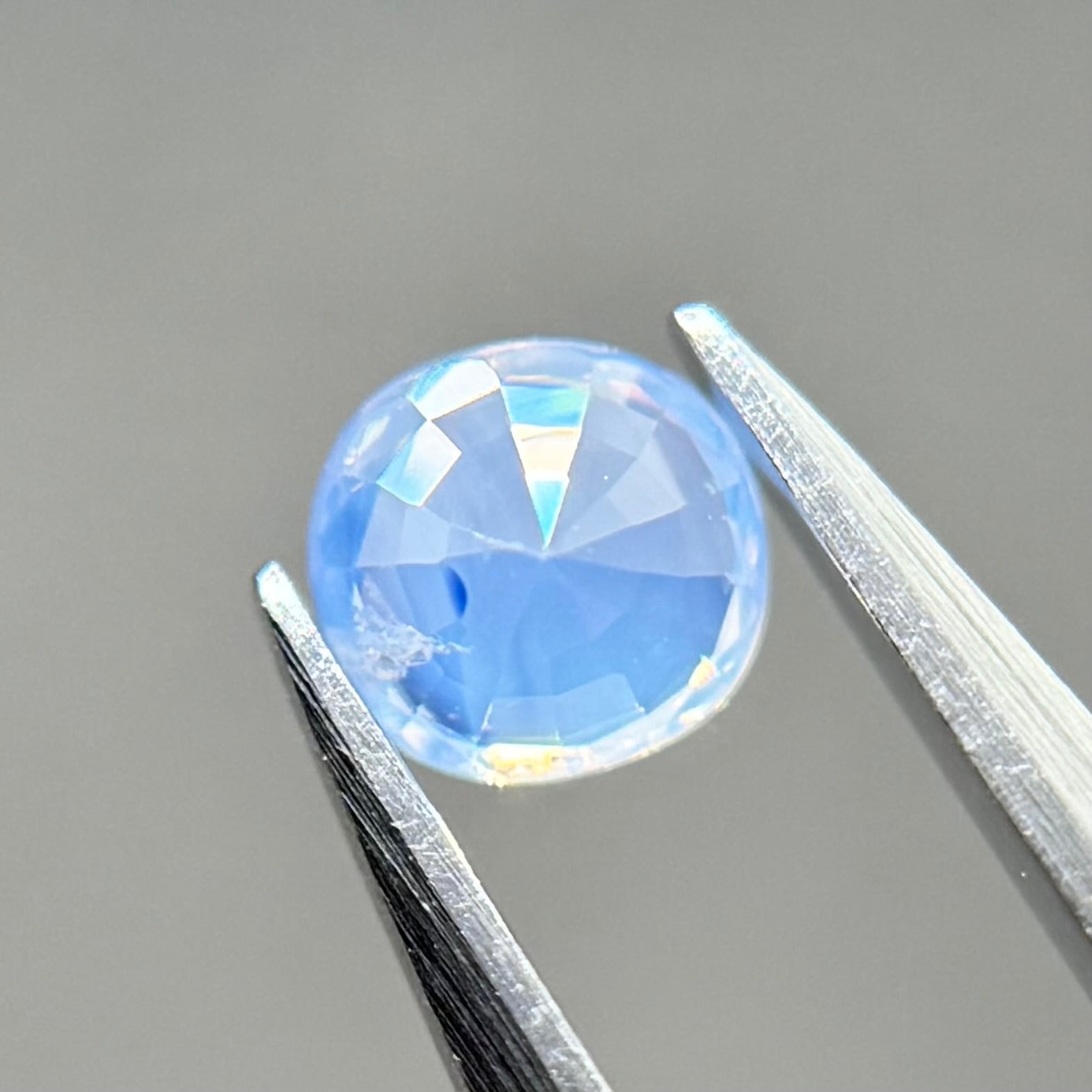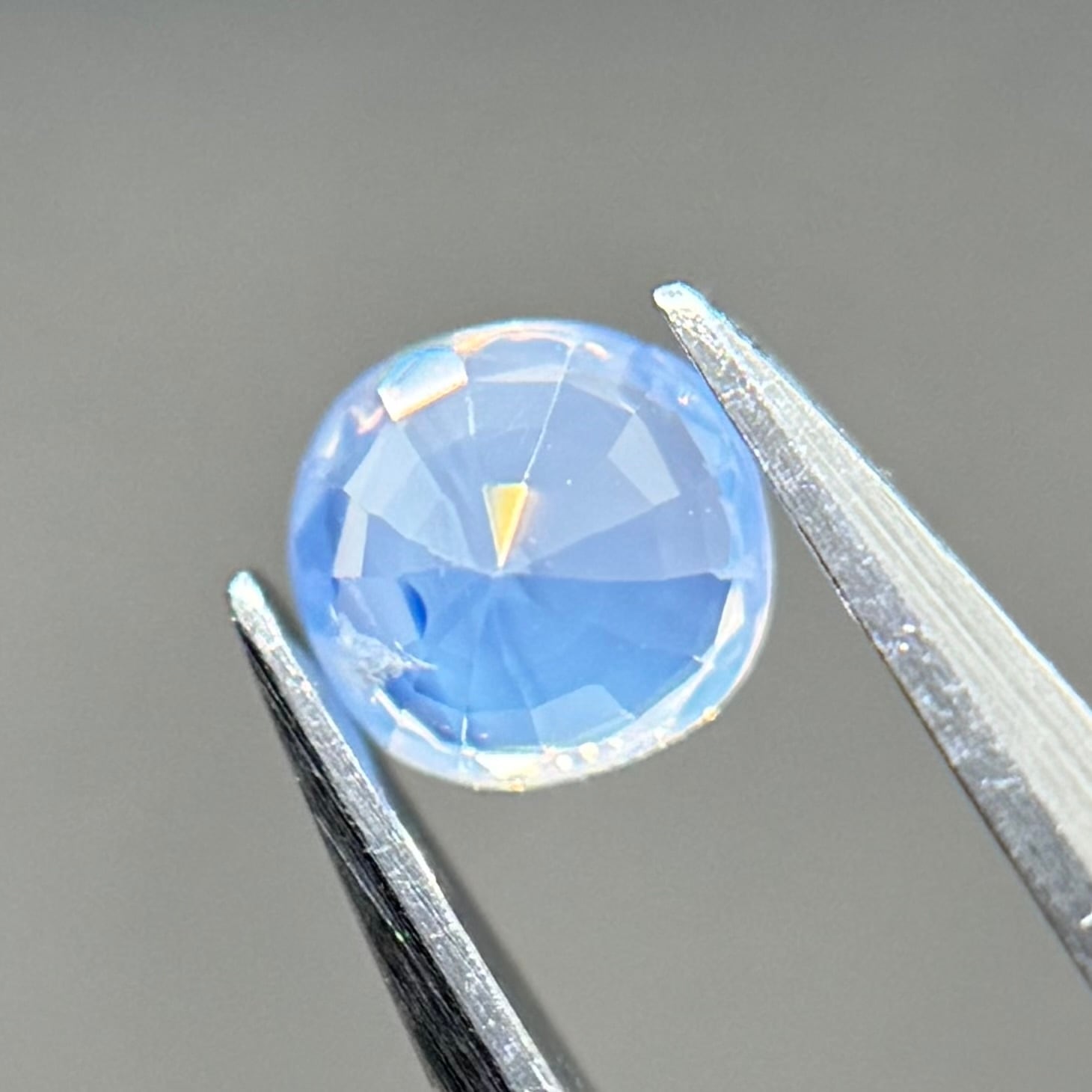 淡い水色がとても美しいシルキーサファイアです。青い3つの色だまりがほっぺのようで可愛いです。インクルージョンが反射してまるで水面のようなゆらゆらキラキラが楽しめます