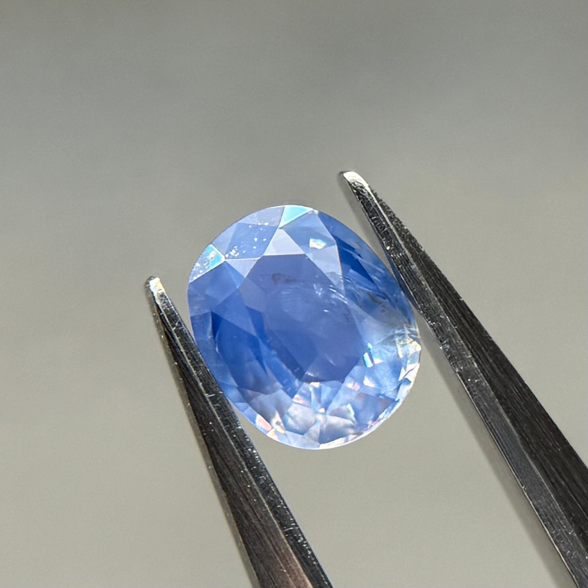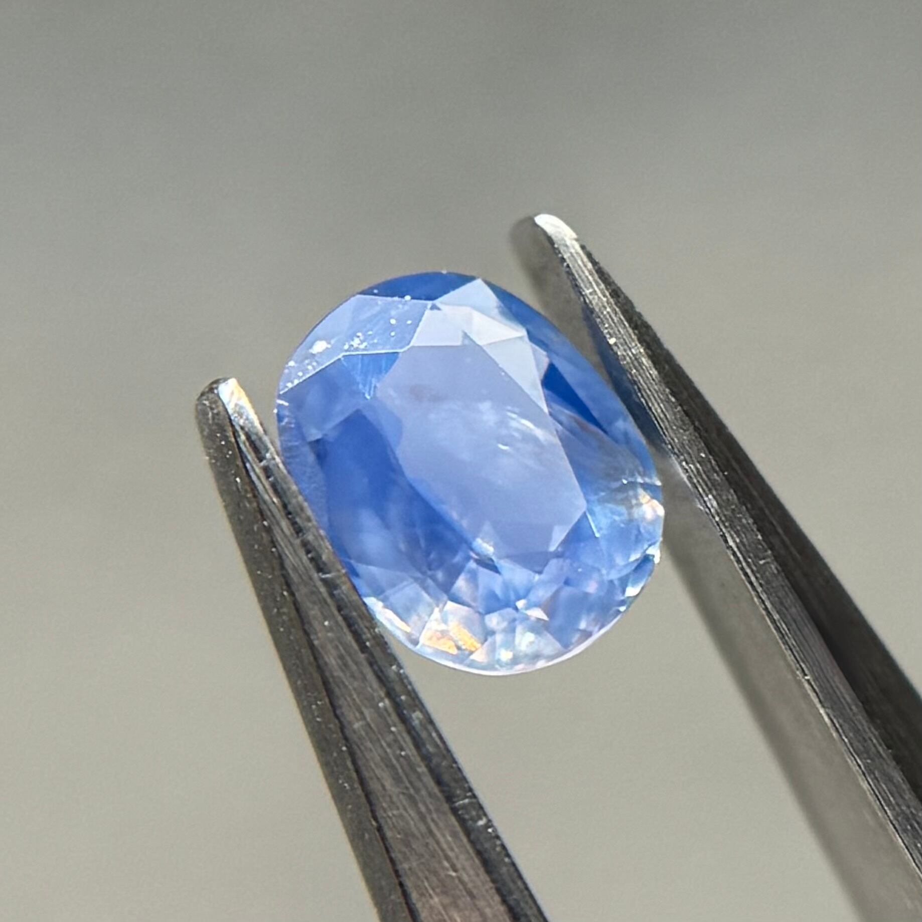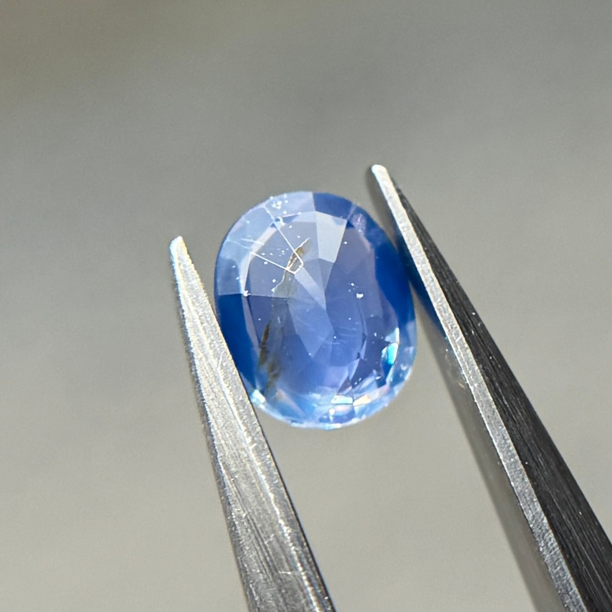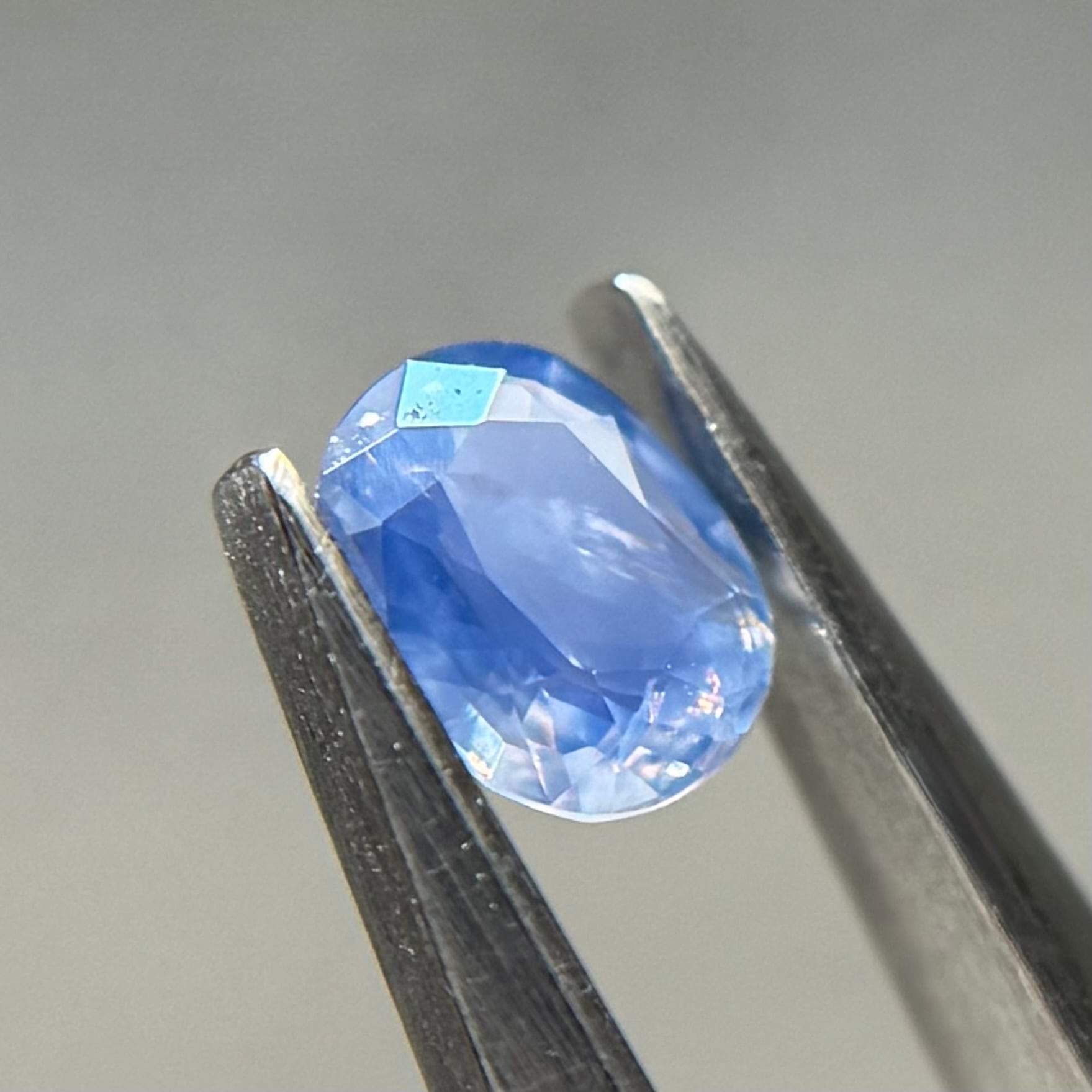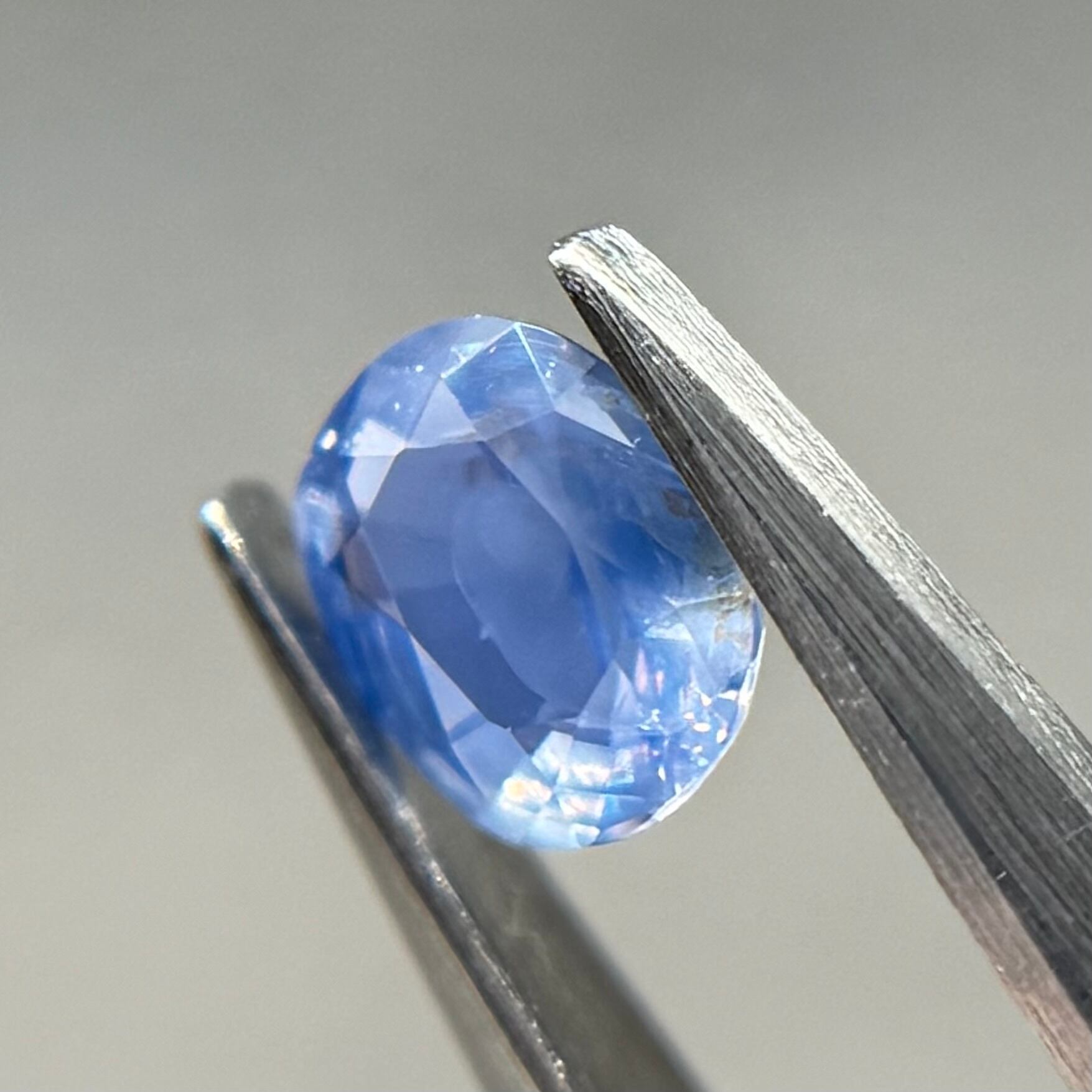 やや灰色がかったネモフィラのようなブルーが美しいシルキーサファイアです。茶色インクルージョンはベースの色に隠れて気にならないです。柔らかなてりがまるで花びらの上の朝露のようです