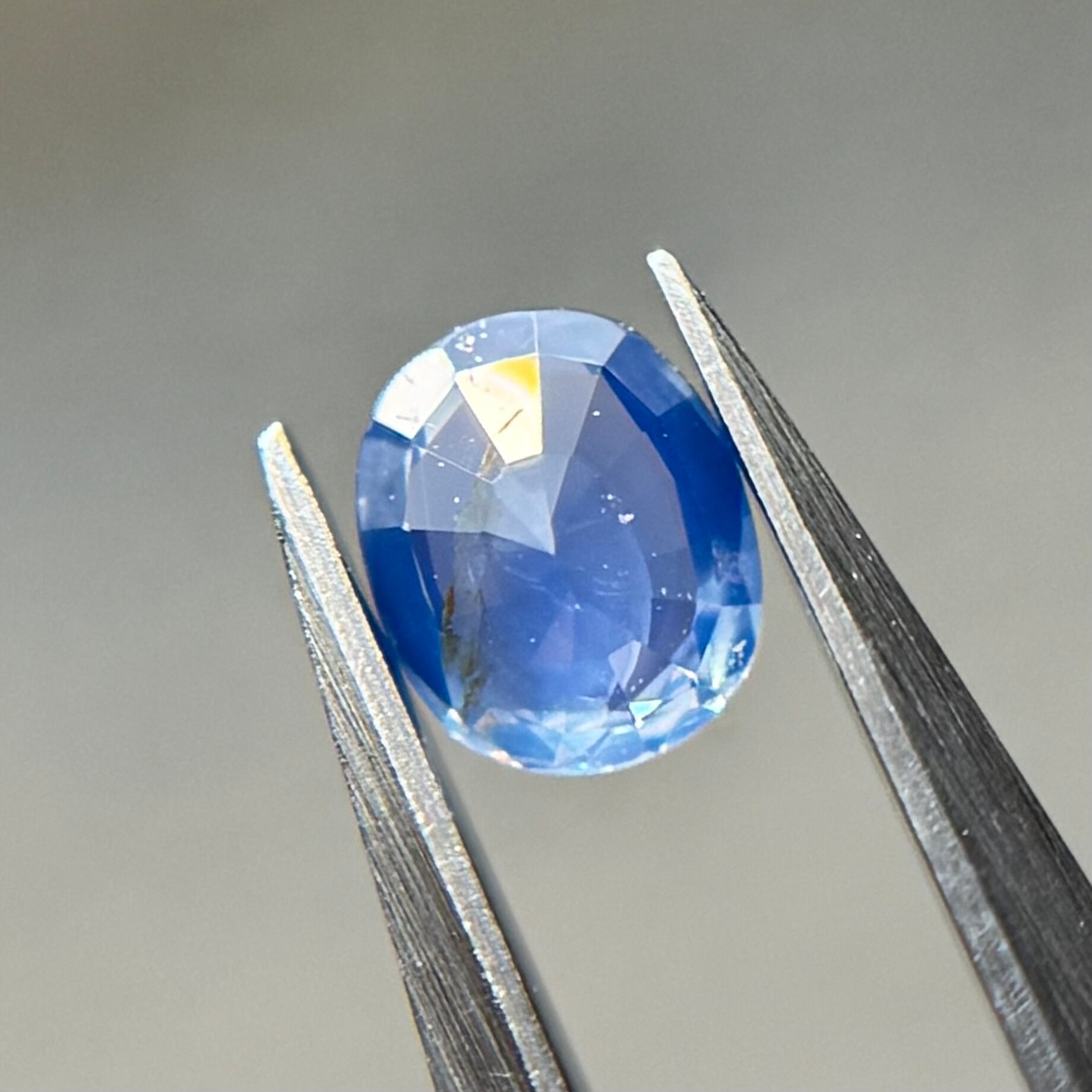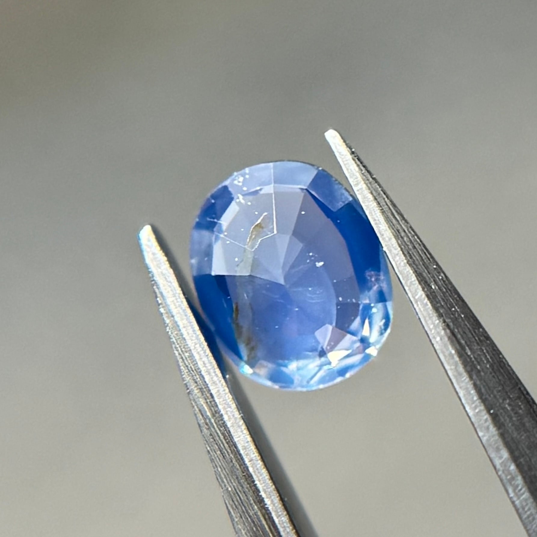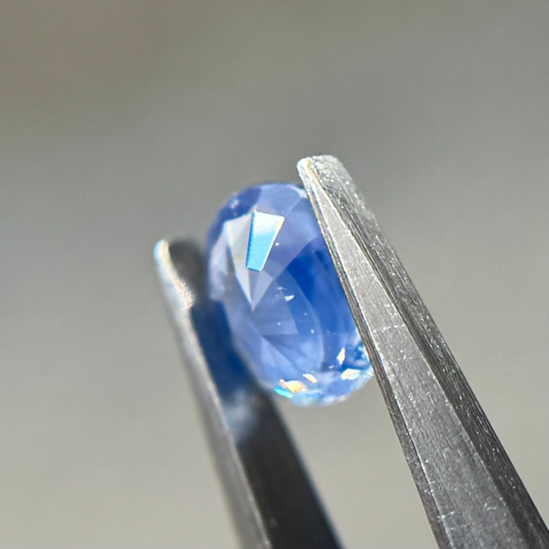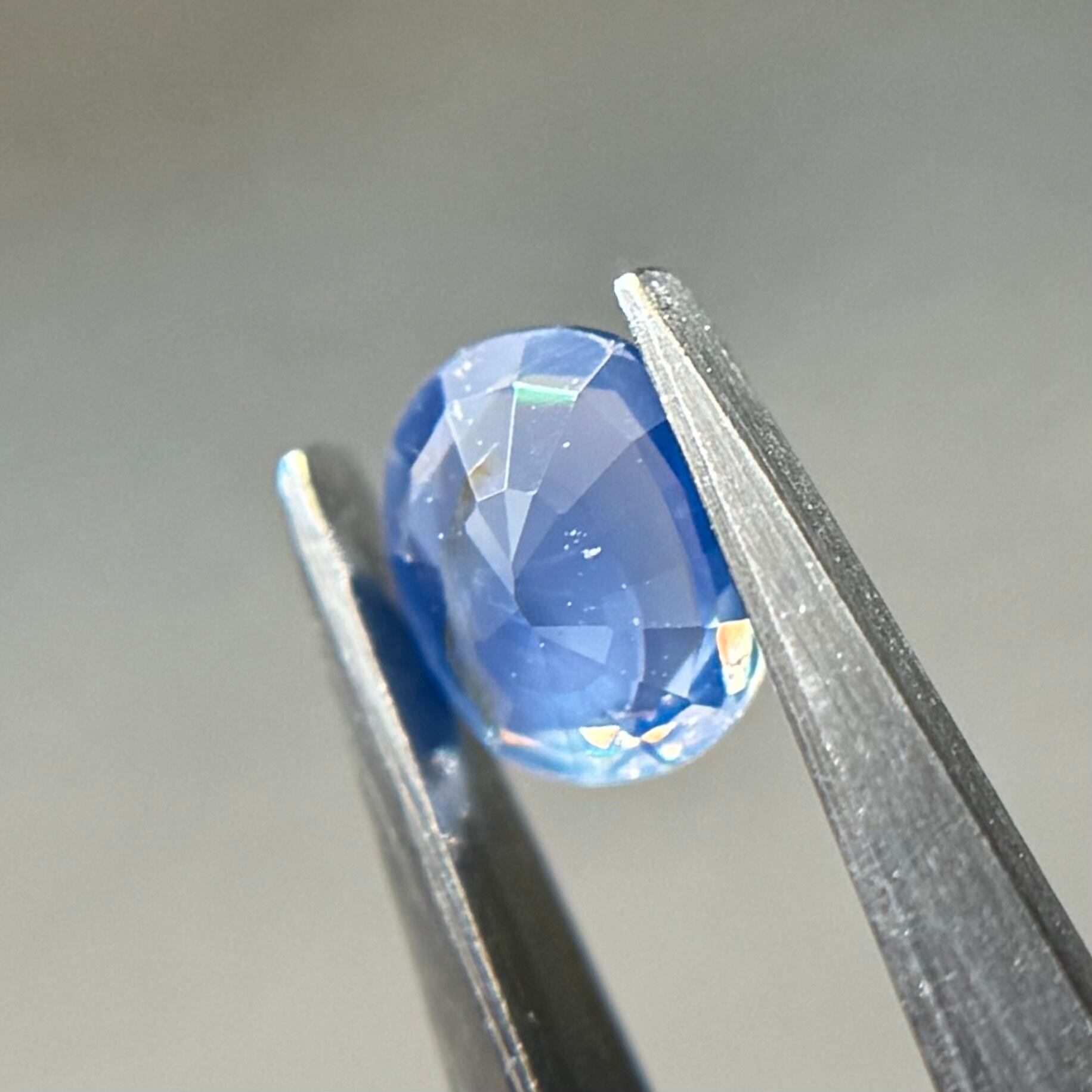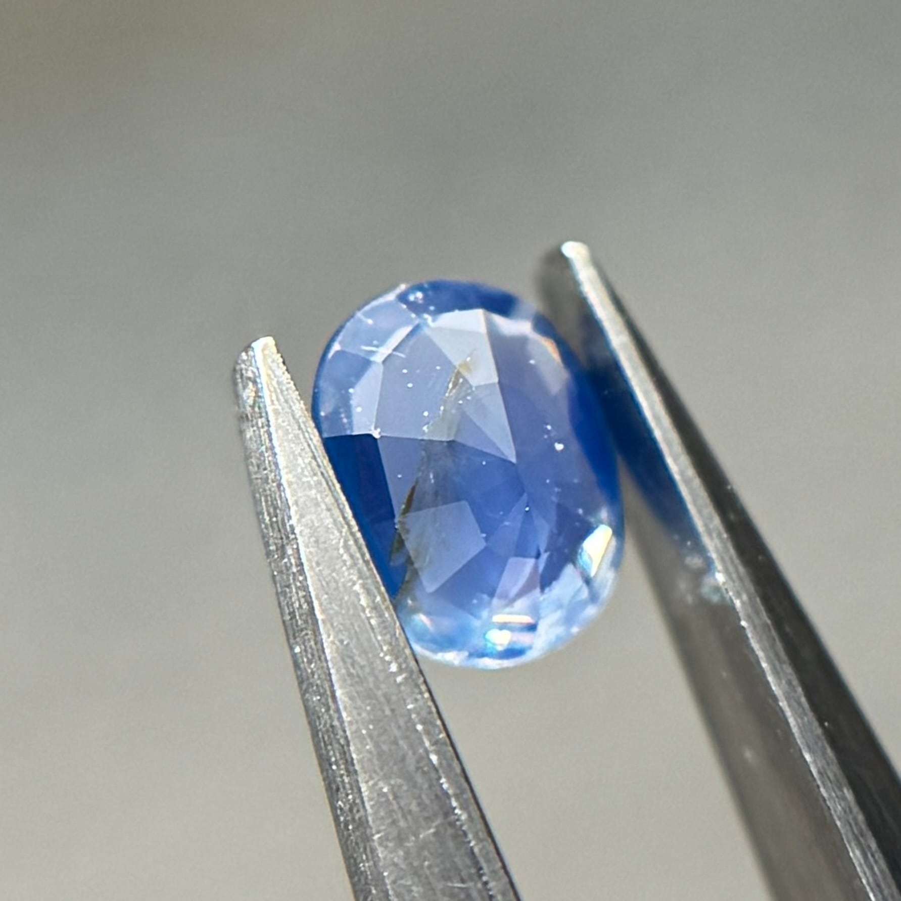 やや灰色がかったネモフィラのようなブルーが美しいシルキーサファイアです。茶色インクルージョンはベースの色に隠れて気にならないです。柔らかなてりがまるで花びらの上の朝露のようです