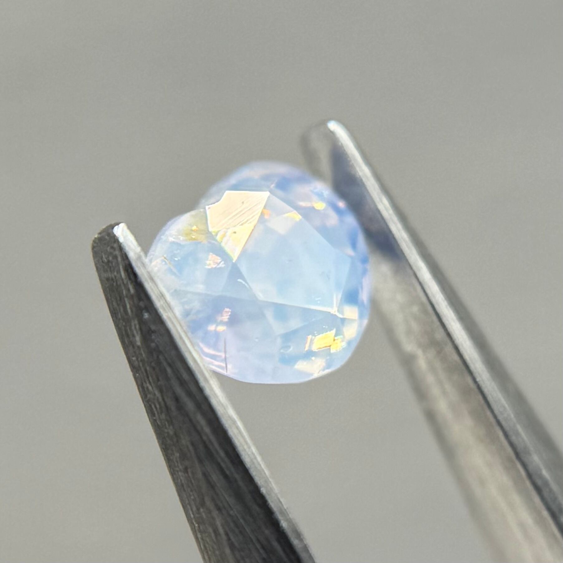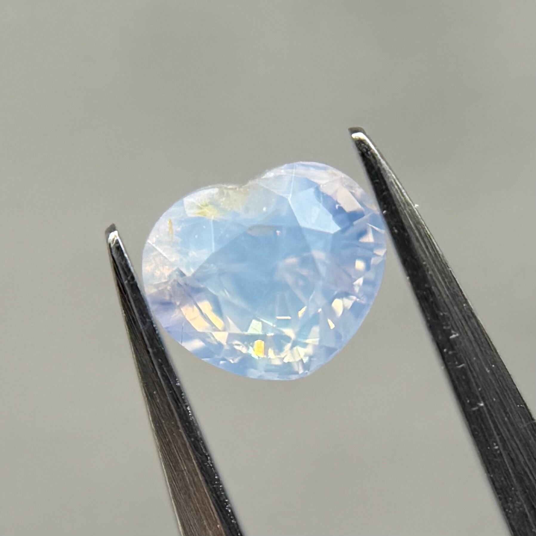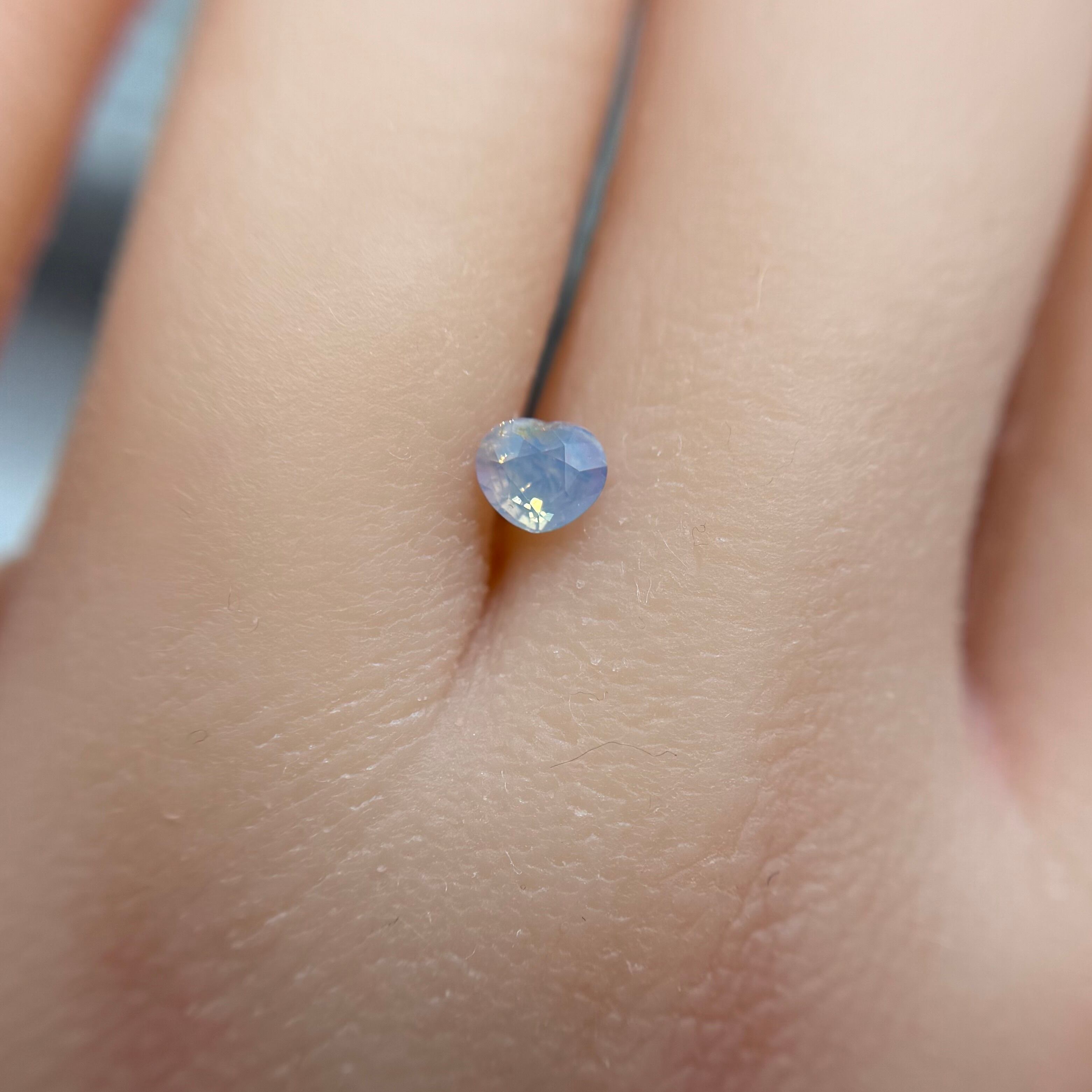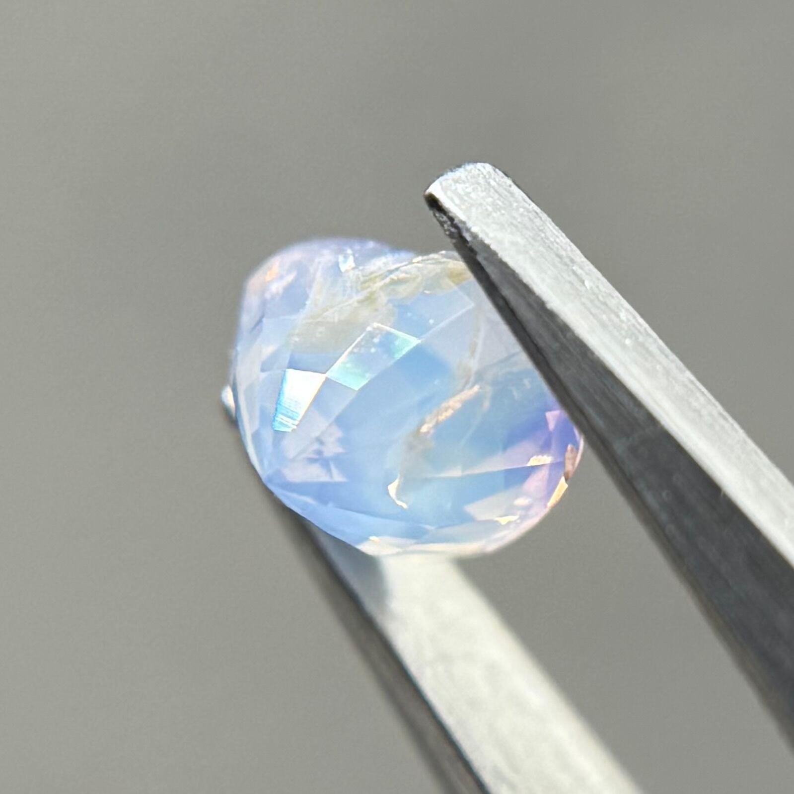 淡い水色にほんのり差し色で入ったピンクが非常に可愛らしくシルキーサファイアです。パビリオン側にインクルージョンを伴うクラックがありますが、お尻が深いためテーブル側からは気になりません。クレフトにあるインクルージョンもテリにまじって目立たないです