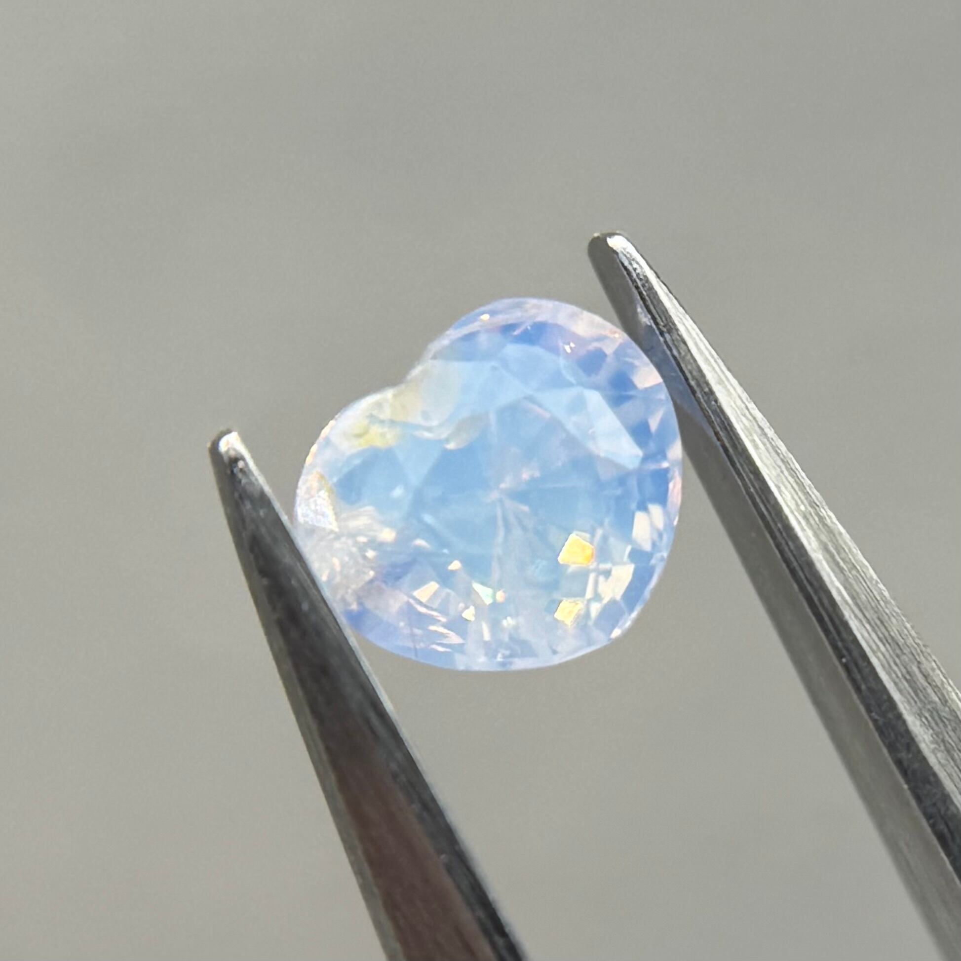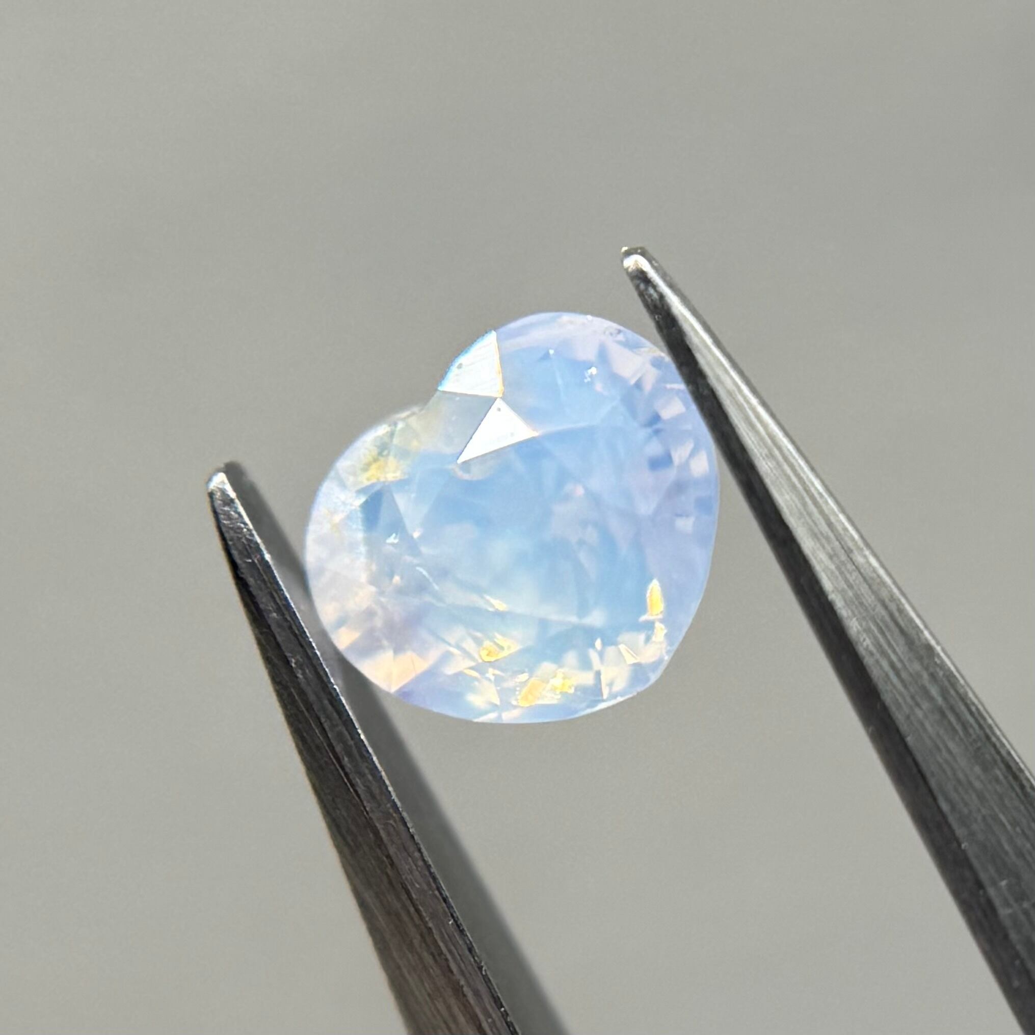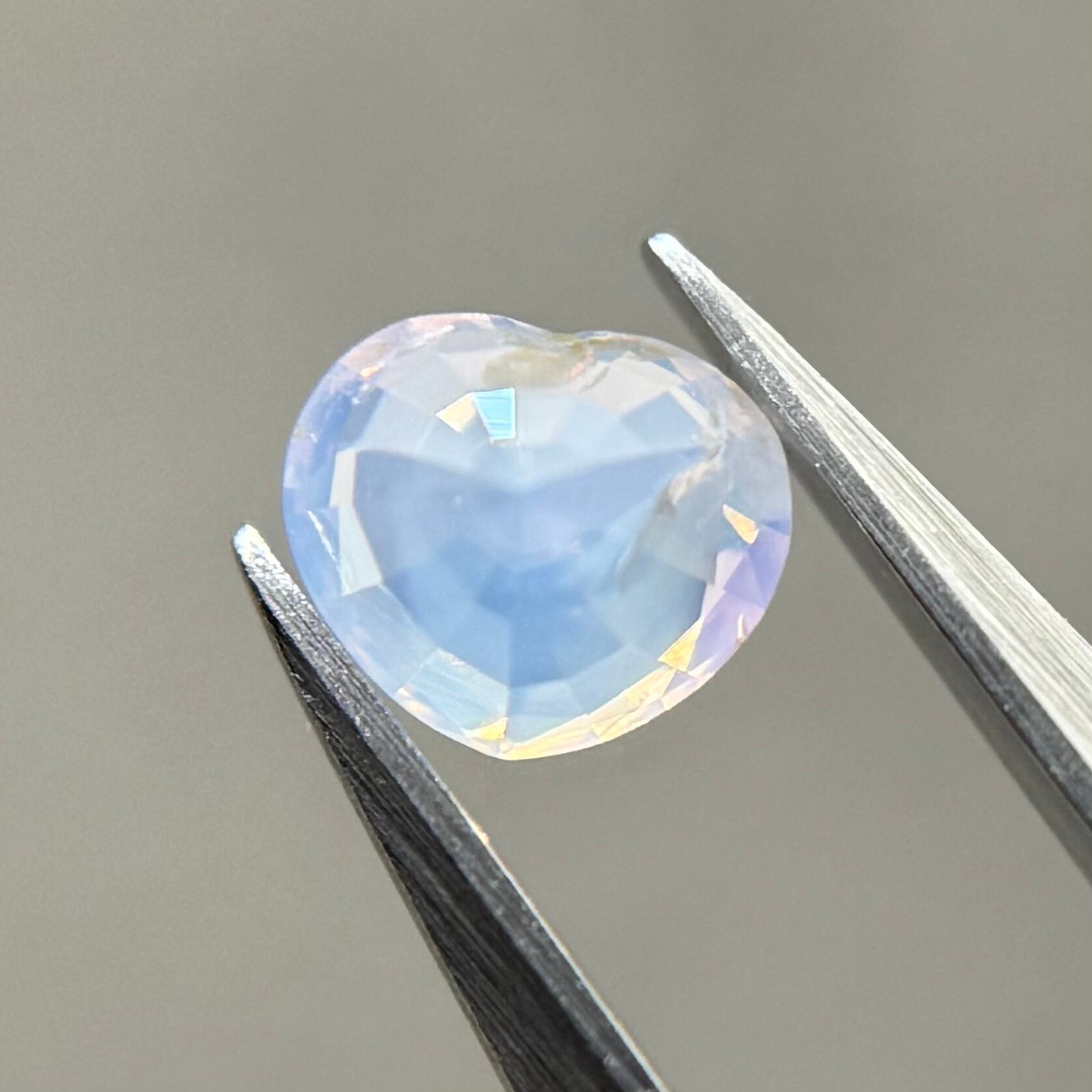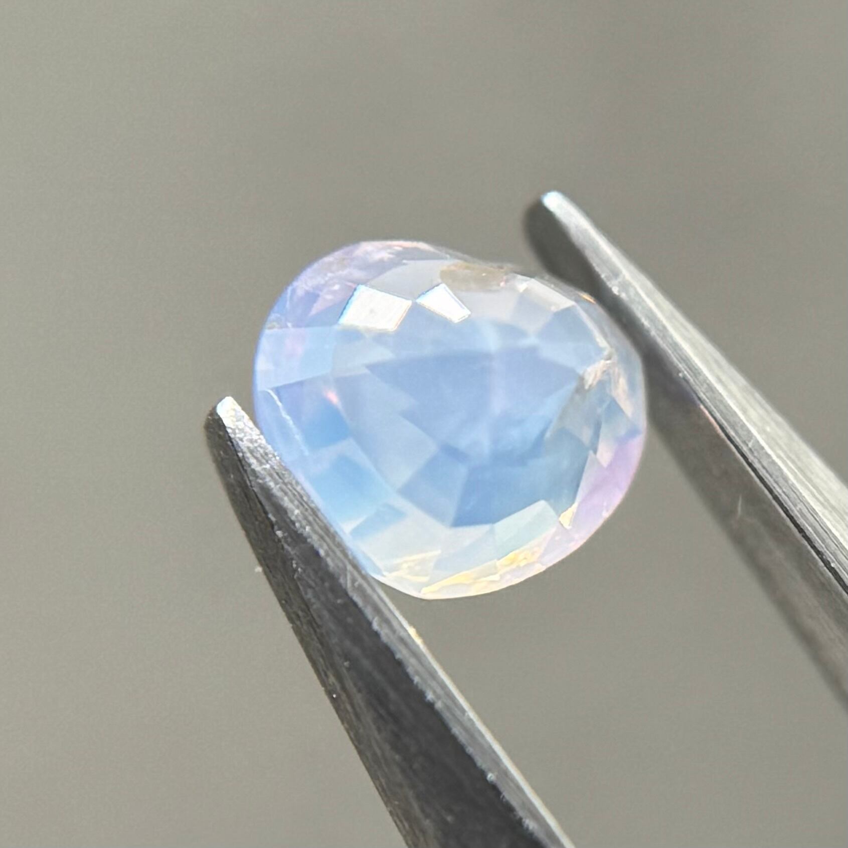 淡い水色にほんのり差し色で入ったピンクが非常に可愛らしくシルキーサファイアです。パビリオン側にインクルージョンを伴うクラックがありますが、お尻が深いためテーブル側からは気になりません。クレフトにあるインクルージョンもテリにまじって目立たないです