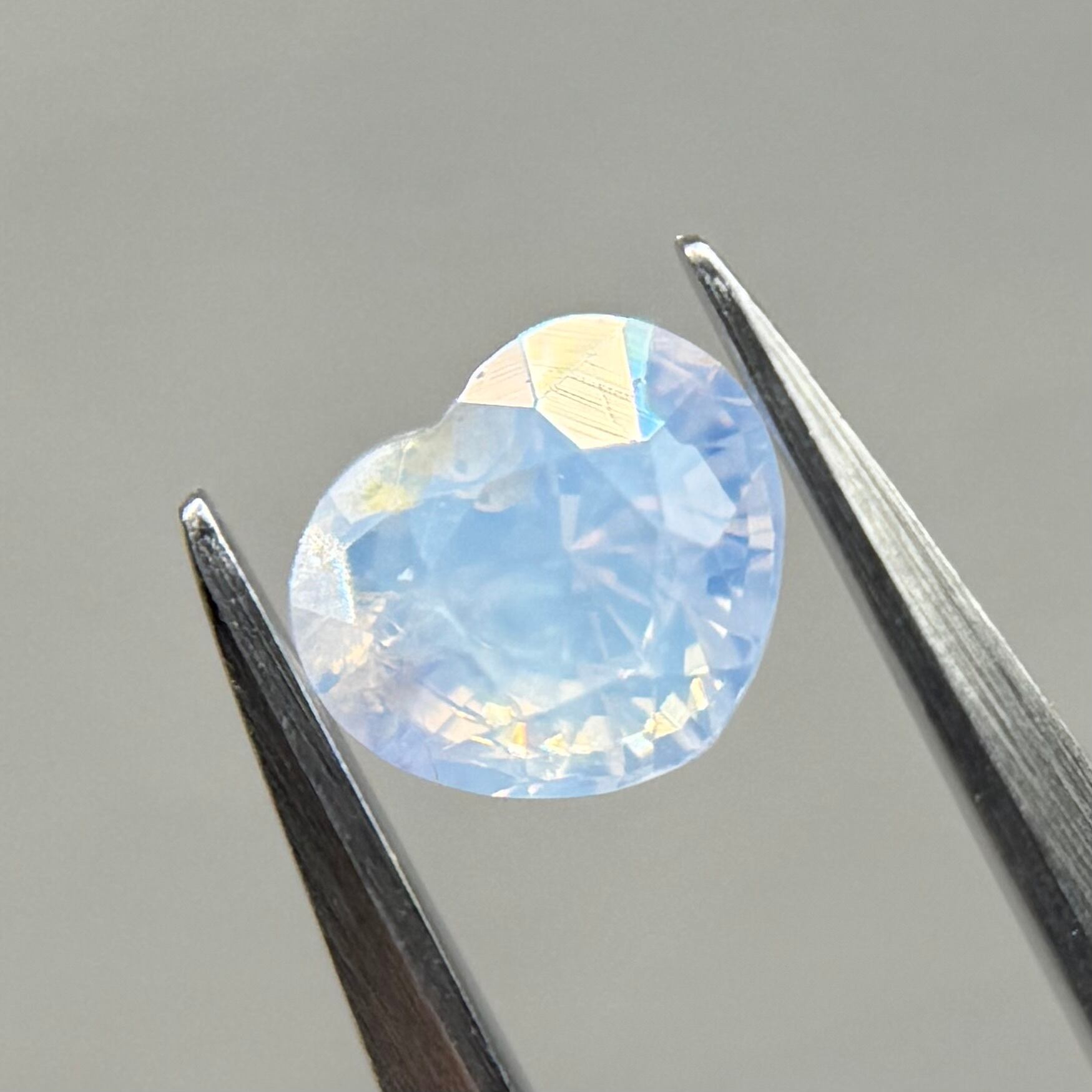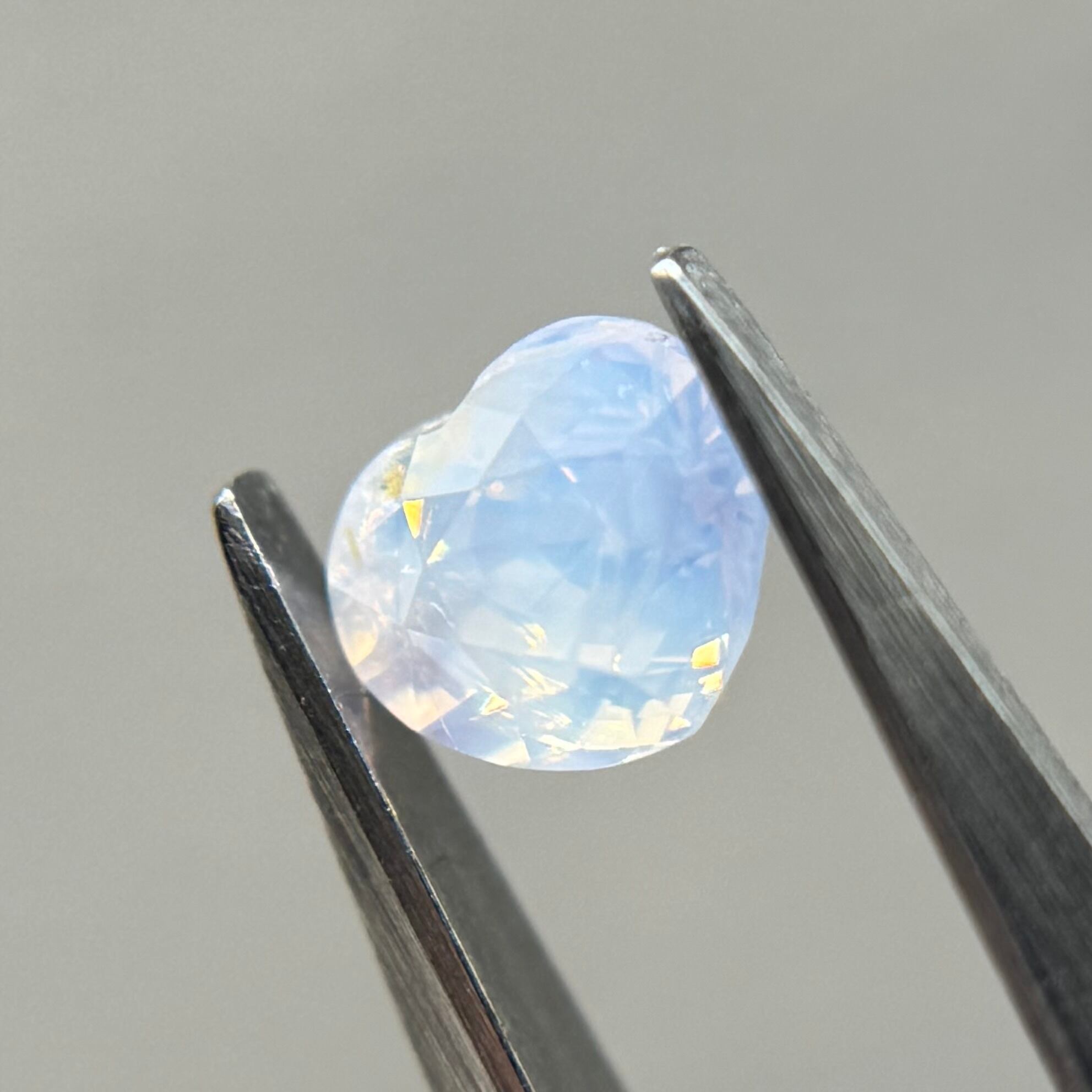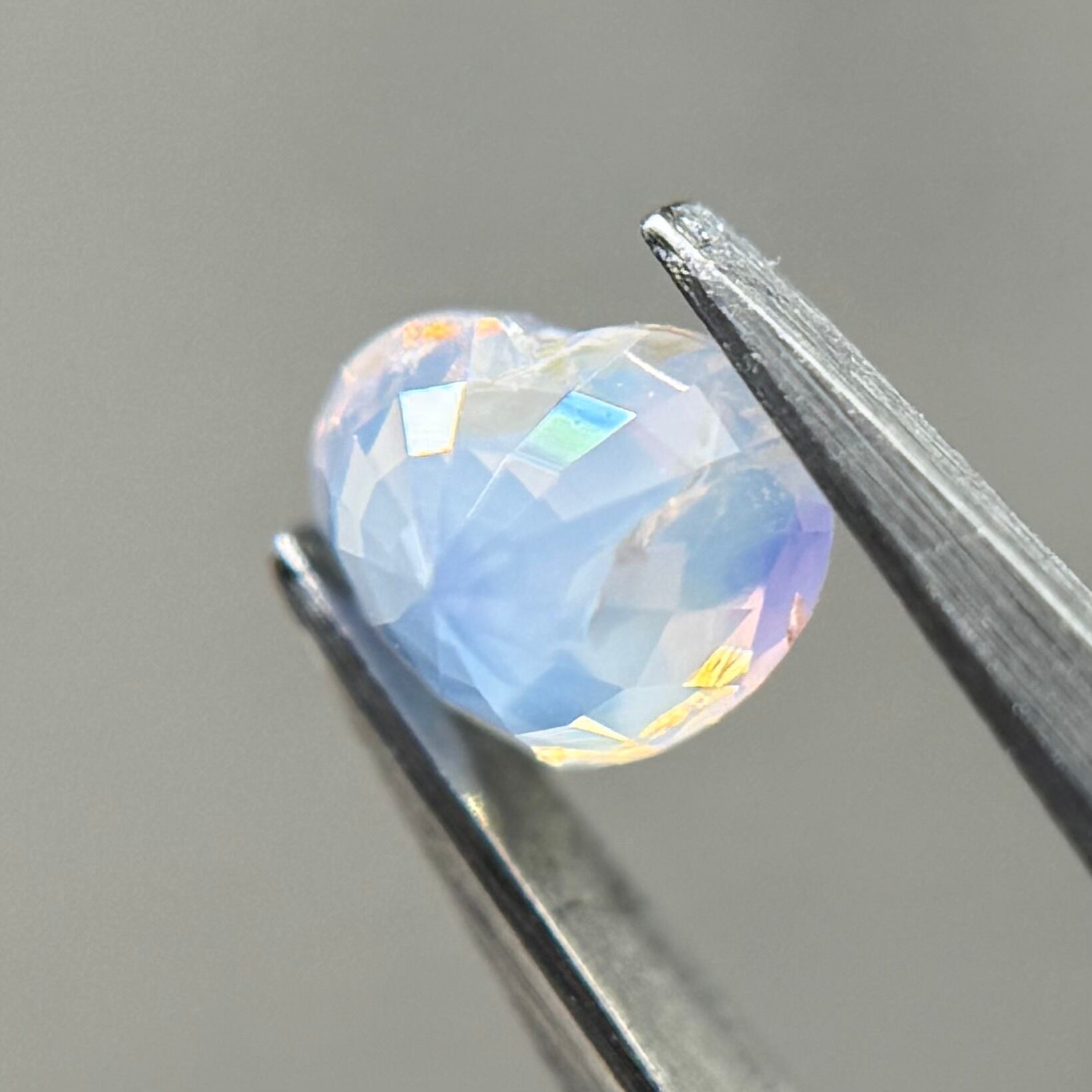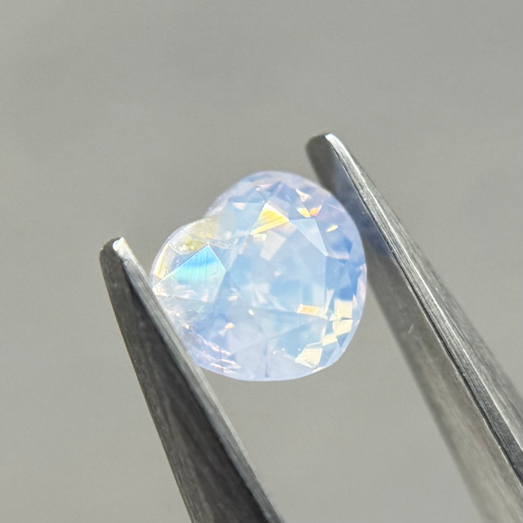 淡い水色にほんのり差し色で入ったピンクが非常に可愛らしくシルキーサファイアです。パビリオン側にインクルージョンを伴うクラックがありますが、お尻が深いためテーブル側からは気になりません。クレフトにあるインクルージョンもテリにまじって目立たないです