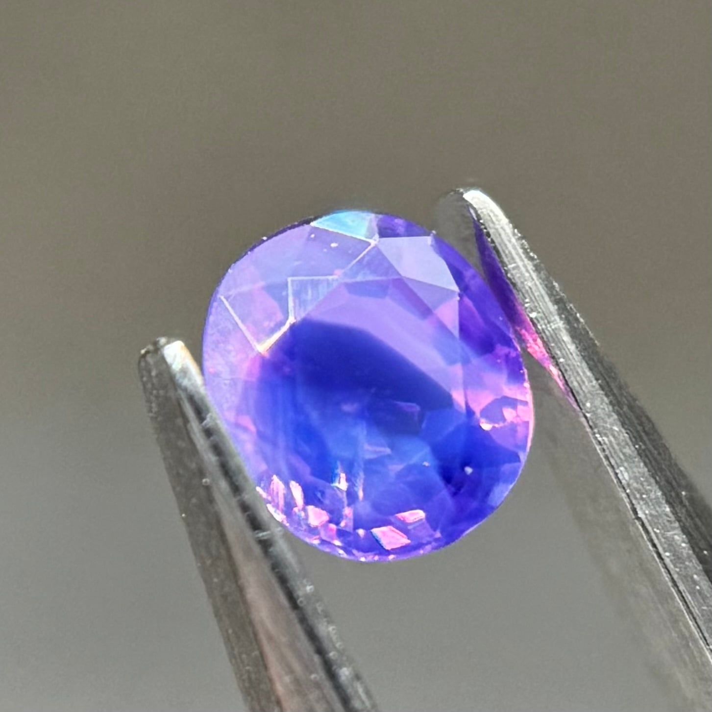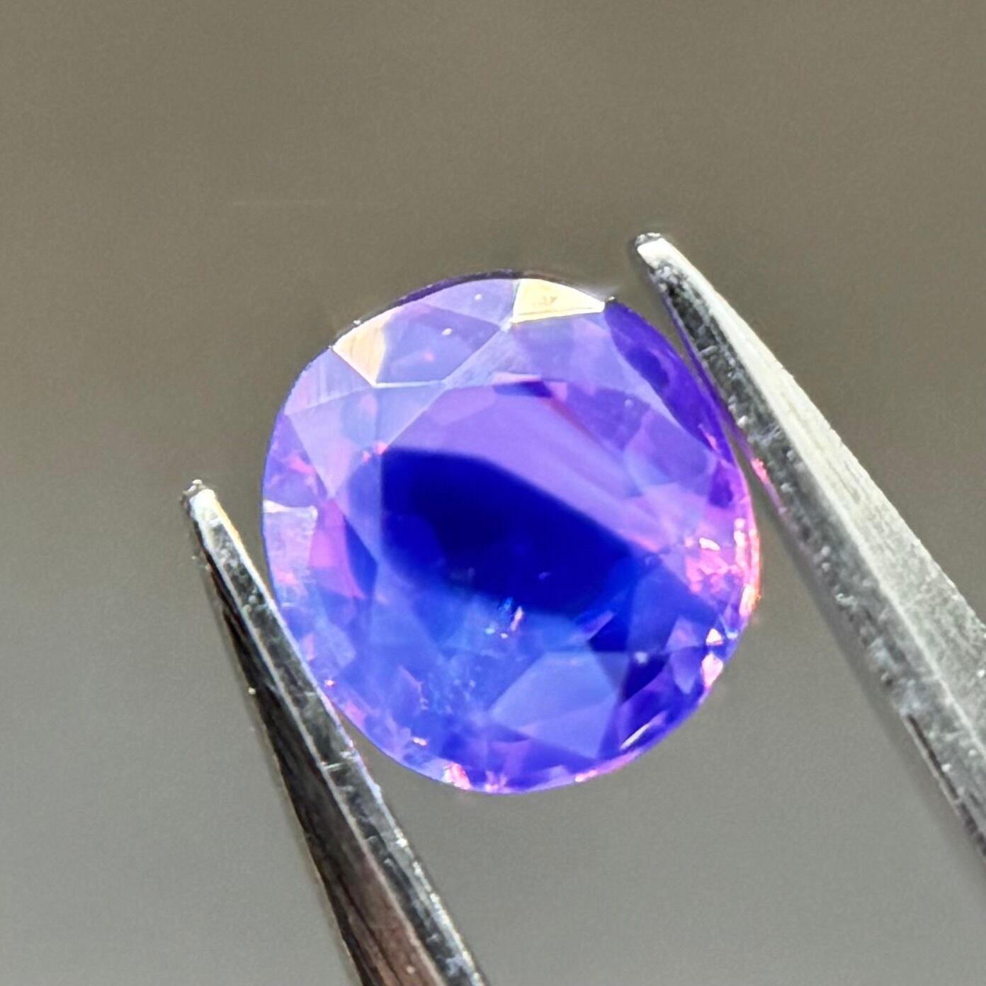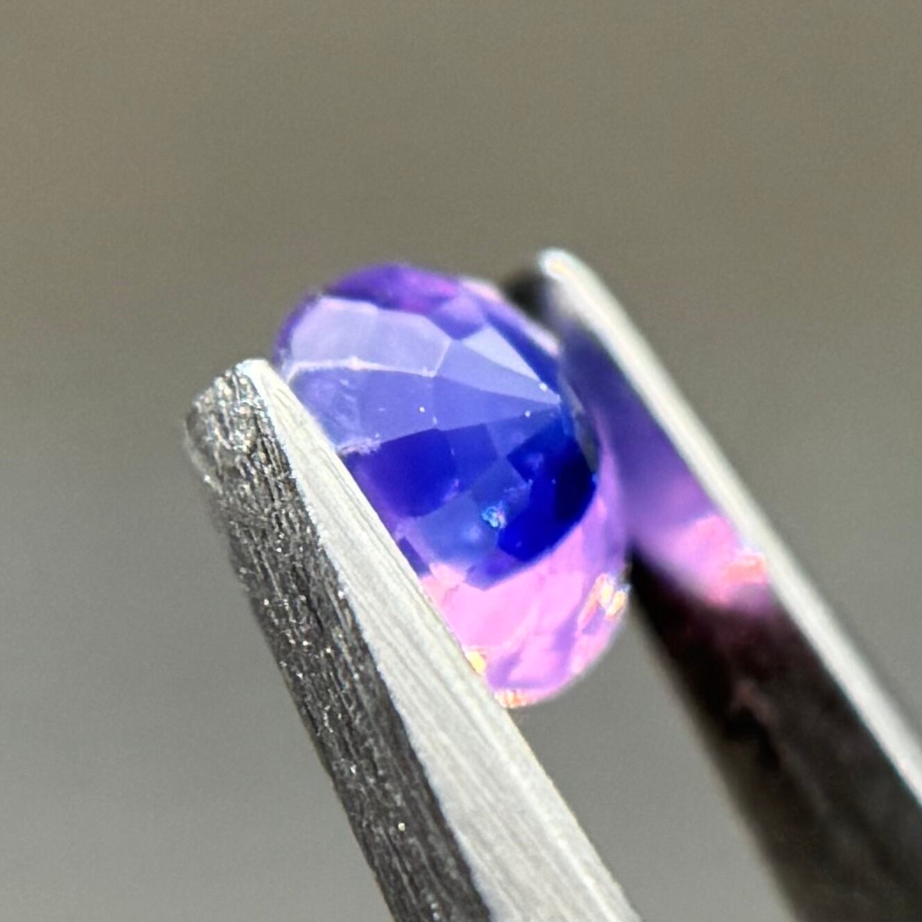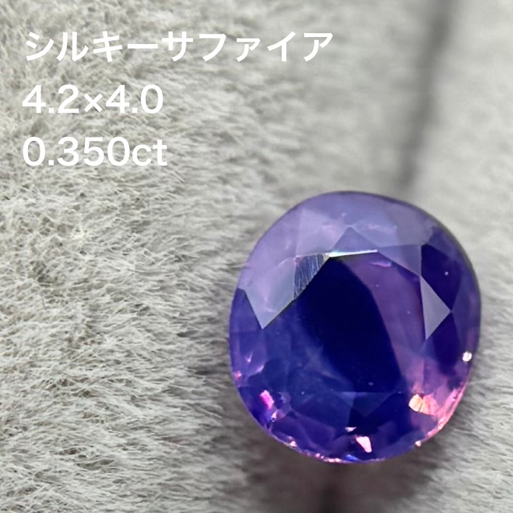 色だまりとクラウドインクルージョンによって、紫が強く出る部分と青が強く出る部分が感じられるシルキーサファイアです。色だまりの間からテリが煌めき、とても幻想的です