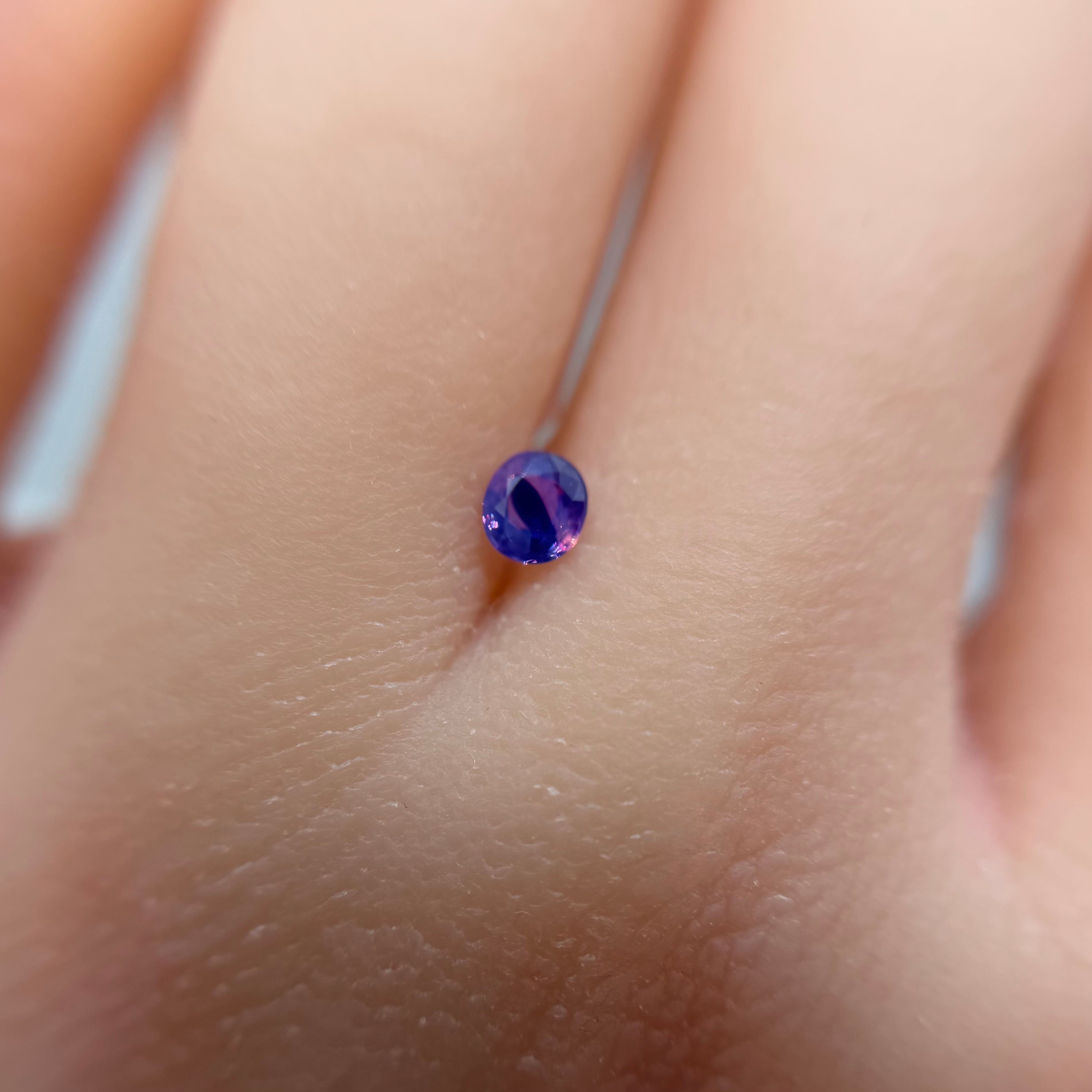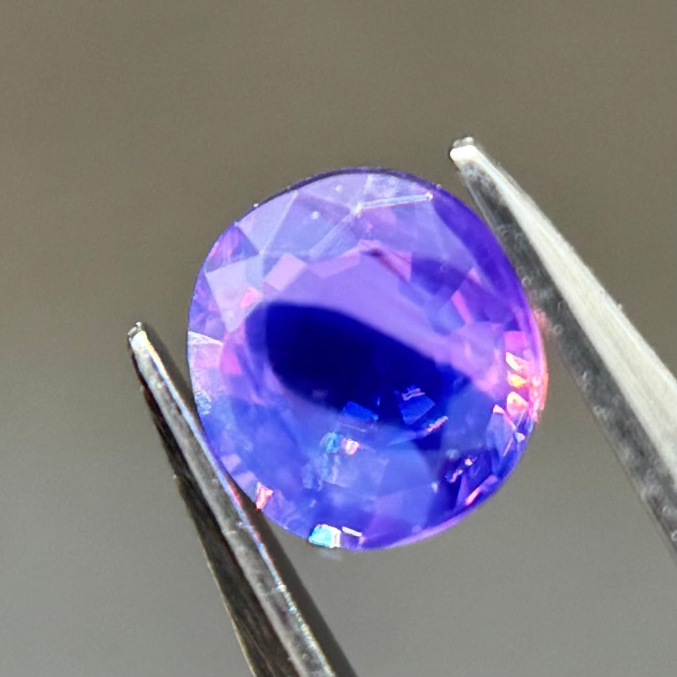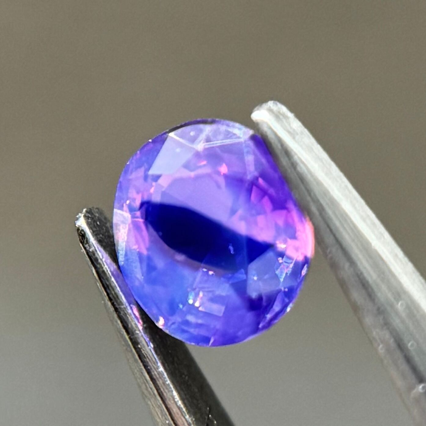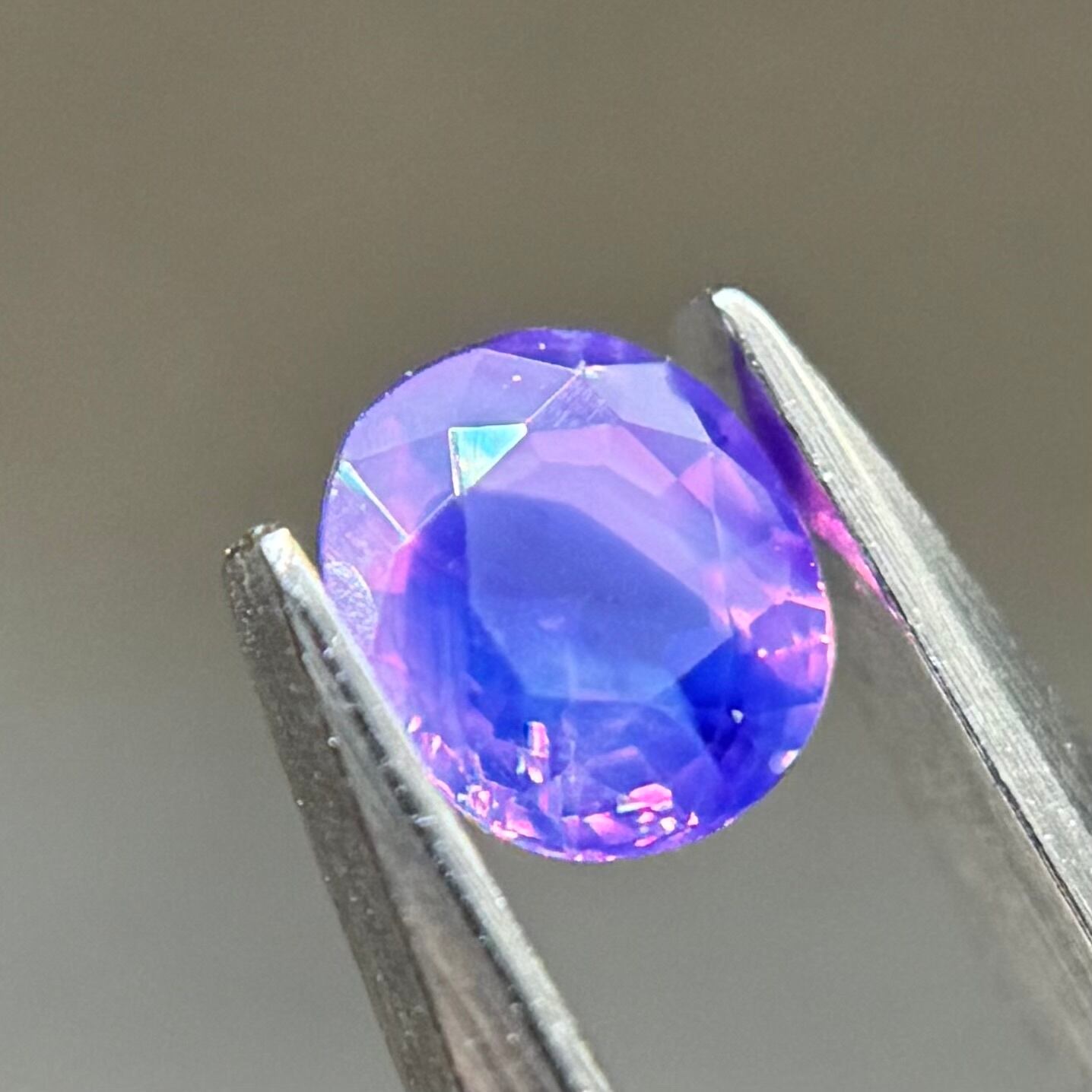 色だまりとクラウドインクルージョンによって、紫が強く出る部分と青が強く出る部分が感じられるシルキーサファイアです。色だまりの間からテリが煌めき、とても幻想的です