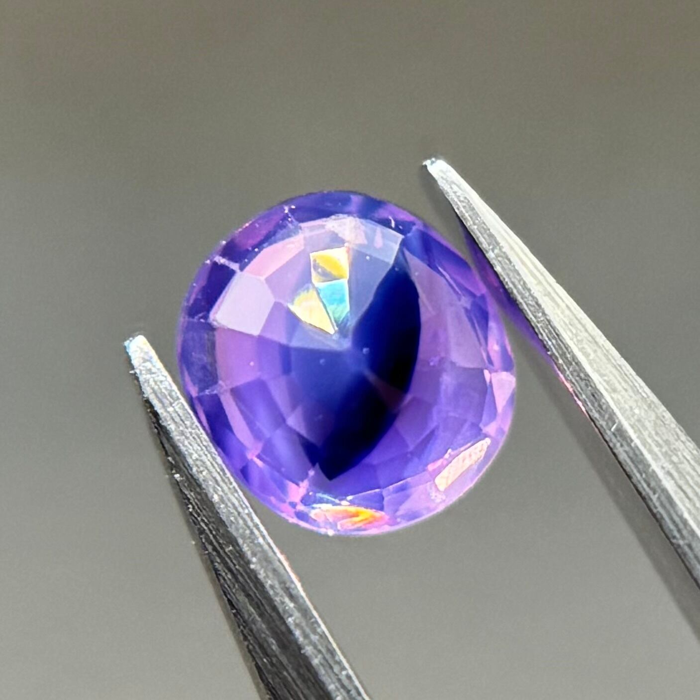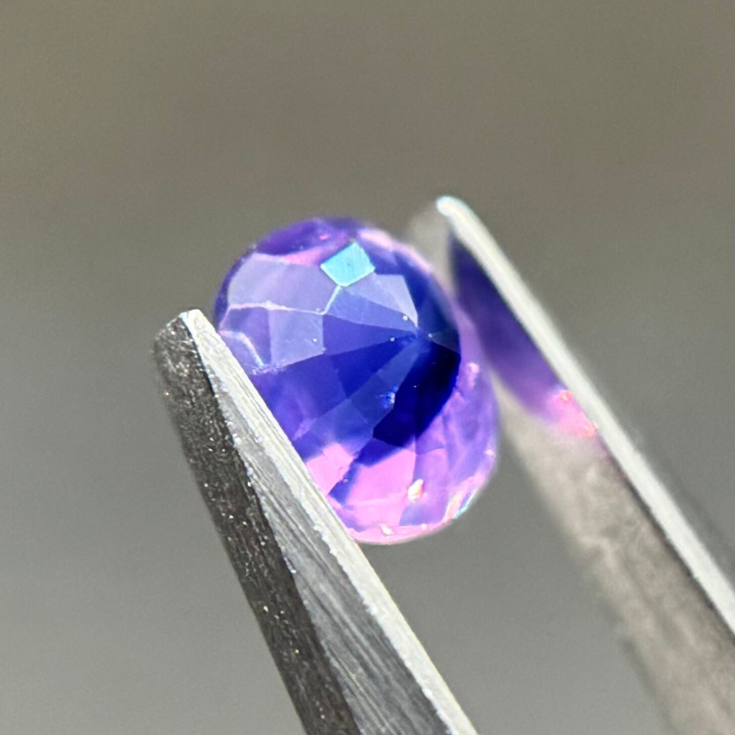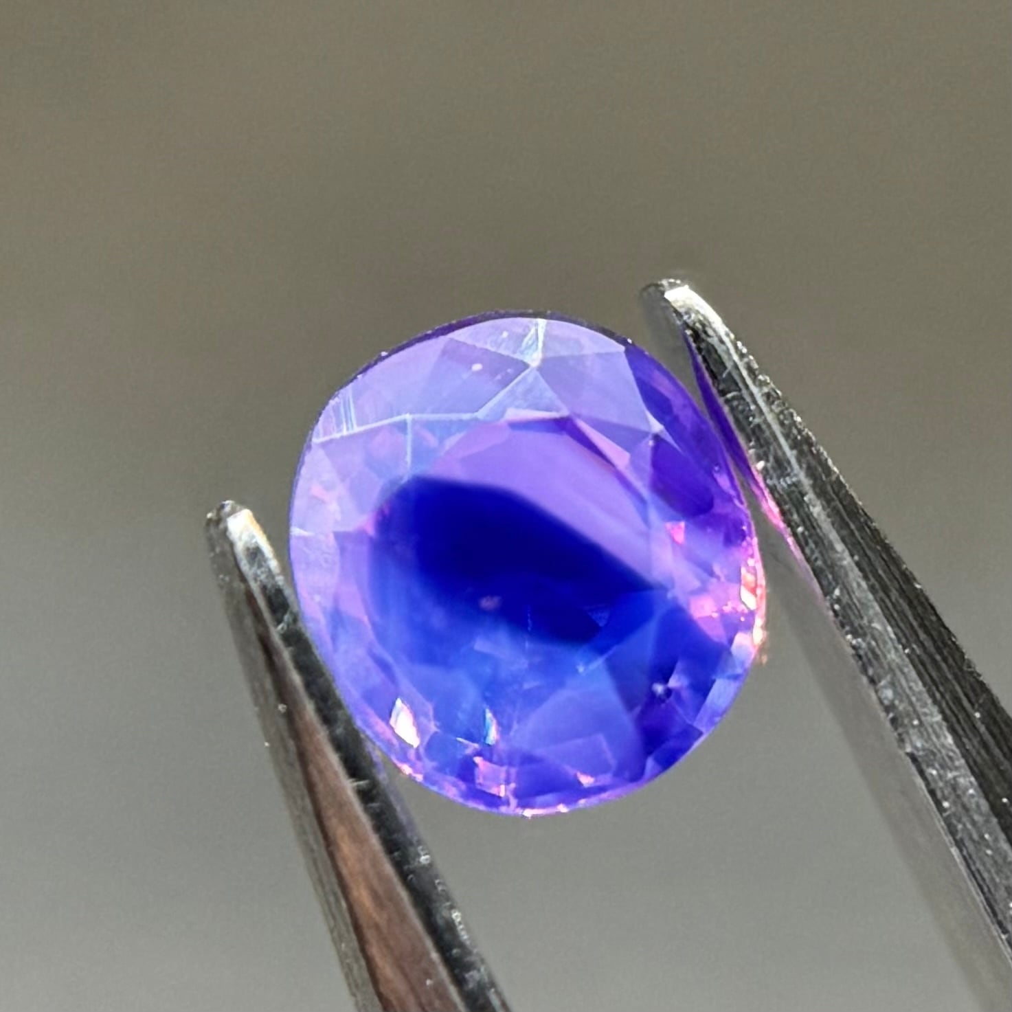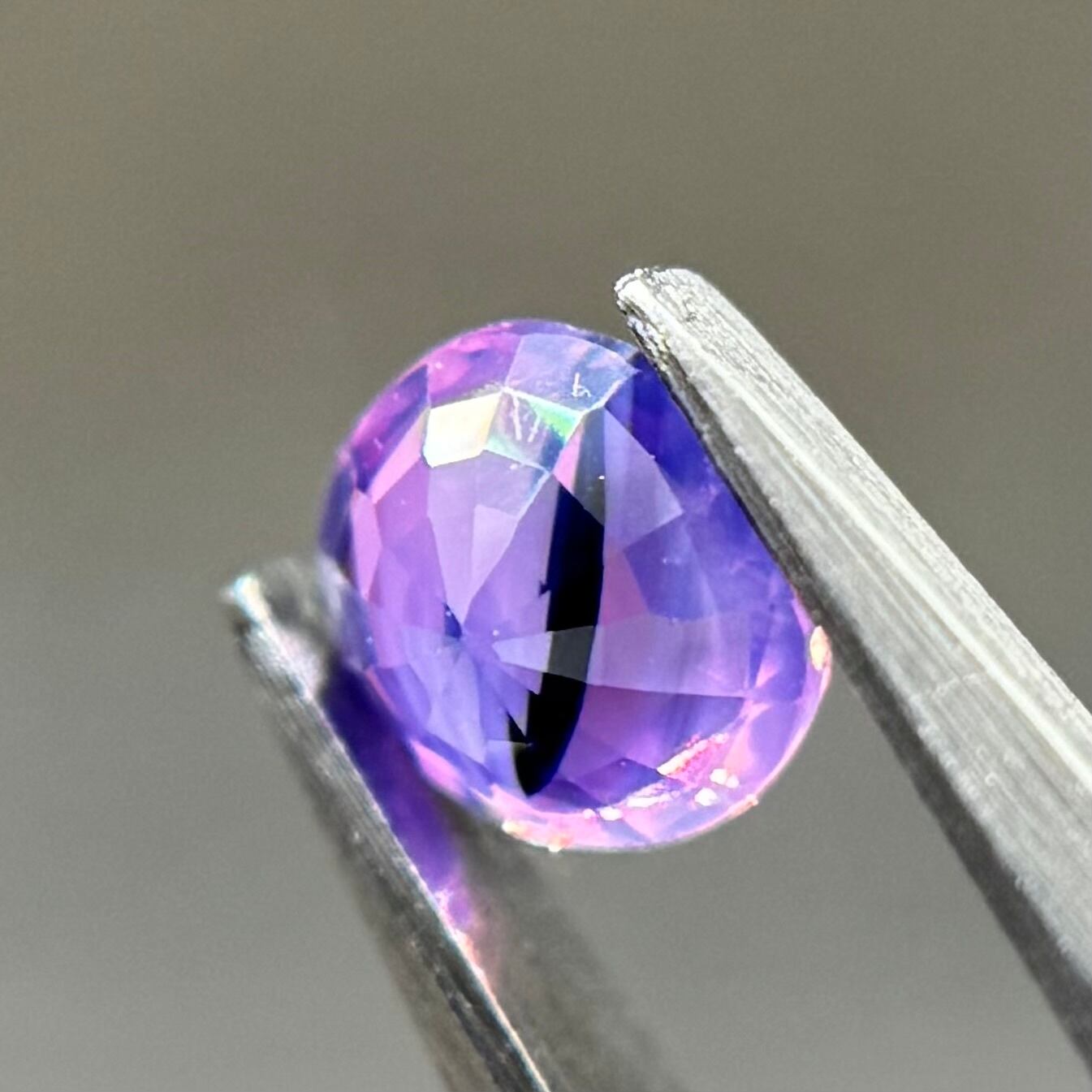 色だまりとクラウドインクルージョンによって、紫が強く出る部分と青が強く出る部分が感じられるシルキーサファイアです。色だまりの間からテリが煌めき、とても幻想的です