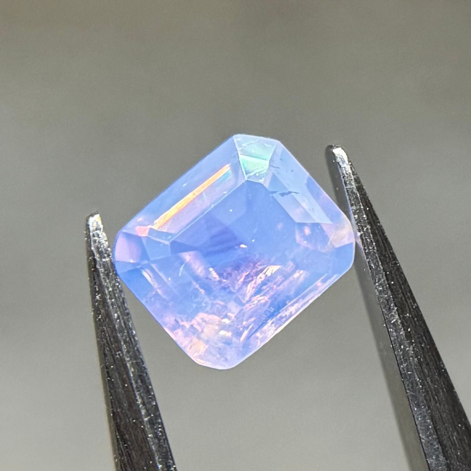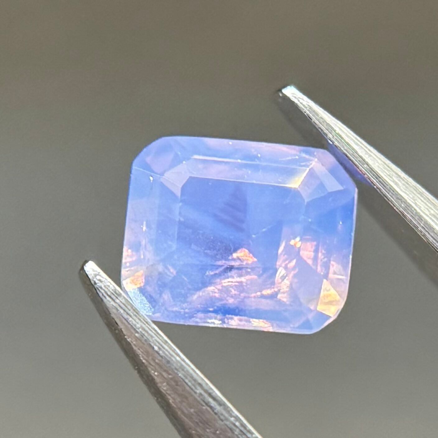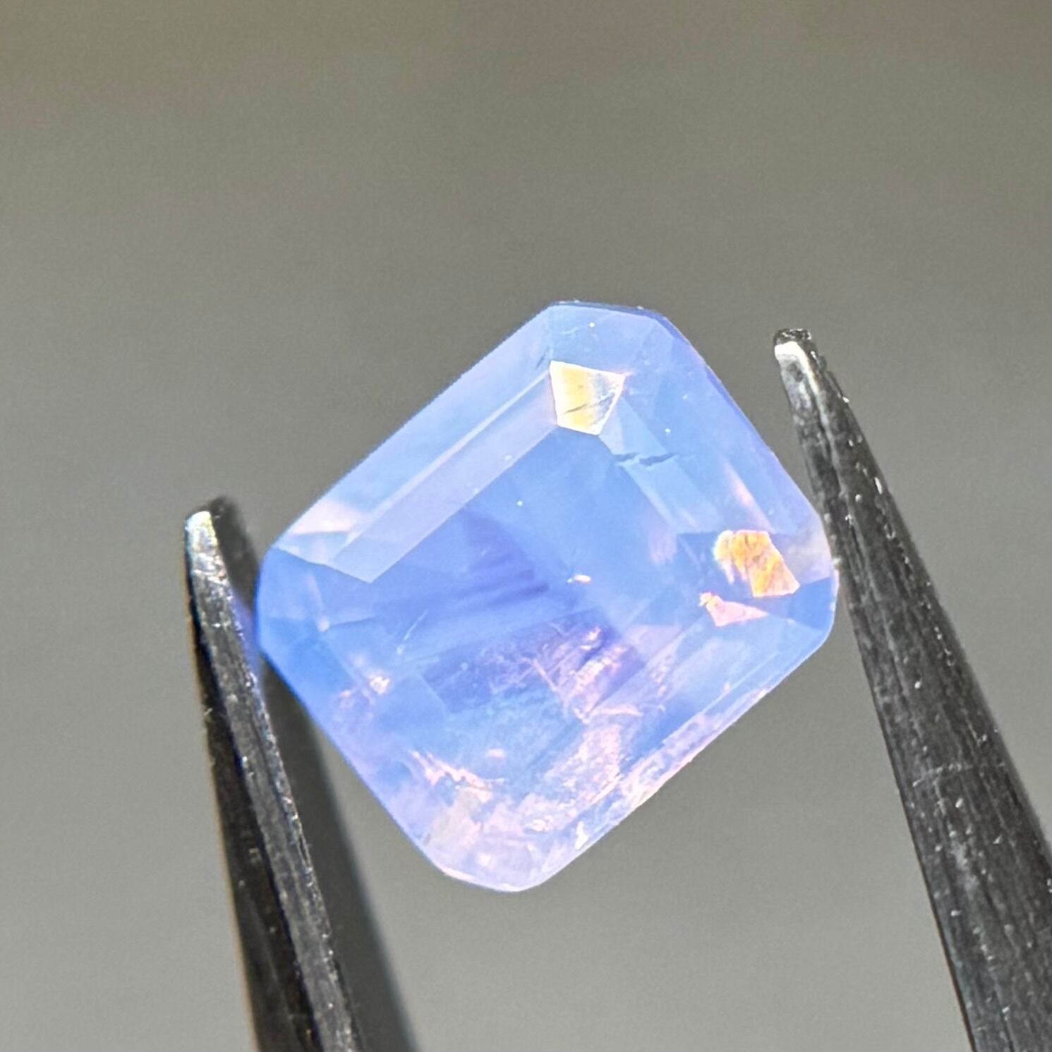 まるで空を映した写真のような色合いが楽しめるシルキーサファイアです。半分にクラウドインクルージョンが入っているため、縦横上下でまた見せる情景が変わります