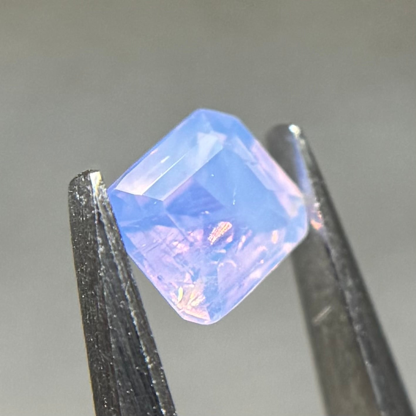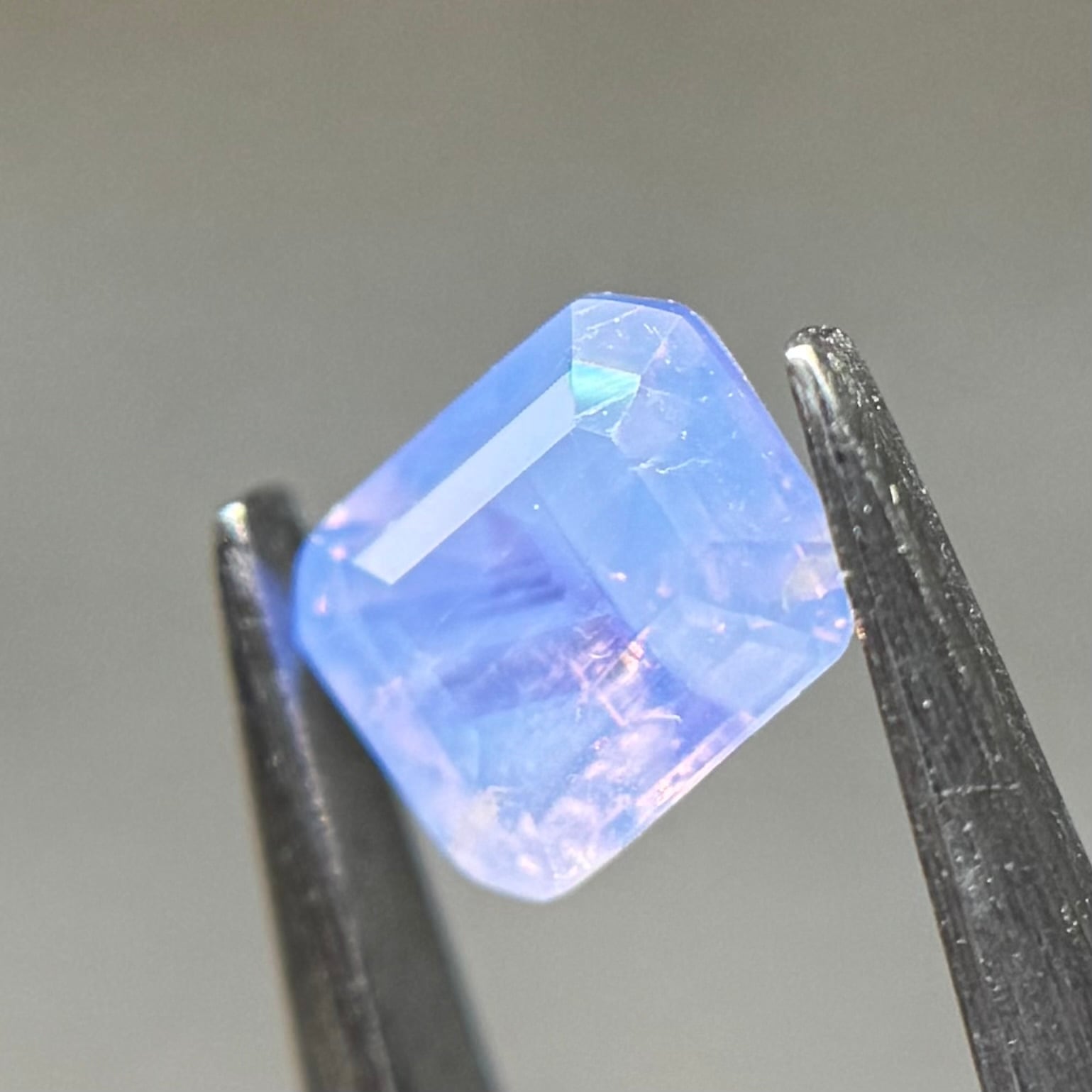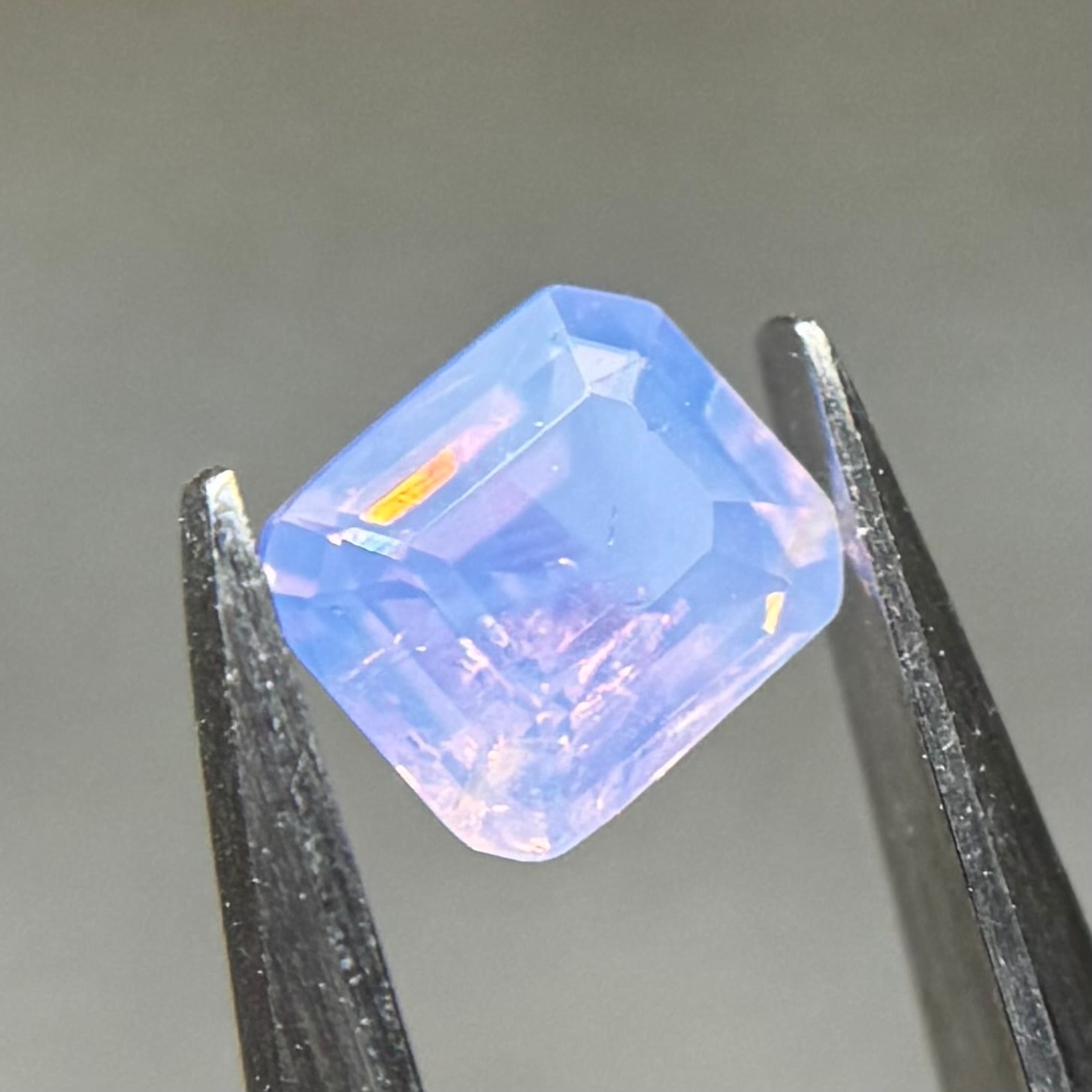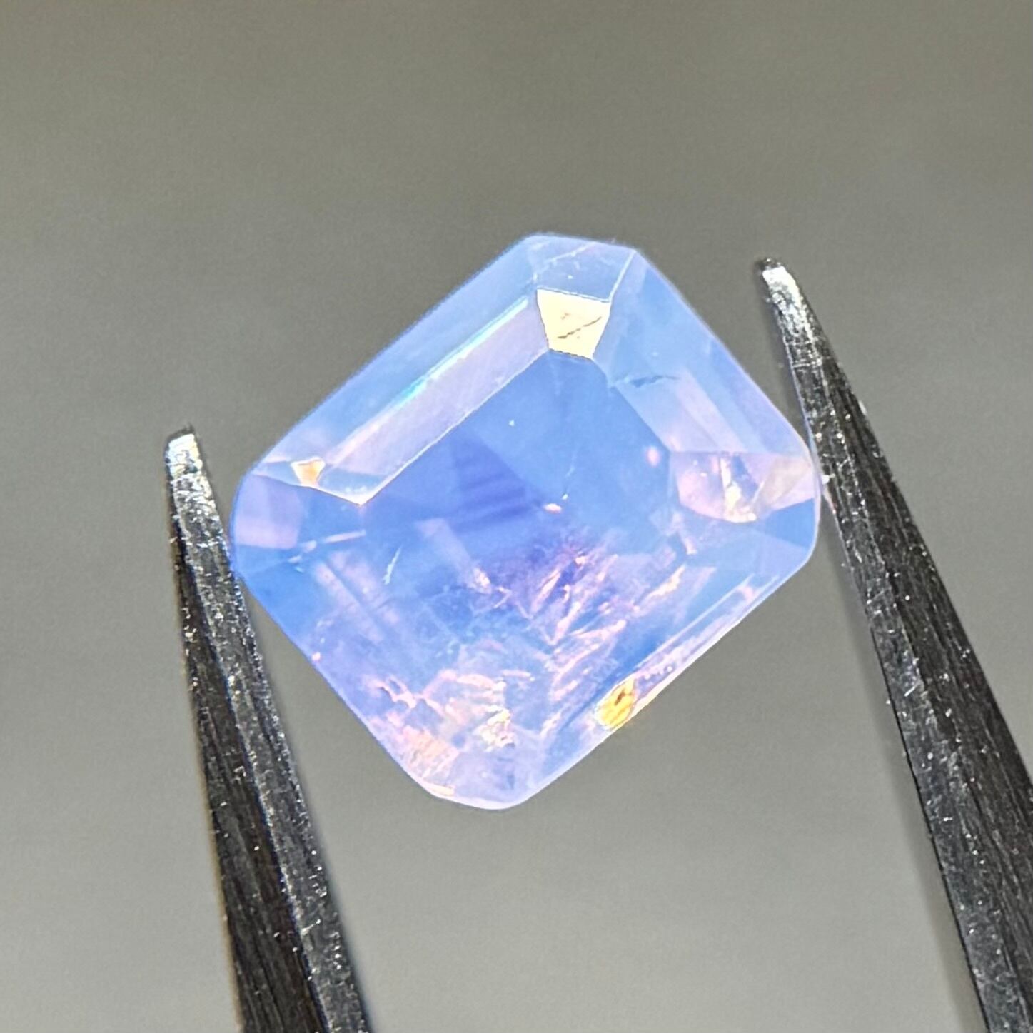 まるで空を映した写真のような色合いが楽しめるシルキーサファイアです。半分にクラウドインクルージョンが入っているため、縦横上下でまた見せる情景が変わります