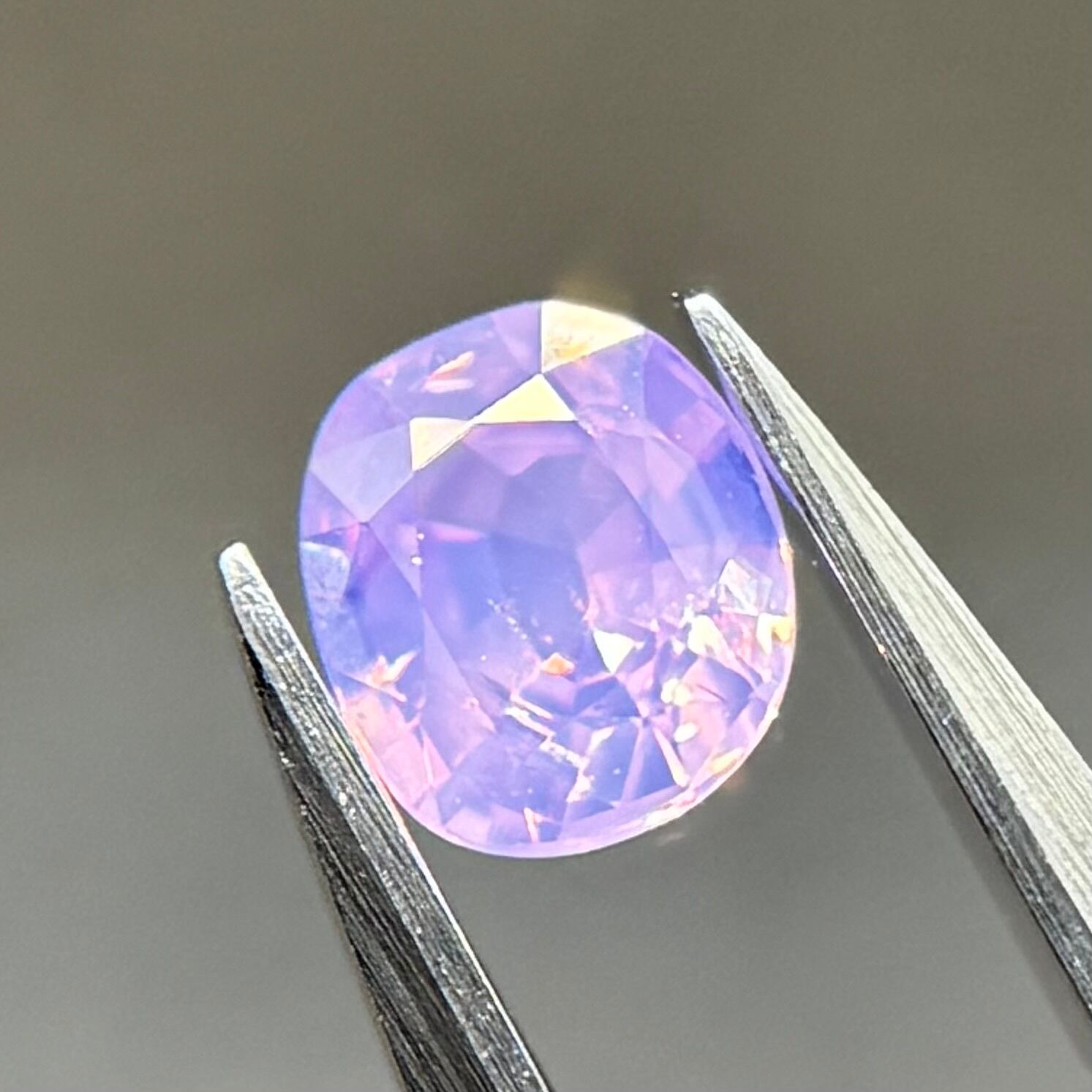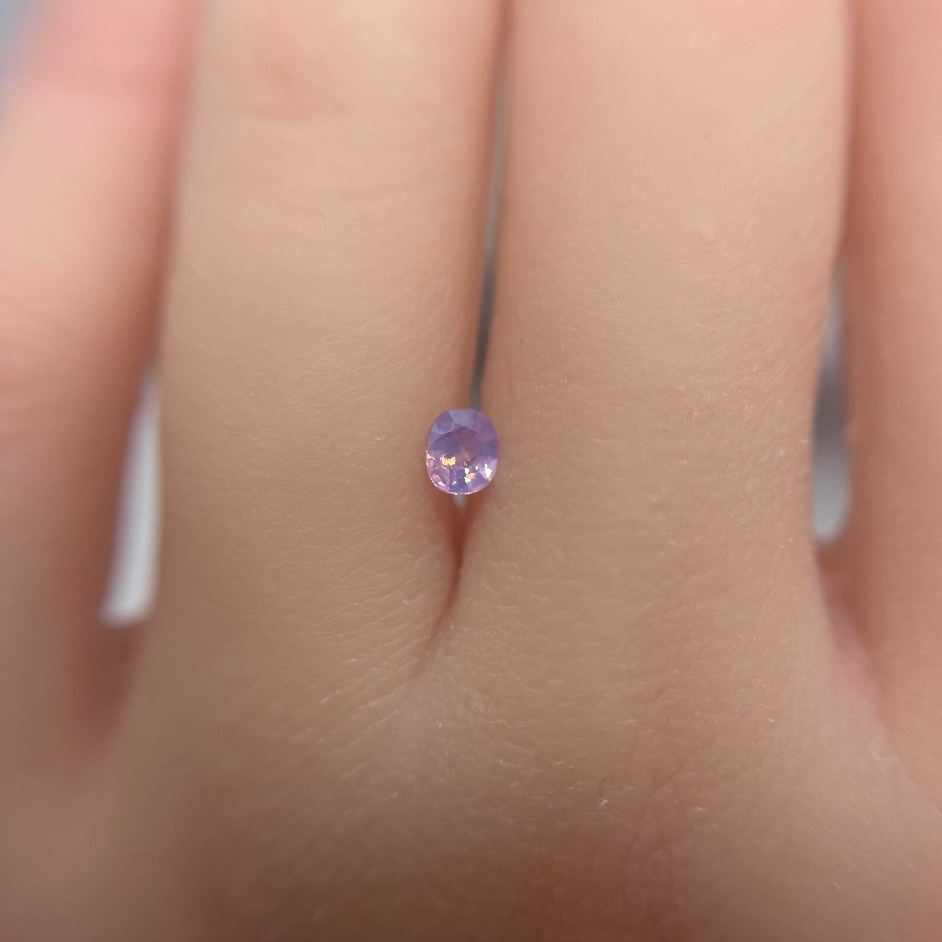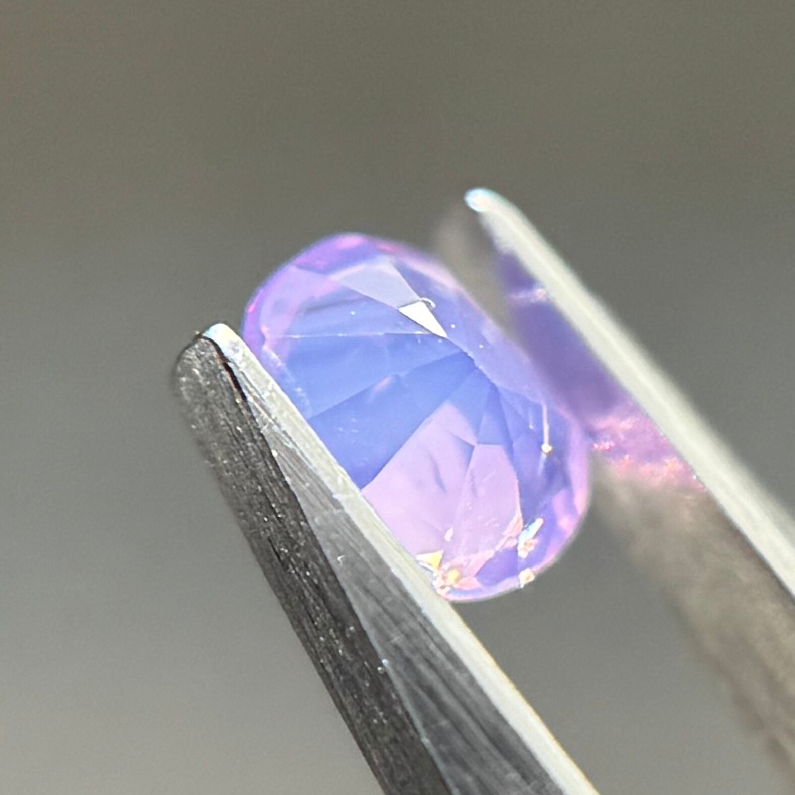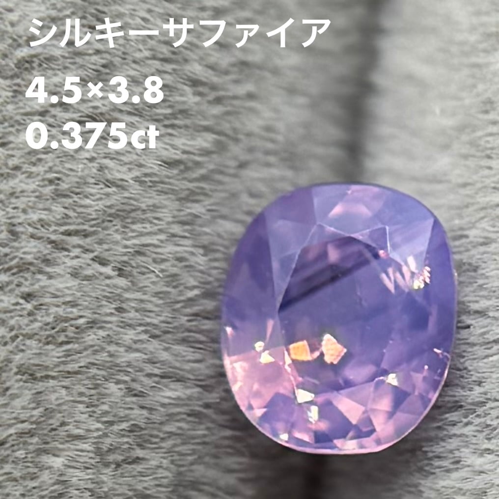 ふんわりパープルに優しい暖色のテリがキラキラと美しいシルキーサファイアです。手に乗せると紫がふわっと浮かび上がりまるでお花が咲いたようです