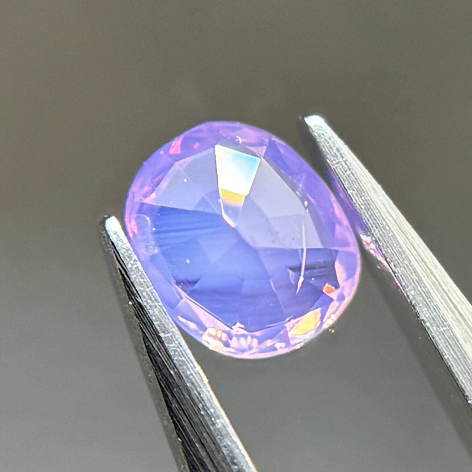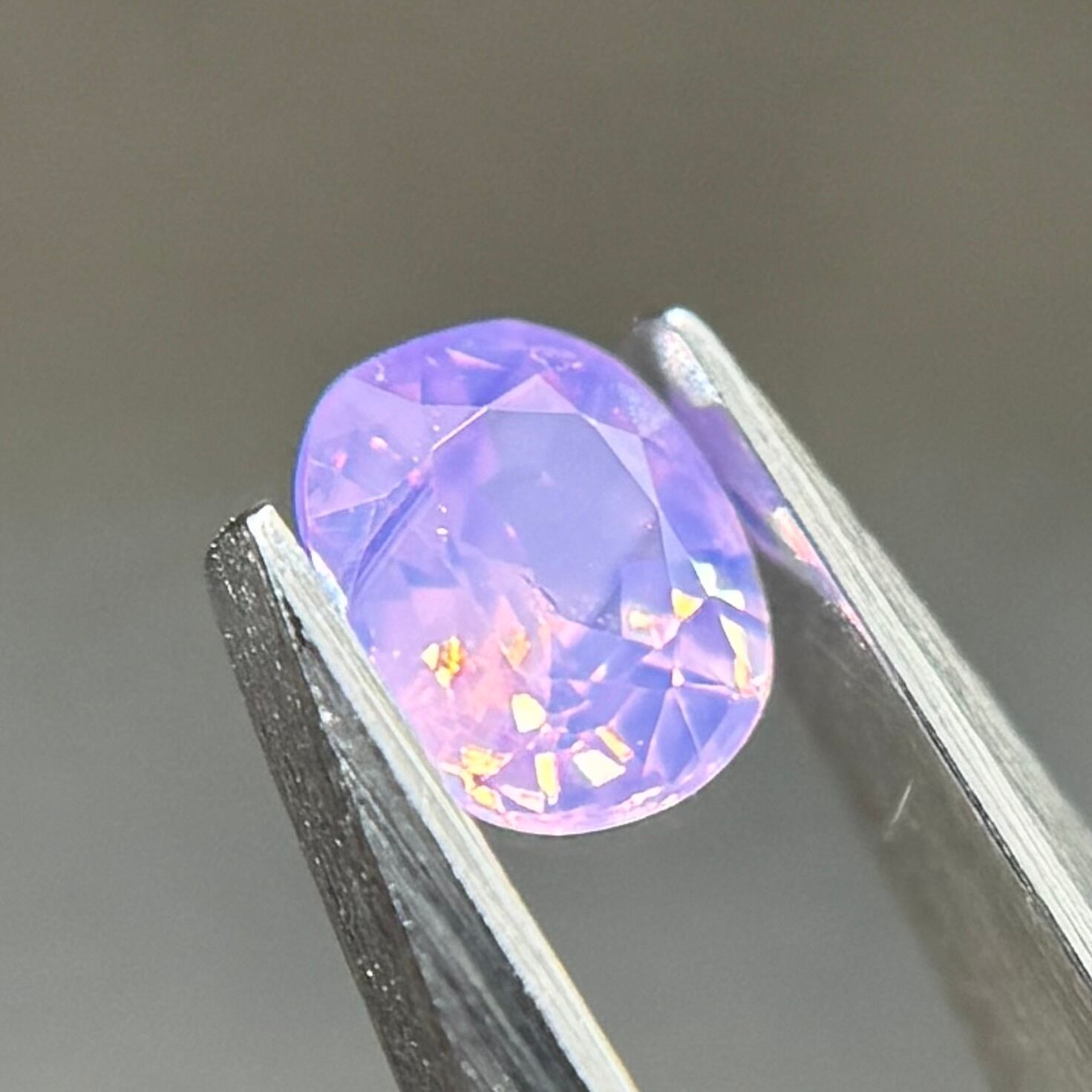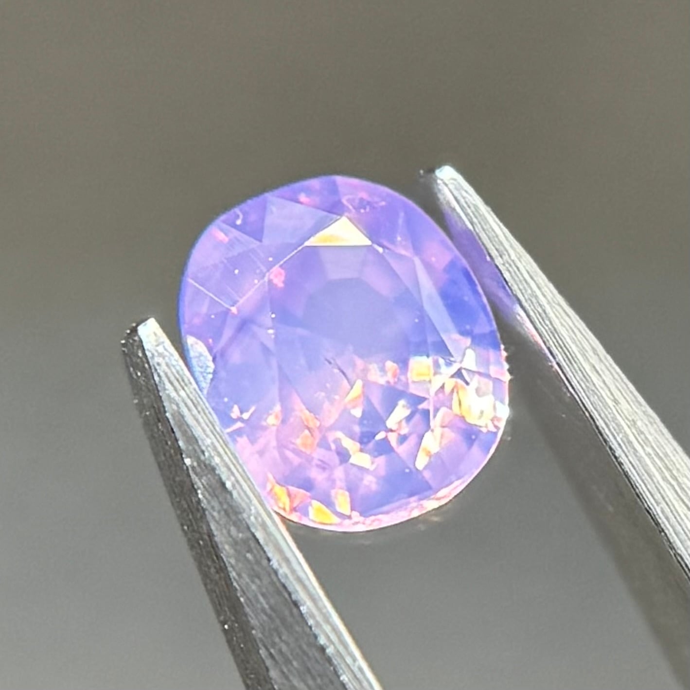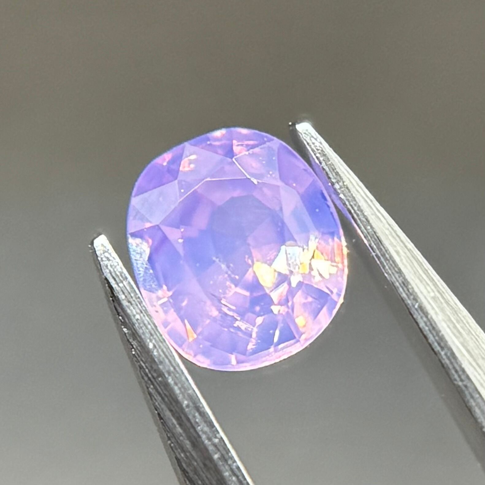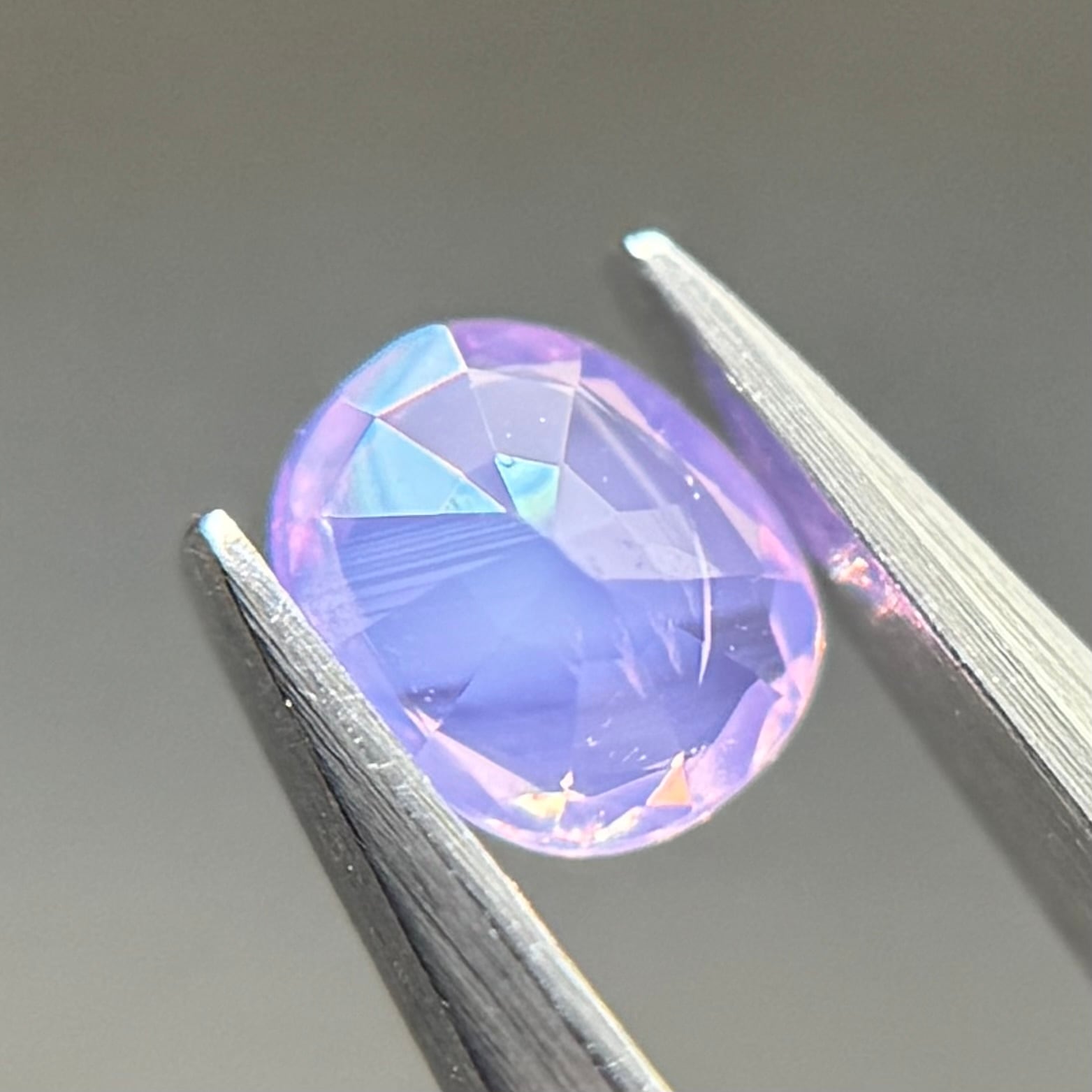 ふんわりパープルに優しい暖色のテリがキラキラと美しいシルキーサファイアです。手に乗せると紫がふわっと浮かび上がりまるでお花が咲いたようです