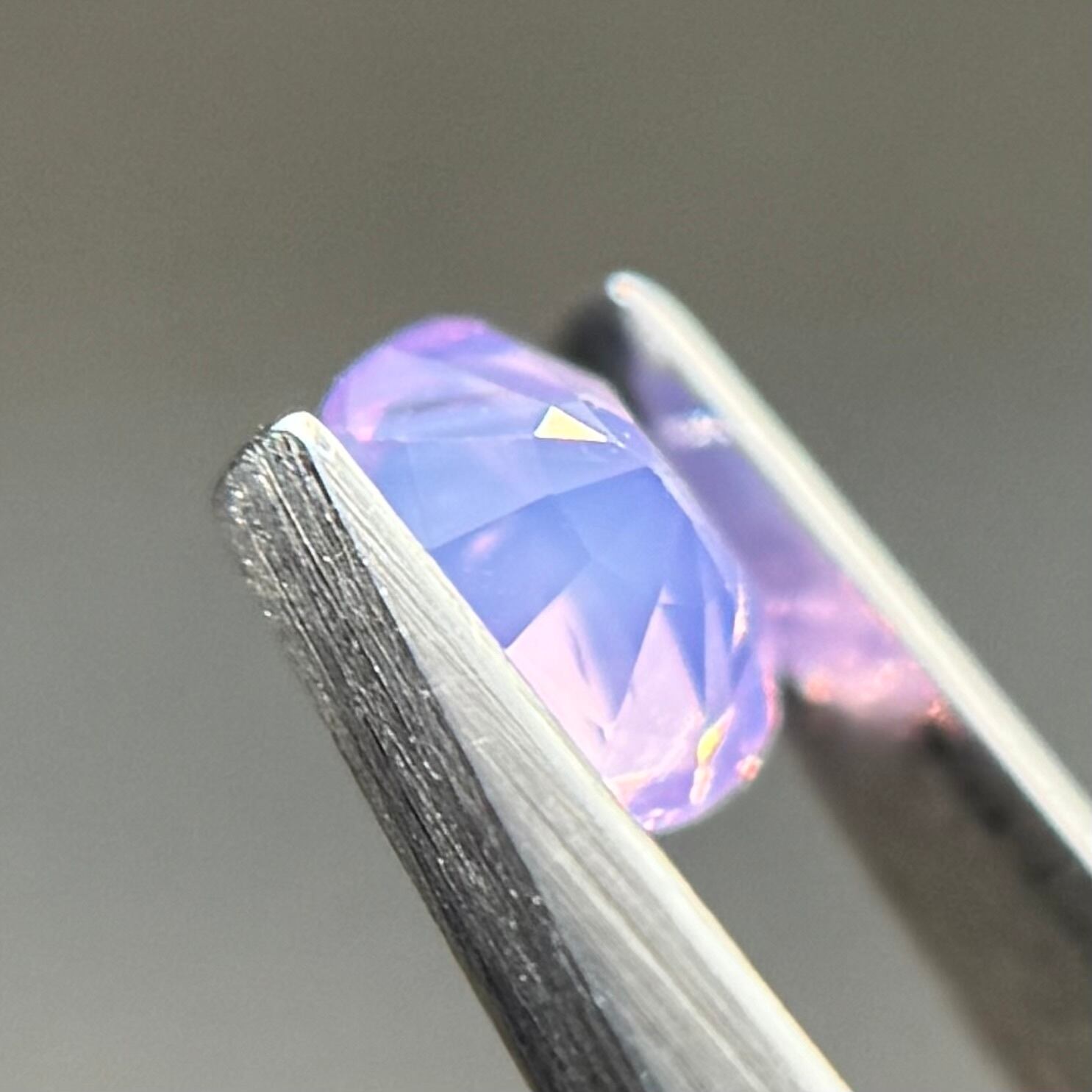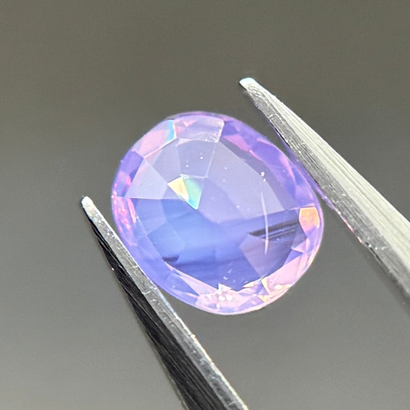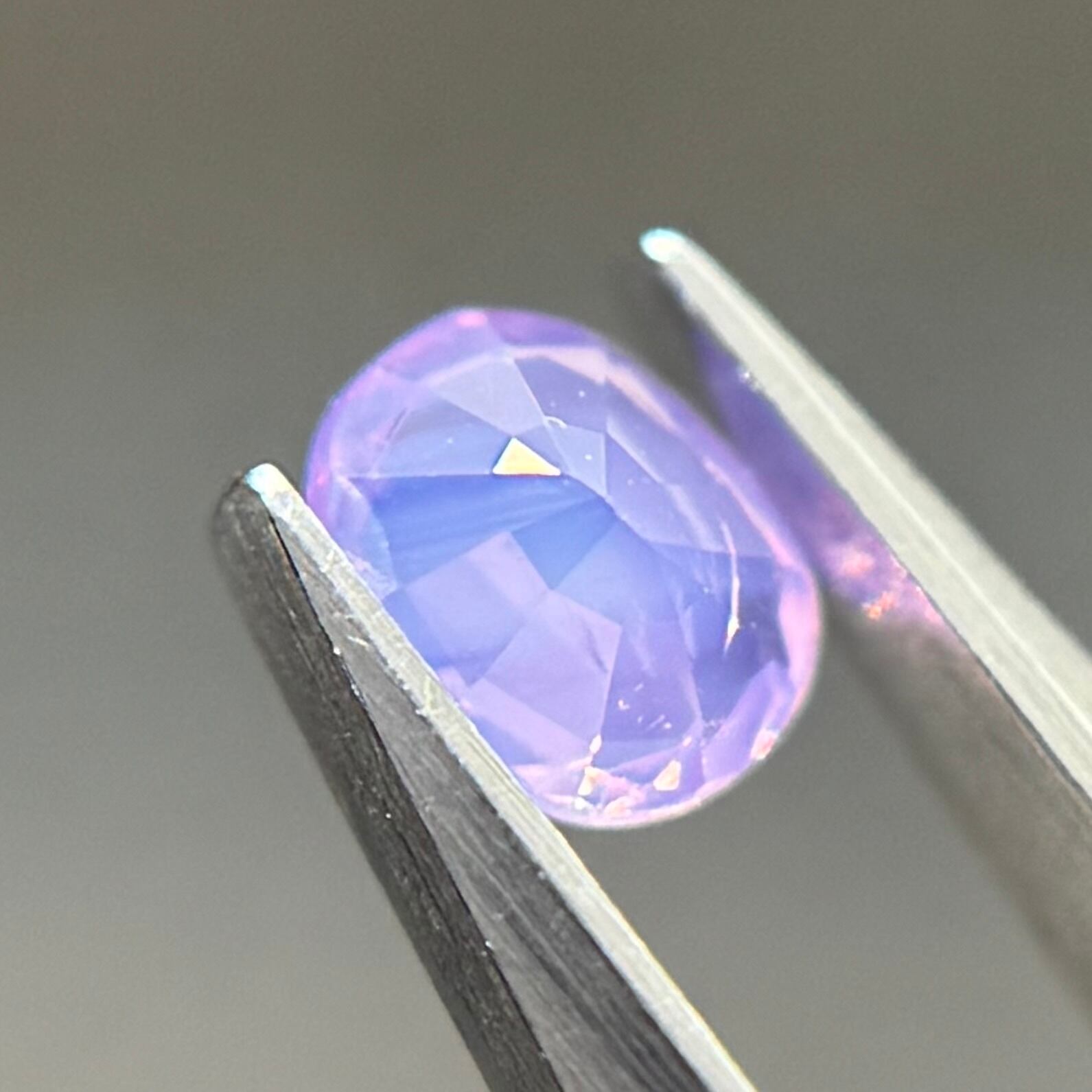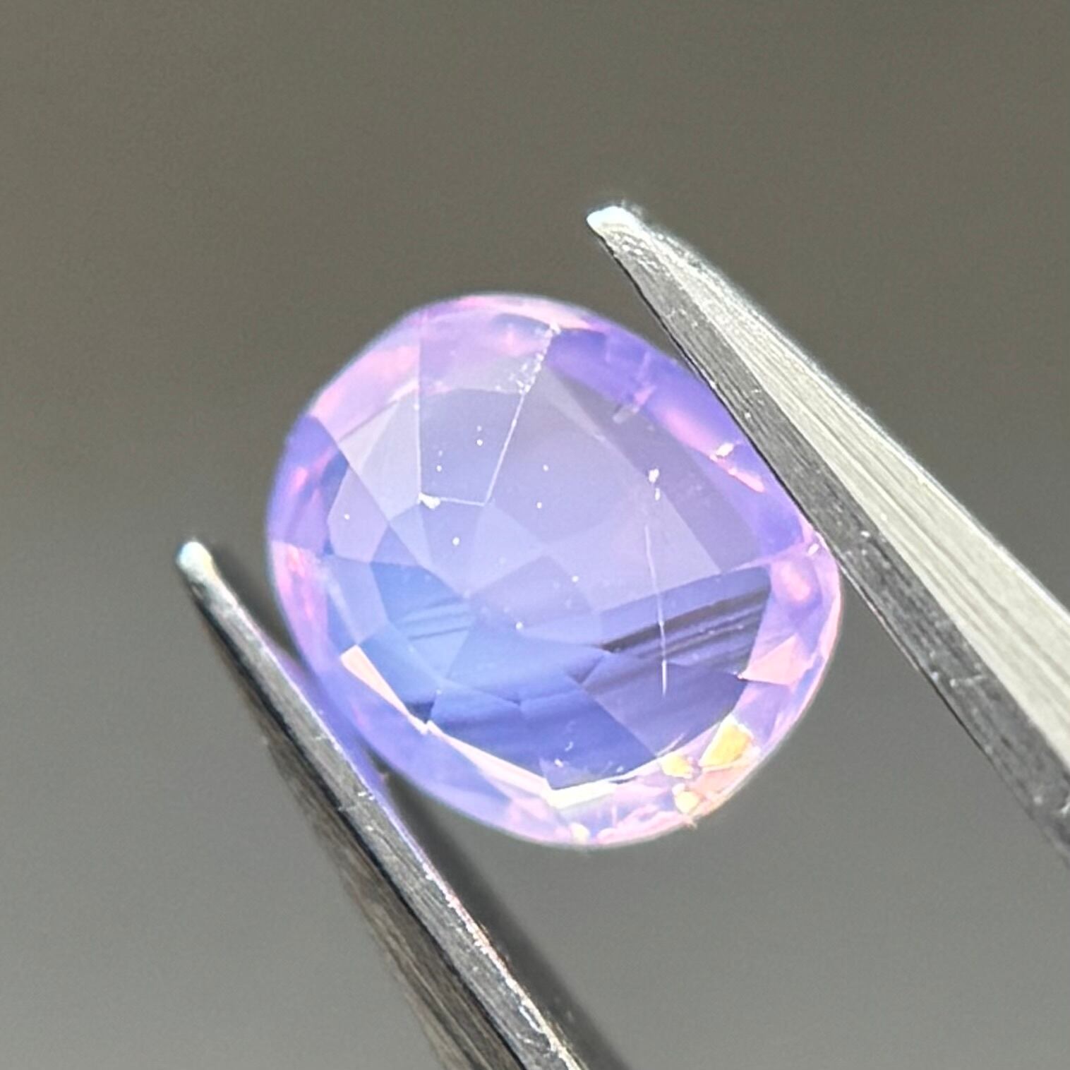 ふんわりパープルに優しい暖色のテリがキラキラと美しいシルキーサファイアです。手に乗せると紫がふわっと浮かび上がりまるでお花が咲いたようです