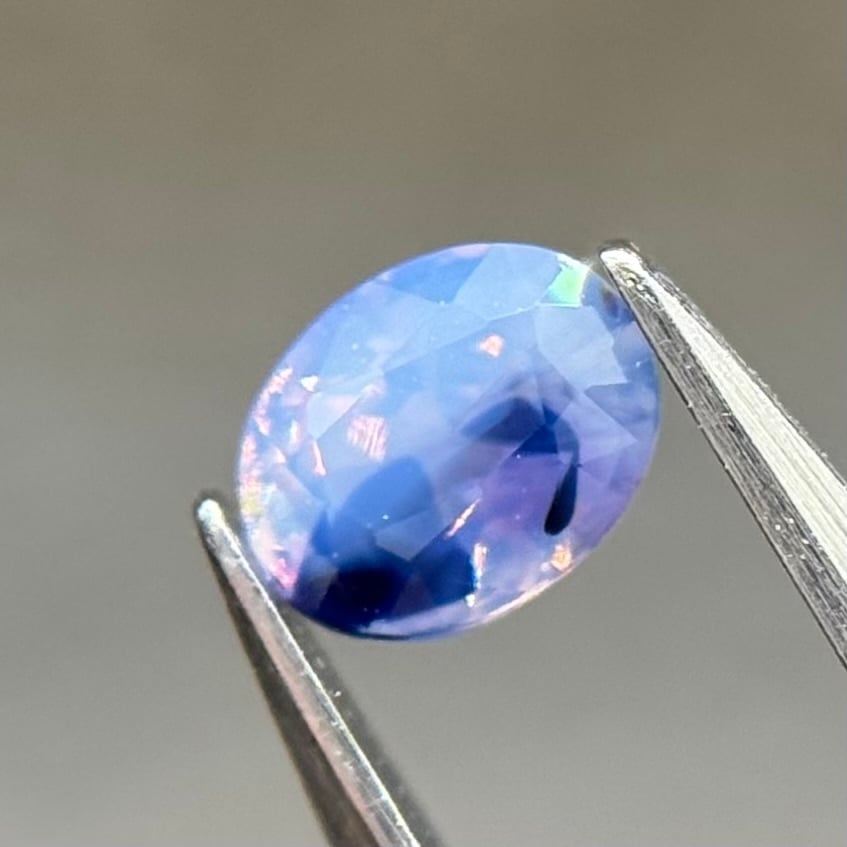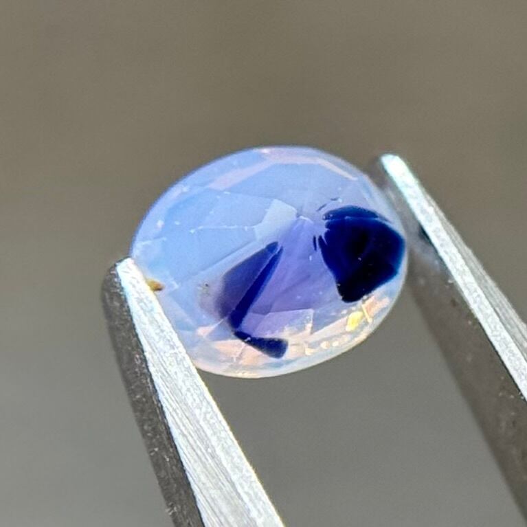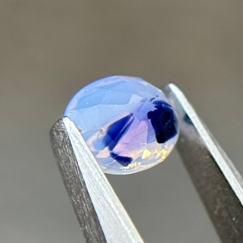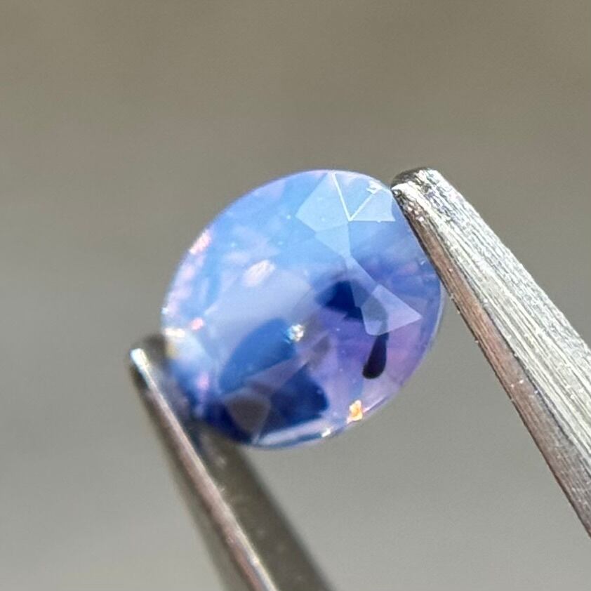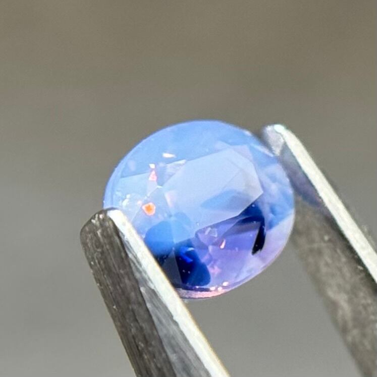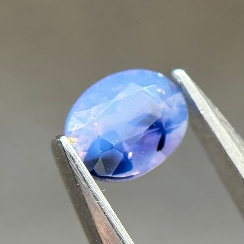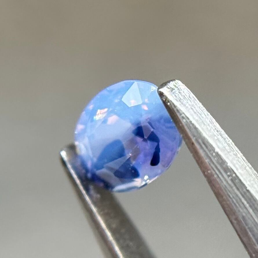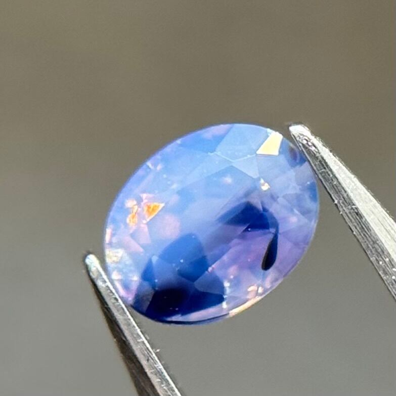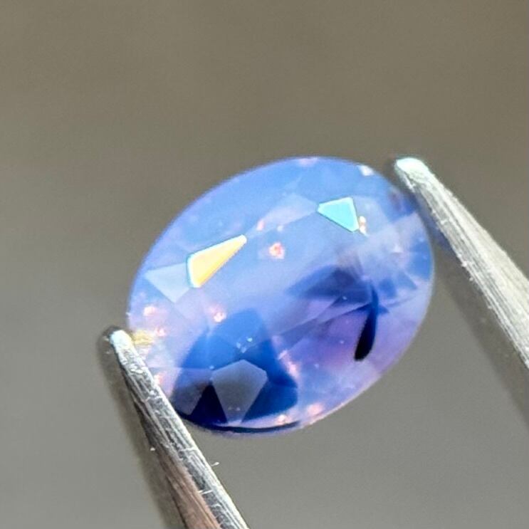 水色の中に濃い青とピンクがゆらめき、軽くグラデーションが楽しめるシルキーサファイアです。テリが向きによってピンクが強く出るところとオレンジが強く出るところがあるので、お気に入りの向きを見つけてください