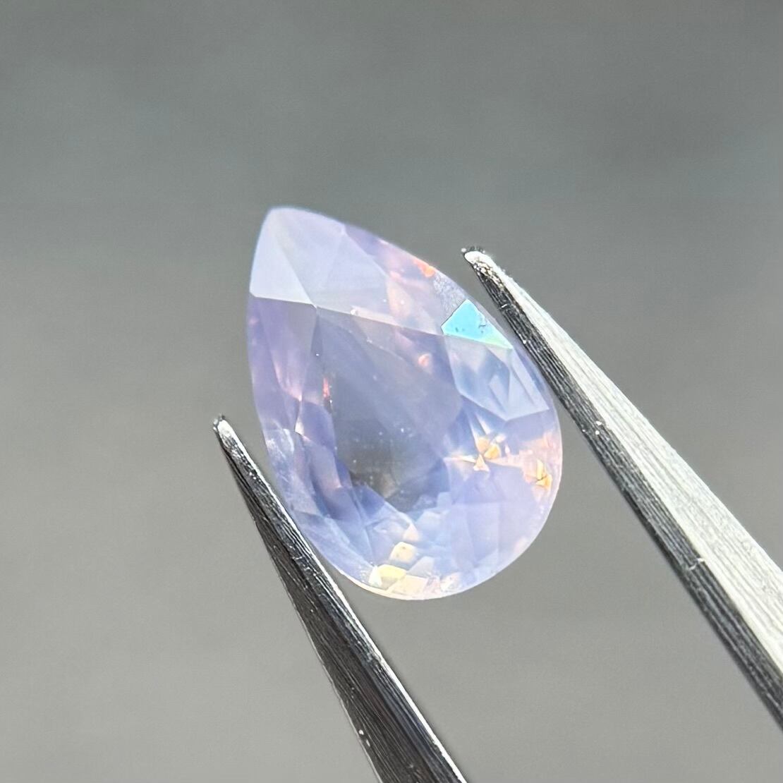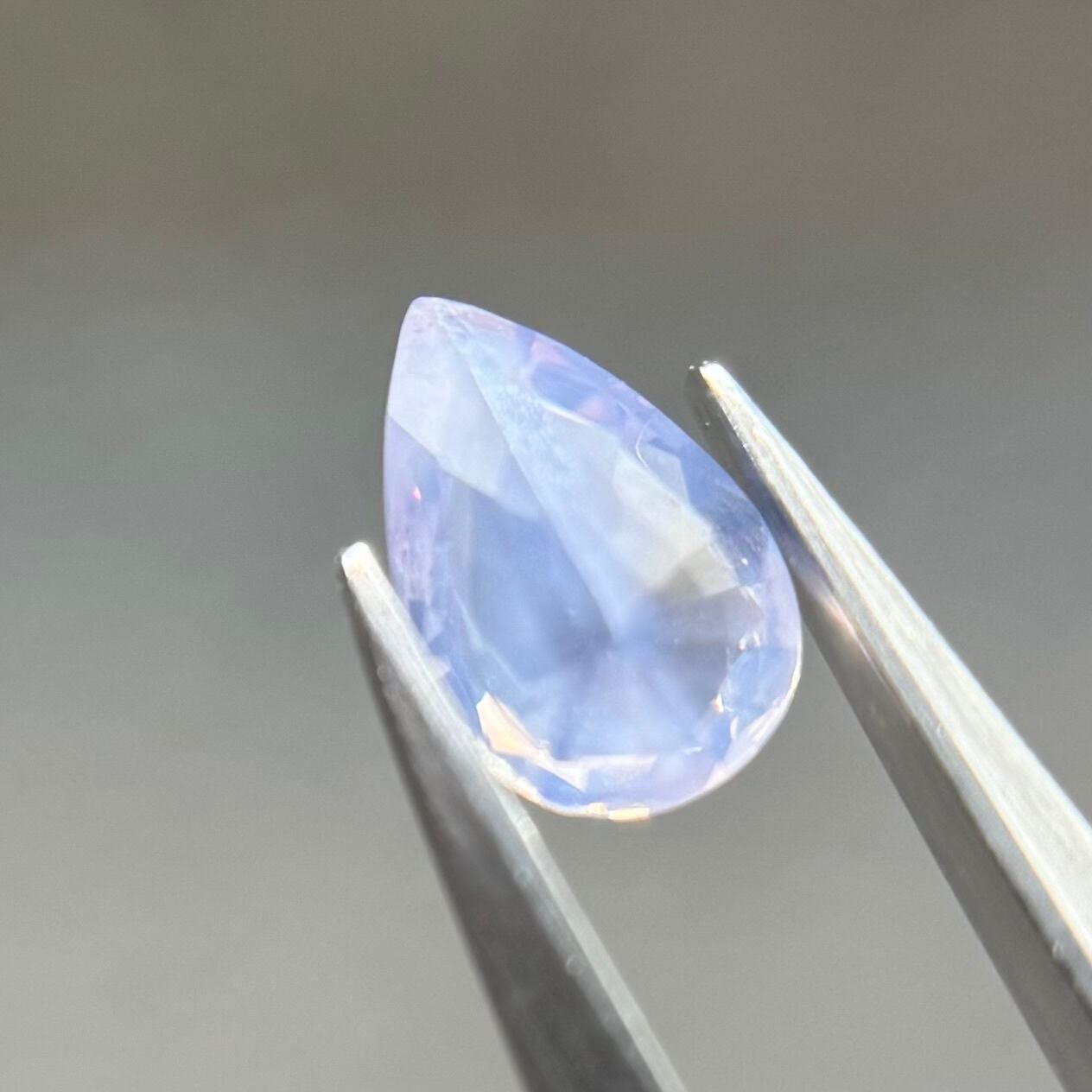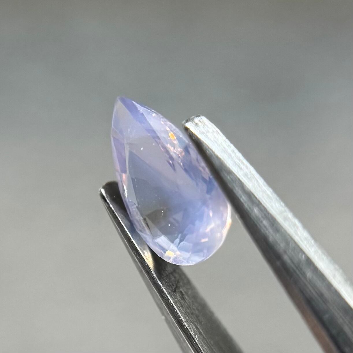 淡いラベンダーブルーの奥側からピンクが顔を出すシルキーサファイアです。手に乗せると今度は青が顔を出す不思議ちゃんでもあります