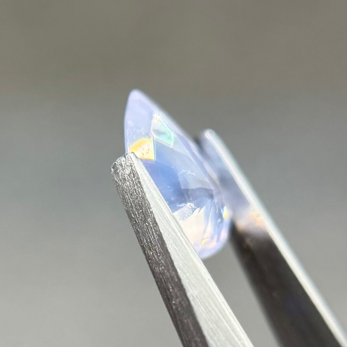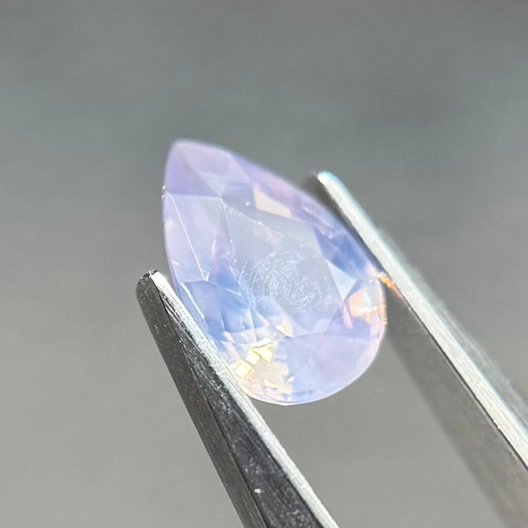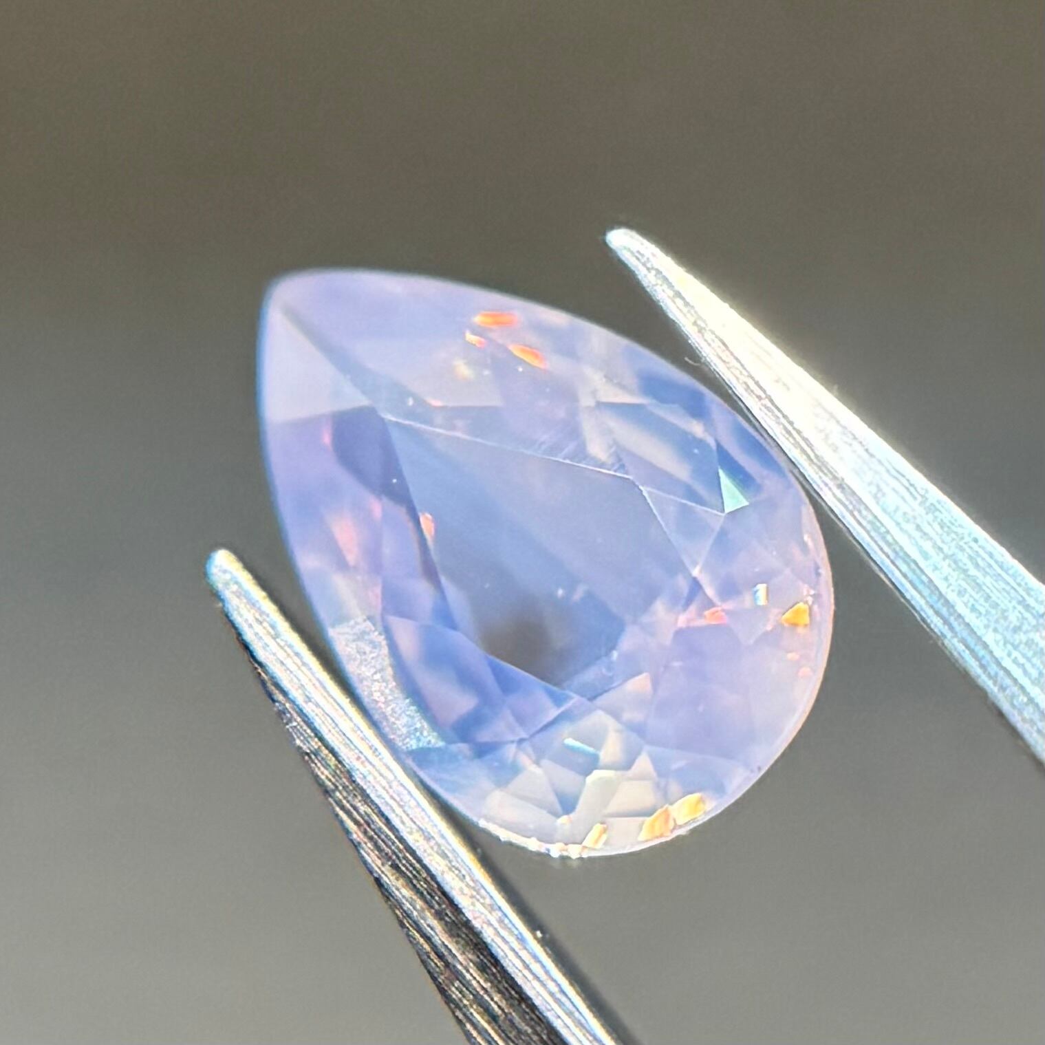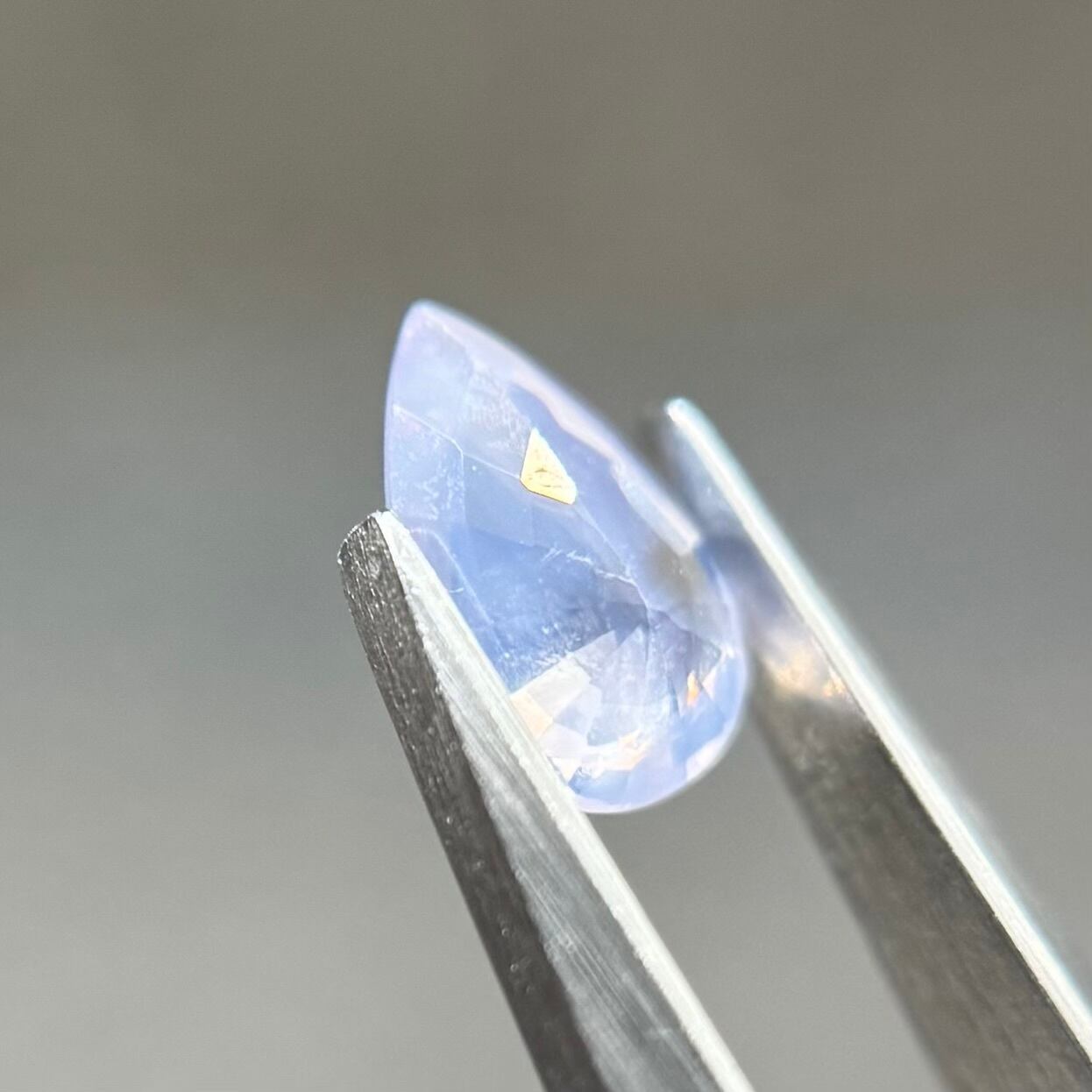 淡いラベンダーブルーの奥側からピンクが顔を出すシルキーサファイアです。手に乗せると今度は青が顔を出す不思議ちゃんでもあります