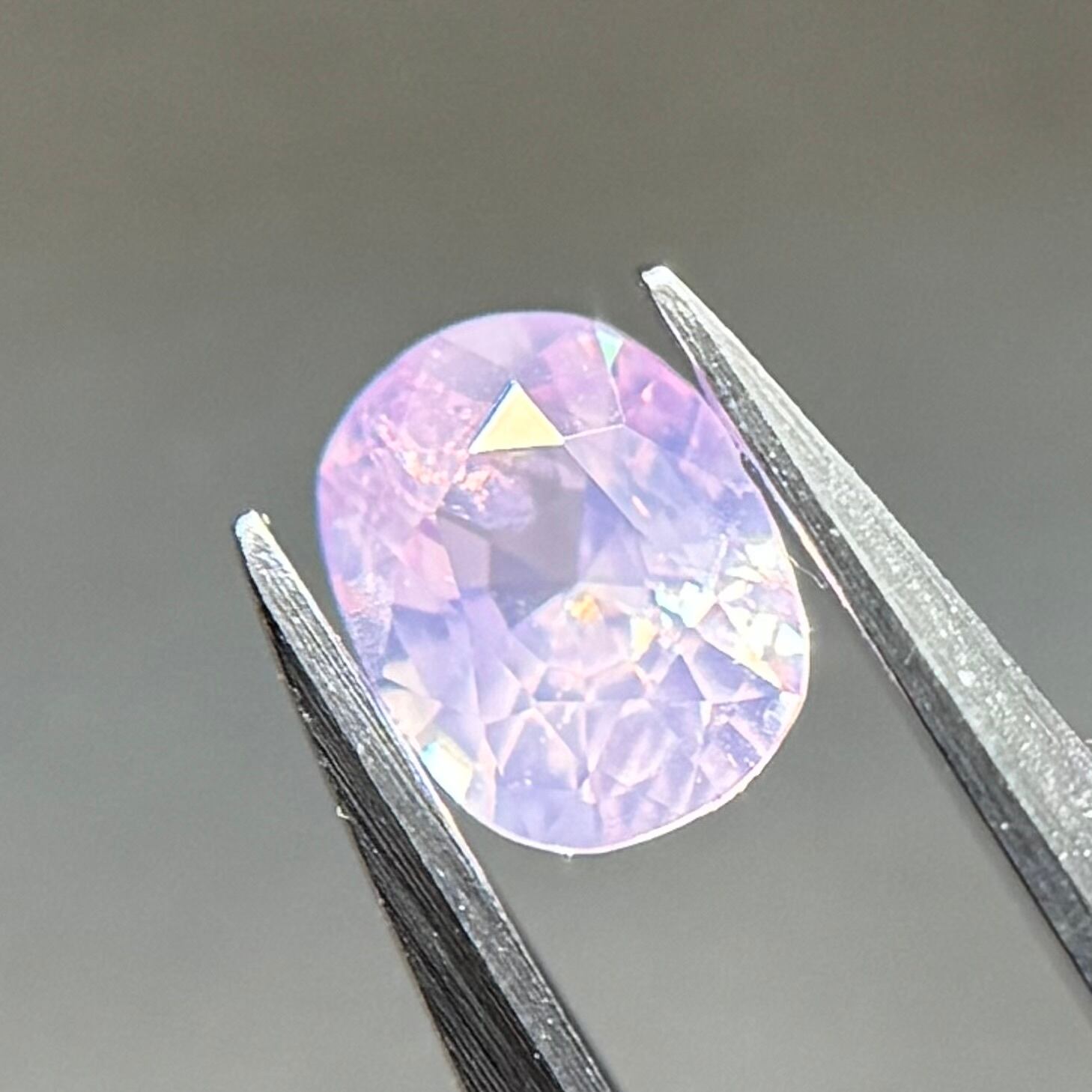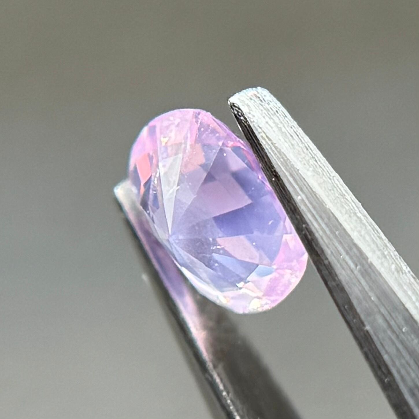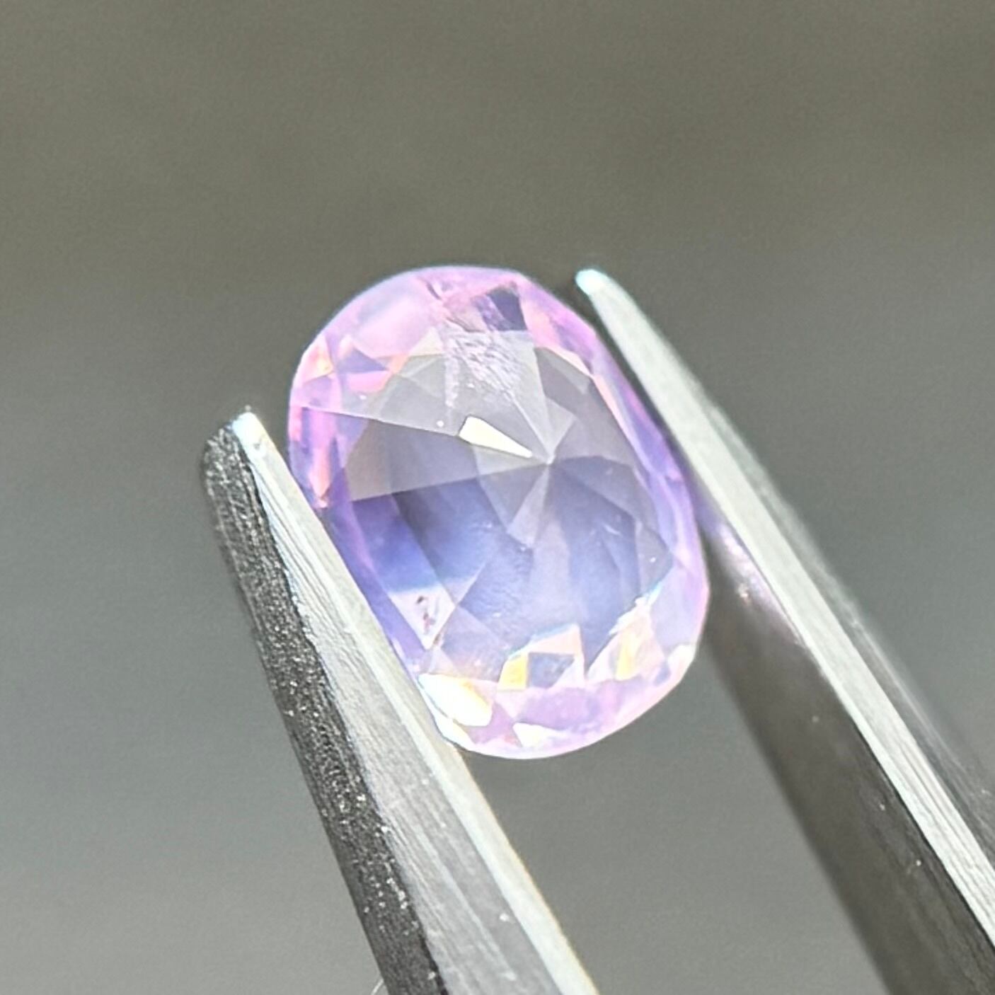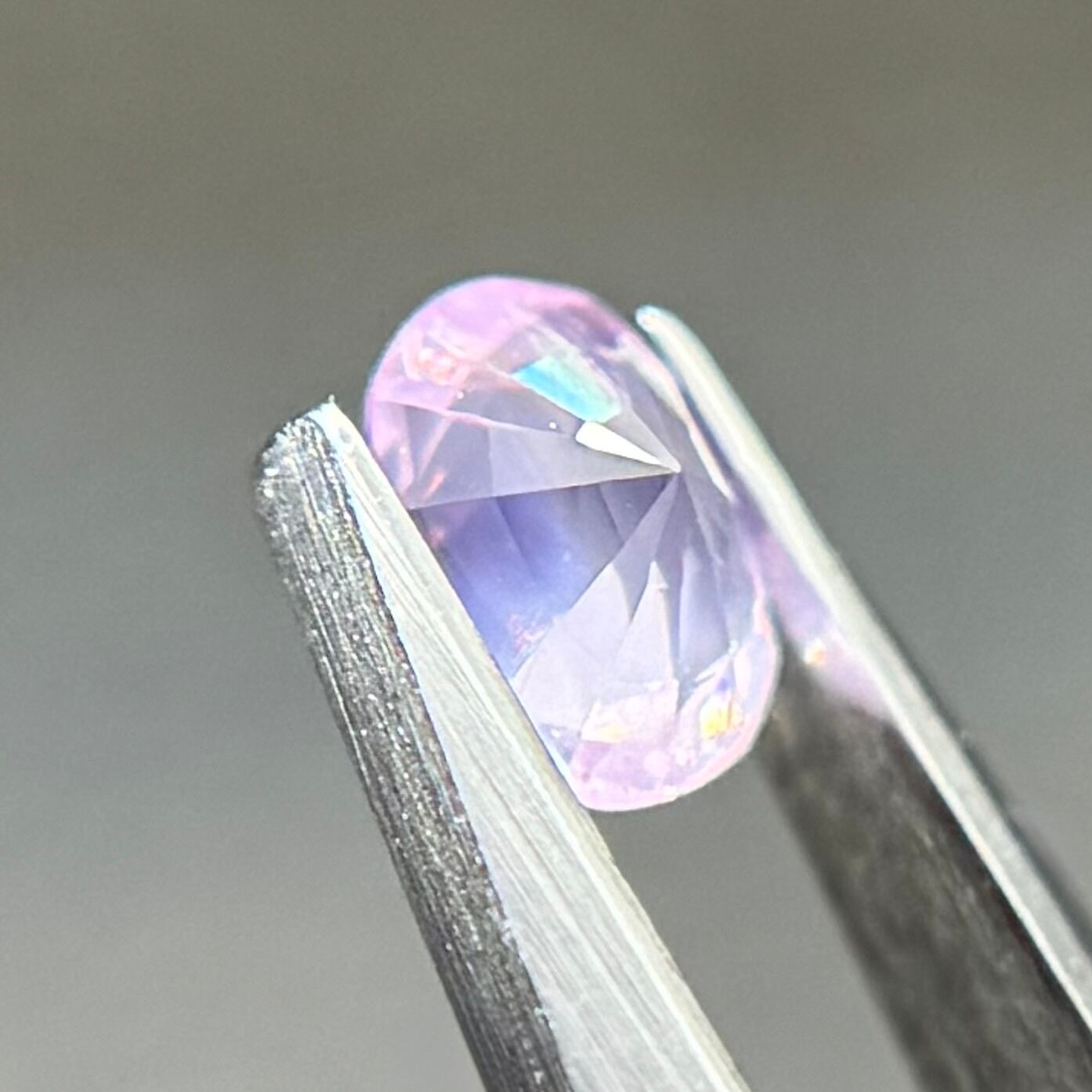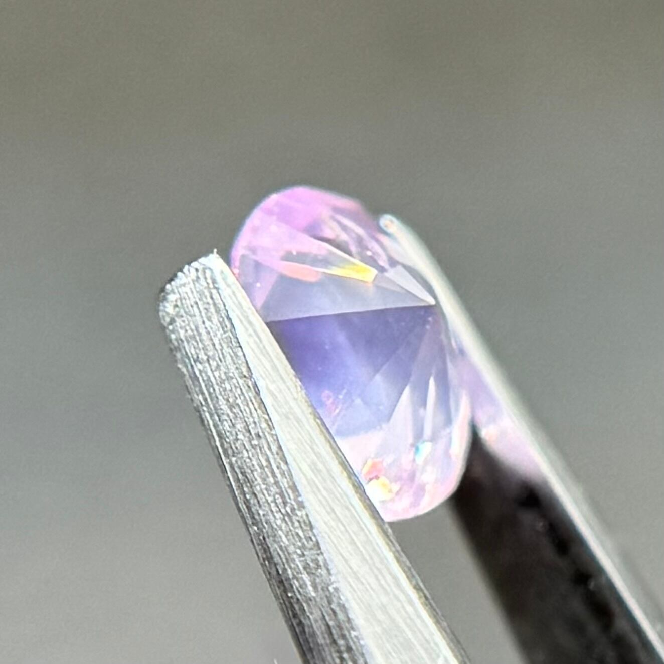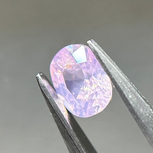 ふんわり儚げな桜ピンクが可愛らしいシルキーサファイアです。青みを残しながらもピンクが上品も映えます。パビリオン側のクラッキングはルーペでで除くと虹が見えます