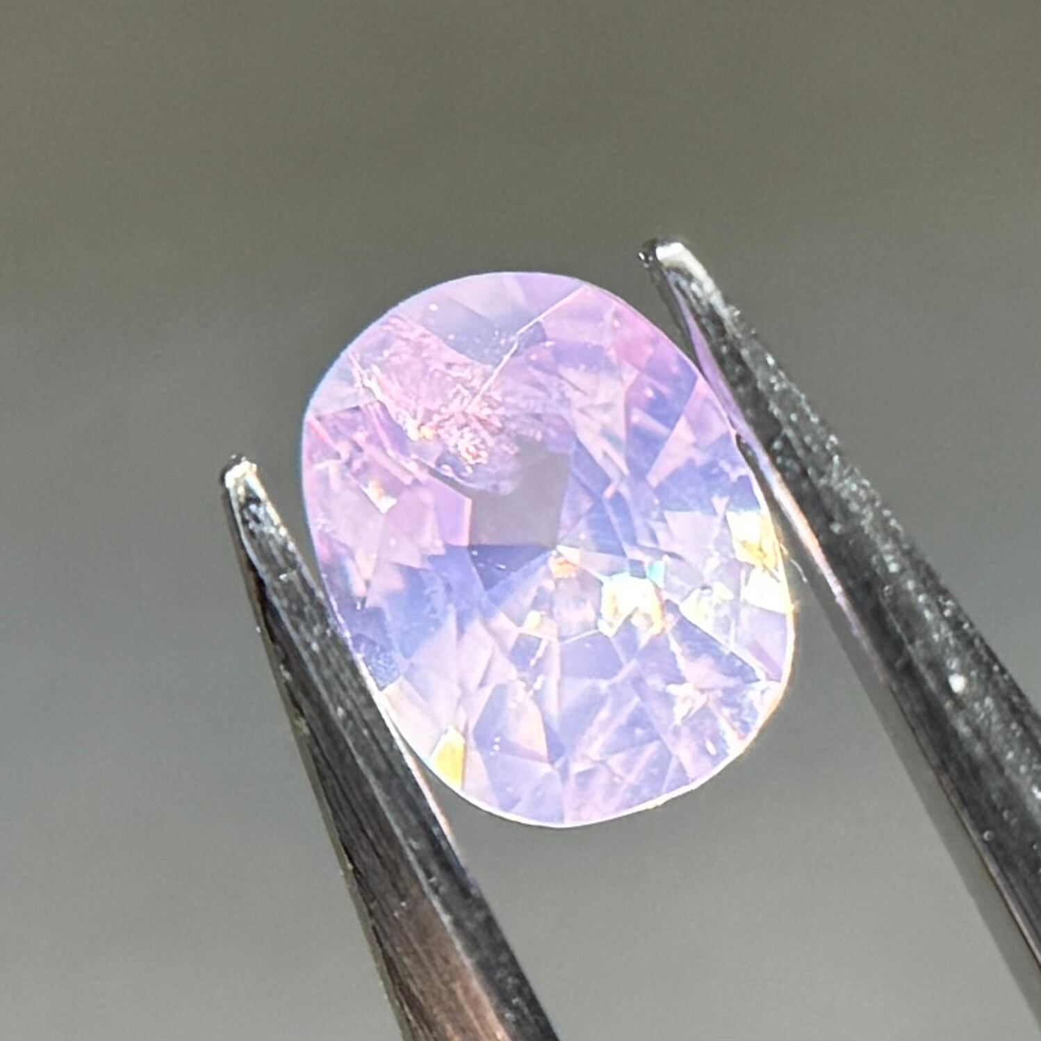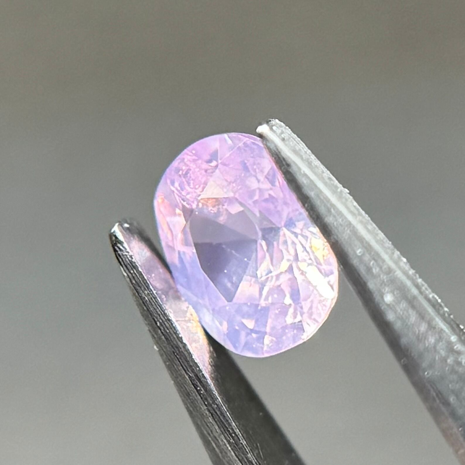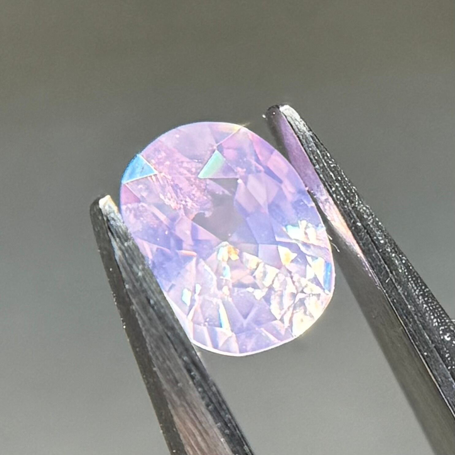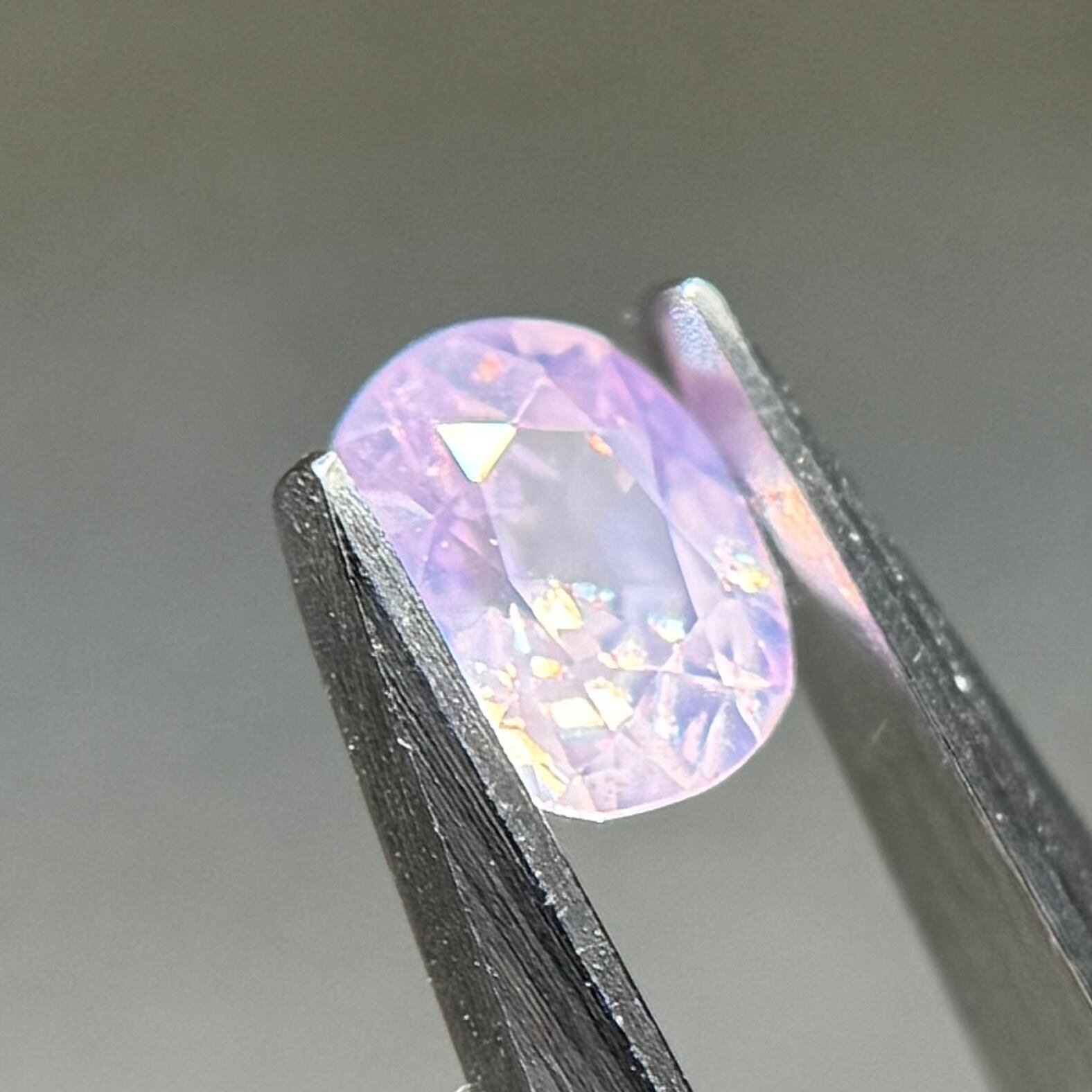 ふんわり儚げな桜ピンクが可愛らしいシルキーサファイアです。青みを残しながらもピンクが上品も映えます。パビリオン側のクラッキングはルーペでで除くと虹が見えます