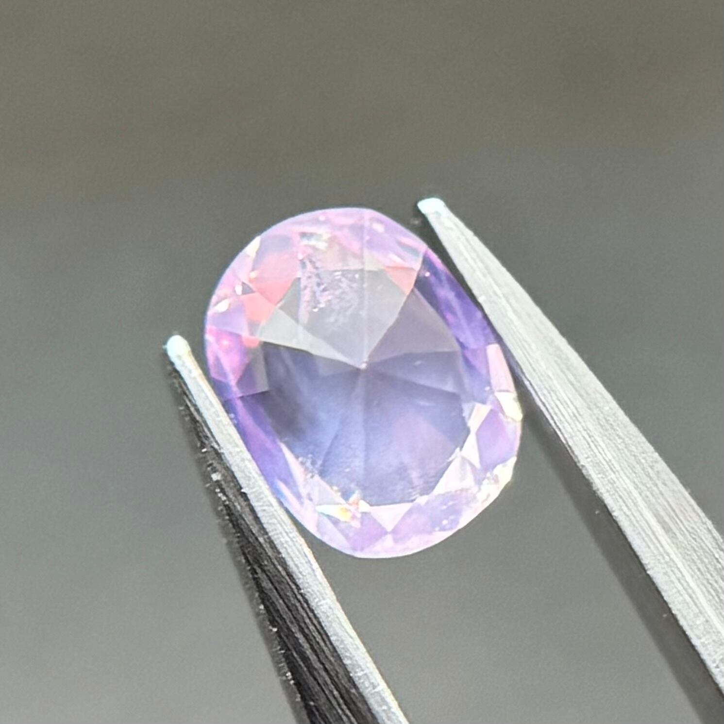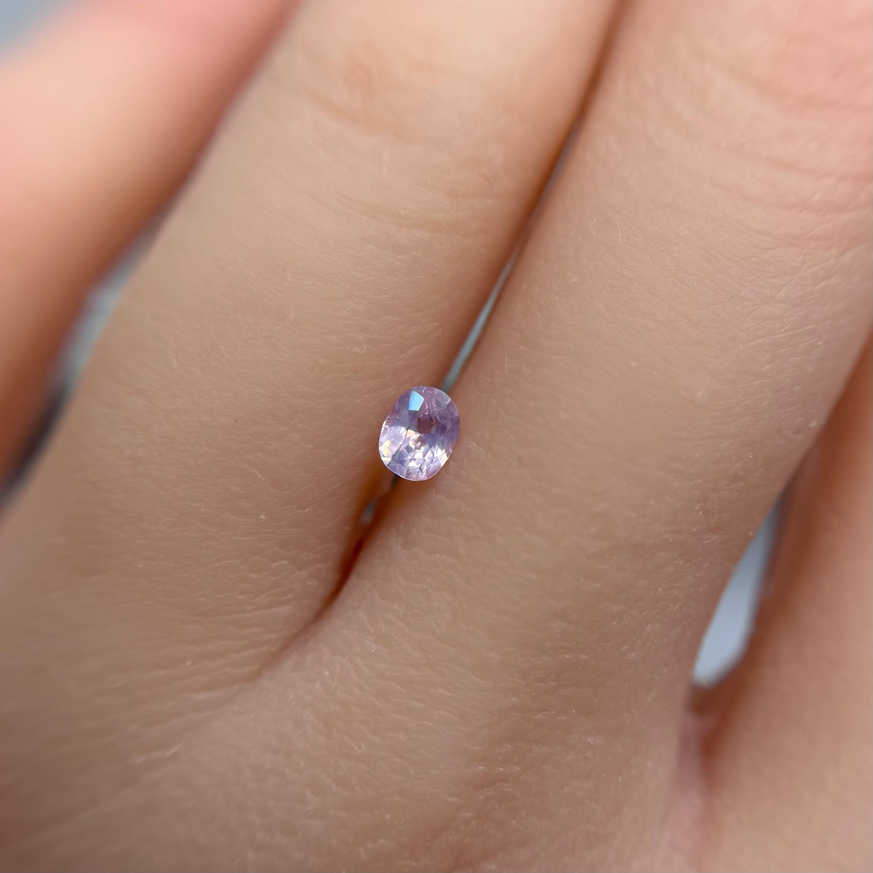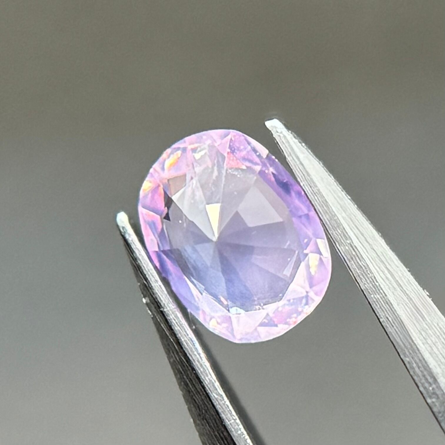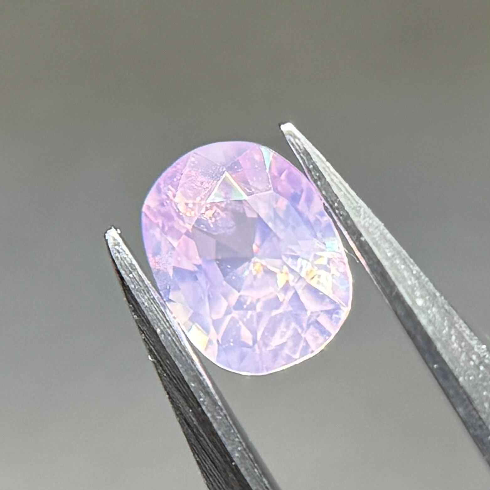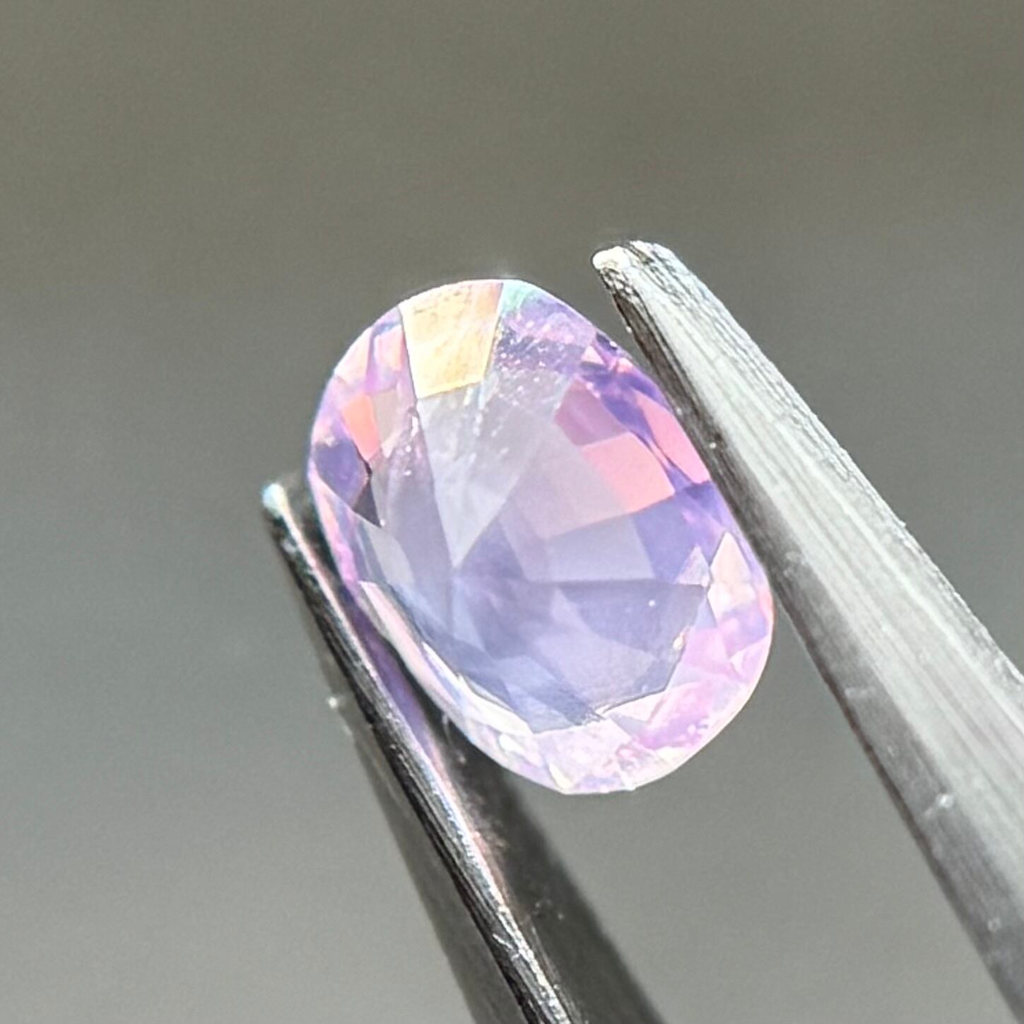 ふんわり儚げな桜ピンクが可愛らしいシルキーサファイアです。青みを残しながらもピンクが上品も映えます。パビリオン側のクラッキングはルーペでで除くと虹が見えます