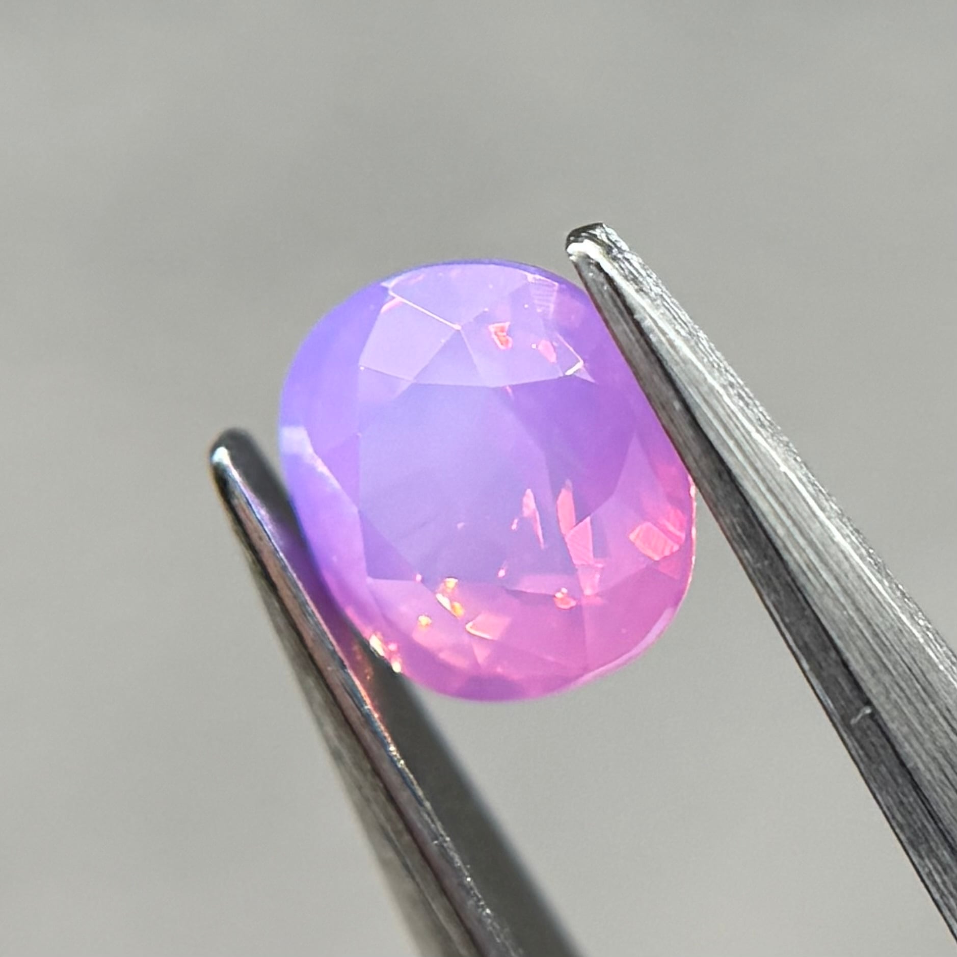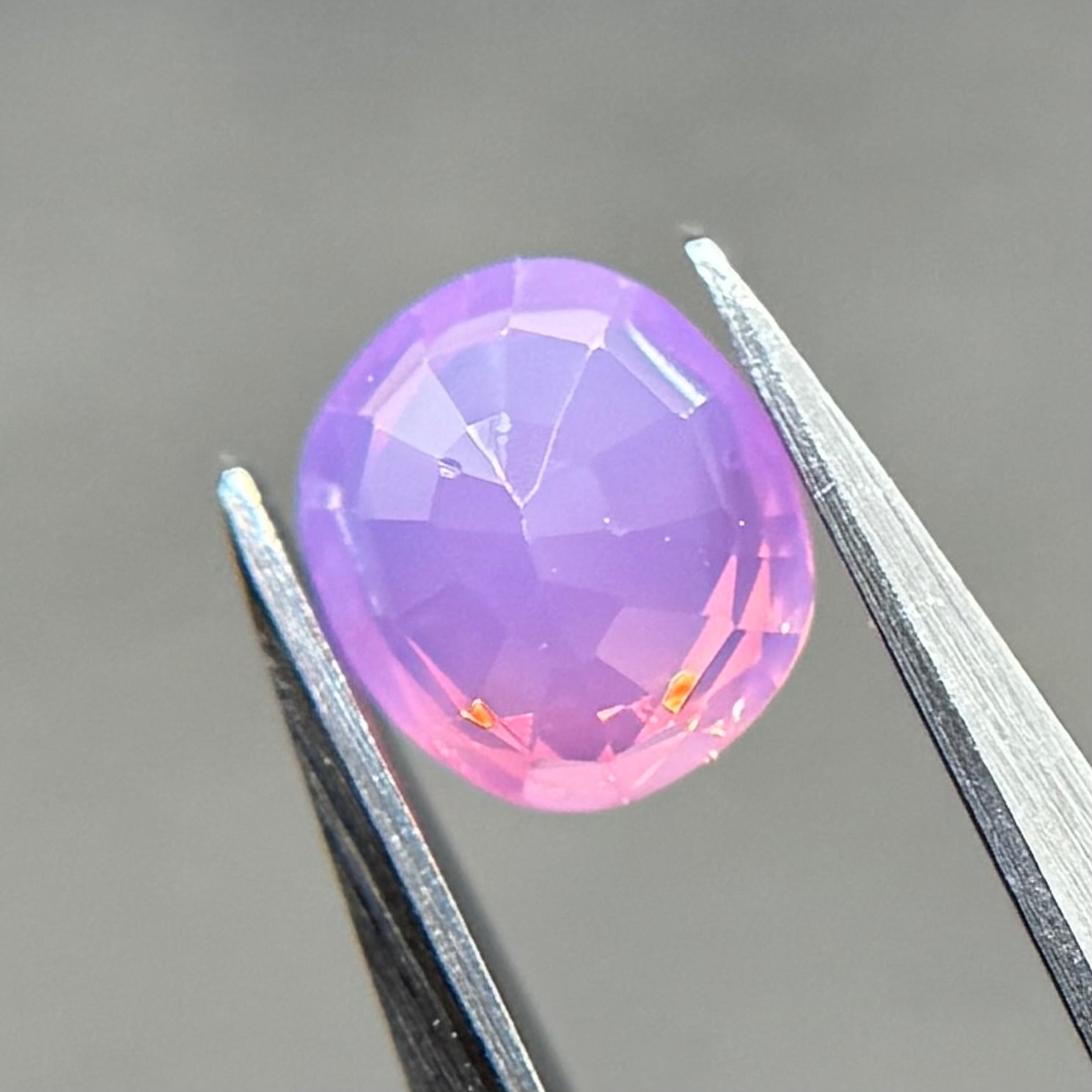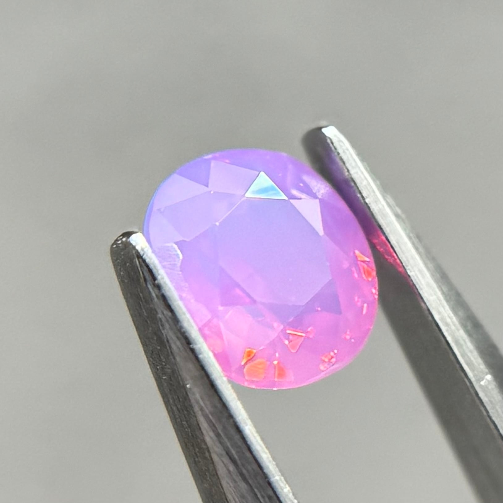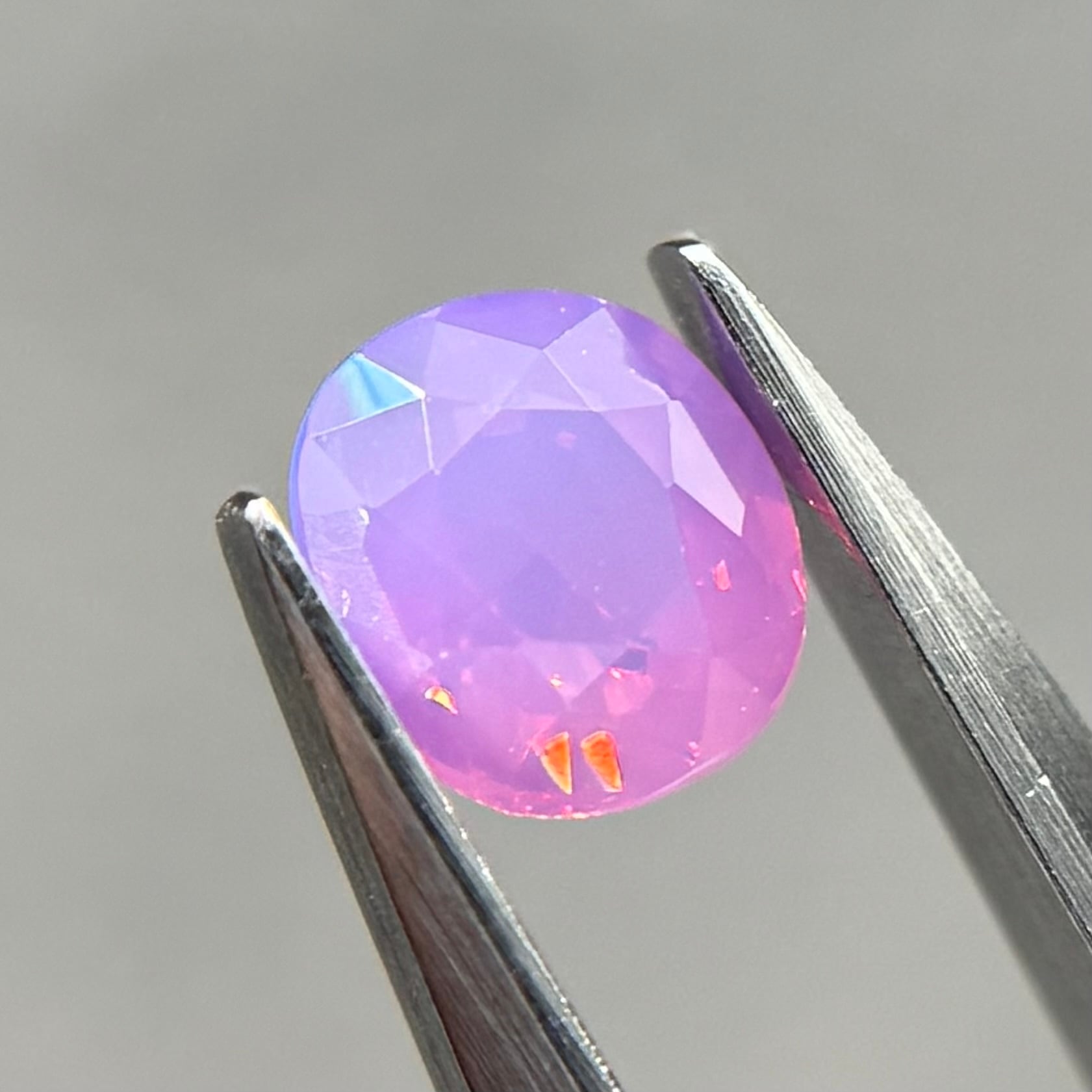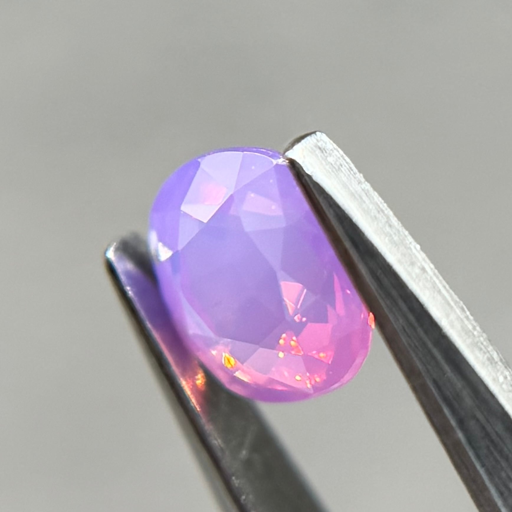 まるでマジックアワーのような色合いが美しいシルキーサファイアです。大粒なテリがオレンジ→ピンクとグラデーションのように見え、テリの粒も大きくしっかり楽しめます