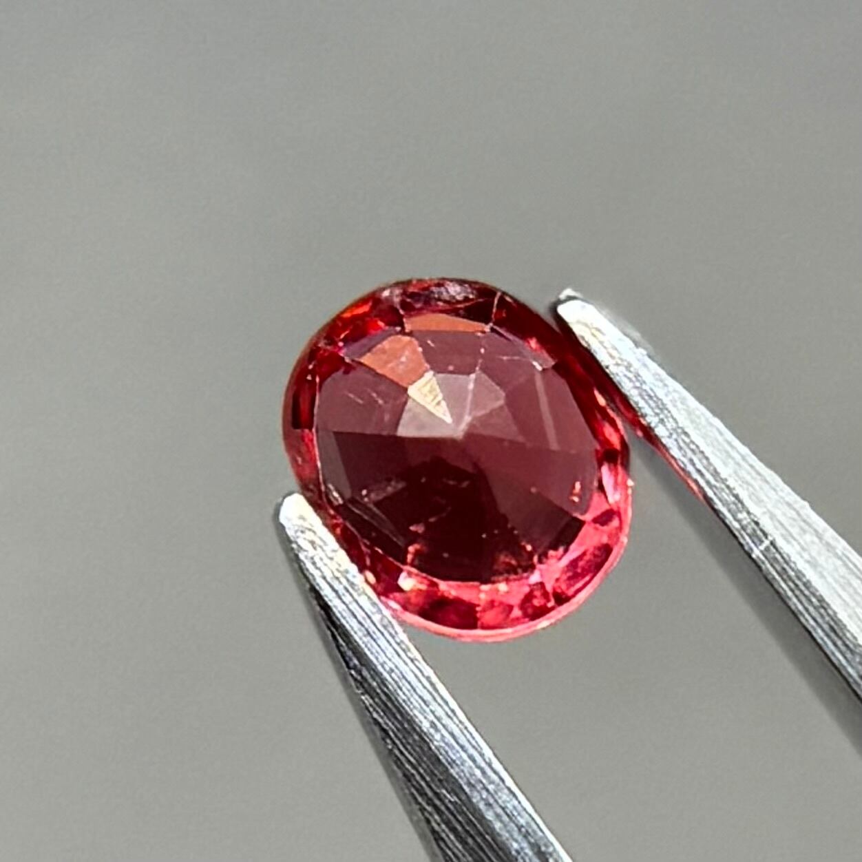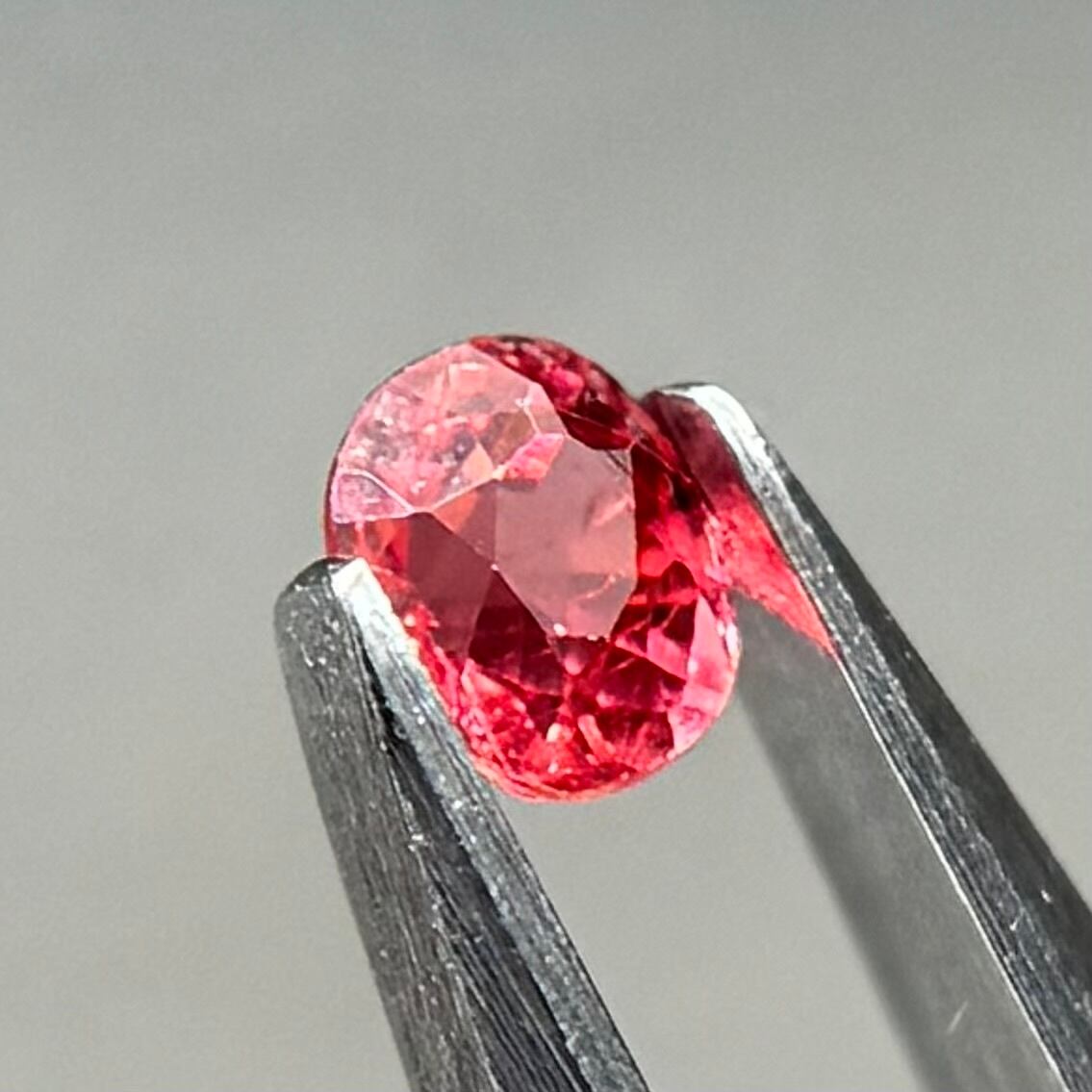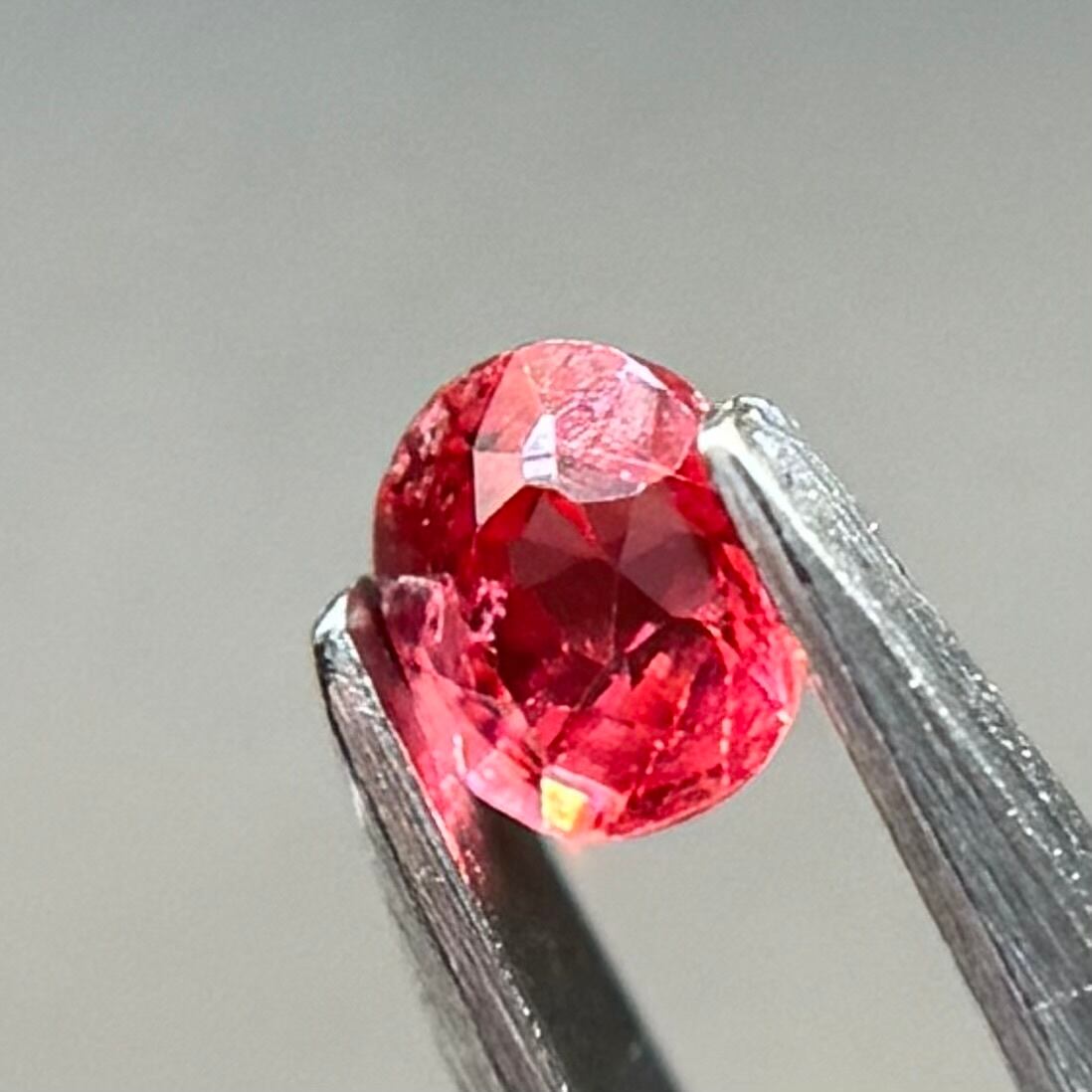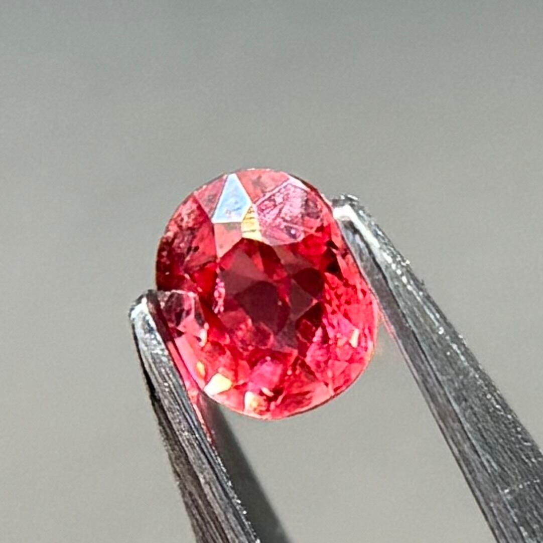 小粒ながら発色が良く、オレンジっぽさもピンクレッドさもあるスピネルです。ガードルパビリオン側に生地足らずがありますが、色とネオンはとてもいいです