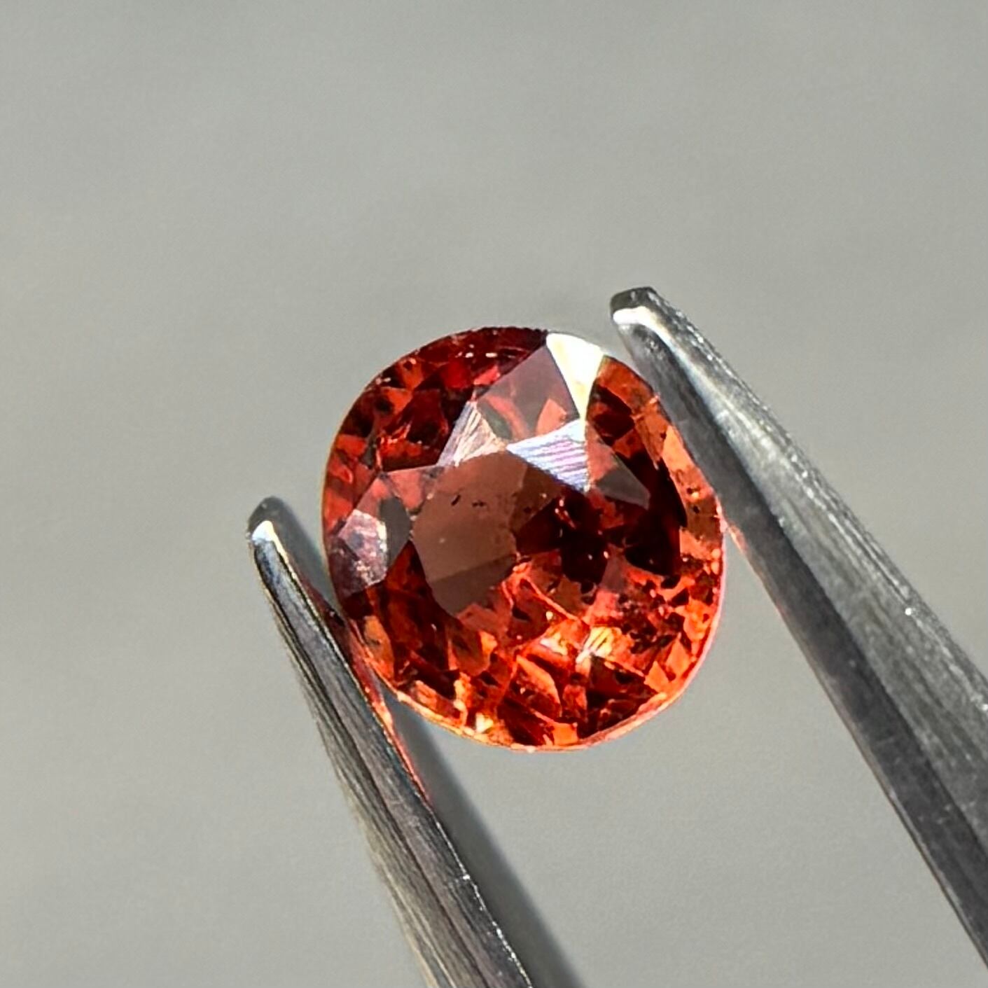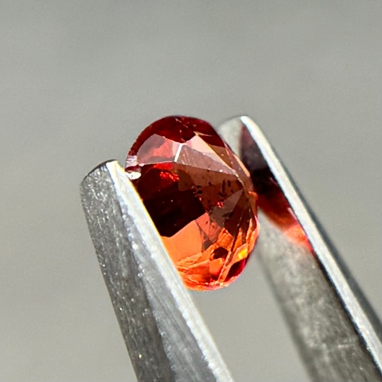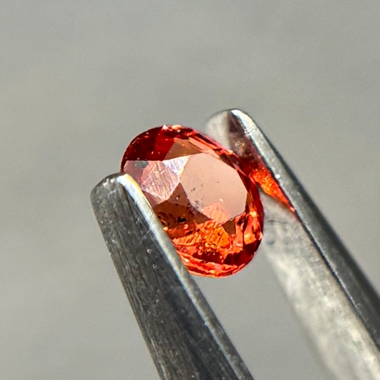 小粒ながら発色が良く、ブラッドオレンジのような、ストレートティーのような色合いが美しいスピネルです。パビリオン側に黒色インクルージョンがあり、テーブル側からルーペで見ると黒色インクルージョンが紅茶の茶葉みたいで可愛らしいです(肉眼ではテーブル側からは気にならないです)
