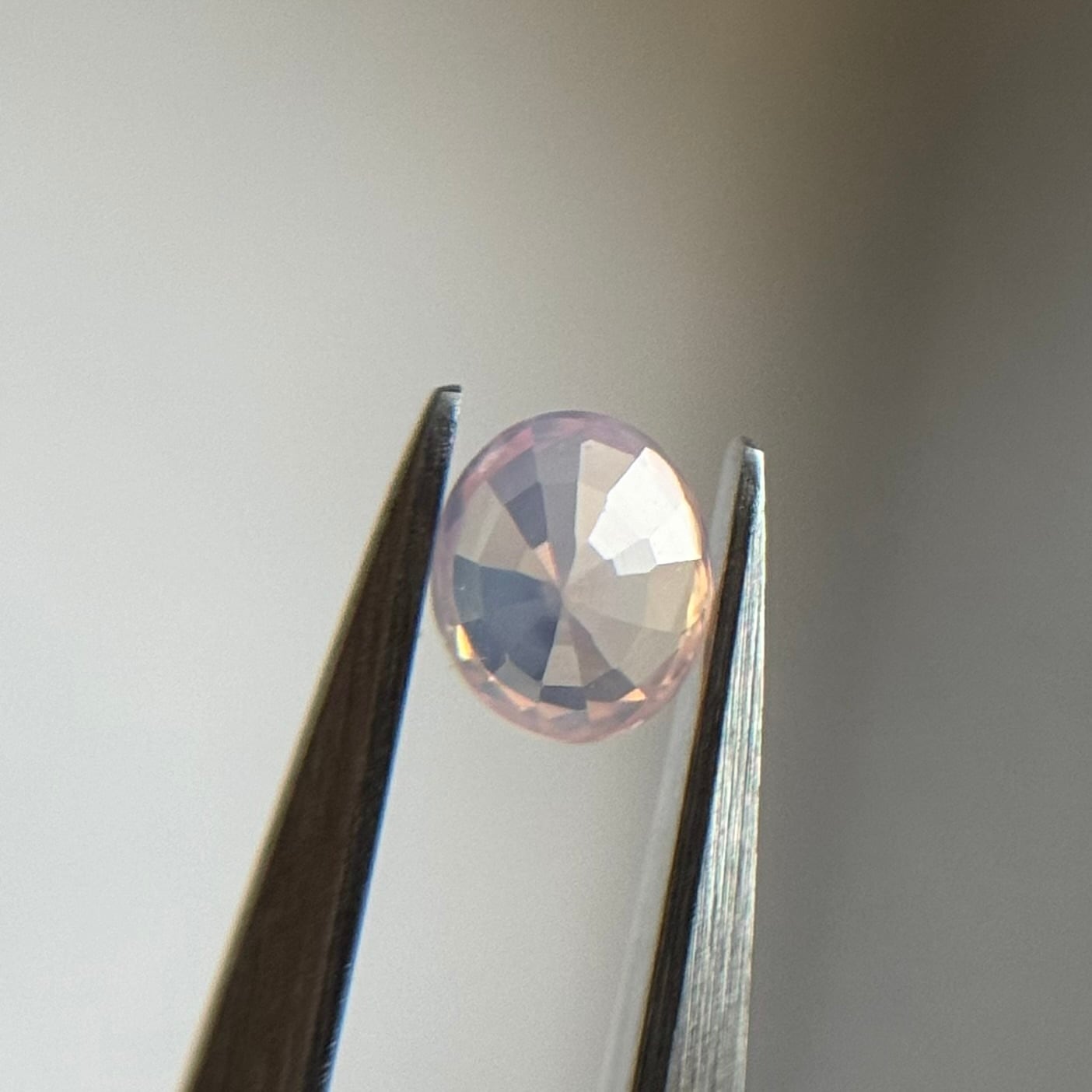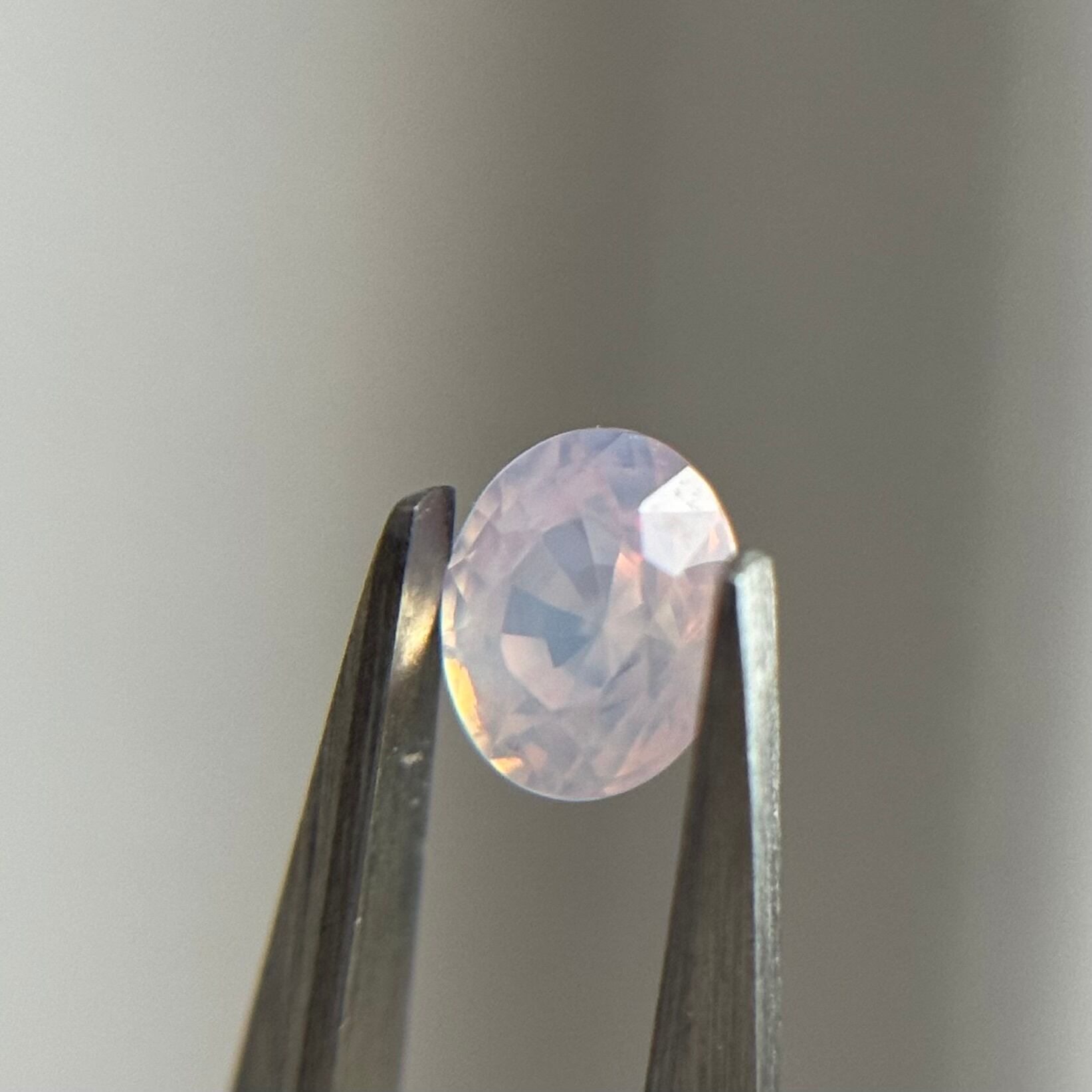淡いピンク色なのですが、真ん中に一列、まるでおめかしでチークを入れたかのように、光の加減で青色が見えるシルキーサファイアです。テリもうるうるで、目立った傷やカケや傷も見当たらないほぼルーペクリーンです